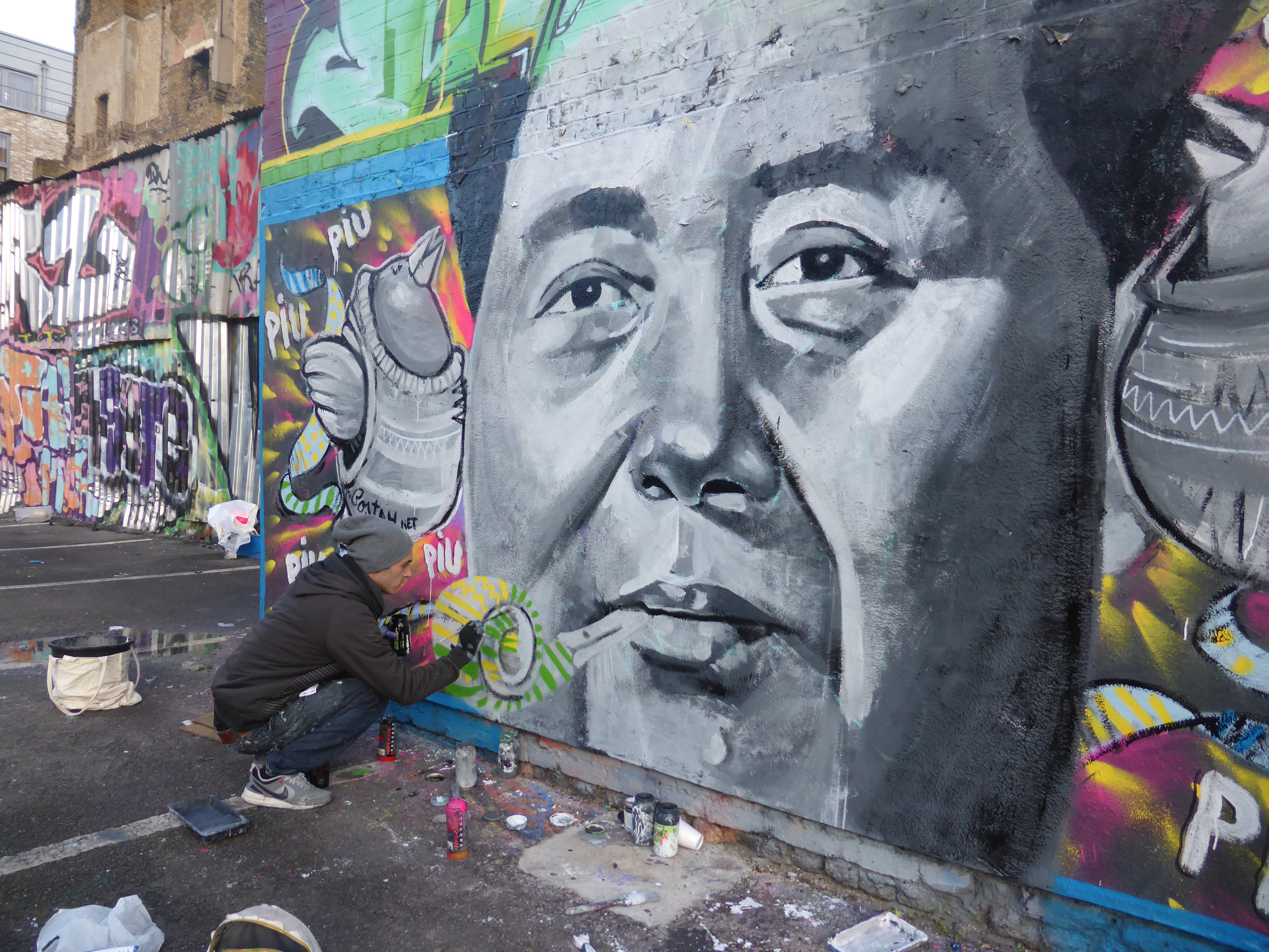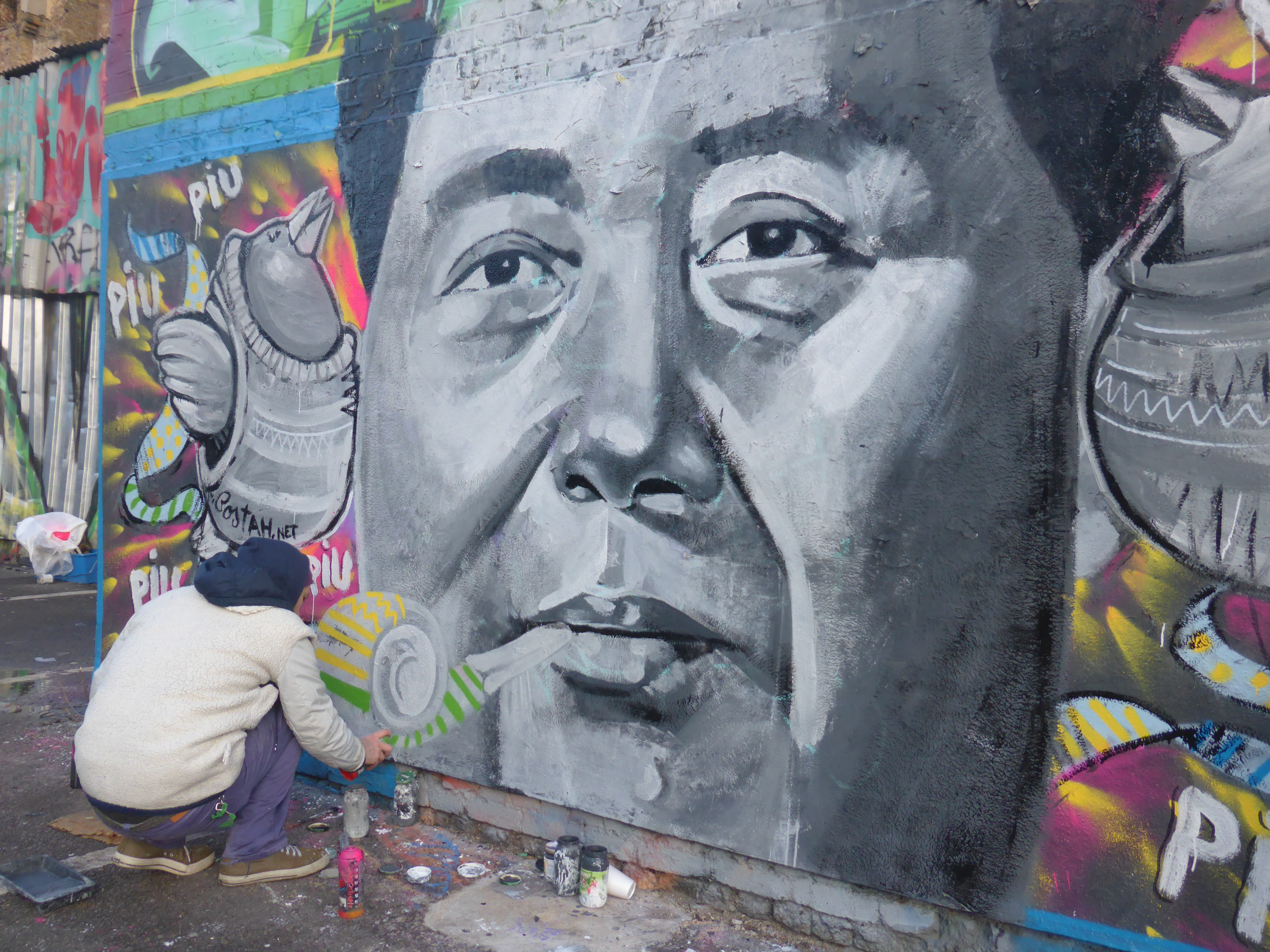 Yesterday afternoon in the car park on Sclater Street, one of the prime locations to paint in Shoreditch, I bumped into Portuguese duo Furia ACK & Costah, both residents of London, painting a collaboration piece over a previous piece of work by Furia ACK in the same spot that had finally succumb to being tagged over. Despite the near freezing temperatures on London’s streets the pair were in fine spirits while they worked away on this beautiful piece. Costahs birds as paste-ups and spray paintings can be spotted throughout the Brick Lane area adding some colour to the streets, while Furia ACK paints pilitical figures and social reformers from around the globe. This depiction of Chairman Mao, one of modern history’s most iconic figures was apparently only decided upon for the subject matter that very morning. Furia ACK has painted multiple pieces around the streets of Shoreditch and Brick Lane in his trademark black and white style armed with his paint brush and household paints. On this occasion i feel the colours of Costah’s artistic style really added a new dimension to Furia’s subject and made for an interesting and pleasant change to his generally powerful images, there was certainly an element of fun with this piece. Sclater Street car park is often a busy place on Saturdays as this is the only day when access to the walls can be gained for any significant time, due to the car park being in use during the week and being part of the Brick Lane Market setup on Sundays. Due to its location running from Shoreditch Overground Station to Brick Lane there was unsurprisingly a constant supply of passers-by stopping to chat to the artists and take snaps, as well as many visits from the increasingly popular street art tours run throughout the area of a weekend. Despite the constant interruptions to their work, from myself included, the pair couldn’t have been more courteous to all that passed by really creating a sense of public art. Thanks a lot guys can’t wait to see future works.