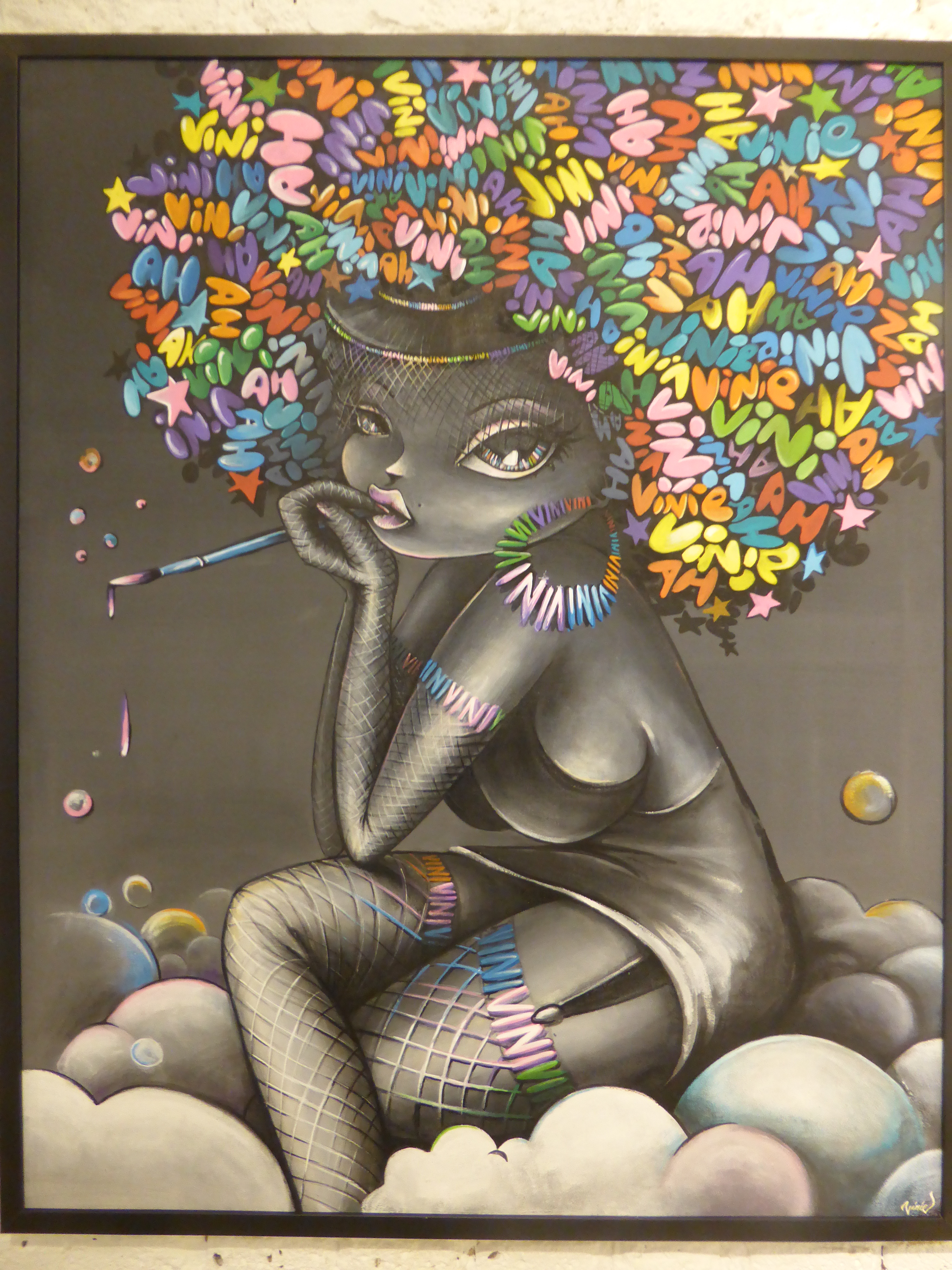 French artist Vinie Graffiti’s style pays homage to her days when she started out painting tags. In her work she incorporates a form of her colourful tag name into the hair and other features of her subjects.
