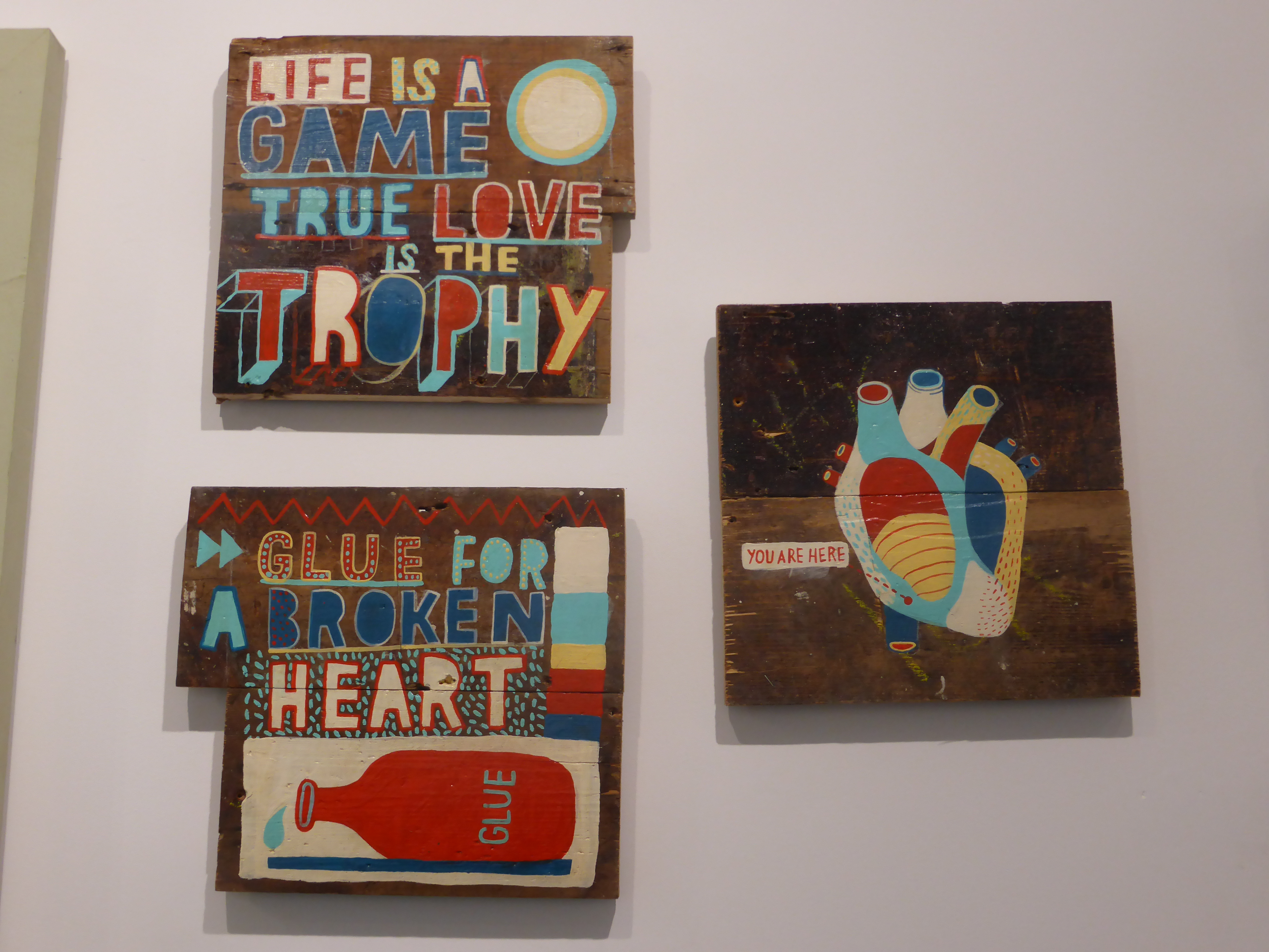 ‘Life Is A Game, True Love & Trophy’, ‘Glue For A Broken Heart’ & ‘You Are Here’, all acrylic on floorboard by David Shillinglaw.