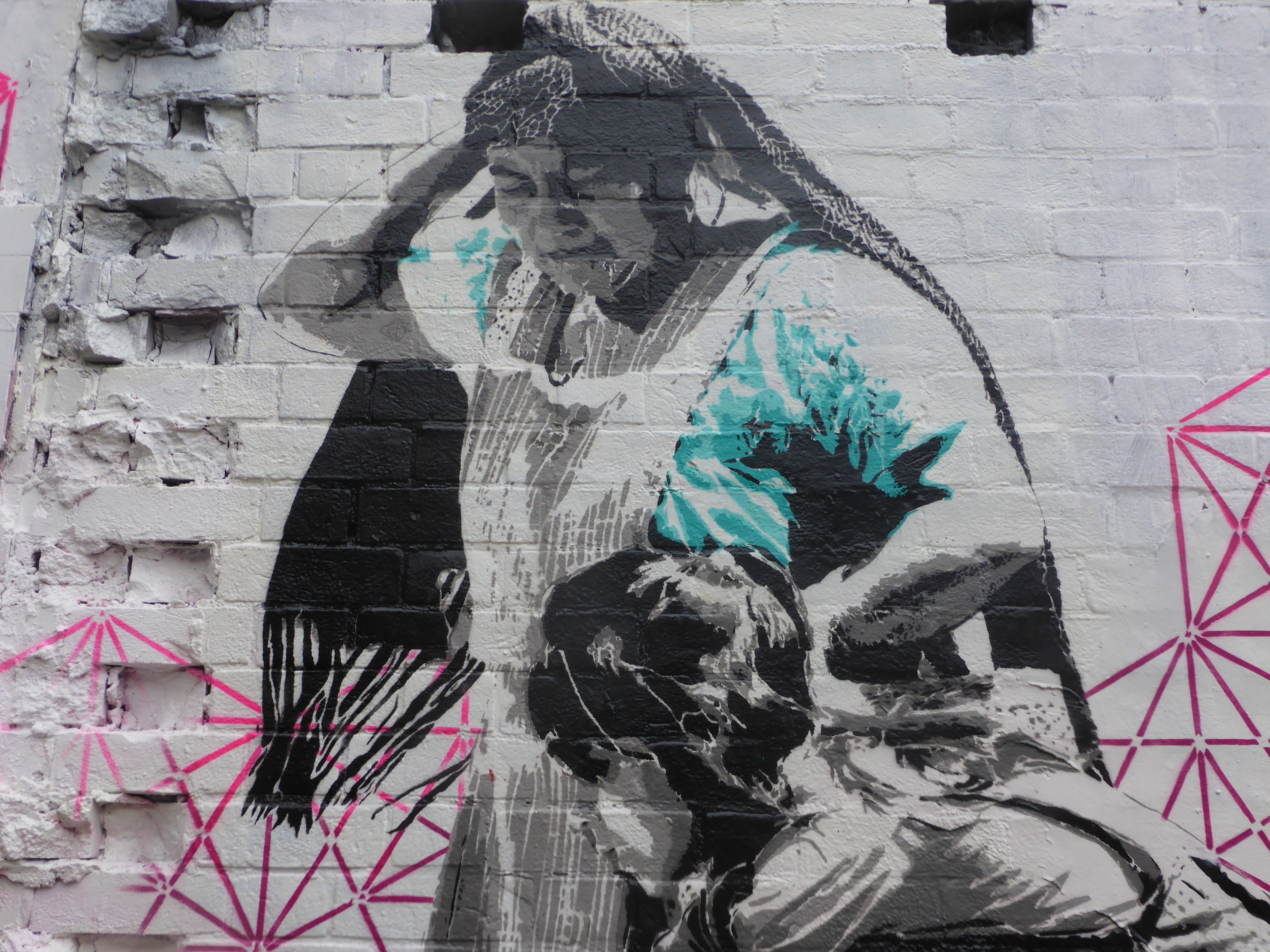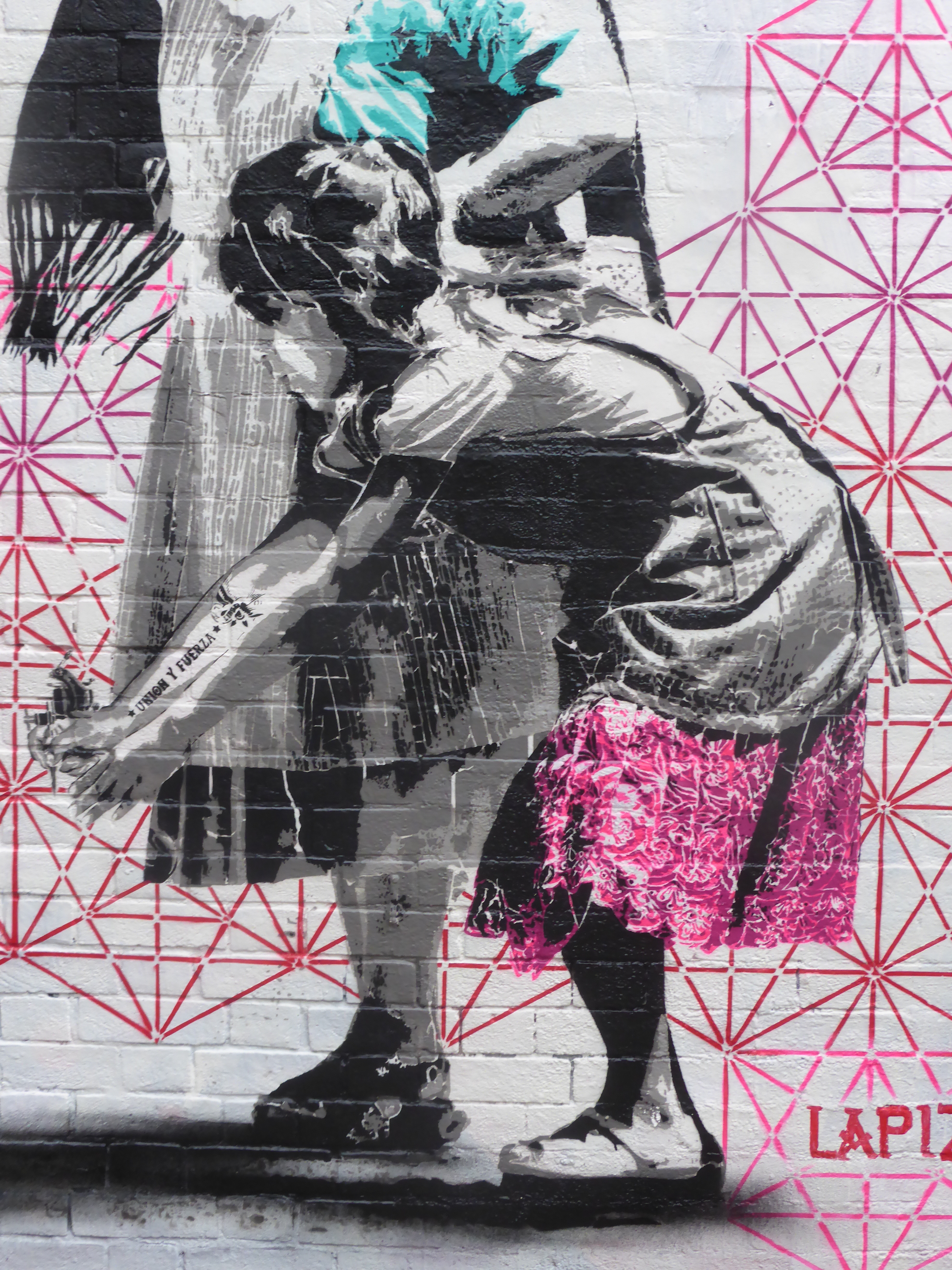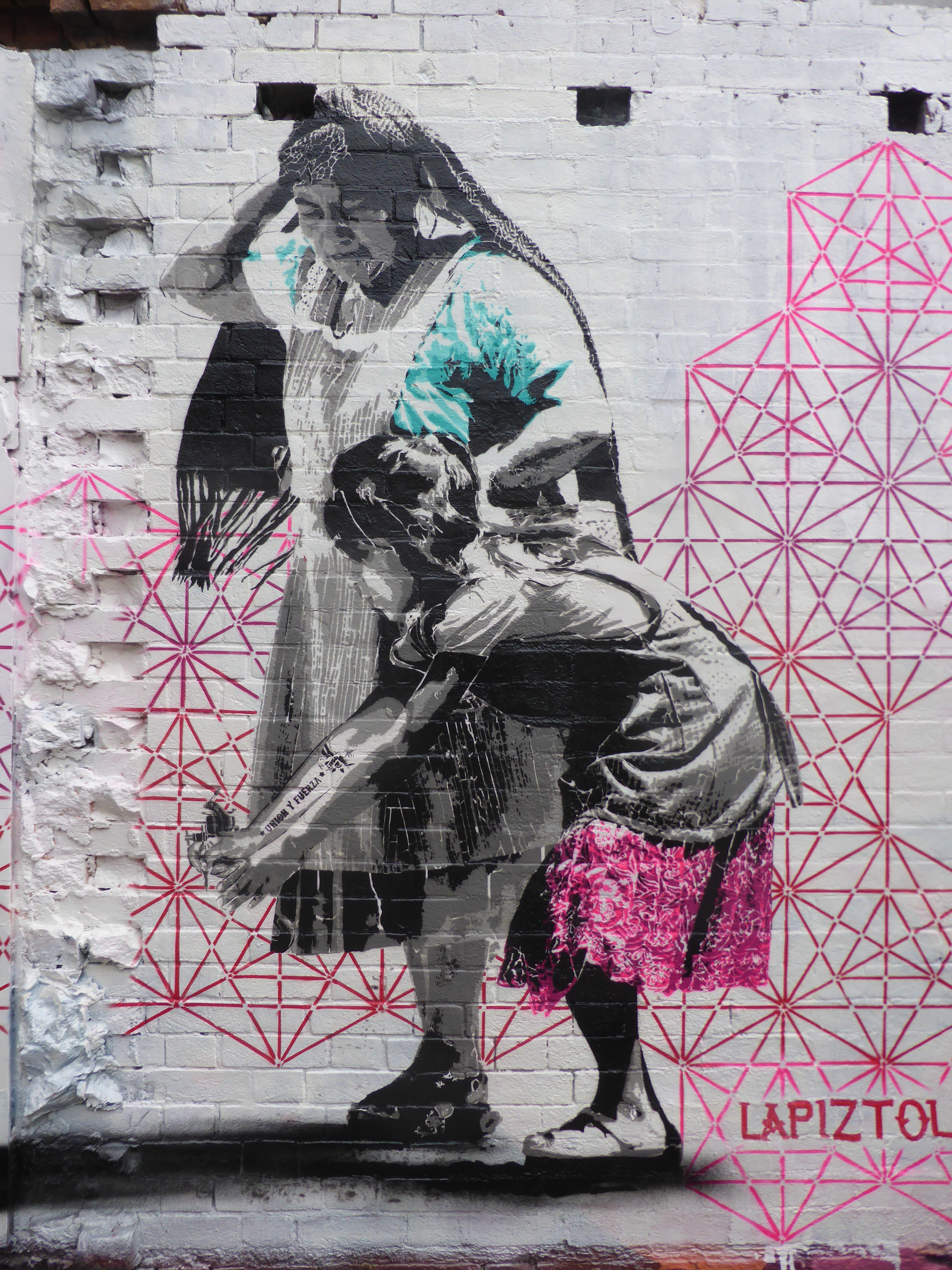 The little girl, her arm contains “Union y Fuerza” which translates to Unity & Strength. The key elements to liberating the struggle of the people. I zoomed up the image and noticed she has a bird with the word “Libre” or Free. The bird is a symbol often used by LaPiztola to represent the liberation of its people, which is no surprise it was displayed here as well.