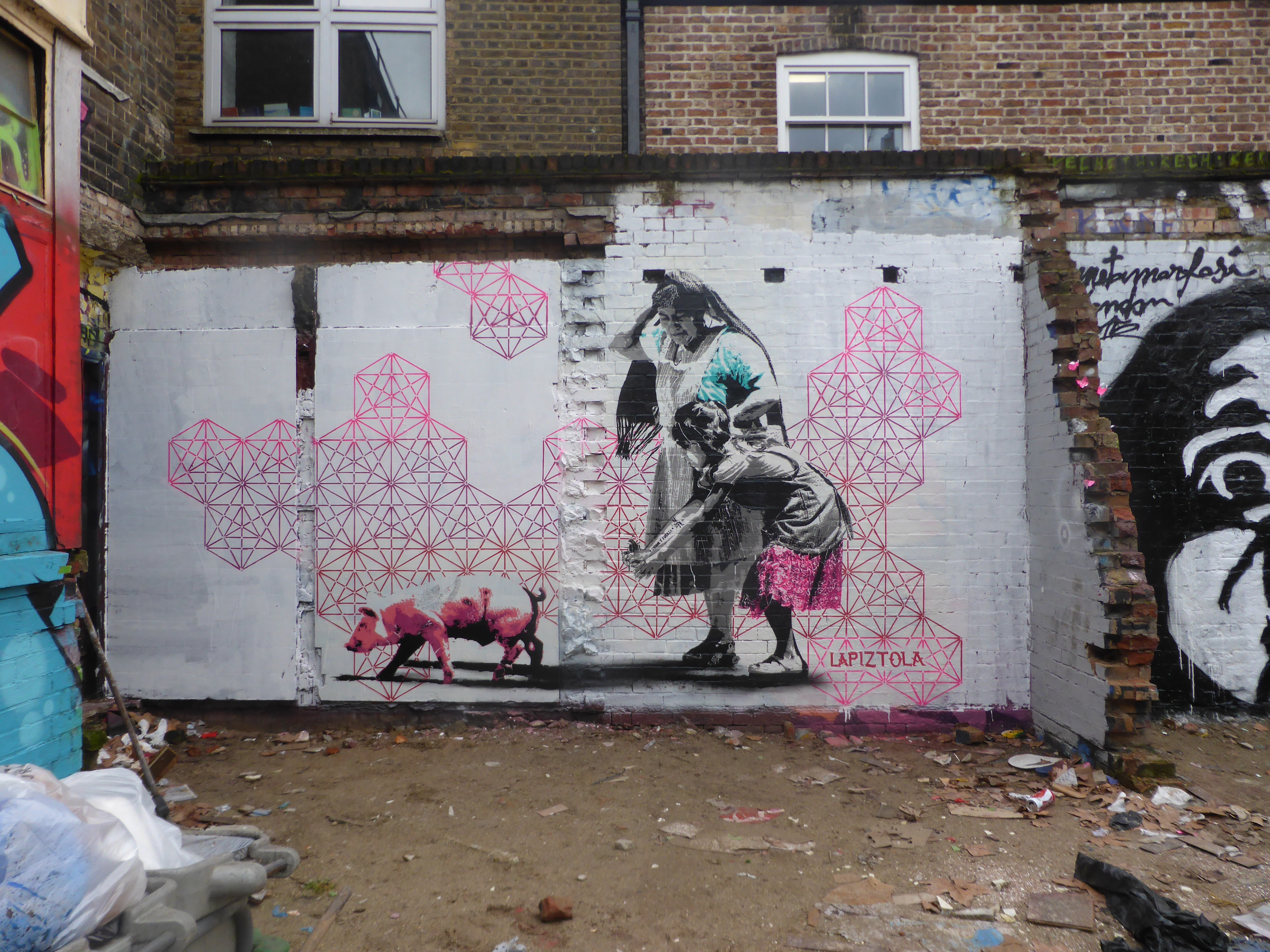 Mexican duo Rosario Martinez Llaguno & Roberto Vega Jimenez, members of the Mexican art collective Lapiztola Stencil based in Oaxaca, whose show Democracia Real Ya is currently on at the Rich Mix Complex on Bethnal Green Road, laid down one of their superb stencil pieces in the car park on Brick Lane yesterday afternoon. Having seen the fine pieces on display in their small exhibition it is a real treat to witness a piece of their work actually on the street. It’s certainly a striking piece, we can’t say we fully appreciate the meaning behind the piece, nonetheless we love the work,