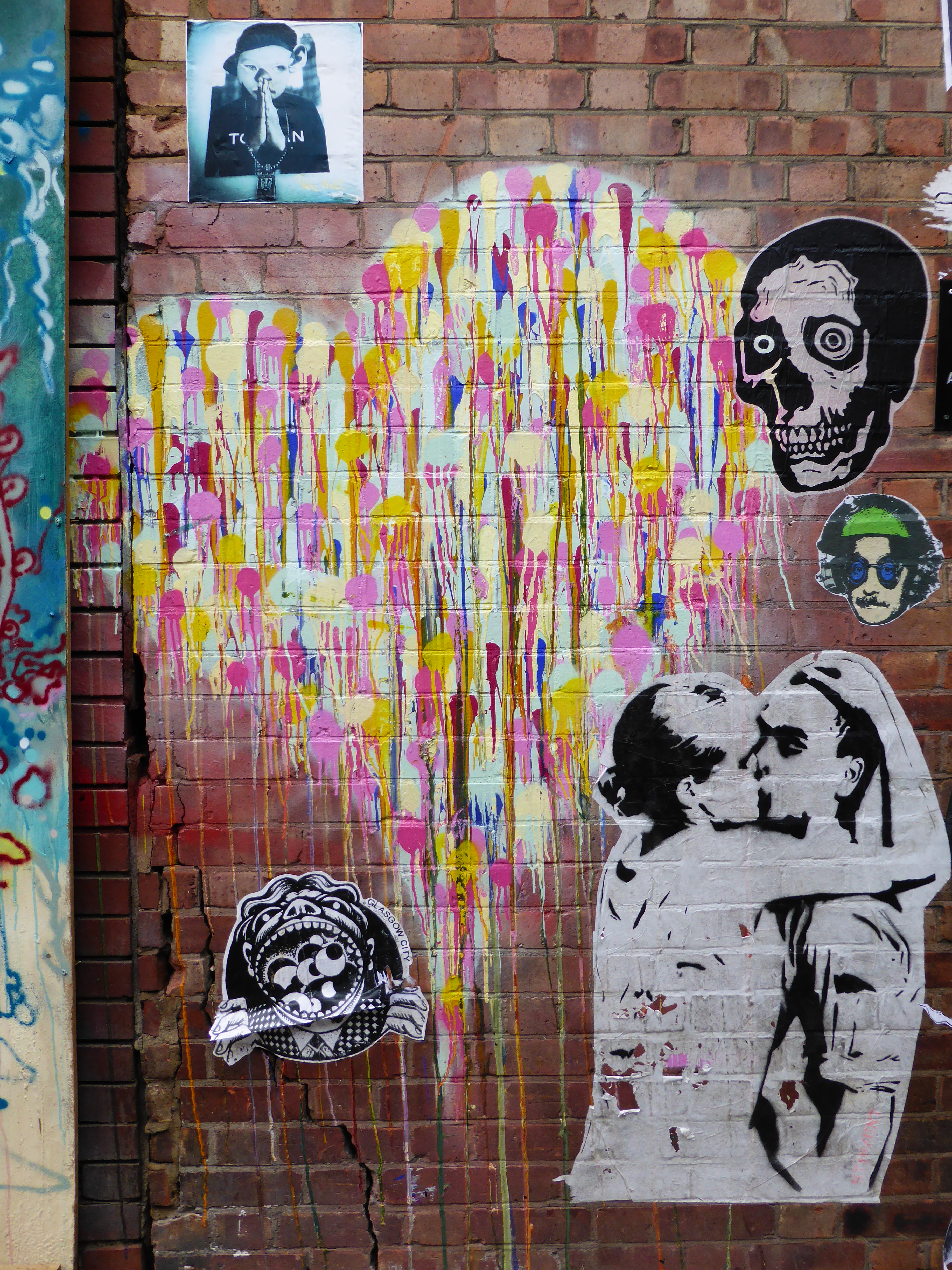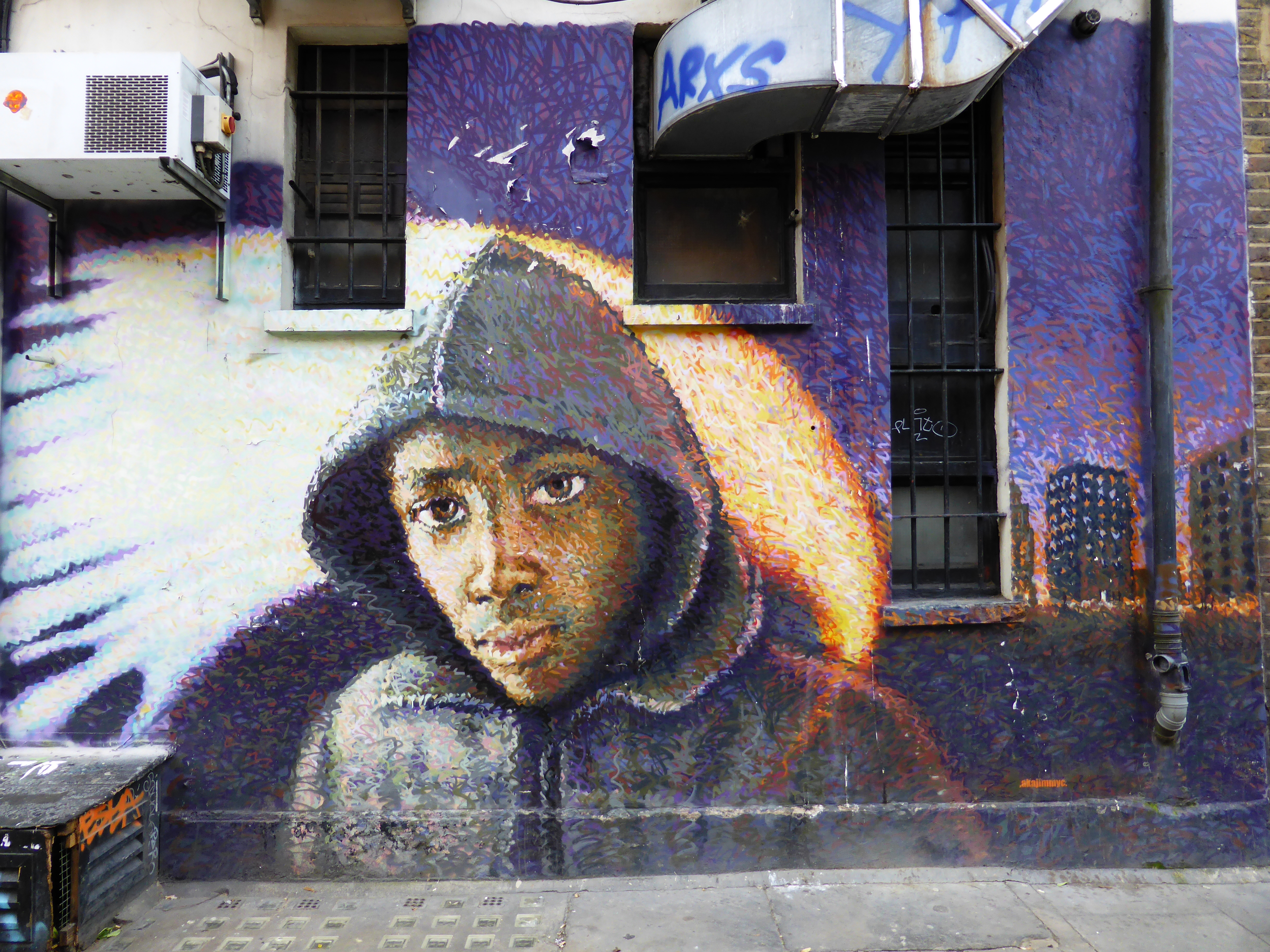 Australian artist Jimmy C was back in London yesterday where he painted a new piece of what he calls ‘Street Heart’ in Whitby Street, Shoreditch, following the tagging over of his previous Heart piece there. He also collaborated on a larger piece with Uriginal from Barcelona, interpreting a Lucian Freud image. Uriginal is an urban artist who works with colour and geometry and is influenced by a mixture of pop heritage and the kaleidoscopic inspiration of Gaudi’s mosaics, for the most part he paints in his native Barcelona. In contrast Jimmy C’s style is influenced by Pointillism and the aboriginal culture of his native Australia and started painting on the street in the early 1990’s as a part of the then growing Australian underground graffiti movement. In the process he has become a globally recognized artist who has painted the four corners of the globe. I can certainly see why, Jimmy C is one of our absolute favourite artists here at London Calling, it’s always an absolute pleasure to stumble across a work by Jimmy C, even if you have seen it before, and this was the first collaboration involving him I have seen in London. I hope to see more from this great artist throughout 2015. I have also included a picture of his previous piece of Street Heart on Whitby Street, along with the two other pieces that can currently be seen in in the same street. Well worth a visit, his works are so encapsulating. I love the fusion of Cubism and Pointillism elements to create the striking piece. It’s also great to be able to see which aspects if the work where created by the respective artists, both of their key styles shines through and contributes to the whole.