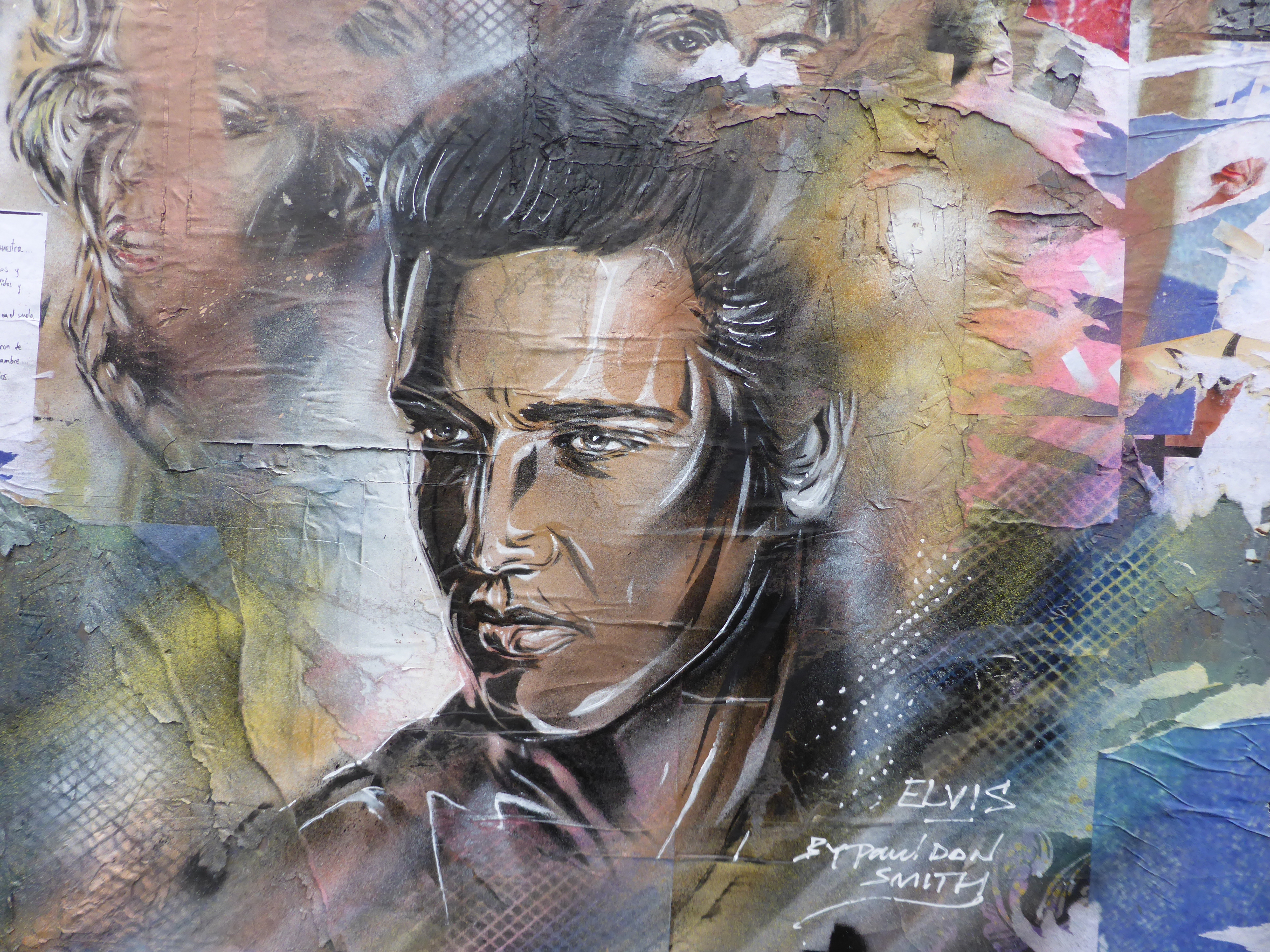 Stencil artist Paul ‘Don’ Smith has certainly been busy the last couple of weeks around Shoreditch & Brick Lane. I stumbled across two recent pieces of his, with a tribute to Elvis Presley to be spied on Hanbury Street off of Brick Lane, as well as a beautiful tribute to Paris & the Mona Lisa which can be seen on Great Eastern Street to the left of the iconic Village Underground building.