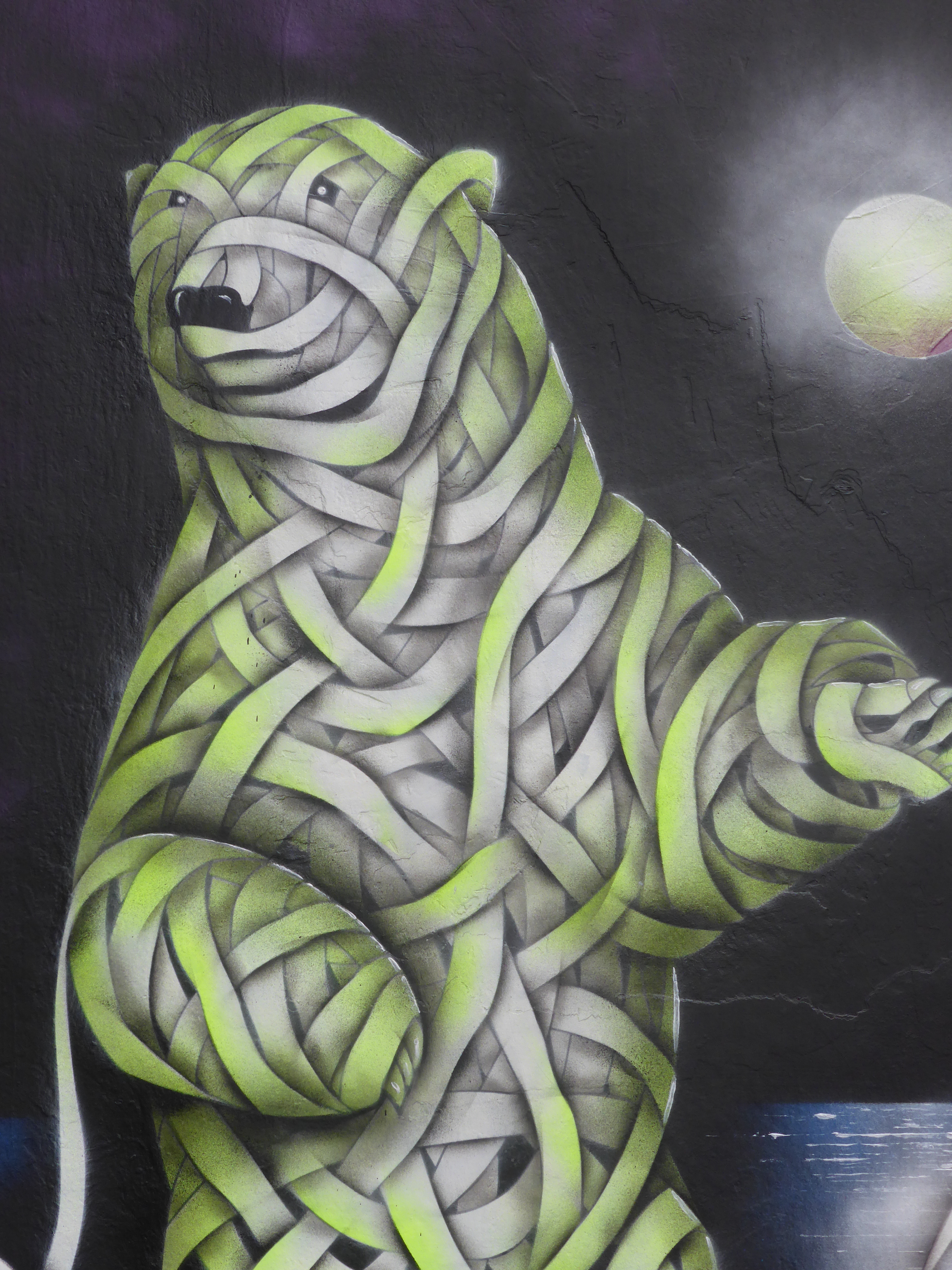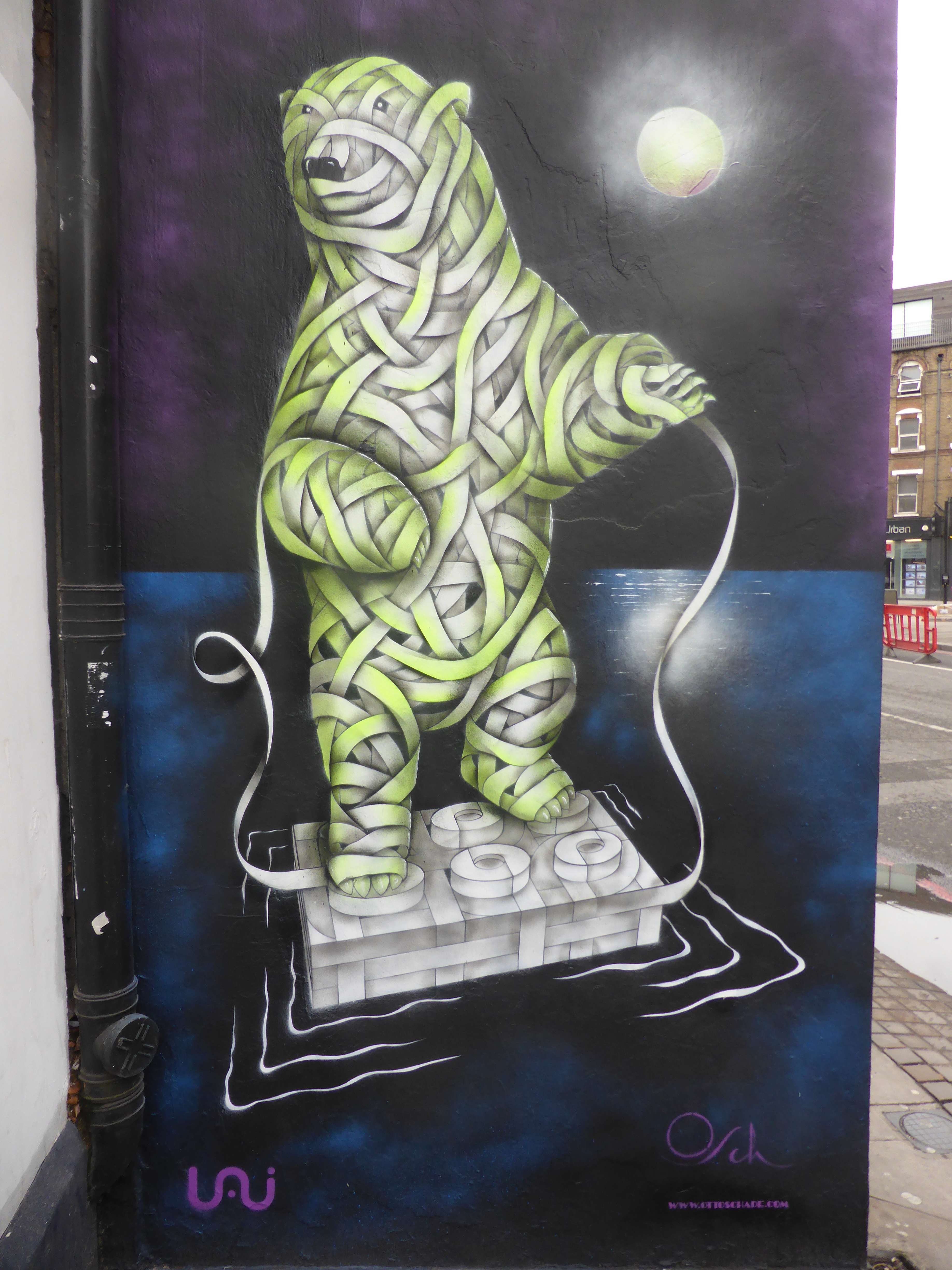 Osch’s Polar Bear on Curtain Road. Here I love how the block of ice the Polar Bear is standing on is unraveling, great depiction very much in his own style, for a sad but true situation.