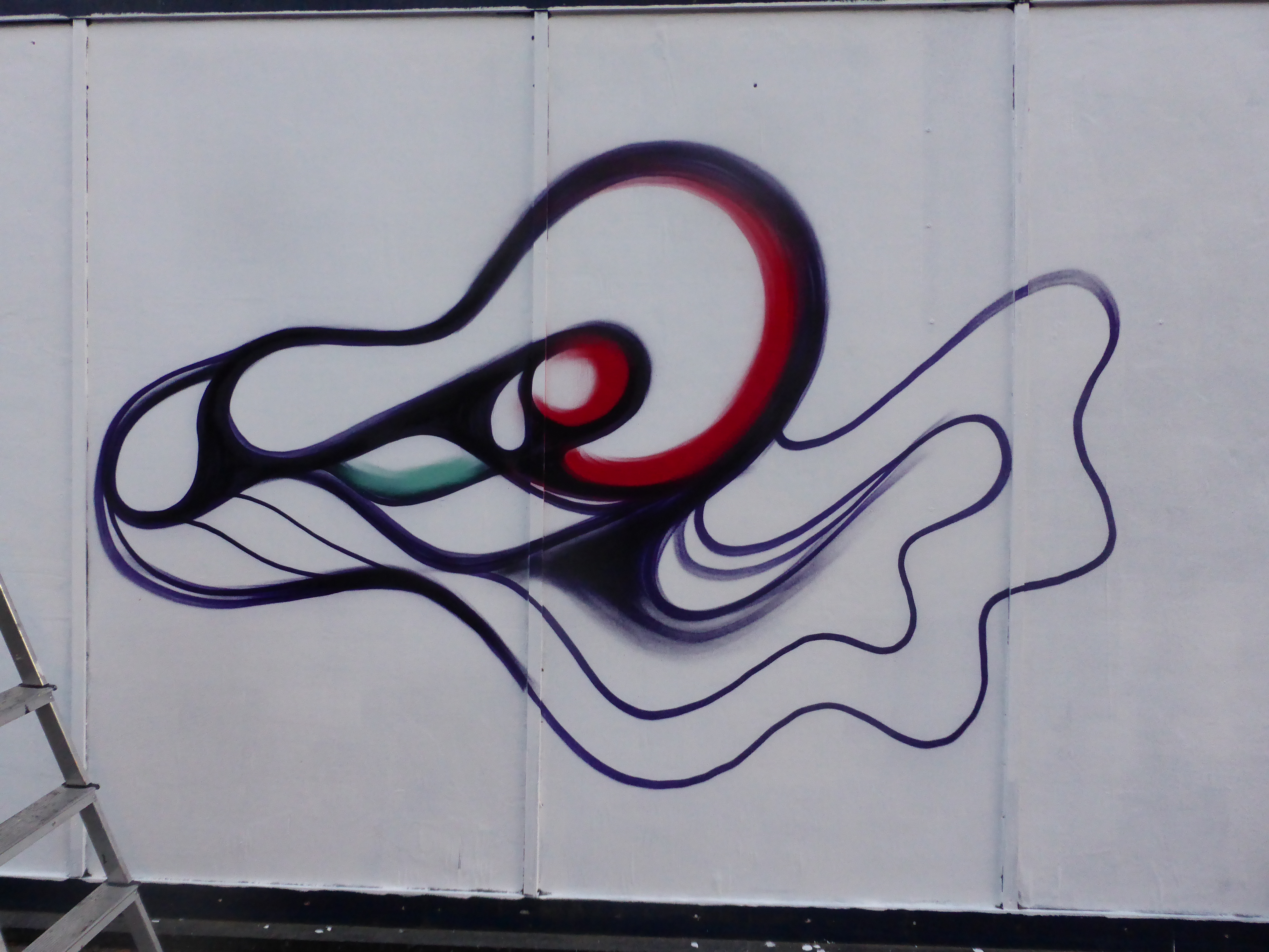 Anthea Missy who is from France, but now resides in Belgium, has only been painting on the streets since June 2014, with her first public work being done in Amsterdam and since then she has already got to paint in Brussels, Berlin, Paris, London, Vietnam & Cambodia. Anthea paints pieces which present an amorphic and organic construction of colour and shapes not found in nature. Anthea Missy sets to do this as she feels with such an overwhelming abundance of technological capability in the use of computers and cameras it is so easy now to capture perfect and highly realistic images of virtually anything, so she sets to paint the unrealistic the abnormal. Often using multiple shades of several core colours, Anthea Missy decided to paint for the first time with a deep purple colour as opposed to the use of black for her core outlines.