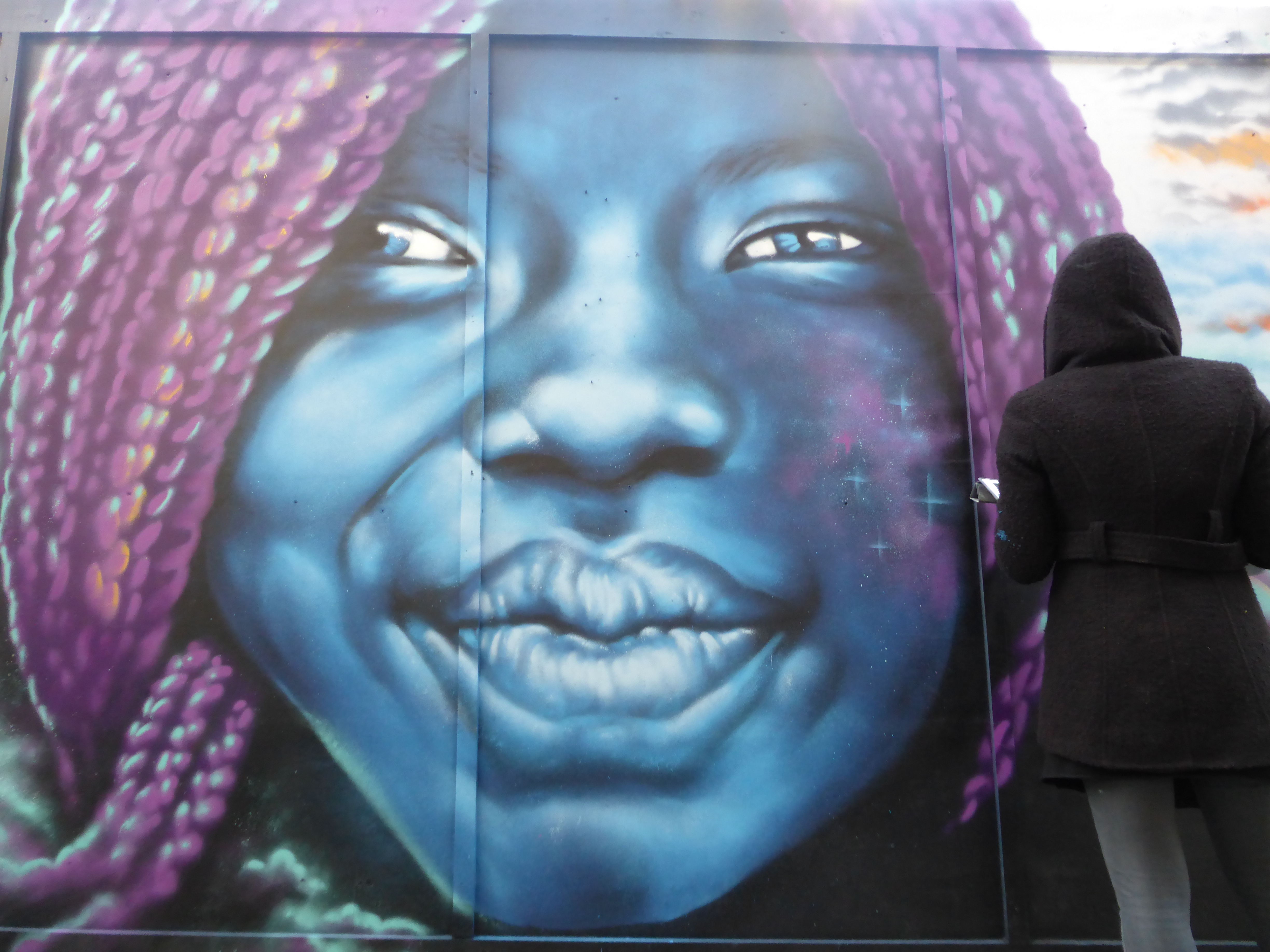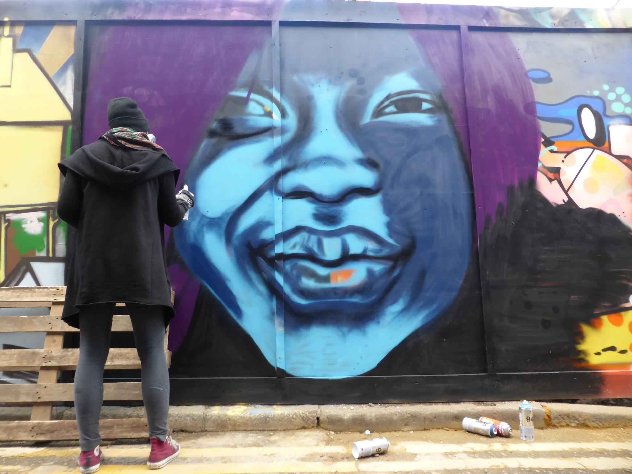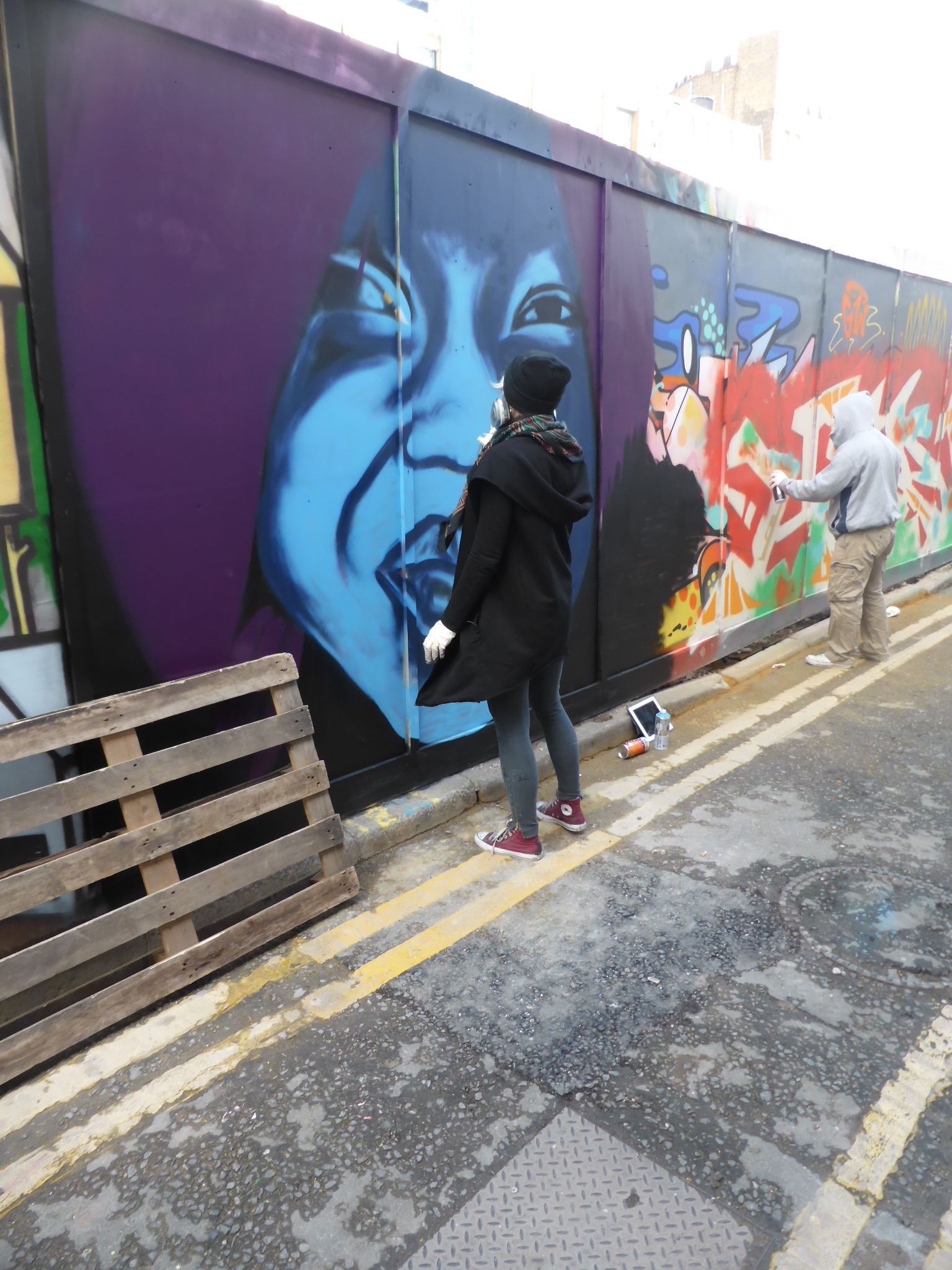 Well it’s been an exhilarating weekend here at London Calling, with the Femme Fierce Takeover show in Croydon, being invited by Anthea Missy to watch her paint, bumping into Dan Kitchener and capturing his work, and finally being given the heads up by the delightful artist Zina to come and capture her work in Blackall Street yesterday afternoon. In all Zina, who is from Norway but resides in London, spent some four to five hours working on this delightful piece, laying out one of her trademark predominantly blue-scale portraits focused on her tendency to paint either women or children. She couldn’t of been kinder and really made for an excellent day. Despite the beautiful winter sunshine that hit London yesterday, Zina was painting in the dark and windy alleyway stretch that is Blackall Street. Despite being disappointed not to be in the lovely sunshine, she was in great spirits, focused with her music on and seemed to certainly be having a great time working away, at one with her piece. Thanks so much Zina it was a pleasure and an honour to get to see you build up your superb piece, I had a great time.