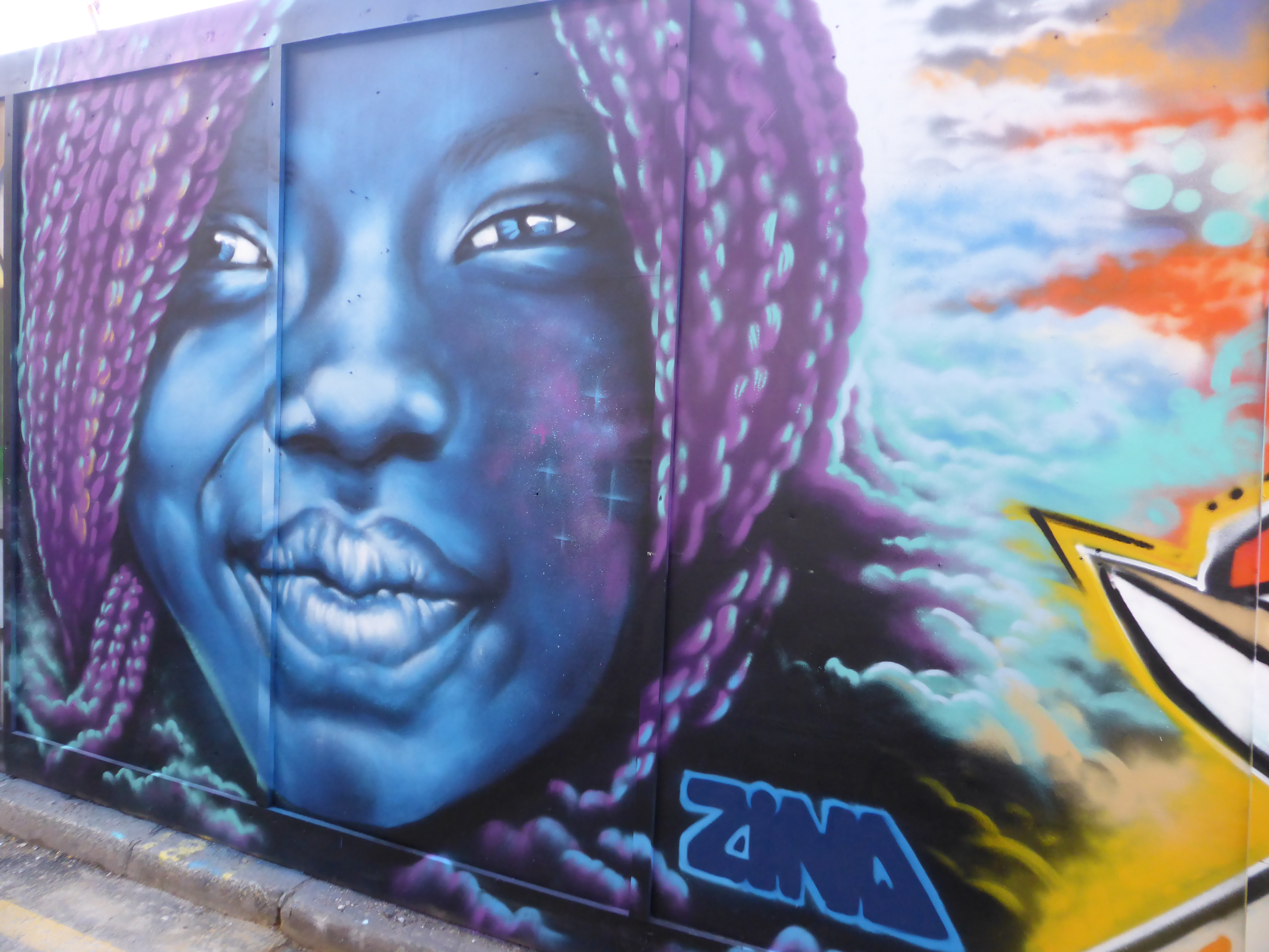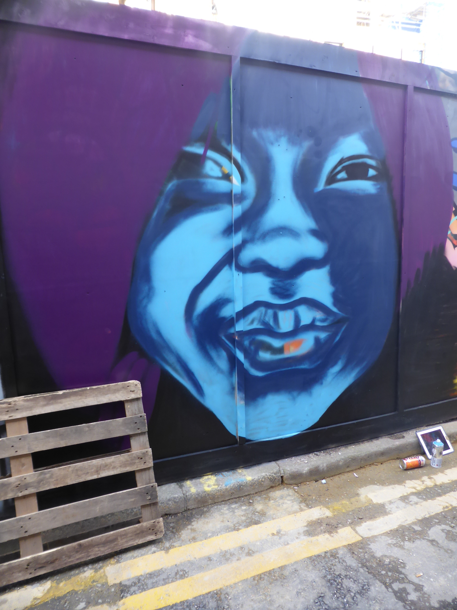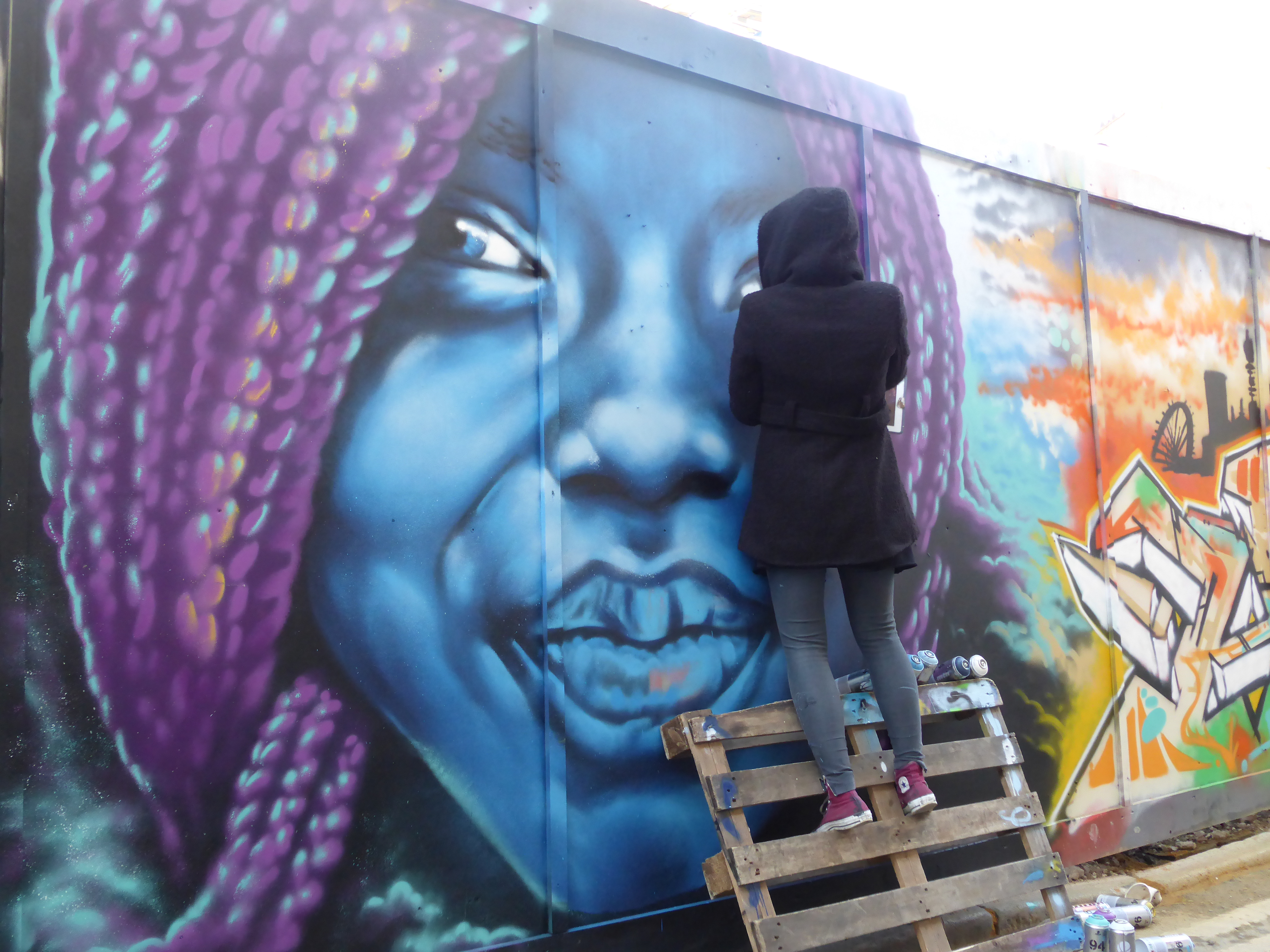 Well it’s been an exhilarating weekend here at London Calling, with the Femme Fierce Takeover show in Croydon, being invited by Anthea Missy to watch her paint, bumping into Dan Kitchener and capturing his work, and finally being given the heads up by the delightful artist Zina to come and capture her work in Blackall Street yesterday afternoon. In all Zina, who is from Norway but resides in London, spent some four to five hours working on this delightful piece, laying out one of her trademark predominantly blue-scale portraits focused on her tendency to paint either women or children. She couldn’t of been kinder and really made for an excellent day. Despite the beautiful winter sunshine that hit London yesterday, Zina was painting in the dark and windy alleyway stretch that is Blackall Street. Despite being disappointed not to be in the lovely sunshine, she was in great spirits, focused with her music on and seemed to certainly be having a great time working away, at one with her piece. Thanks so much Zina it was a pleasure and an honour to get to see you build up your superb piece, I had a great time.