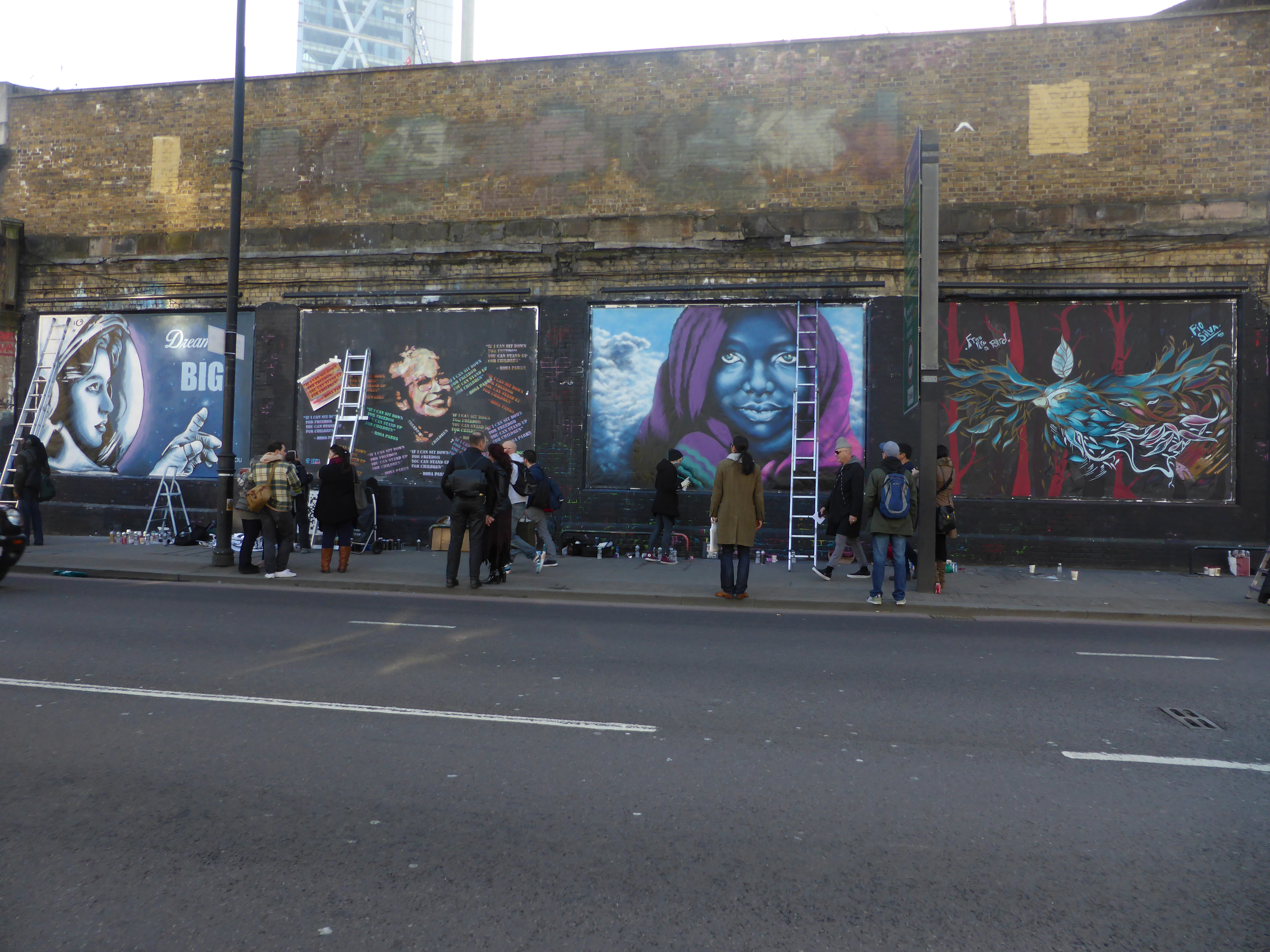 Shoreditch Art Wall towards the end of a glorious Saturday in the East End.