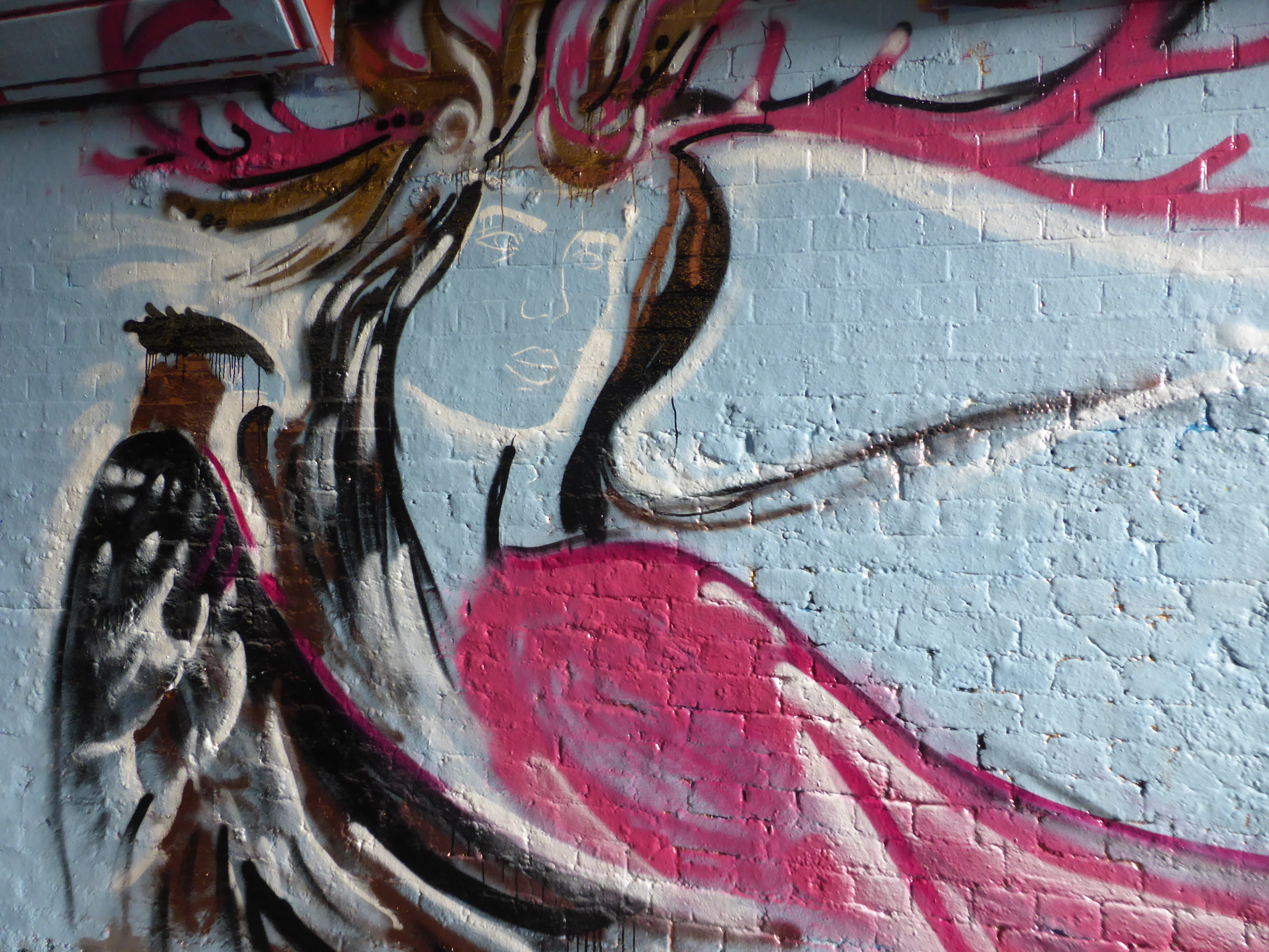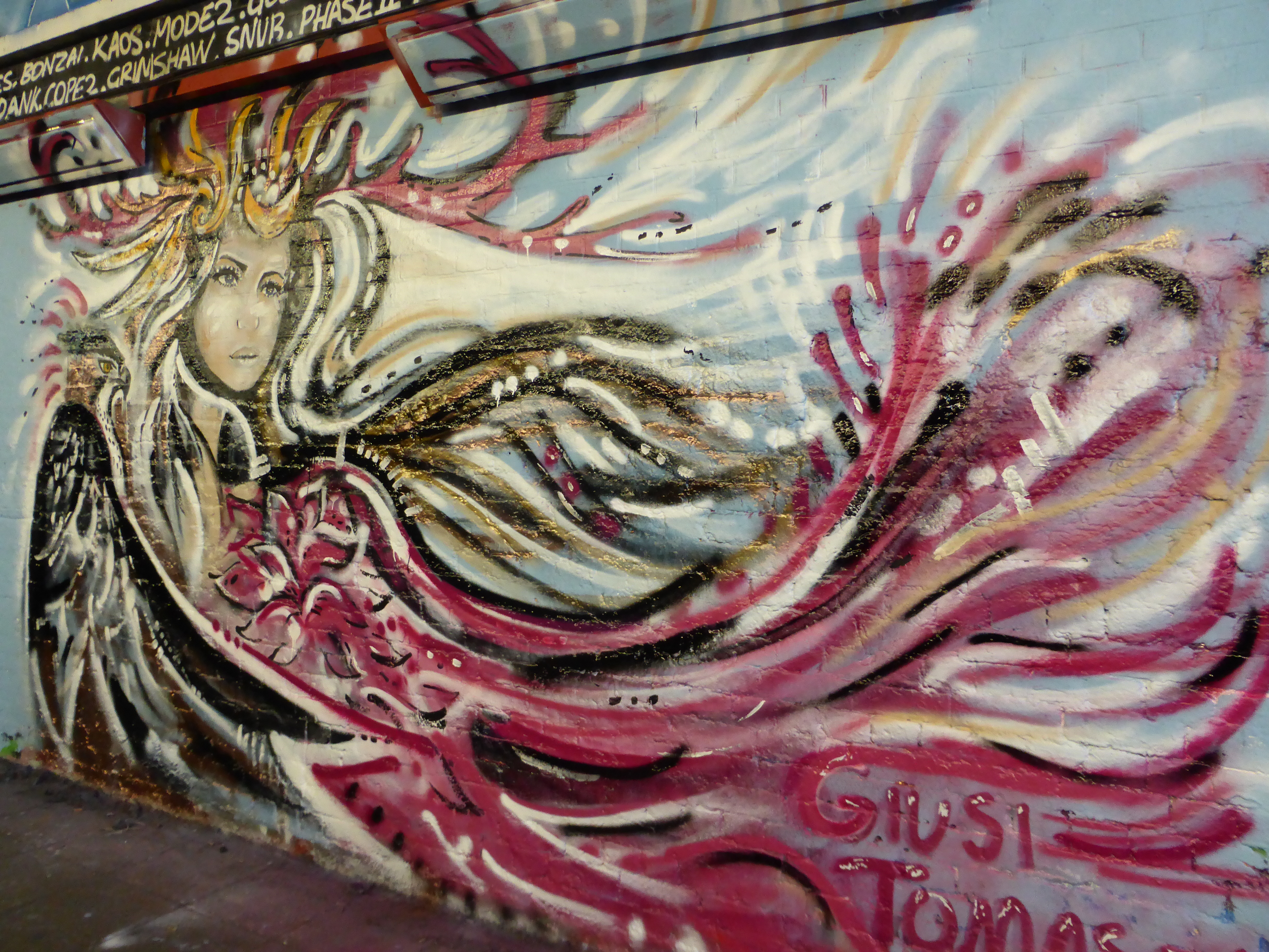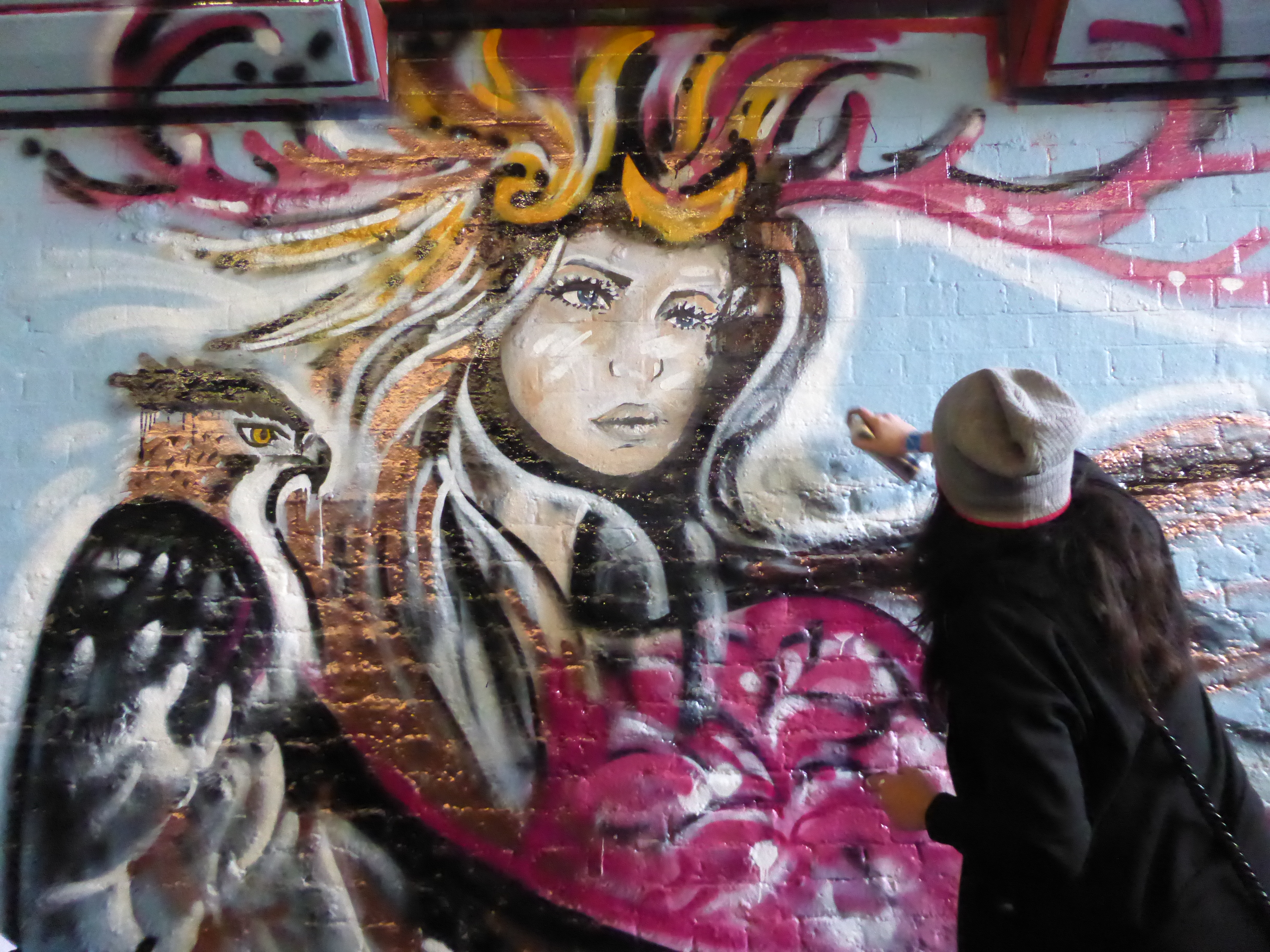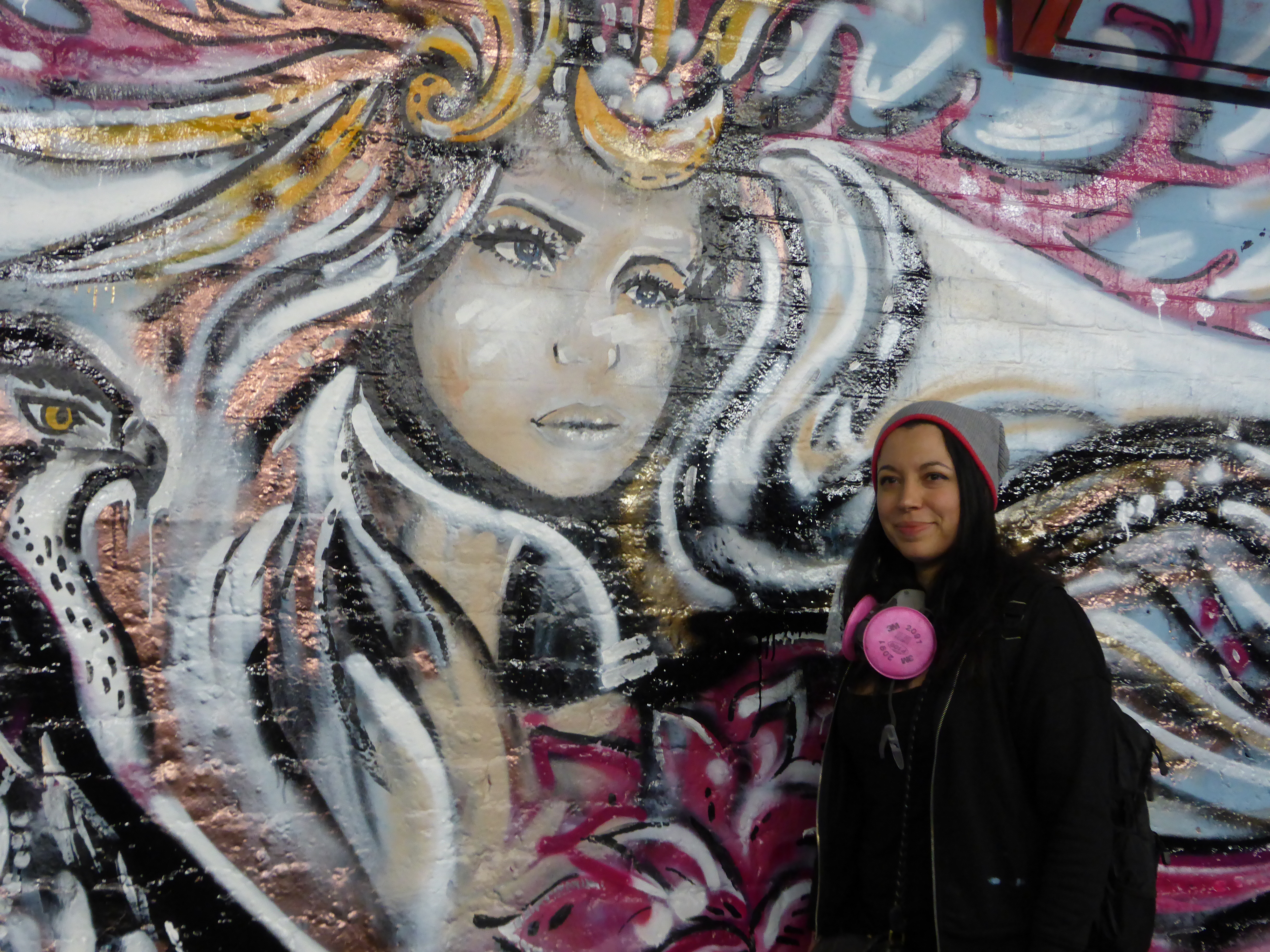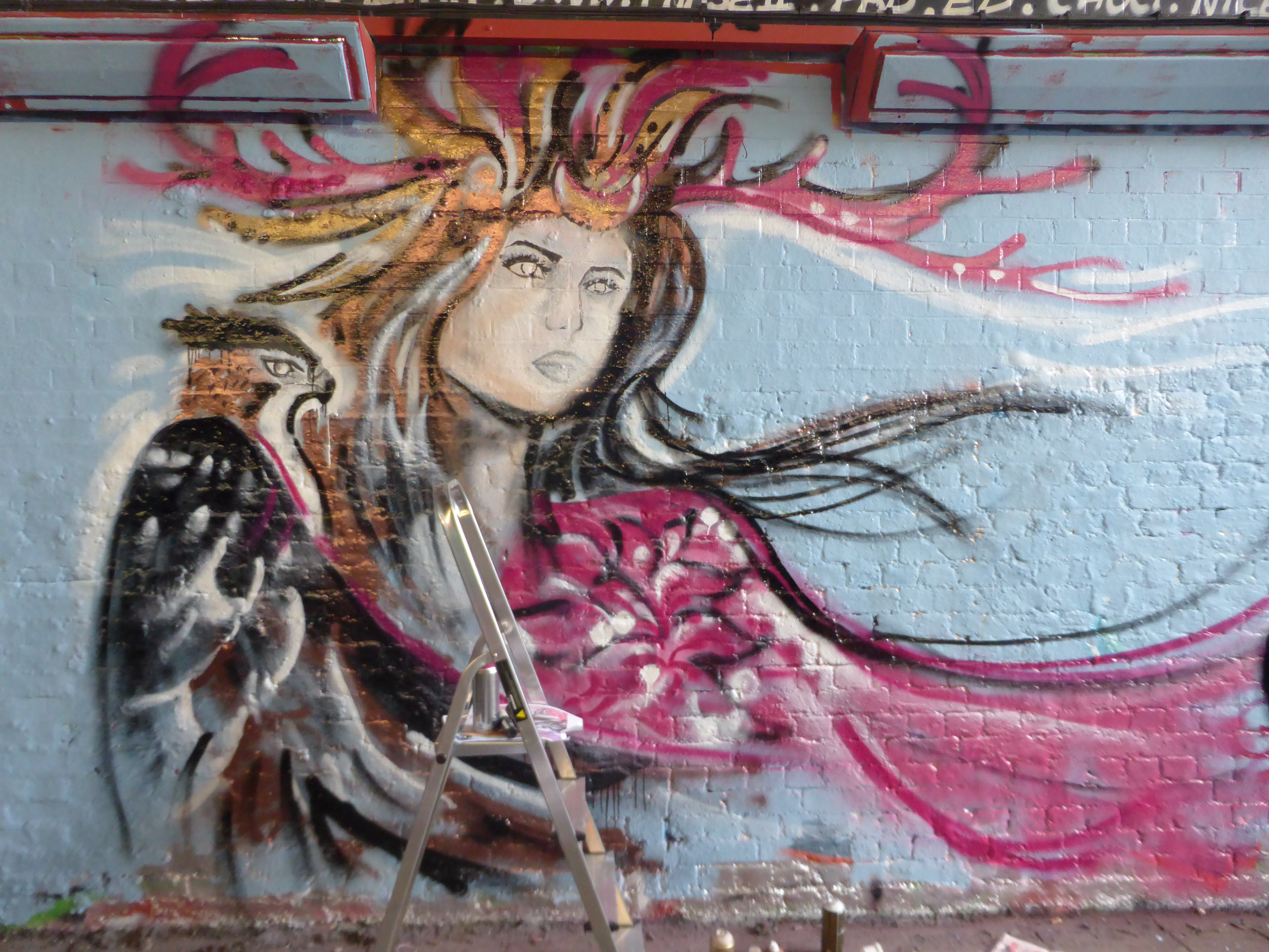 This morning in our Femme Fierce Reloaded feature series we have Giusi Tomasello who laid out one of the highlights of the festival for us at London Calling. This was only the fourth wall in public which Giusi has painted, not that you would tell to look at it, and our second to witness at London Calling, first seeing Giusi work her stuff at Femme Fierce Croydon. On both occasions we have been very much impressed, and were really happy to see Giusi up her game painting a far more elaborate and detailed piece than her Croydon Femme Fierce work. Giusi really went all out for the big day with her depiction of Artemis, who in Greek Mythology was the Hellenic goddess of the hunt and protector of young girls, a perfect choice for the day, as well as for her style and subjects of choice, focused on strong mythical goddesses and warriors. When you view the piece you are automatically drawn to the striking face and head dress, but there really is so much more to look at, we absolutely love the soft focused air brush sort of style she uses to generate an ethereal quality which fits in with her use of characters from classical mythology. It was an absolute pleasure to meet up with the delightful Giusi Tomasello for the second time painting and watch her work her magic, building up the piece, and to chat throughout the day. Thanks for a great day Giusi and excellent work, very Femme Fierce. We here really hope to see more of her work around London in the future.