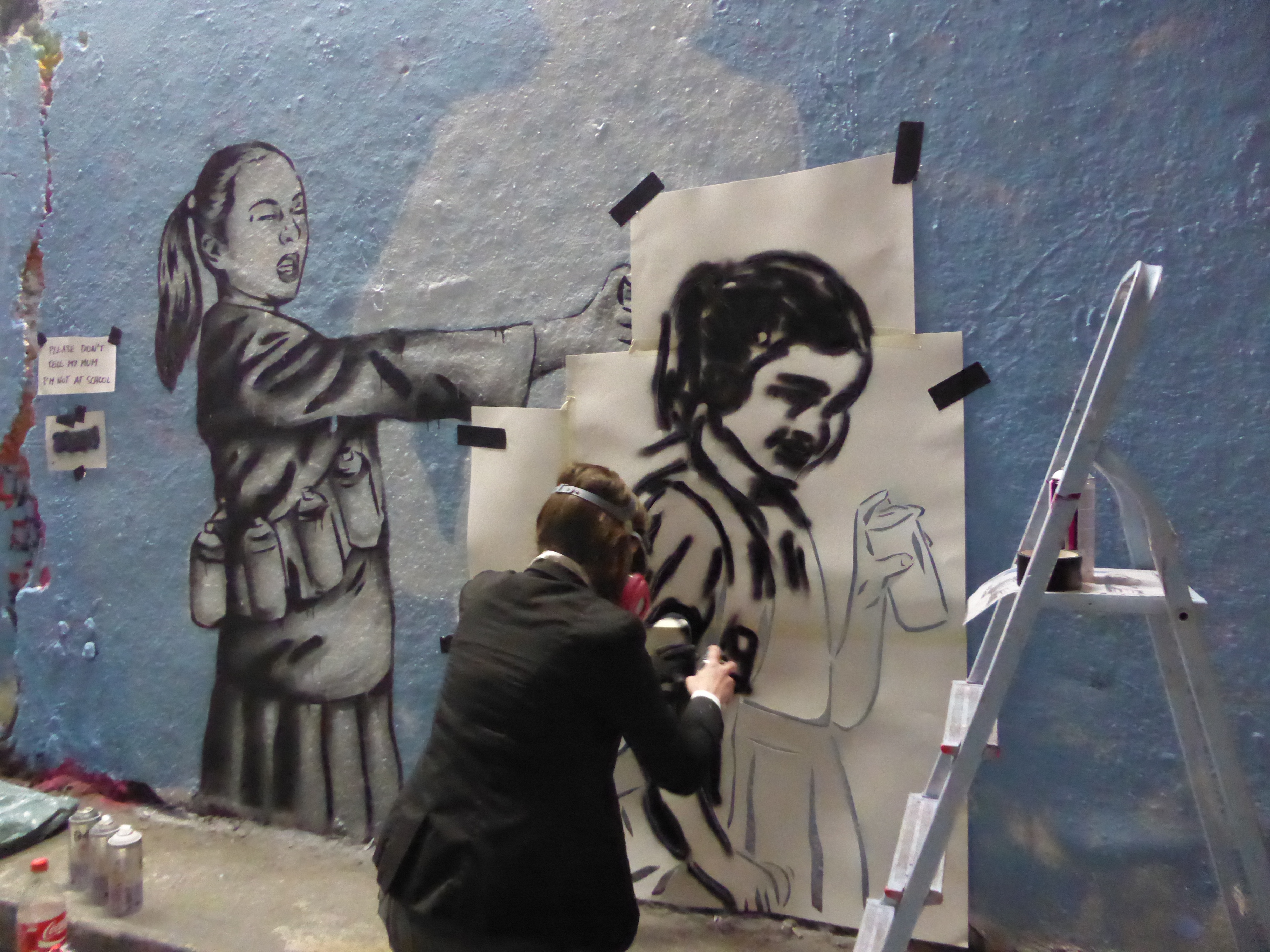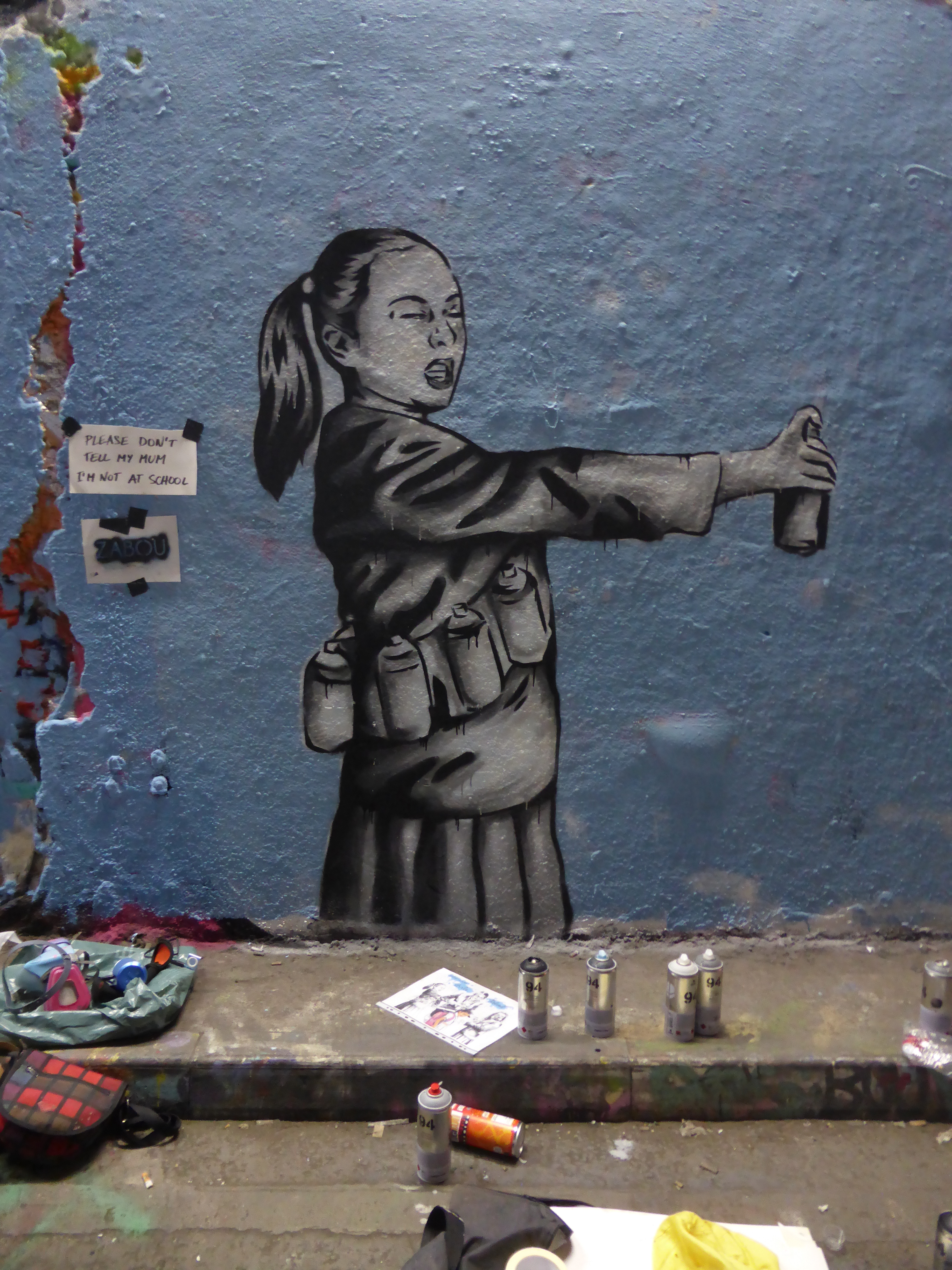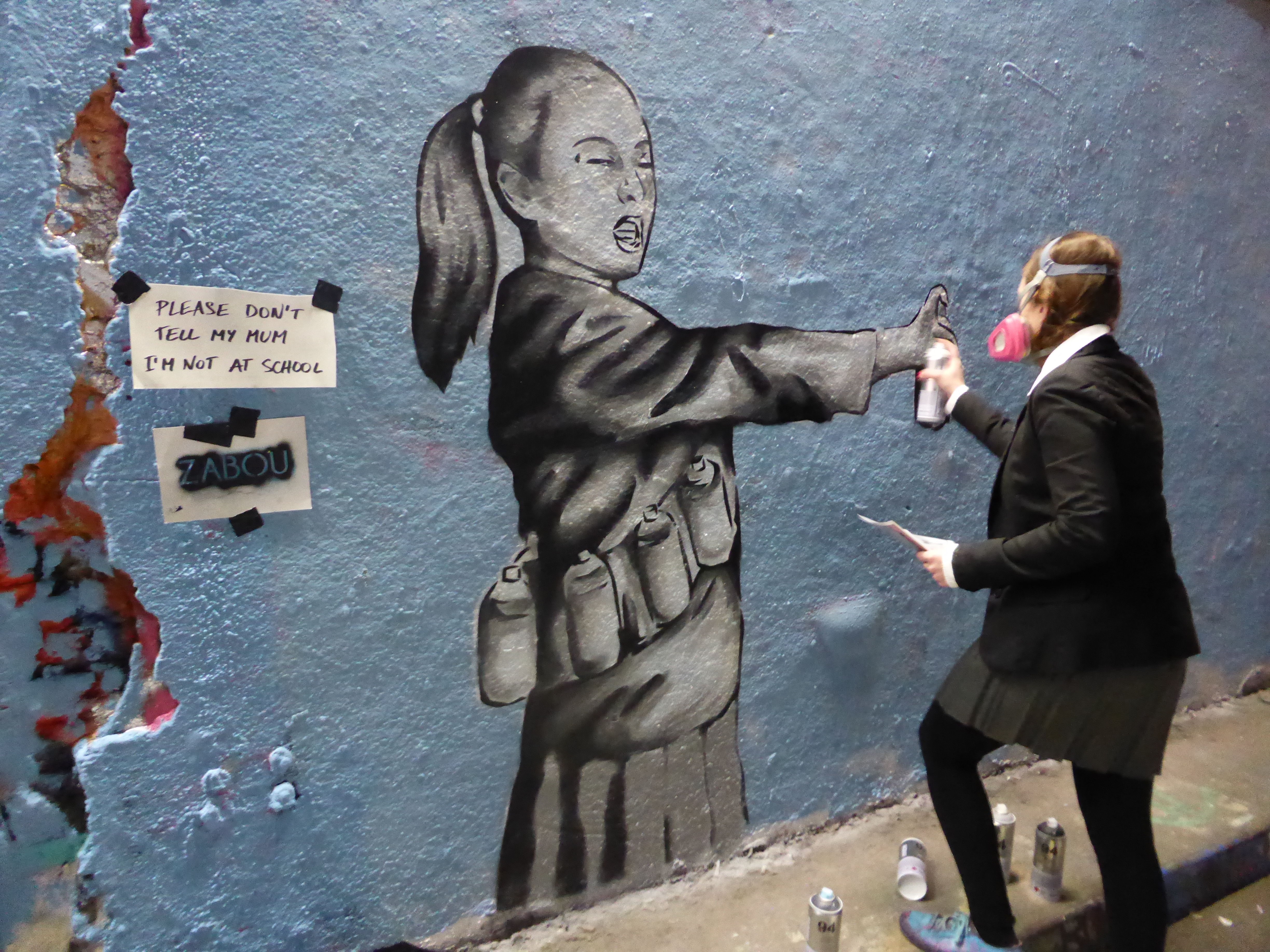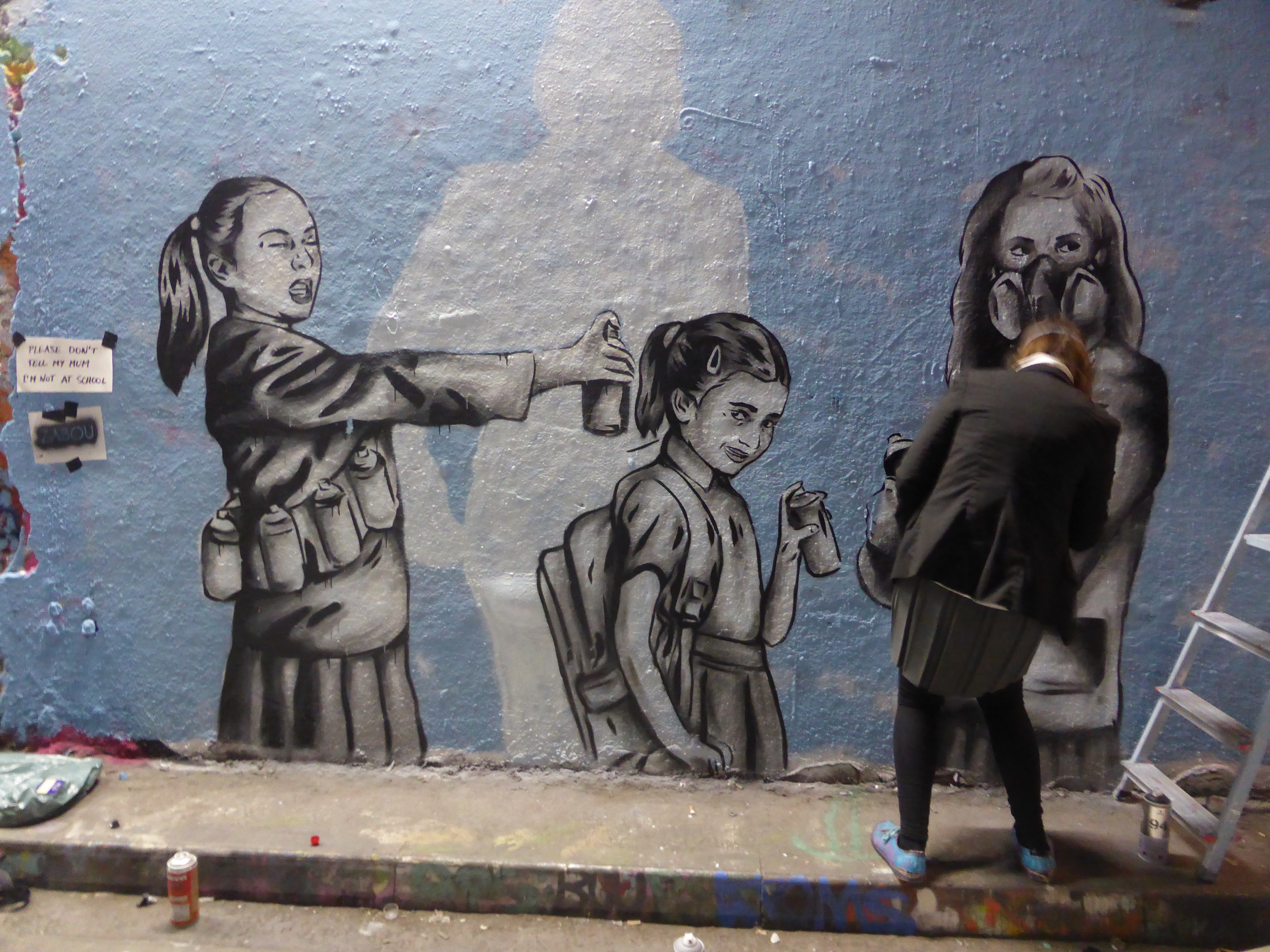 For Leake Street Zabou went with a more rebellious, and even, cheeky piece entitled “School Is Over Girls…Reload“, which still held her true and consistent message of female empowerment. No artist embraced the spirit of their own piece as much as Zabou – dressed completely in character, as if she was almost painting a portrait of her former self, along with the excellent touch of an additional note she posted up stating “Please Don’t Tell My Mum I’m Not At School”, Zabou clearly had fun and laid out in the process, a real highlight of the day which was very appropriate to the ethos of Femme Fierce Reloaded. It was a real pleasure to witness Zabou build up her piece, stencil by stencil and character by character during the paint jam and end the day with such a work. If Zabou’s previous piece was set to inspire people to “Dream Big”, her Leake Street piece seemed set to inspire people to have fun doing what you may love.