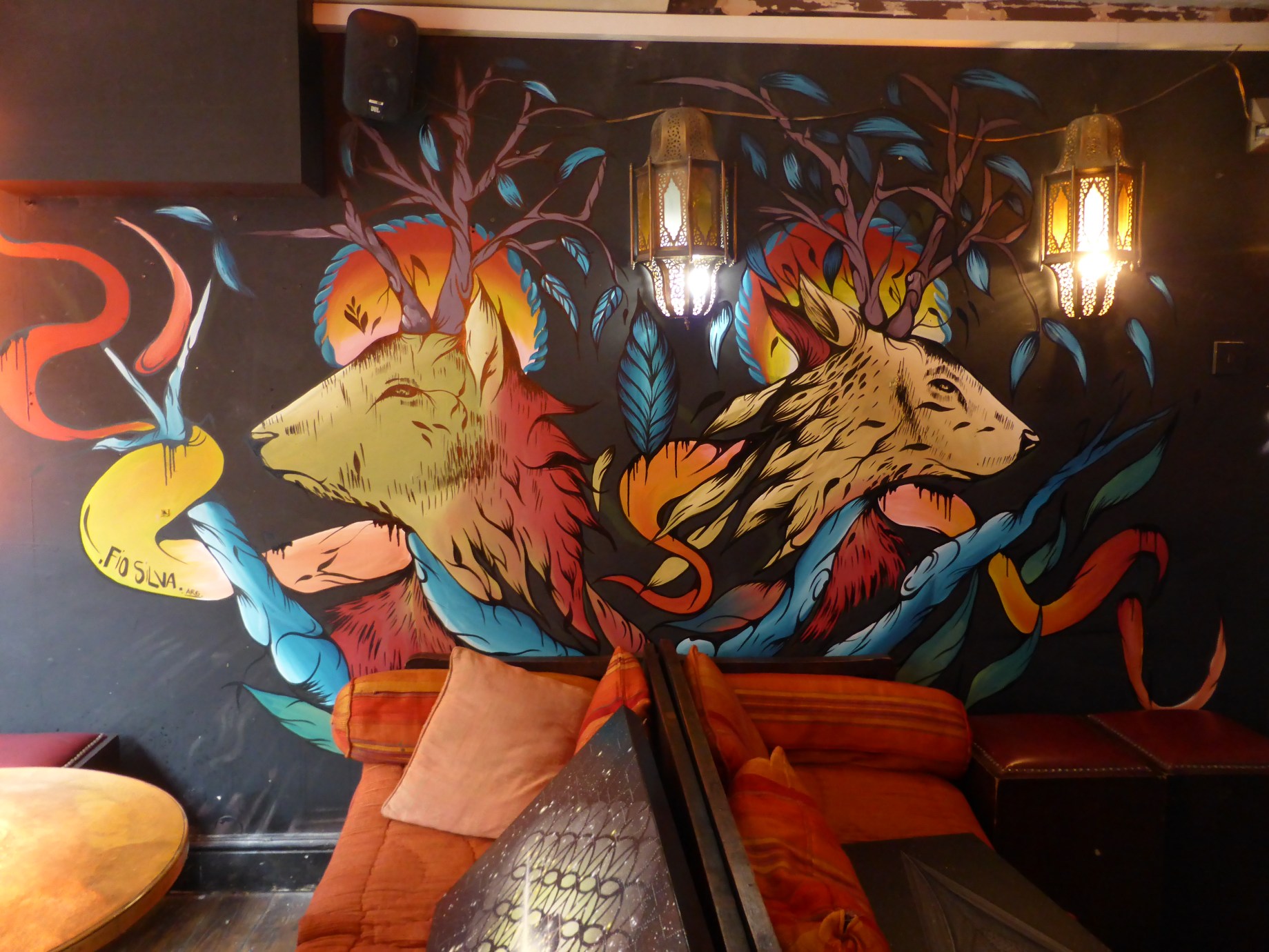 Last Monday Fio Silva painted her fifth, and final London wall, in five days. We had been extremely privileged to get to spend some time with Fio, who was over as the winner if The Springs Project ‘Next Big Thing’ international street art talent competition, and witness her create three of the previous four walls, and were fortunate to catch the fourth piece just as it was finished. So it seemed like an eternity in order to get the chance to catch her final work which is nice and safe in Monty’s Bar on Brick Lane, a real gem for street art in London, with murals on the walls from an impressive range of artists. This piece from Fio, which is I have to say perhaps the highlight of her visit, is yet again stunning. We love how she has made the deer antlers into tree branches, in her trademark style of fusing animals with organic elements such as leaves, branches and trees, set to a colour palette, on this occasion, focusing on blue and orange offering a beautiful background to the main focus points. Yet another great work Fio Silva.
