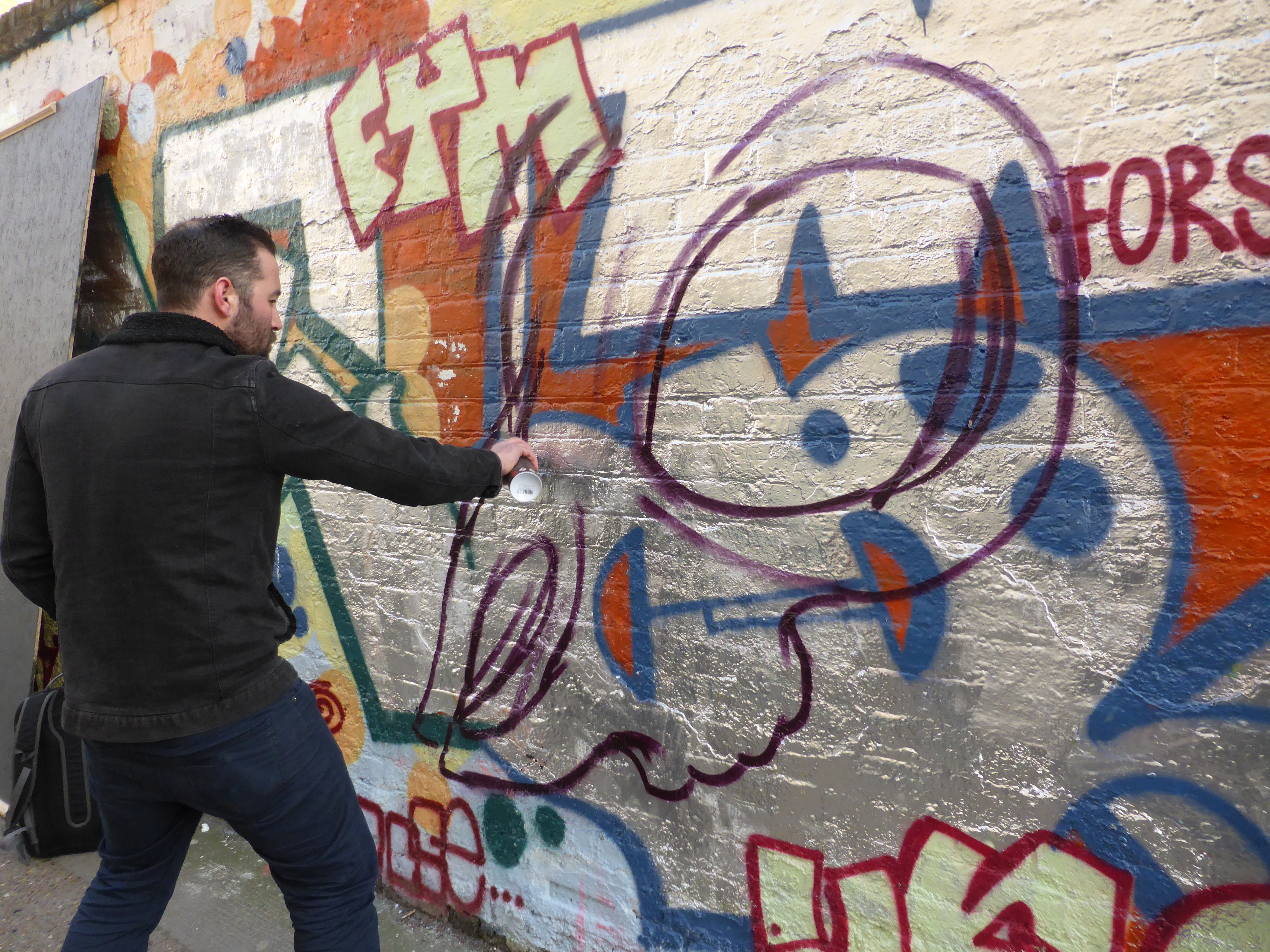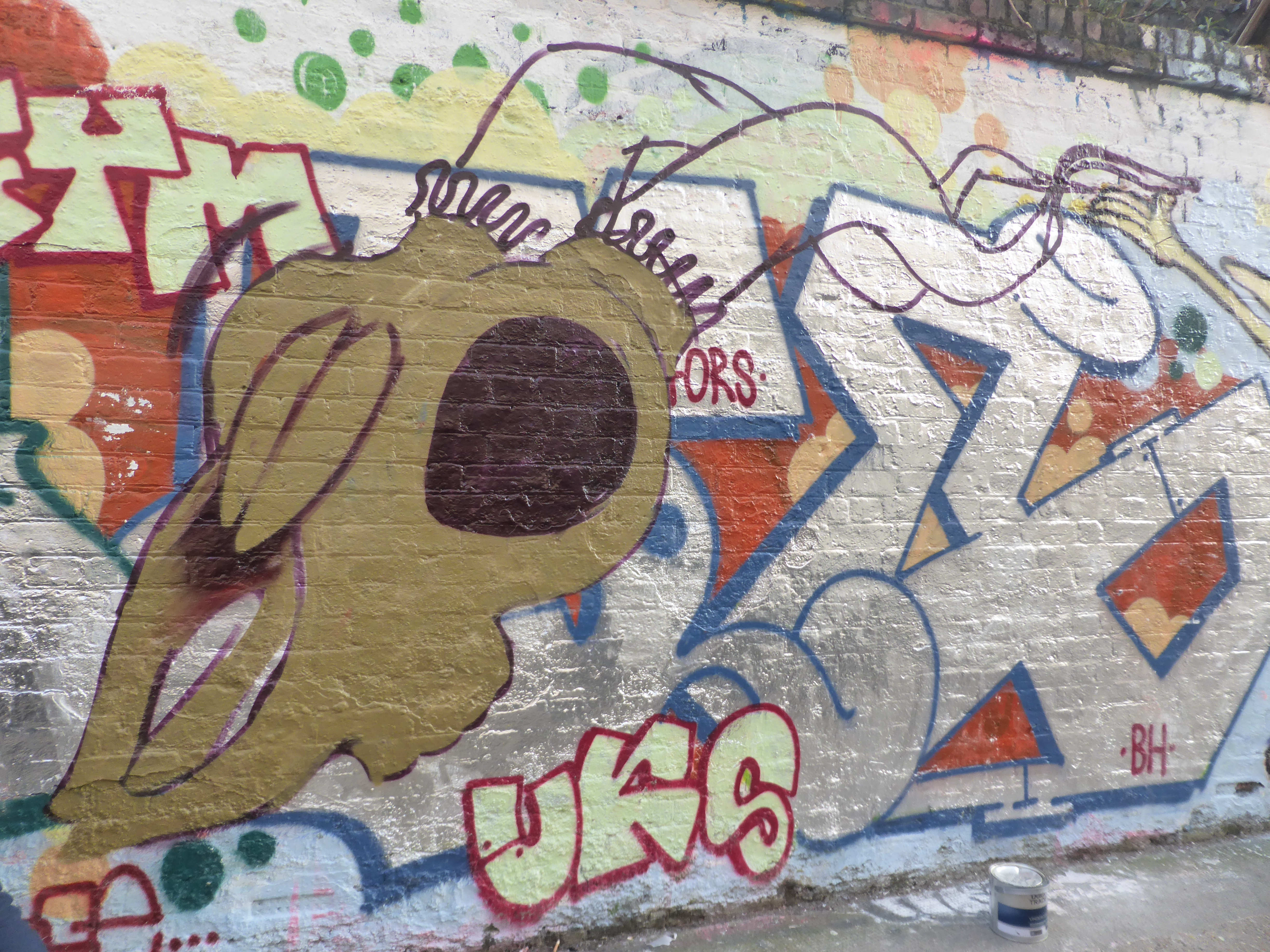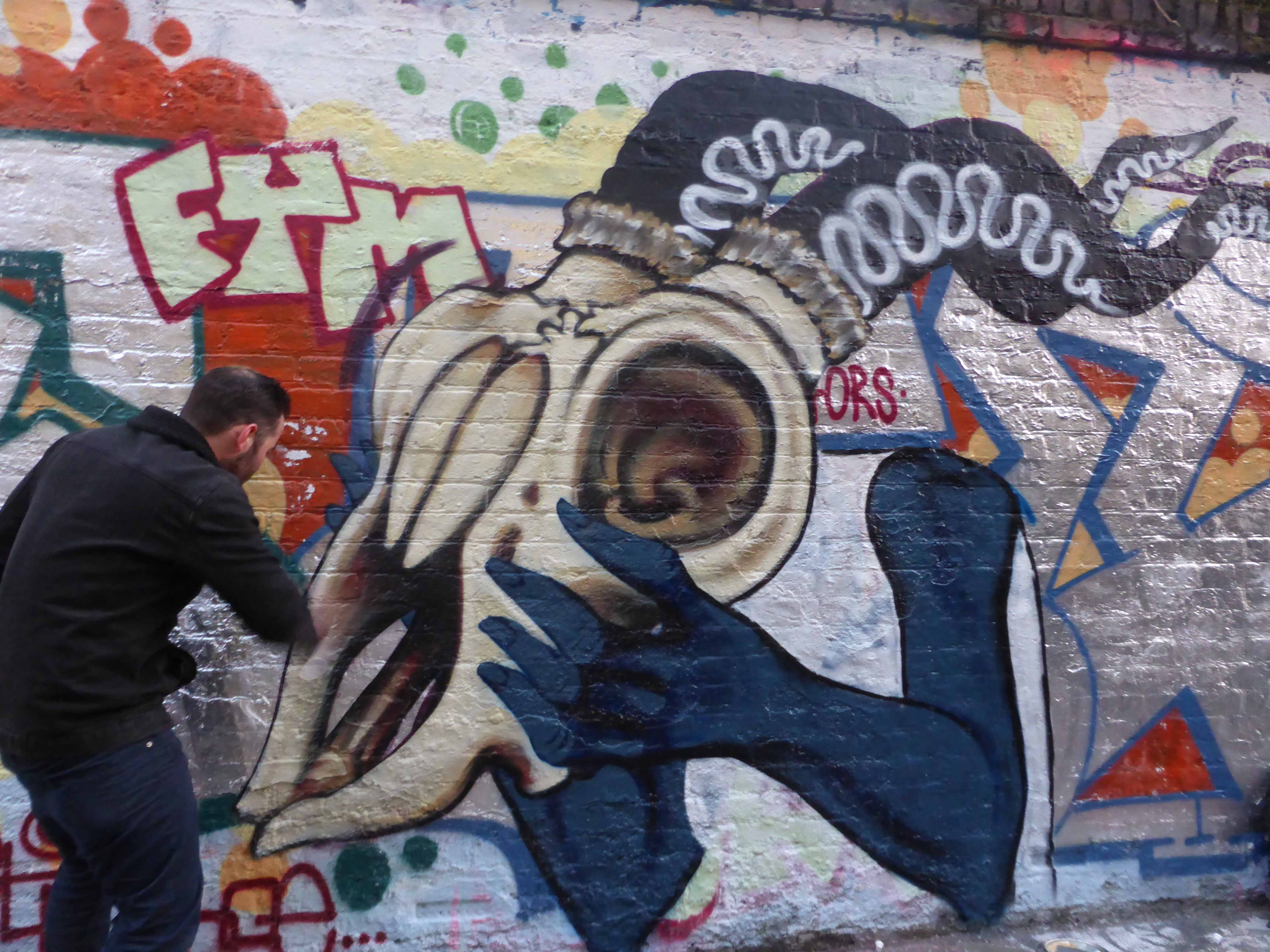 On Saturday afternoon we were fortunate enough to bump into several artists painting throughout the day, but ended the afternoon by meeting Himbad and Ali Hamish working on Sclater Street. The pair were in fine spirits while Himbad was working on a piece, and both very sociable to us here at London Calling. Ali Hamish was keeping Himbad company and as the sun started to set and temperatures dropped, he decided the best way to keep warm was to paint, no complaints here. It was great to see Ali knock up one of his trademark street art characters, that of a strong female clutching a goats skull to her face. We loved the way he really brings the muscles out on the arms and it was also interesting to see street art on top of graffiti for a change, very nice spin. Great work Ali, and thanks to you and Himbad for your time, very much appreciated.