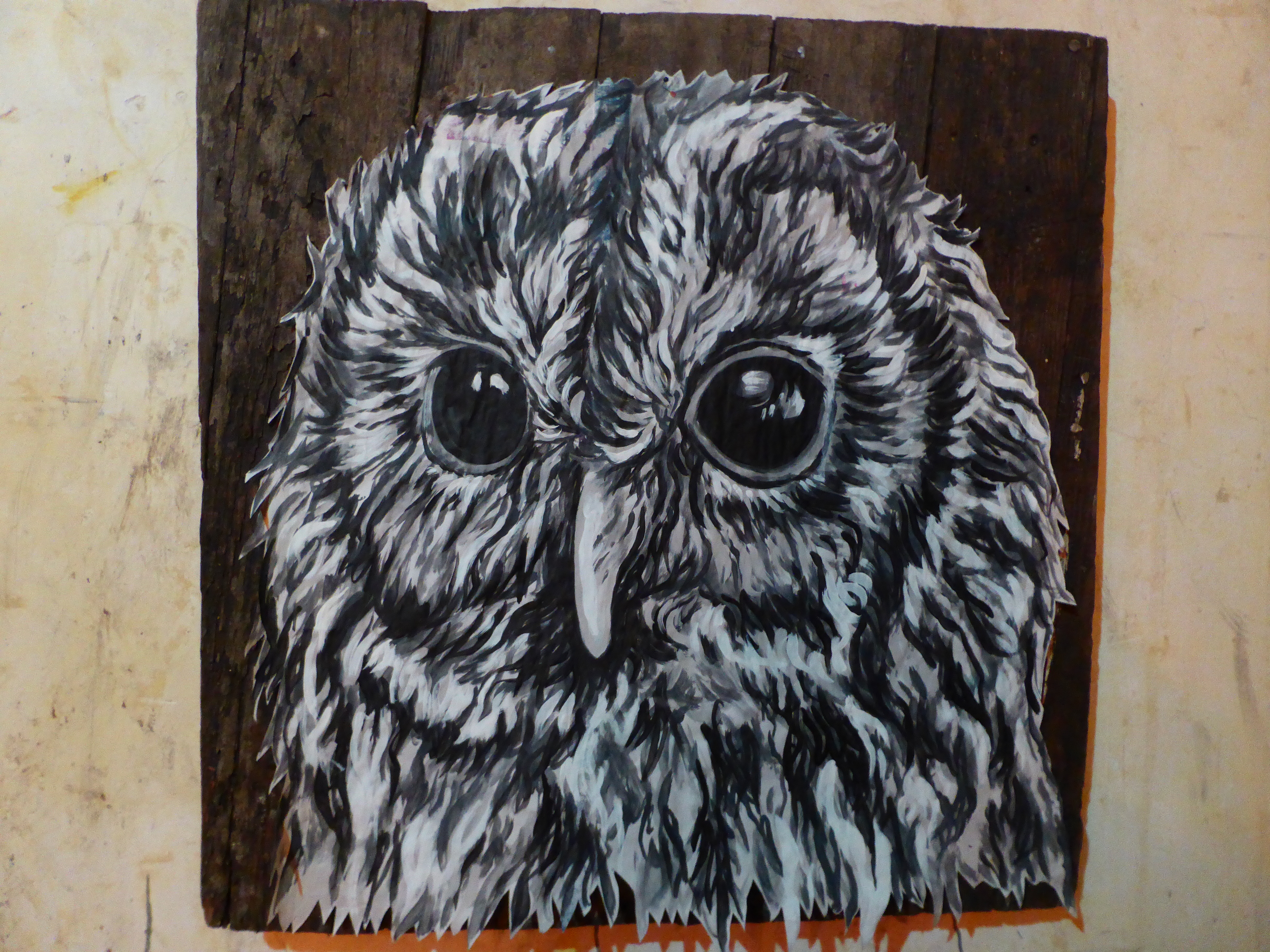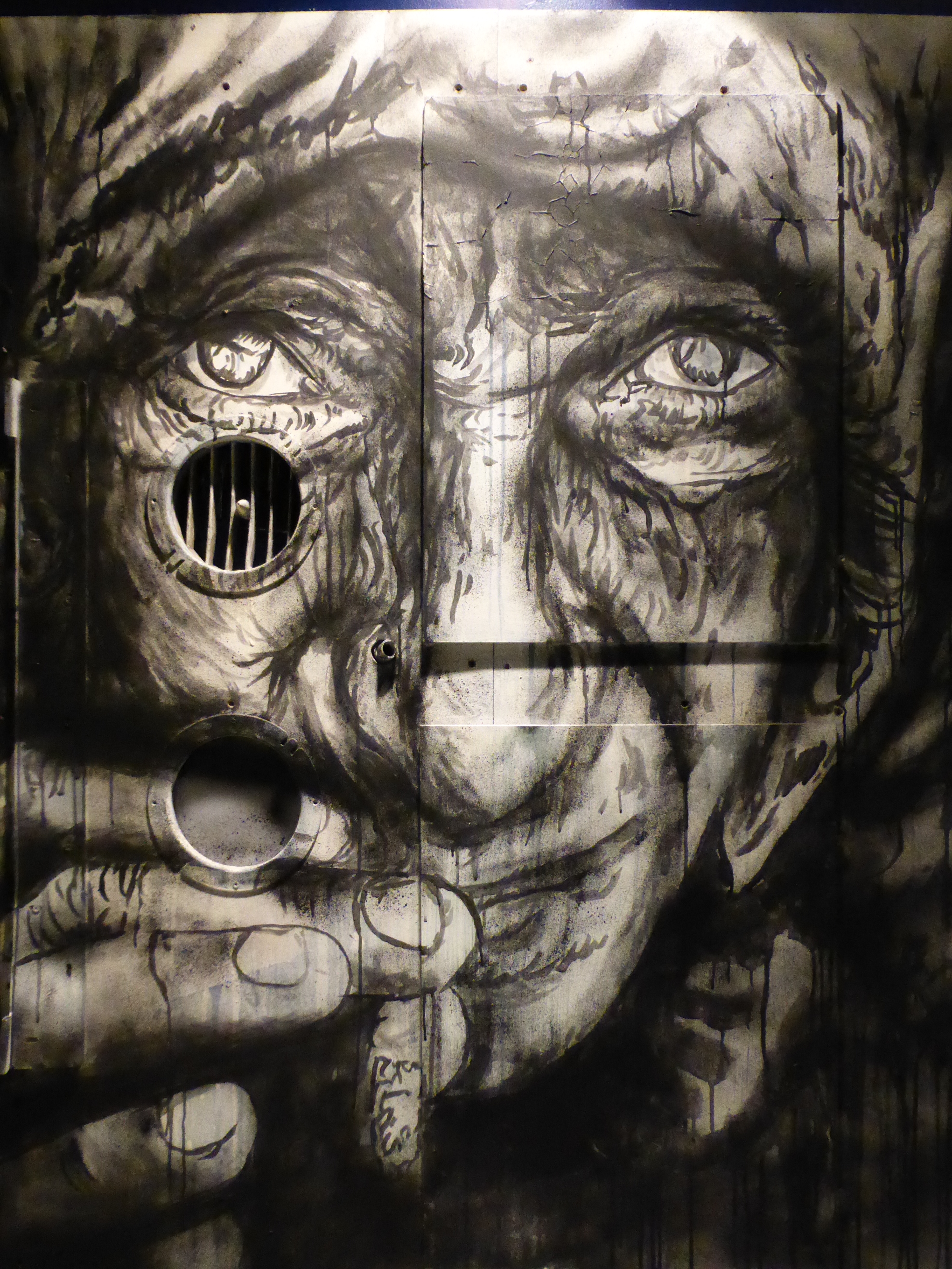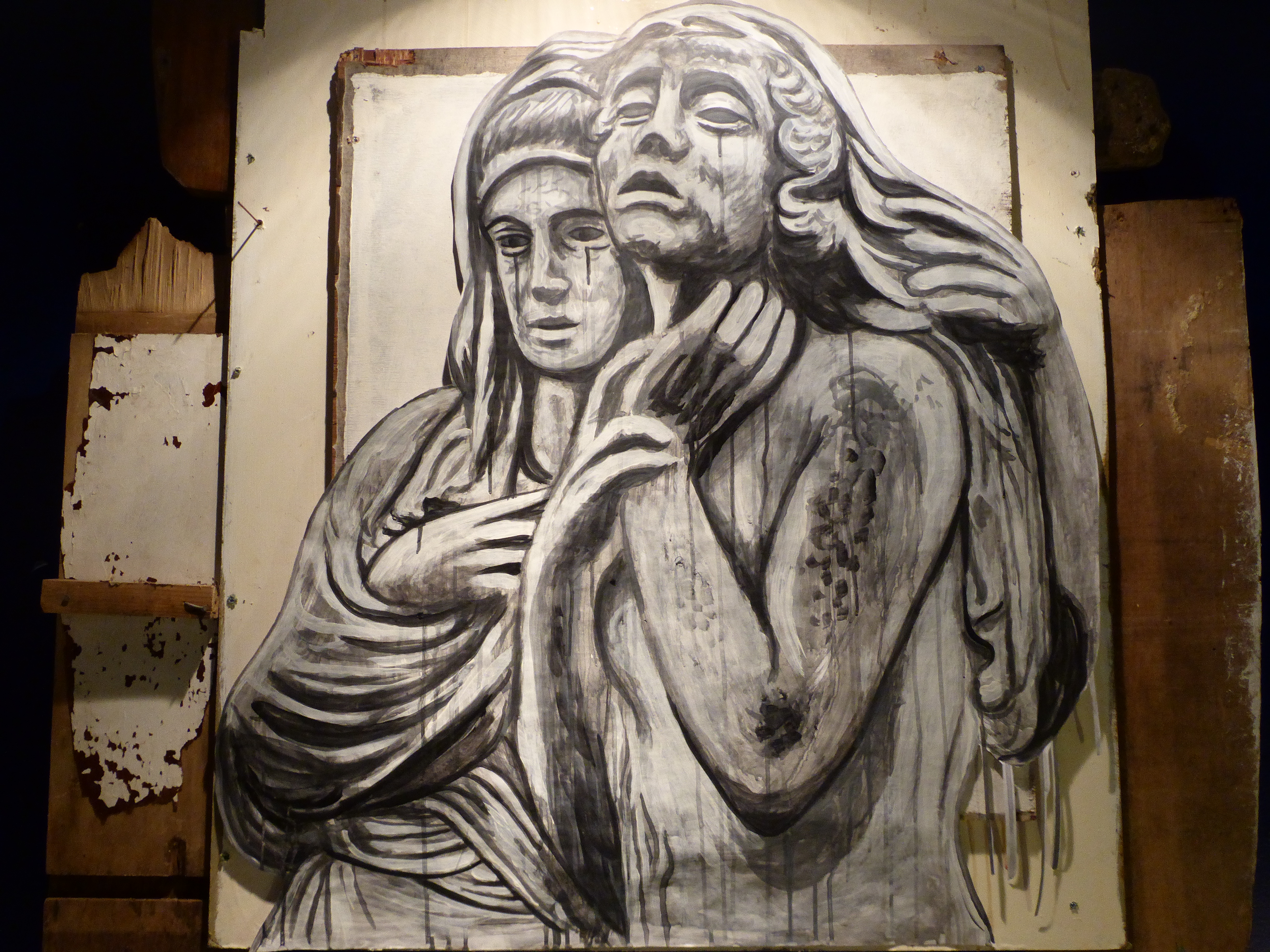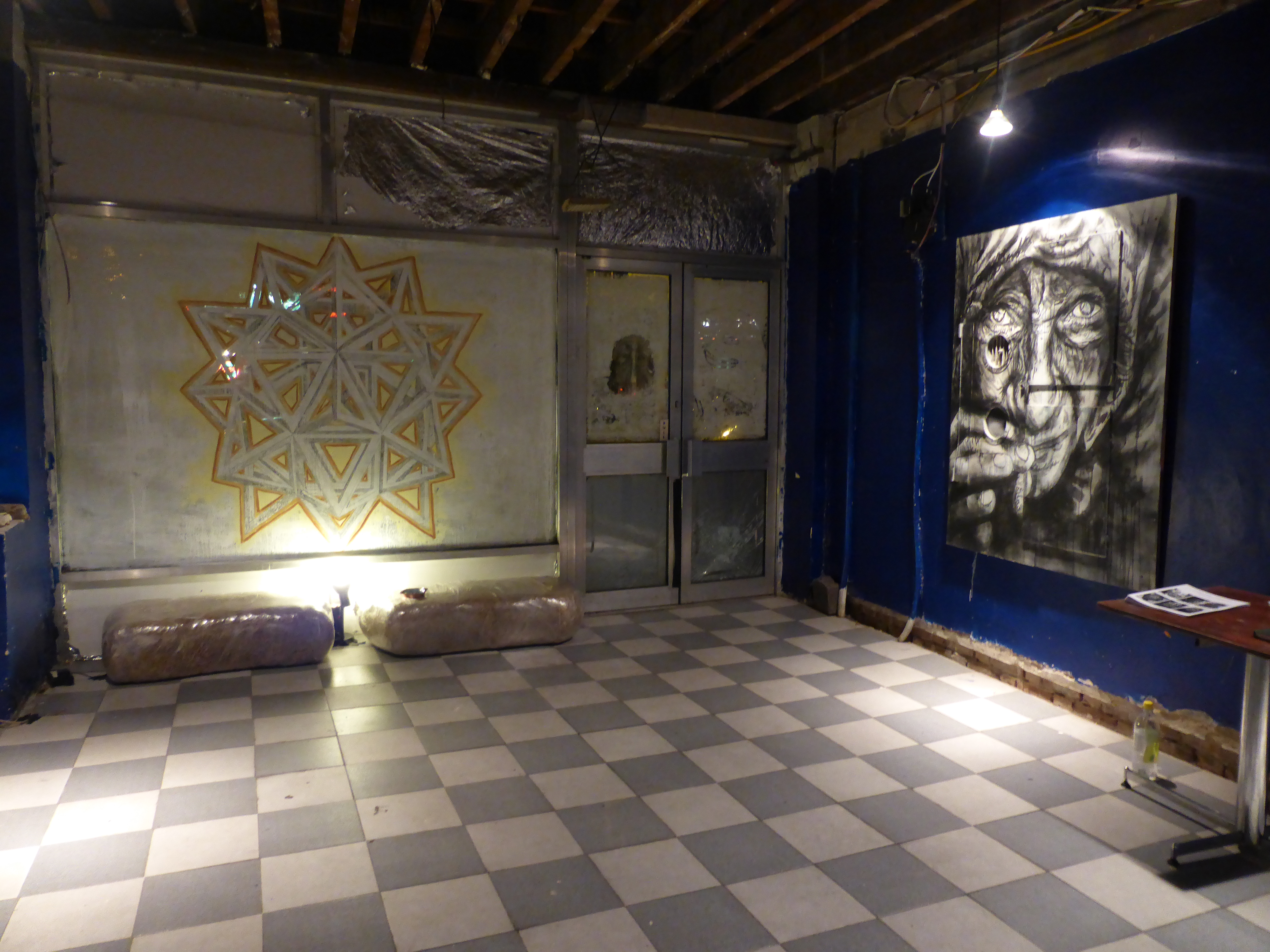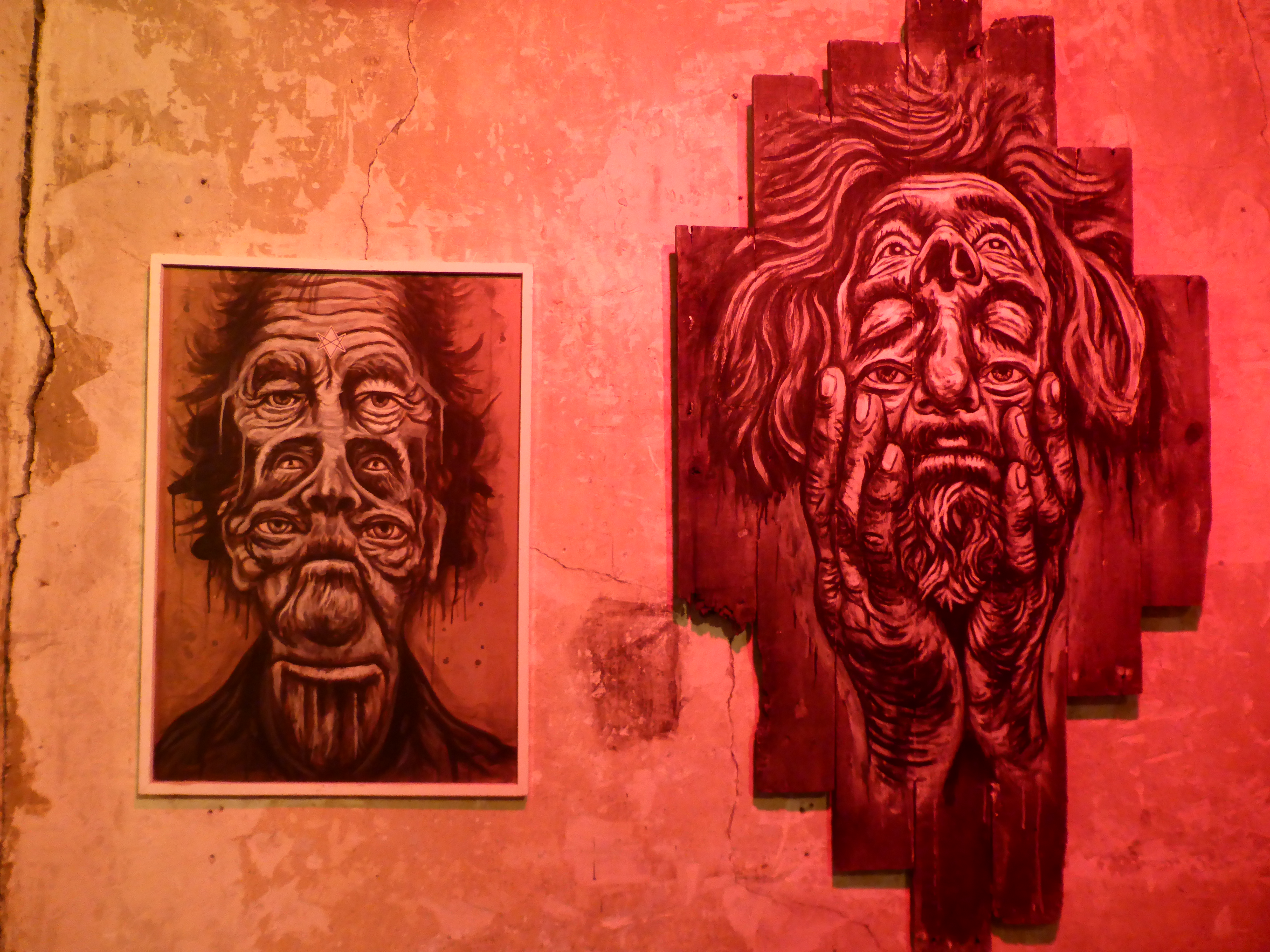 For the show Pyramid Oracle had created a series of paste-ups, his favoured style of art with the strong ties to a more elusive style of working, as well as some paintings on reclaimed wood and installations. The urban decay element of the setting really suited this artists work which tends to be in black and white, with occasional appearances of brown in the palette. Pyramid Oracle had created quite the sensory experience, having spent the previous two weeks before the show living on the premises, he used the time the decide where best to present his somewhat Gothic styled works, as well as setting to collect some wild sage and hang it about the place, along side the smell of incense and candles lighting the rooms, this very much made for an interesting experience.