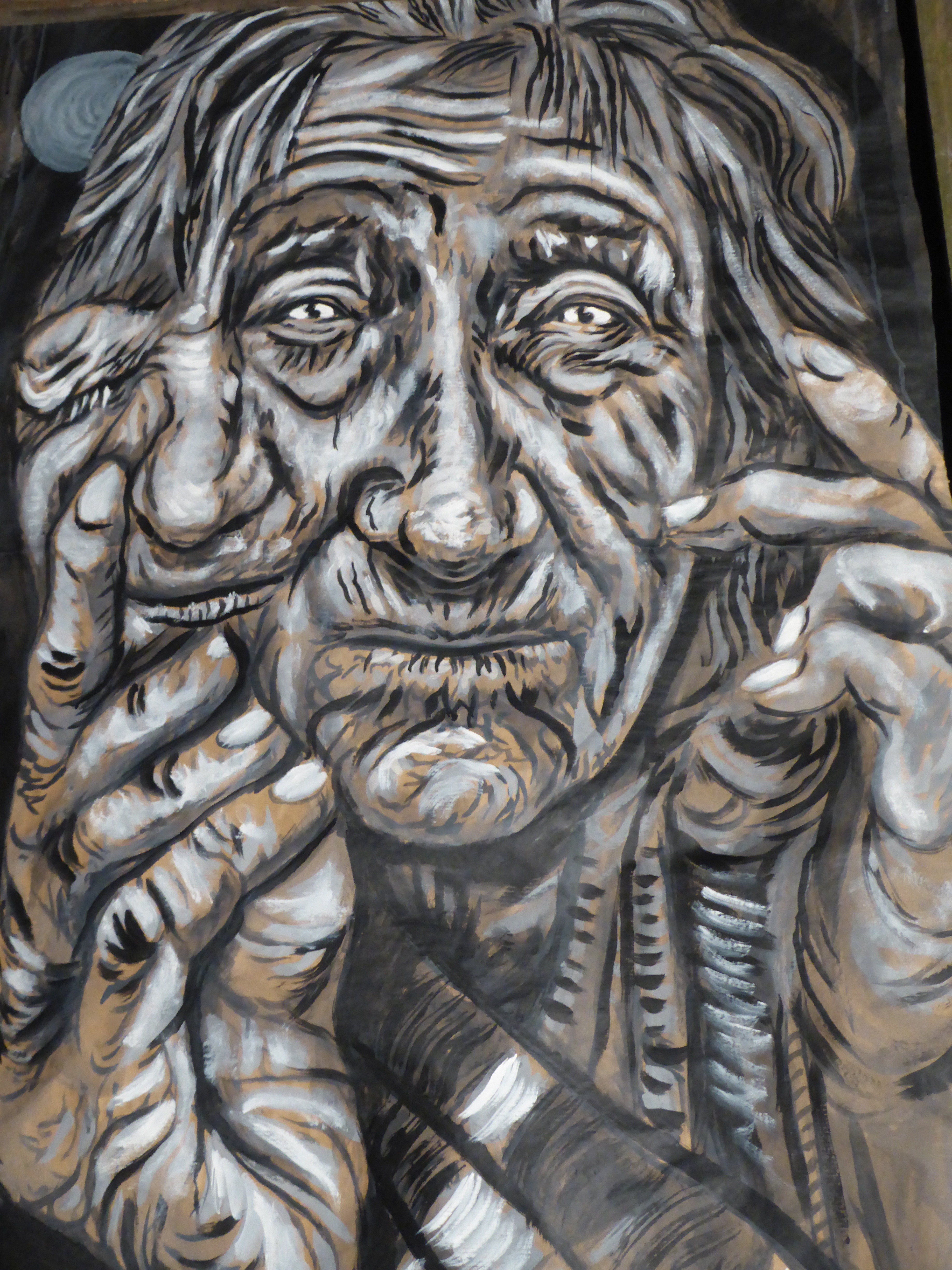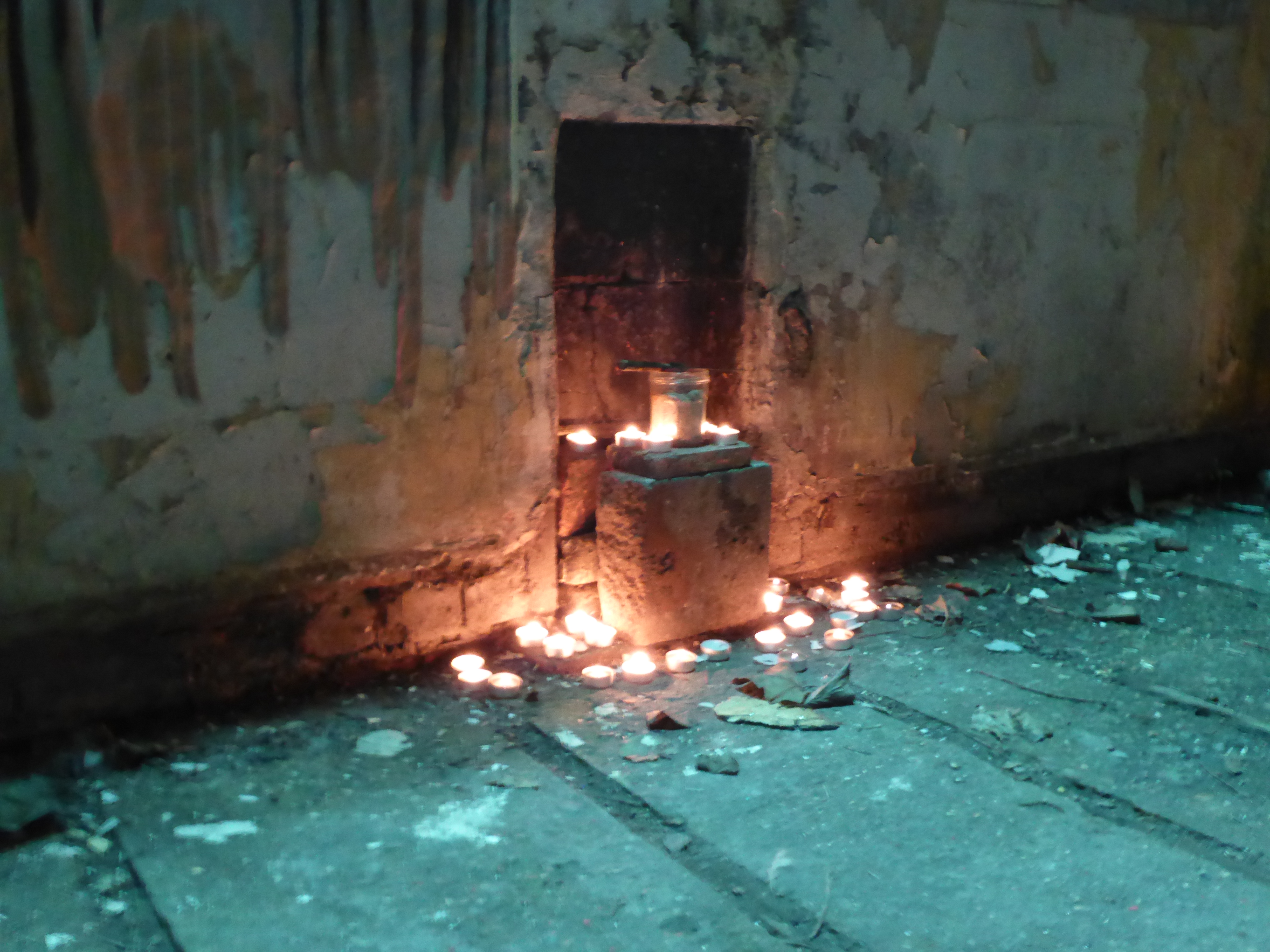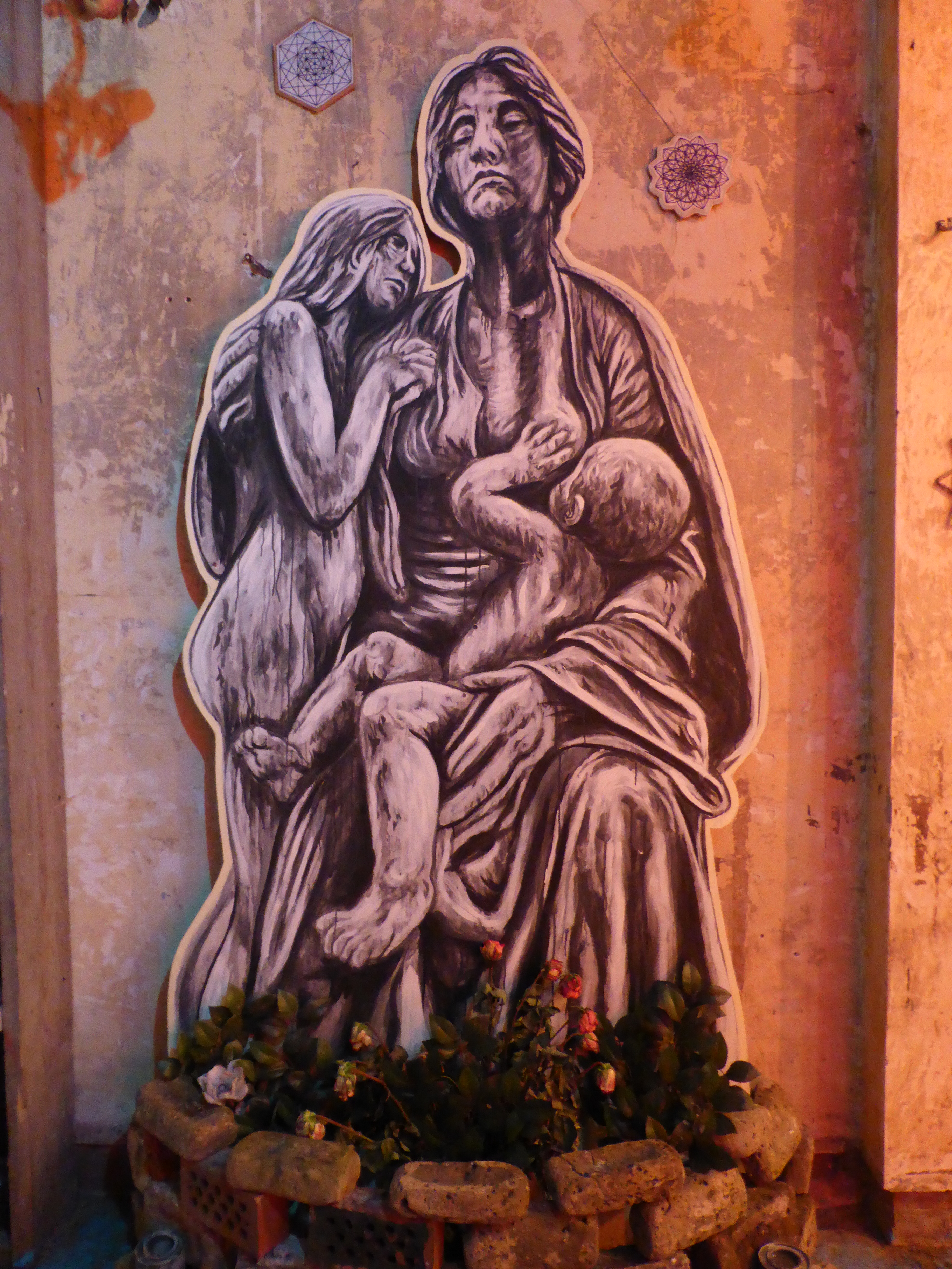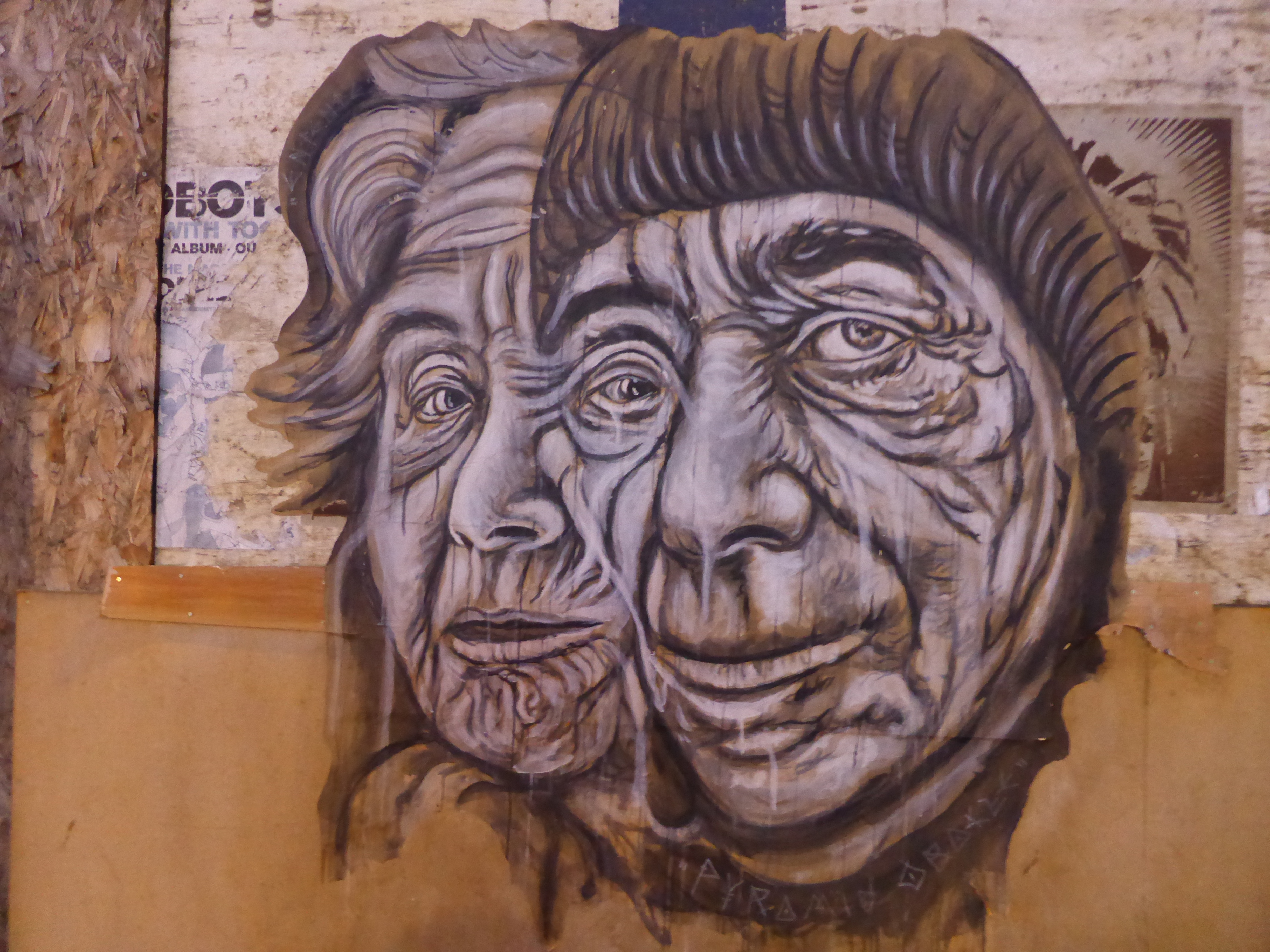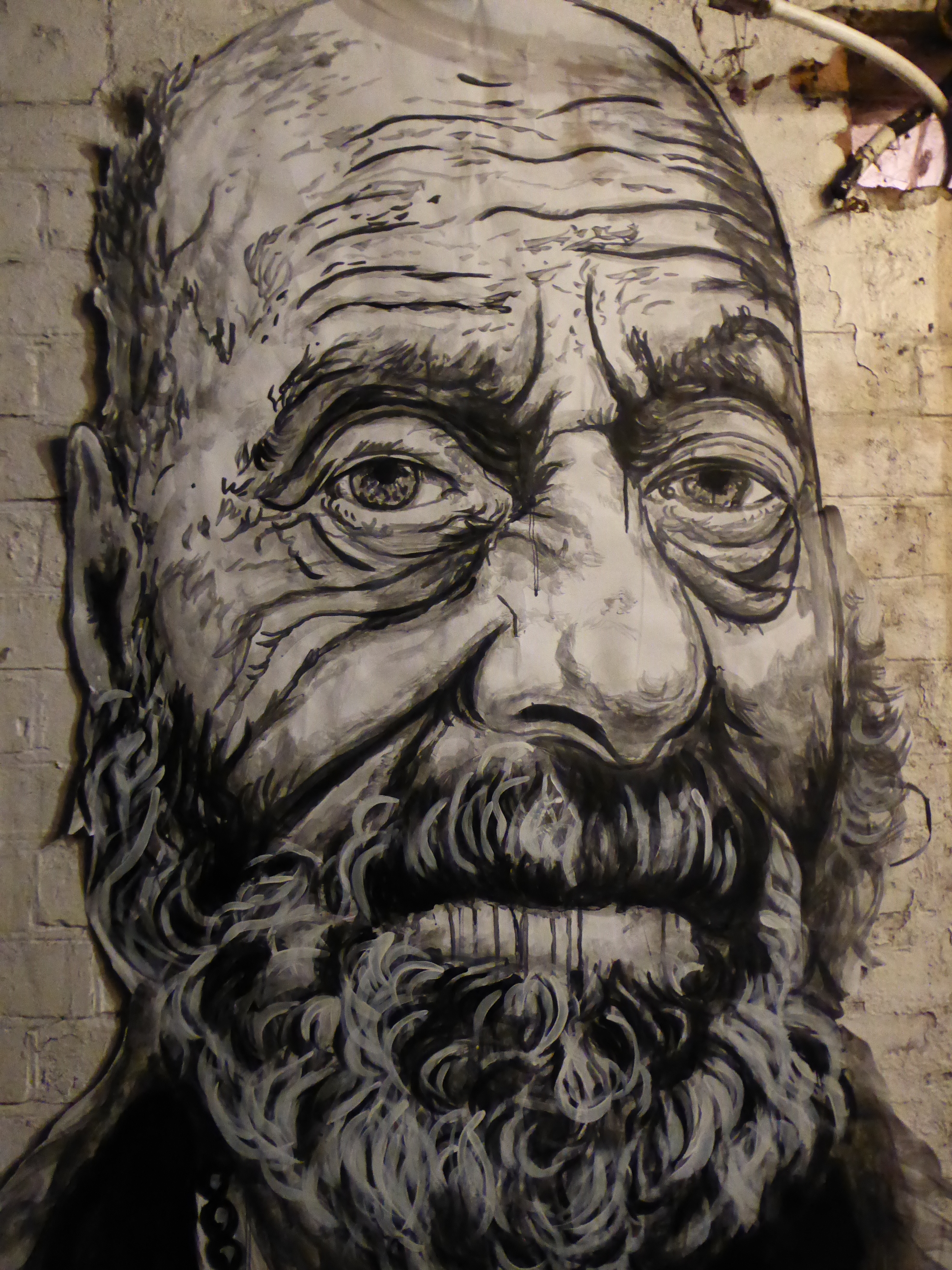 For the show Pyramid Oracle had created a series of paste-ups, his favoured style of art with the strong ties to a more elusive style of working, as well as some paintings on reclaimed wood and installations. The urban decay element of the setting really suited this artists work which tends to be in black and white, with occasional appearances of brown in the palette. Pyramid Oracle had created quite the sensory experience, having spent the previous two weeks before the show living on the premises, he used the time the decide where best to present his somewhat Gothic styled works, as well as setting to collect some wild sage and hang it about the place, along side the smell of incense and candles lighting the rooms, this very much made for an interesting experience.