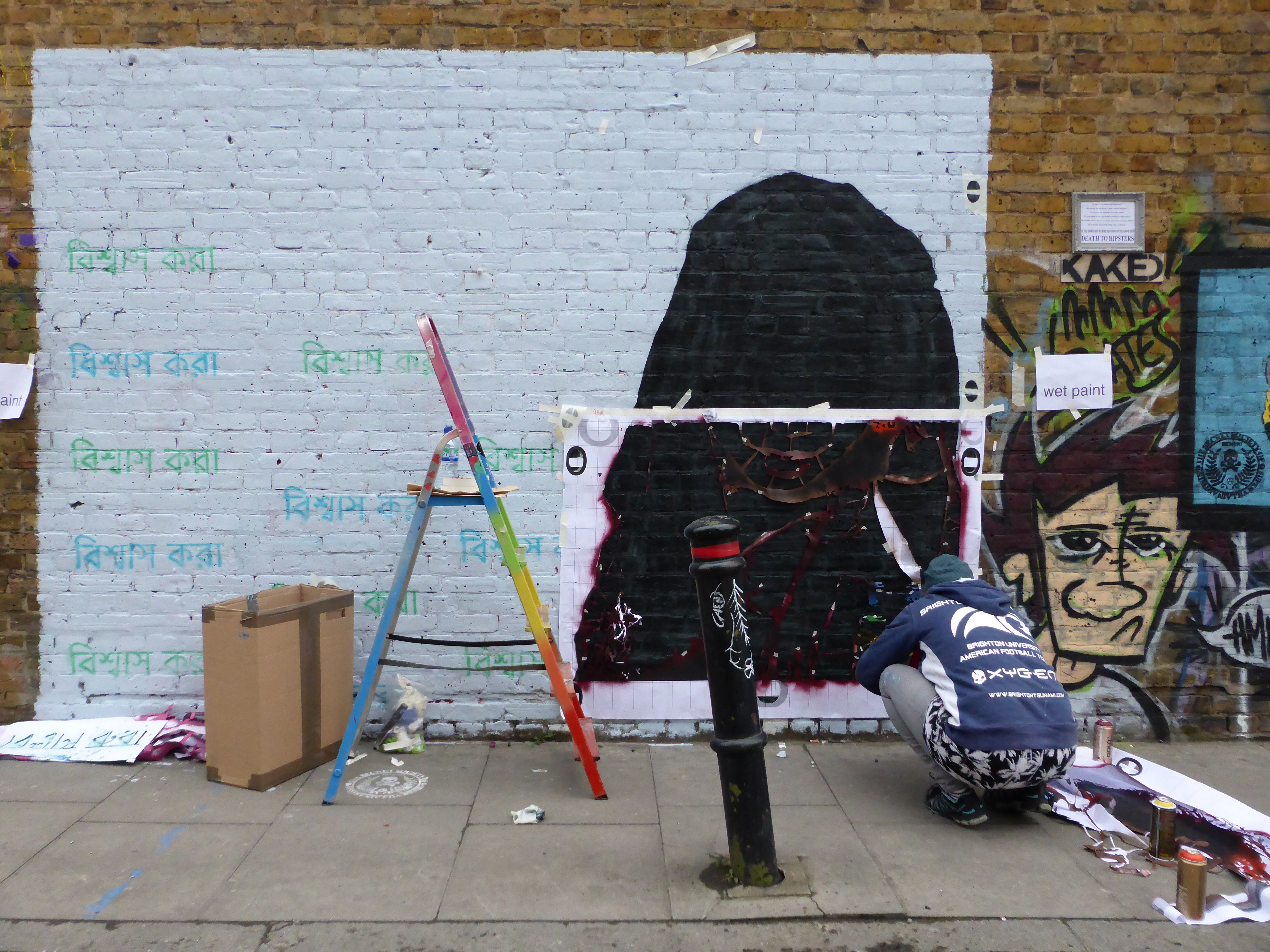 For Georgie the key concept behind the piece is the statement of “Believe”, which isn’t an instruction, but an idea, posed more as a position to consider, than just merely adopt. Change will only come through gradual shifts in cultural attitudes and practices, Georgie hopes this piece may help foster that view, even if only with 1 person takes something from it, George will consider it a victory, and so would we here at London Calling. The final aspect of the work integral to Georgie’s idea is not just a sense of ‘Believing’ in the girl, but the ‘girl’ in question needs to believe in herself also. Great work to @bricklane1 for organizing and a great and touching work from Georgie, in a superb and relevant location. Thanks so much for the heads up Georgie, so that we could come along and witness the work in progress and gain some very valuable insight from yourself about the striking piece, a real pleasure to see and report on.