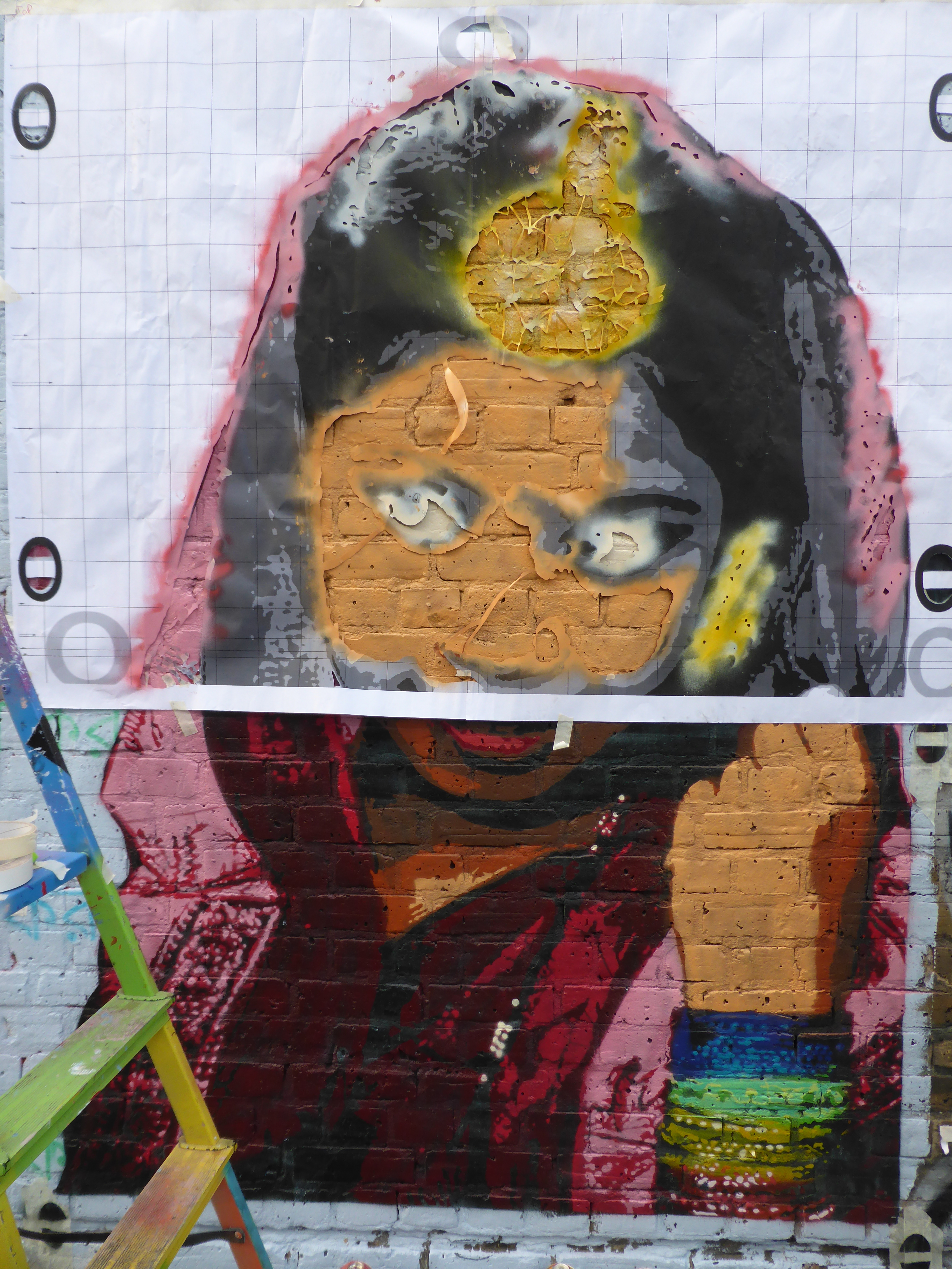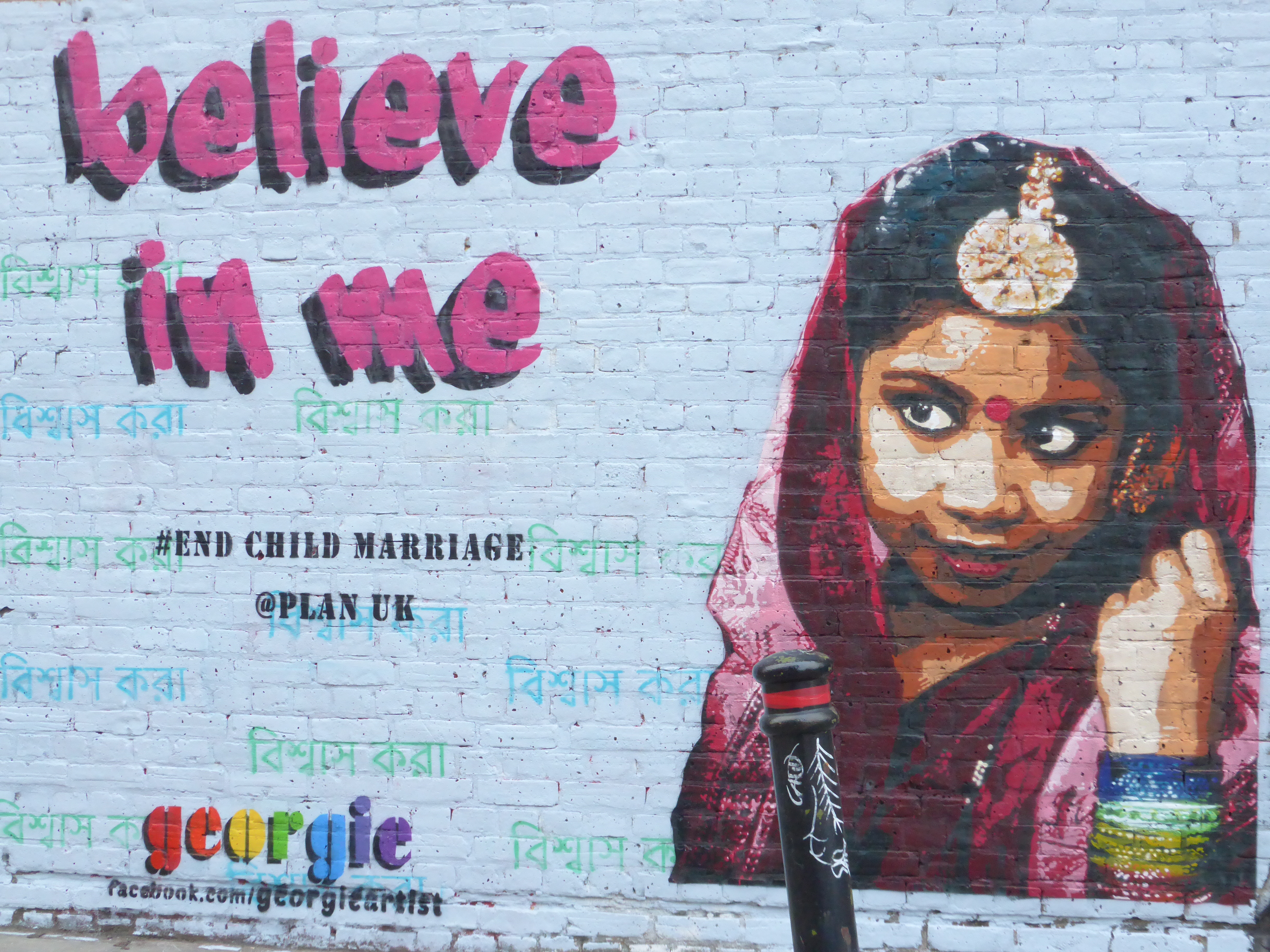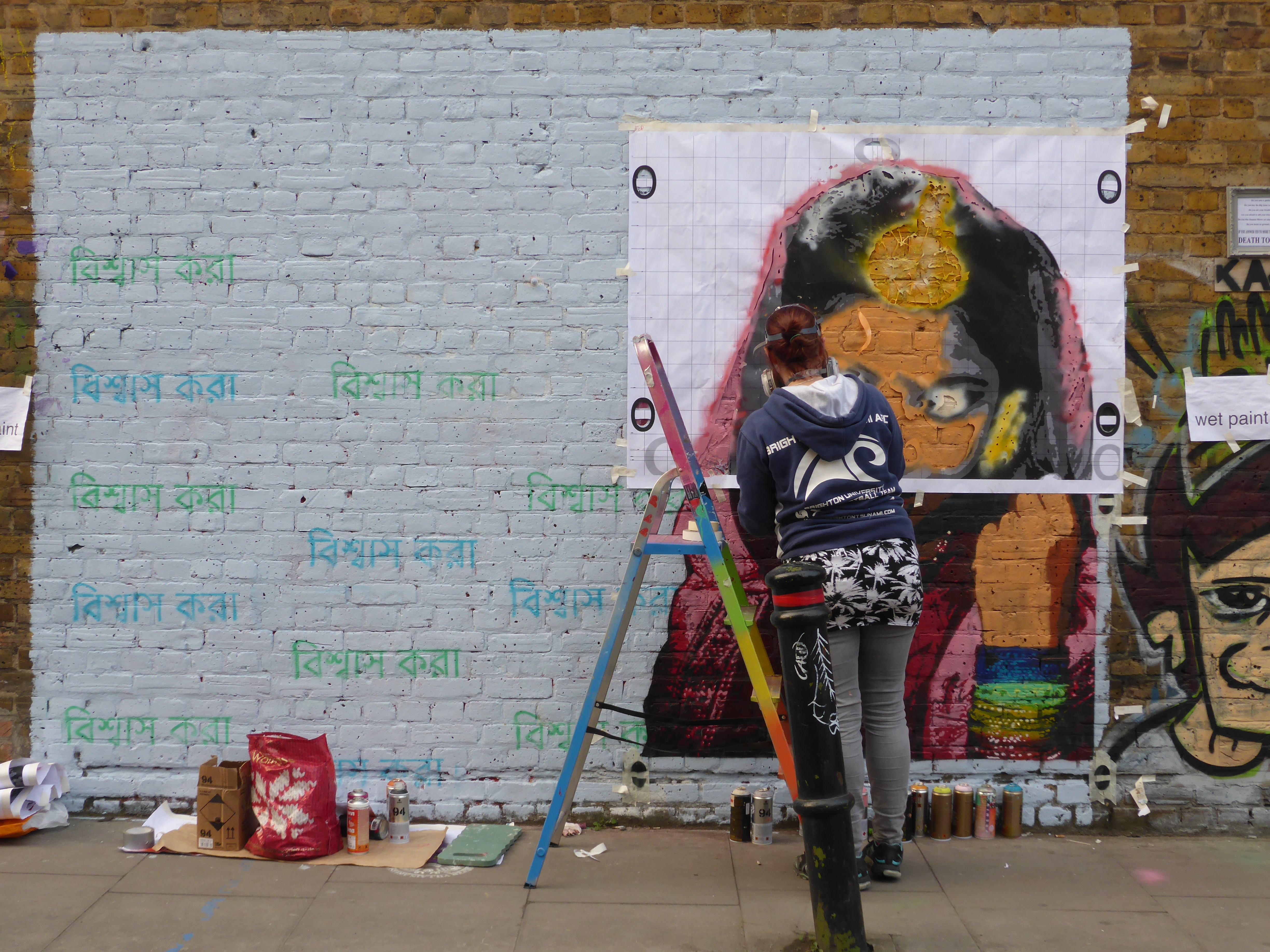 Over the course of Tuesday and Wednesday, Bristol artist Georgie came back down to London to repaint, in a more ‘permanent’ manor, her fabulous and touching piece “Believe In Me”, which she had created the previous week for Femme Fierce Reloaded. For Femme Fierce Georgie had created her piece with a strong disposition towards one of the fundamental aims of Plan UK’s charity campaign “Because I Am A Girl” which sets to highlight among other issues, that of Child Marriage. At Femme Fierce Reloaded Georgie laid out this piece in honour of the aim of the charity and certainly put out one of the more ‘message’ based pieces relating to the cause of the event. A female member of the Bangladeshi community from the Brick Lane area (on Instagram as @bricklane1) saw this piece at Femme Fierce and then arranged for Georgie to come back to London to recreate this piece in the heart of the Bangladeshi community in the East End. Thankfully this did indeed happen and Georgie’s piece will last longer than the many fabulous works recently created at Leake Street for the charity. Georgie’s piece isn’t over complicated in its symbology and message, but not too over bearing in its statement either. Consisting of a five layer stencil process, again set to the same blue backdrop as was present at Femme Fierce Reloaded – the colour of the Plan UK campaign, with additional messages in Bangali stating “Believe”, in the backdrop. The stencil of the young Bangladeshi girl is striking and really grabs you as you go past.