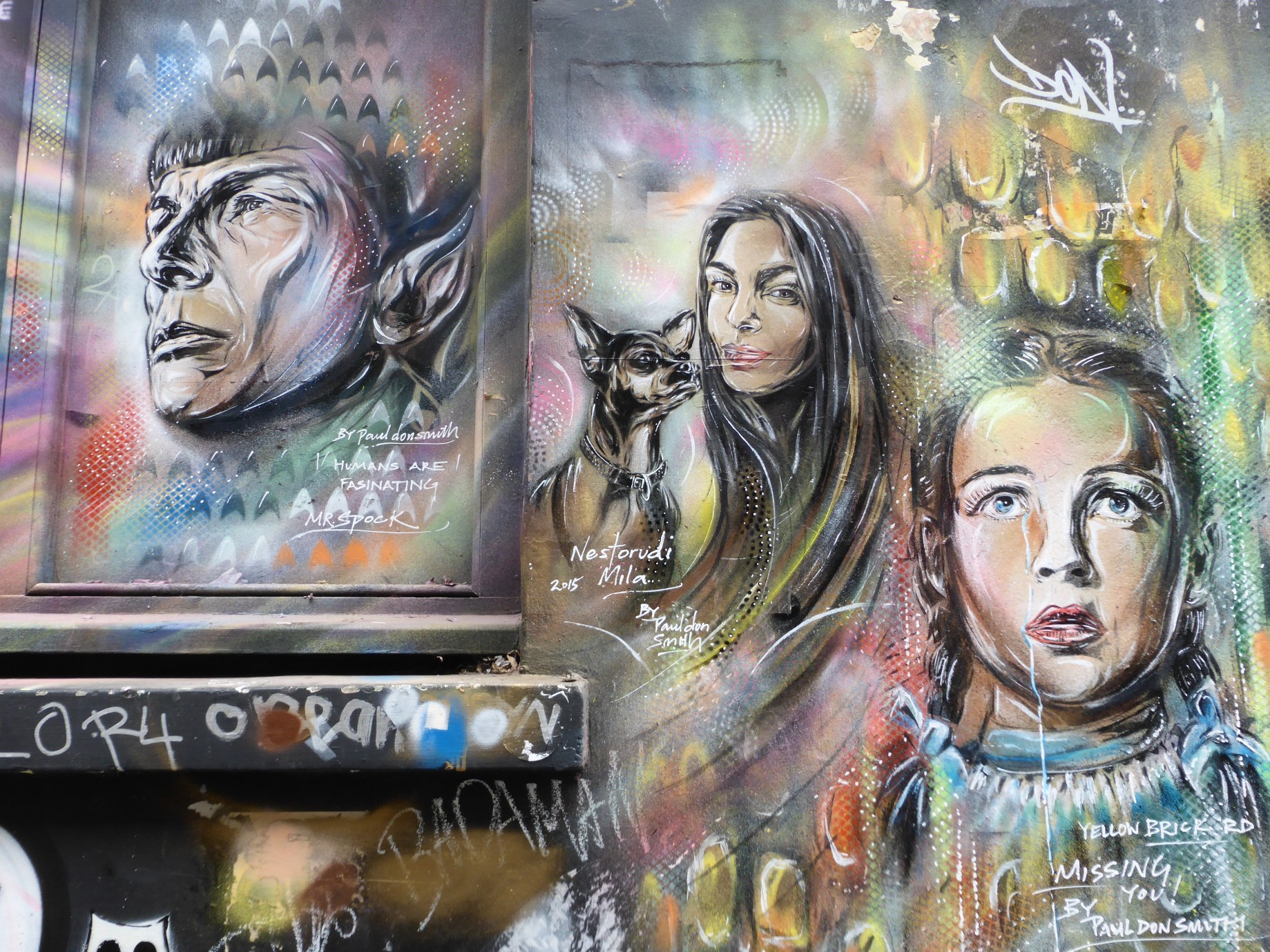 Prolific stencil street artist Paul ‘Don’ Smith has been at it again recently, especially on one wall in Buxton Street off of Brick Lane, where he has thus far laid out five pieces, making for a lovely set of colour and portraiture. We’ve already seen half a dozen or so of his works in the last month or two, we don’t doubt there will be many more delights to stumble across over the coming months either. Great work from Paul ‘Don’ Smith, ‘Yellow Brick Rd’ is our favourite of these recent creations.