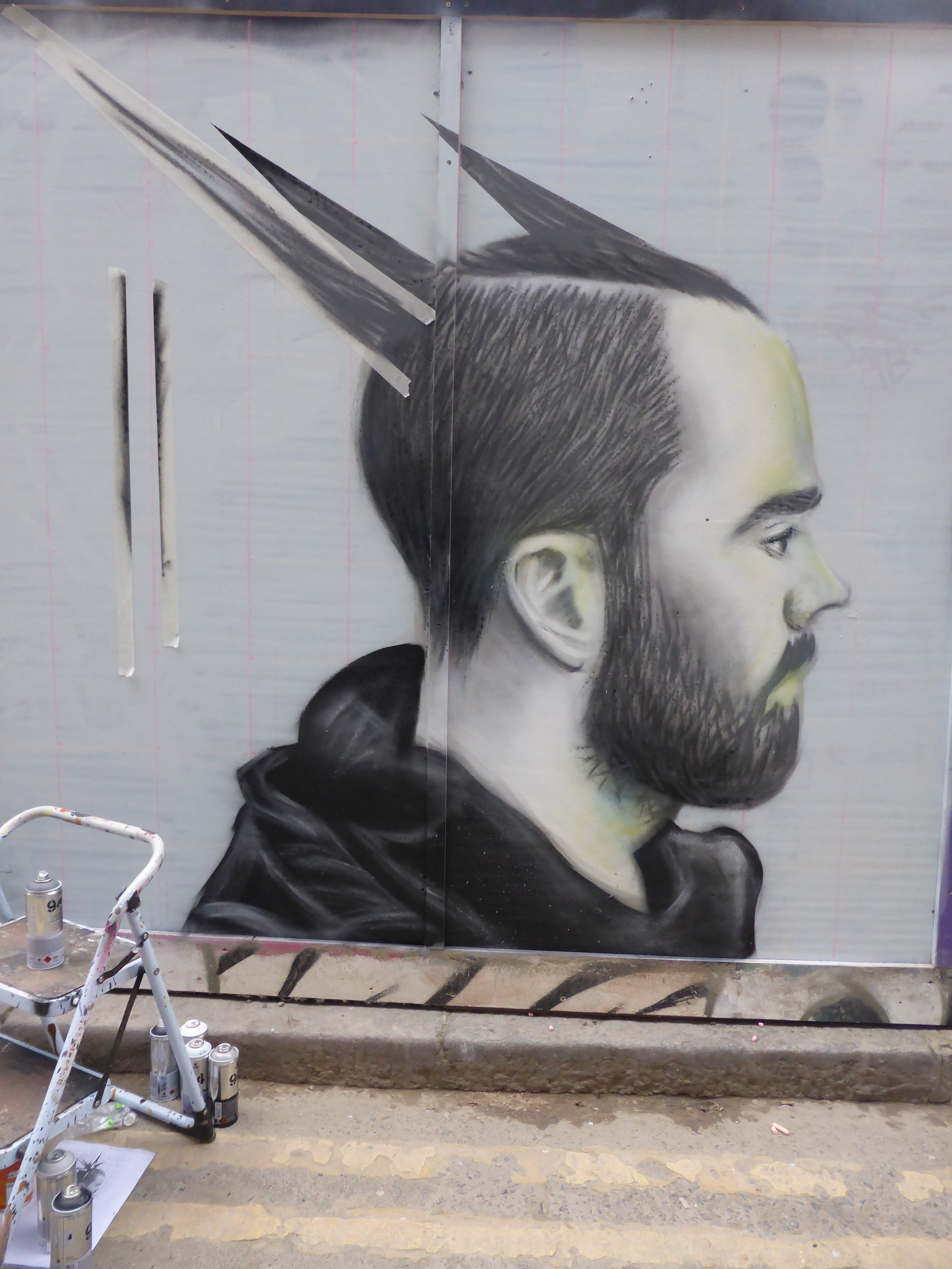 On Friday afternoon I was fortunate enough to stumble across street artist Emic who was over from Northern Ireland for his friend’s wedding. So Emic came along a day early, got set up in Blackall Street and decided to paint a portrait of the groom, also his former partner in street art, what a wedding present. It was a pleasure to catch Emic working and to see the finished piece later on in the day. Great work Emic, come back to London to paint soon.
