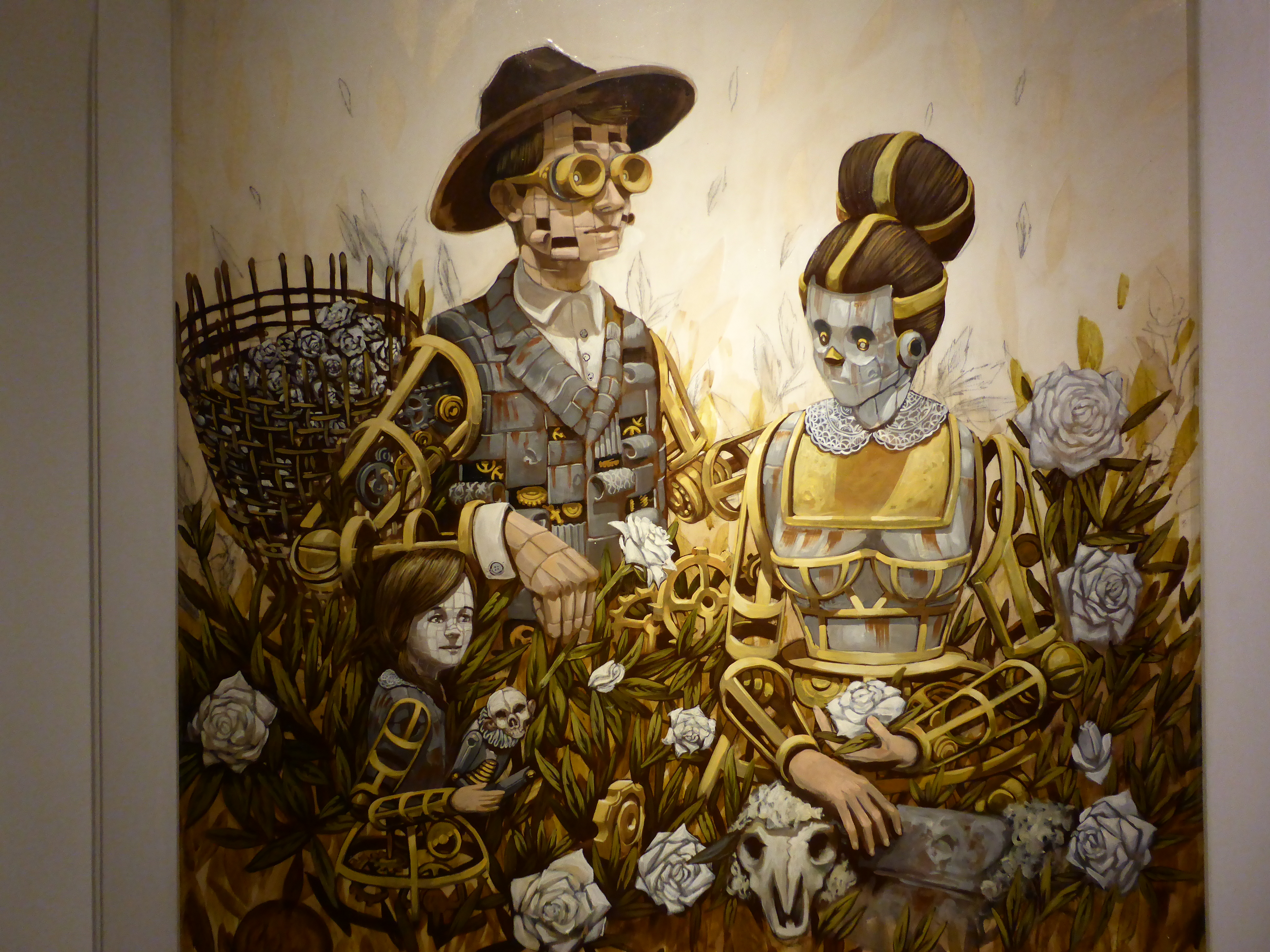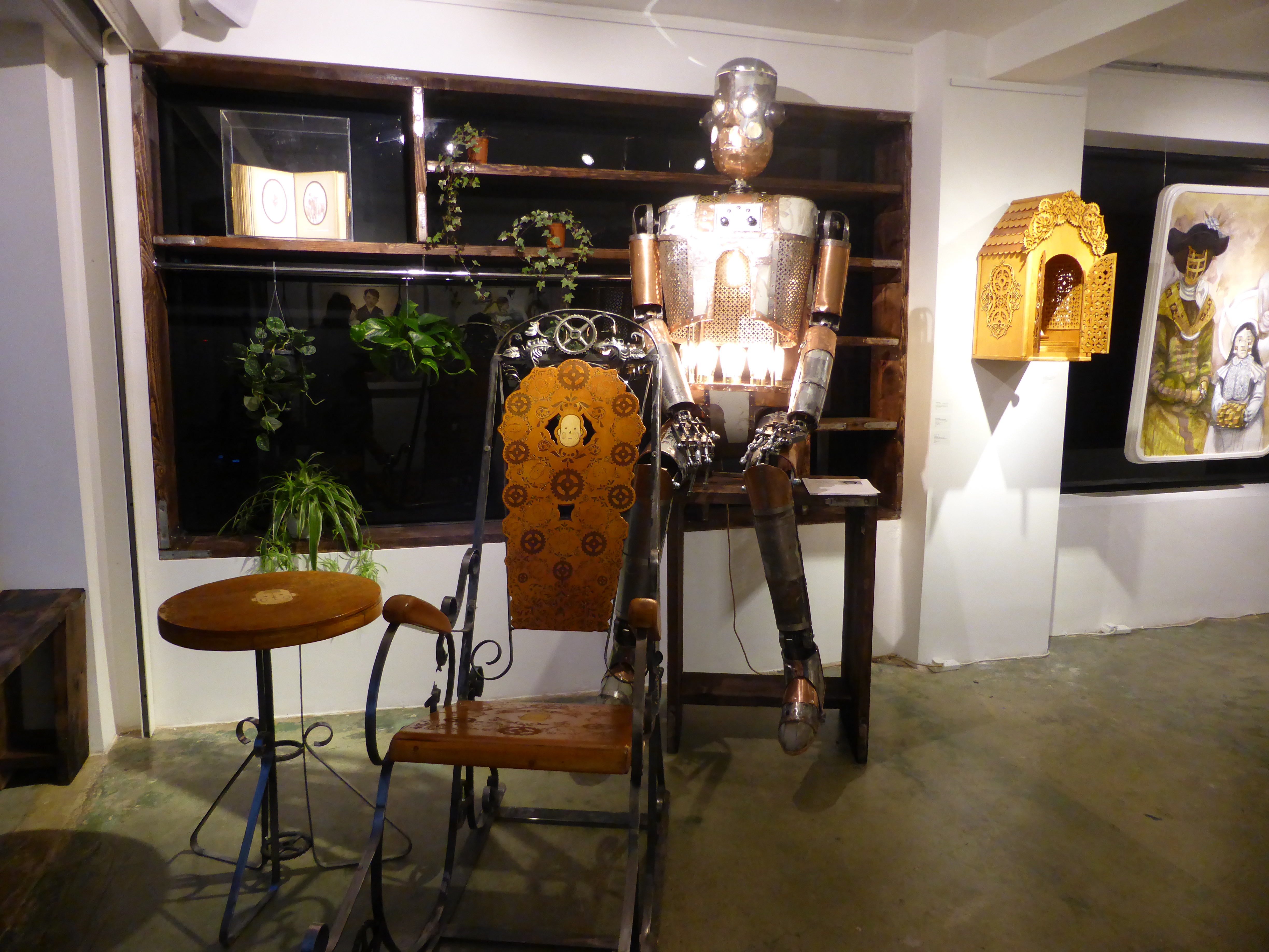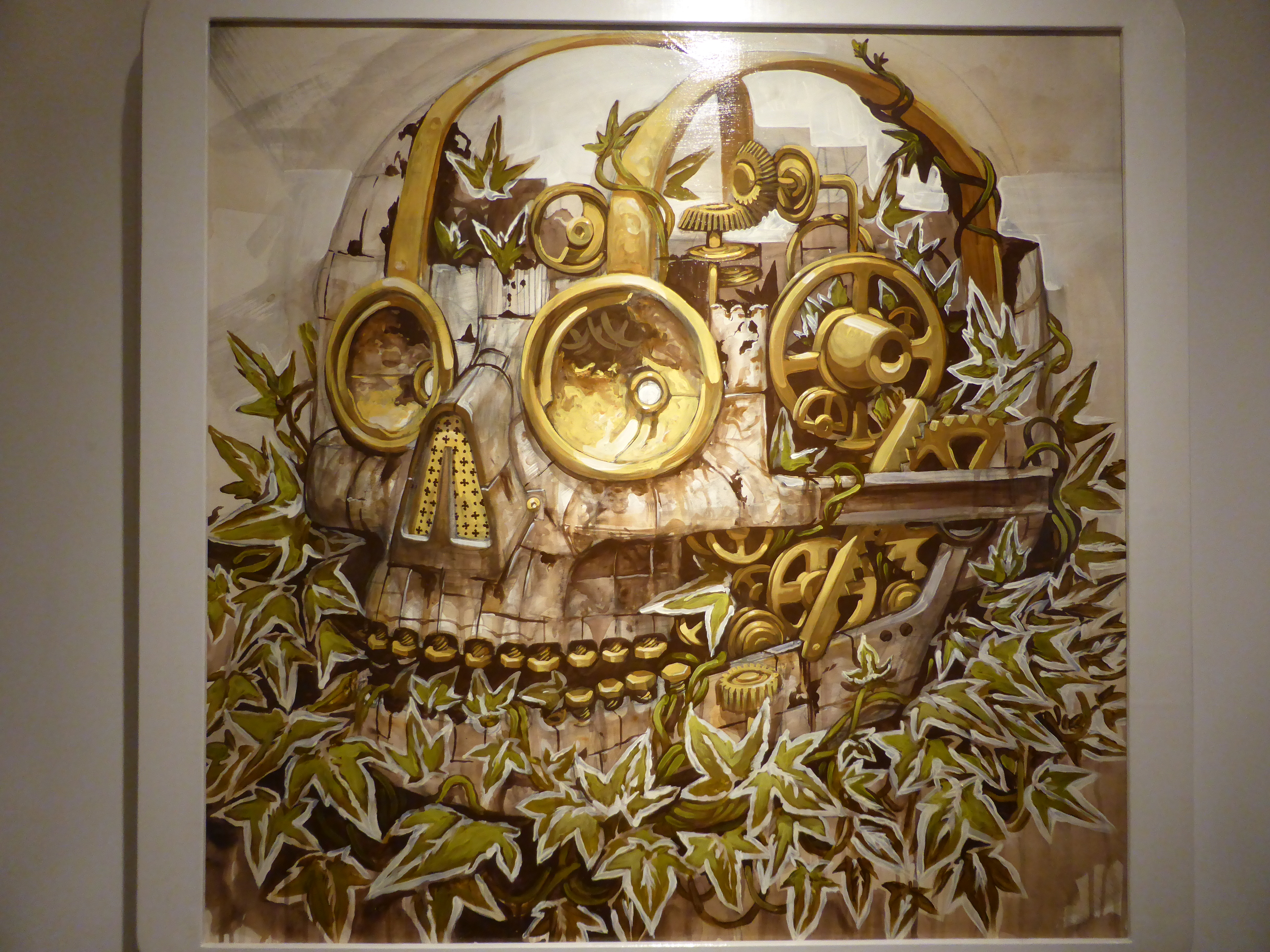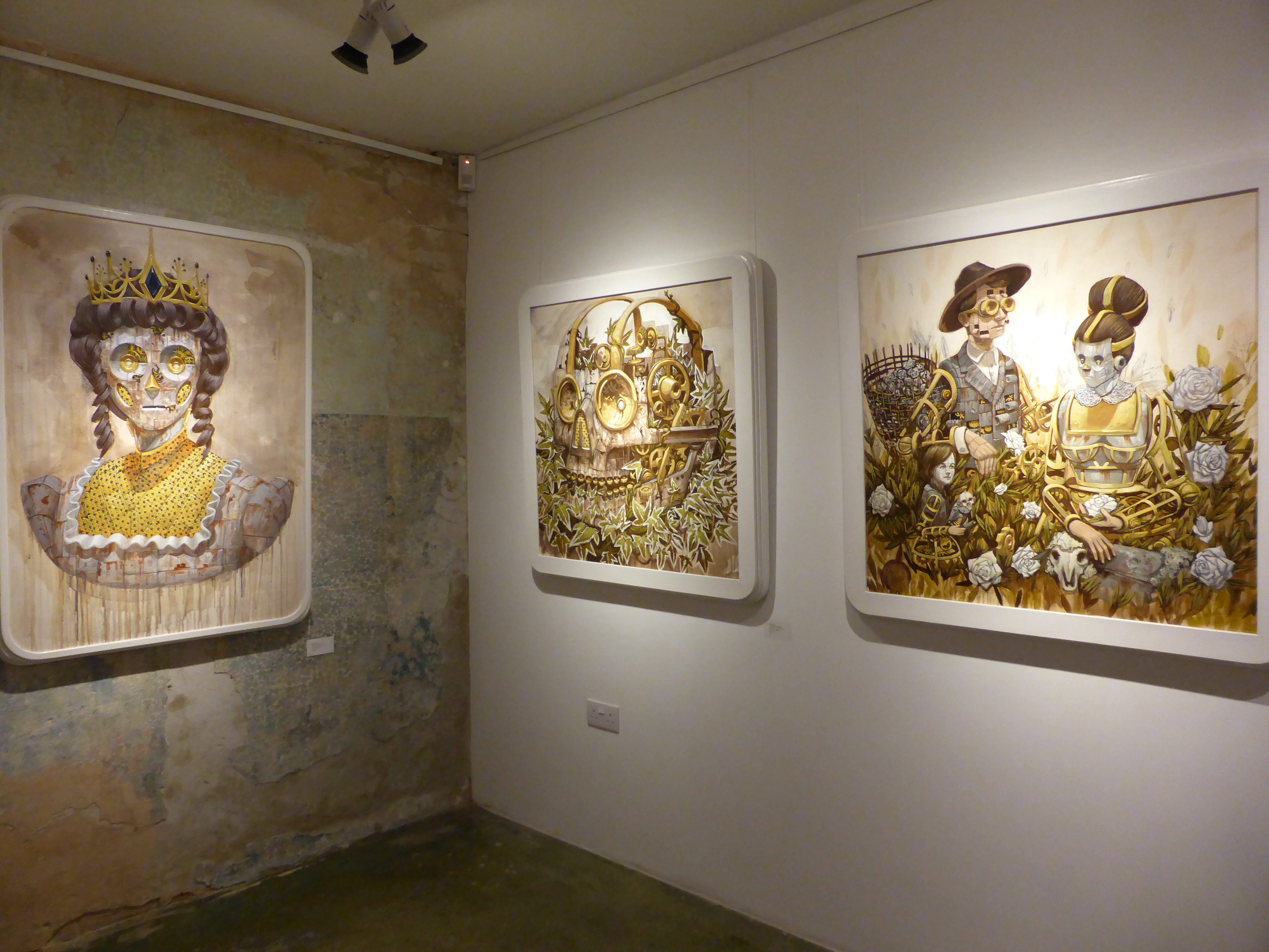 His work depicts androids or cyborgs comprised of metal screws, gears and rotors, reminiscent in part to something from the sci-fi genre. Coupled with rusty exteriors Pancho’s robots are set to reflect extensions of the human bodies and the manifestation of man in trying to be gods by creating such ‘creatures’ in the first place. This exhibition features a series of paintings as well as several installation pieces, including his larger than life hand made robot Michelone’, and his beautiful Musical Carrilion, which we were lucky enough to see in action. The show is entitled ‘Memory Of Our Life’ and is focused upon the circle of life and the varying stages of our life in which we grow up, learn and make mistakes, set to be paralleled through the portrayal of his whimsical and intricate characters.