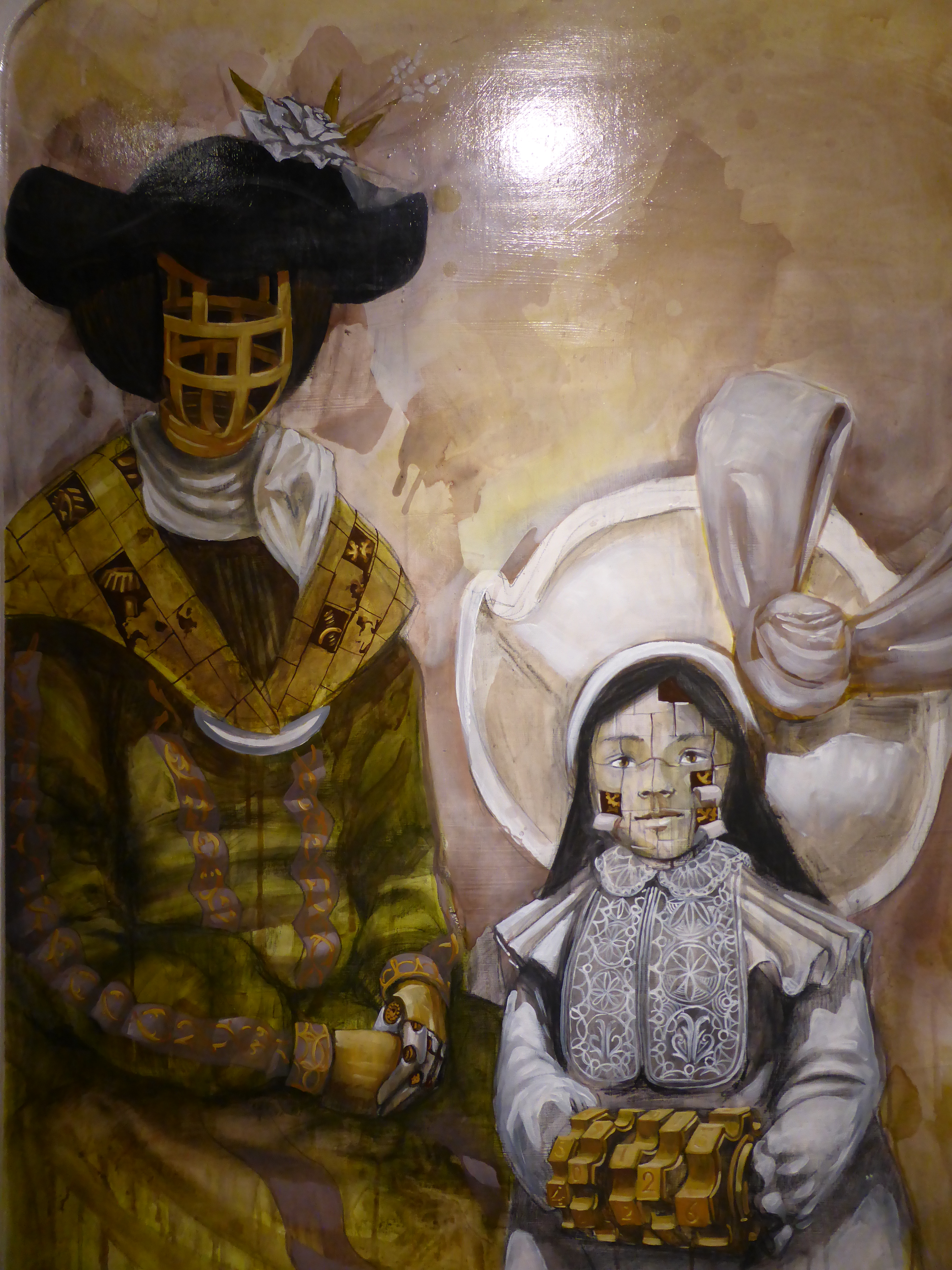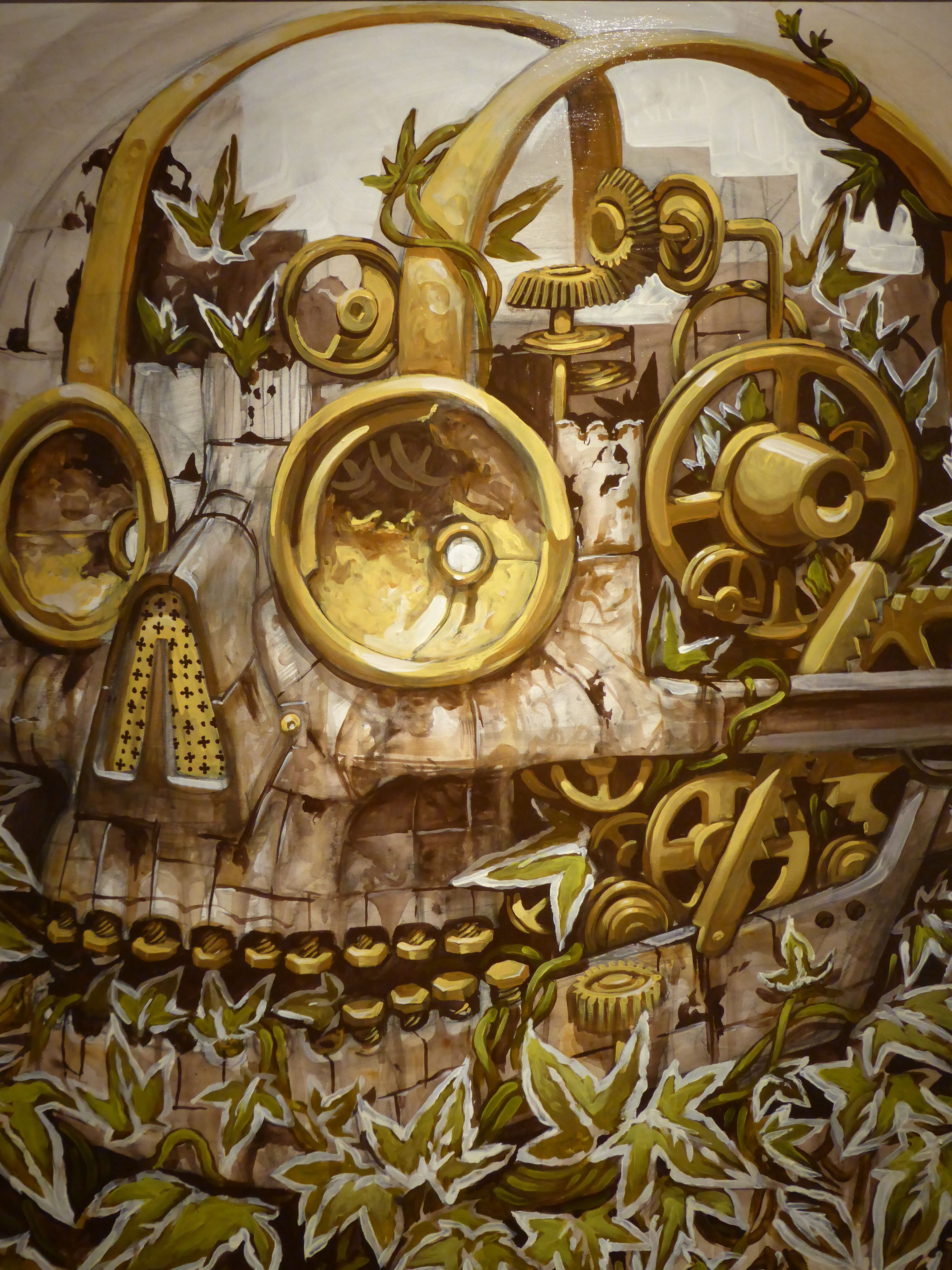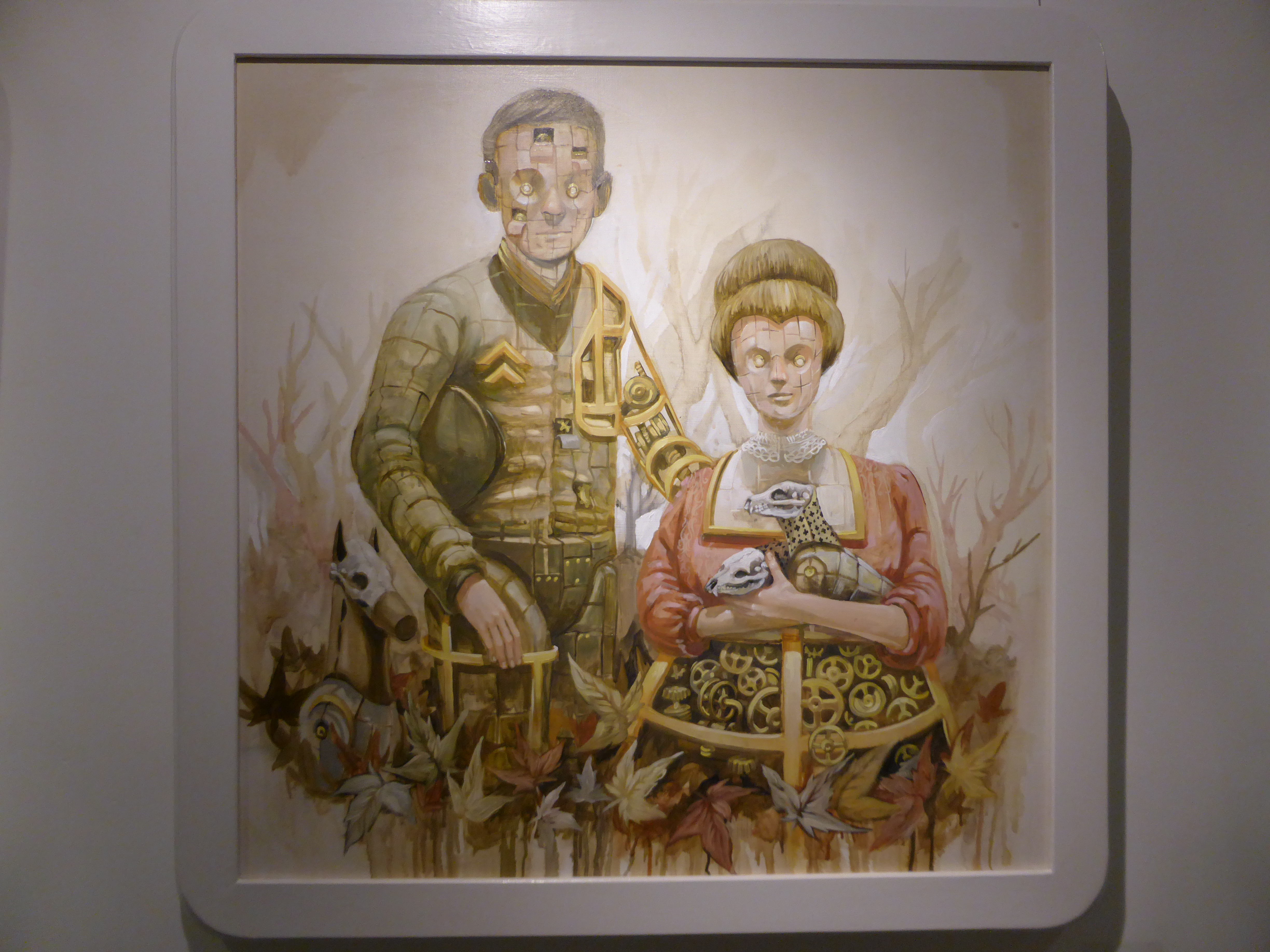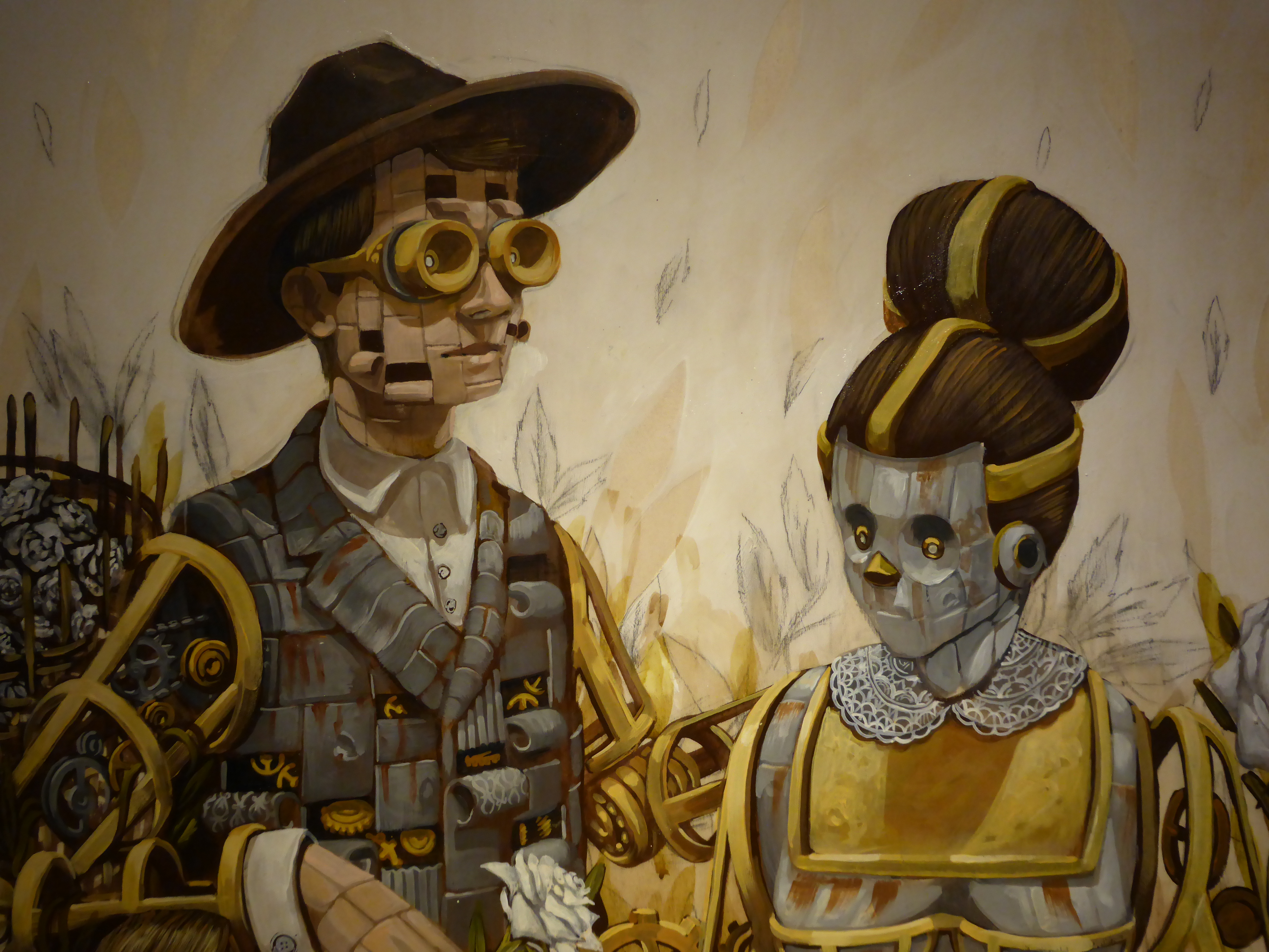 His work depicts androids or cyborgs comprised of metal screws, gears and rotors, reminiscent in part to something from the sci-fi genre. Coupled with rusty exteriors Pancho’s robots are set to reflect extensions of the human bodies and the manifestation of man in trying to be gods by creating such ‘creatures’ in the first place. This exhibition features a series of paintings as well as several installation pieces, including his larger than life hand made robot Michelone’, and his beautiful Musical Carrilion, which we were lucky enough to see in action. The show is entitled ‘Memory Of Our Life’ and is focused upon the circle of life and the varying stages of our life in which we grow up, learn and make mistakes, set to be paralleled through the portrayal of his whimsical and intricate characters.