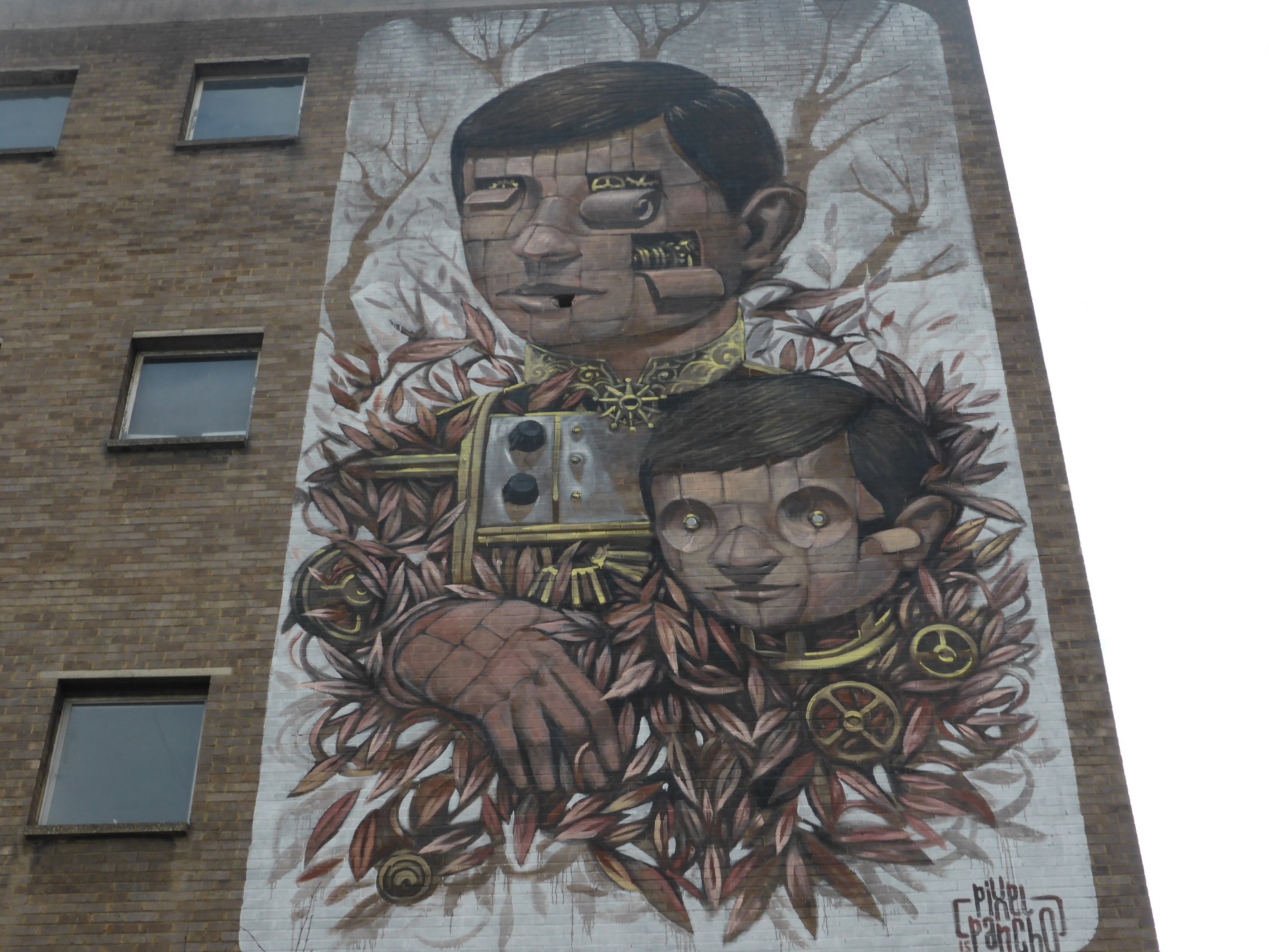 What we liked most about this piece on Hanbury Street was that you can clearly see both artists influence and work in the piece, and that they haven’t just painted one character each, the two individual characters bare the input of each respective artist. This piece is entitled ‘Reflections’ and was designed to depict a reflection upon the struggles we endure in order to survive, the two roosters are being forced to fight, in order to live on.