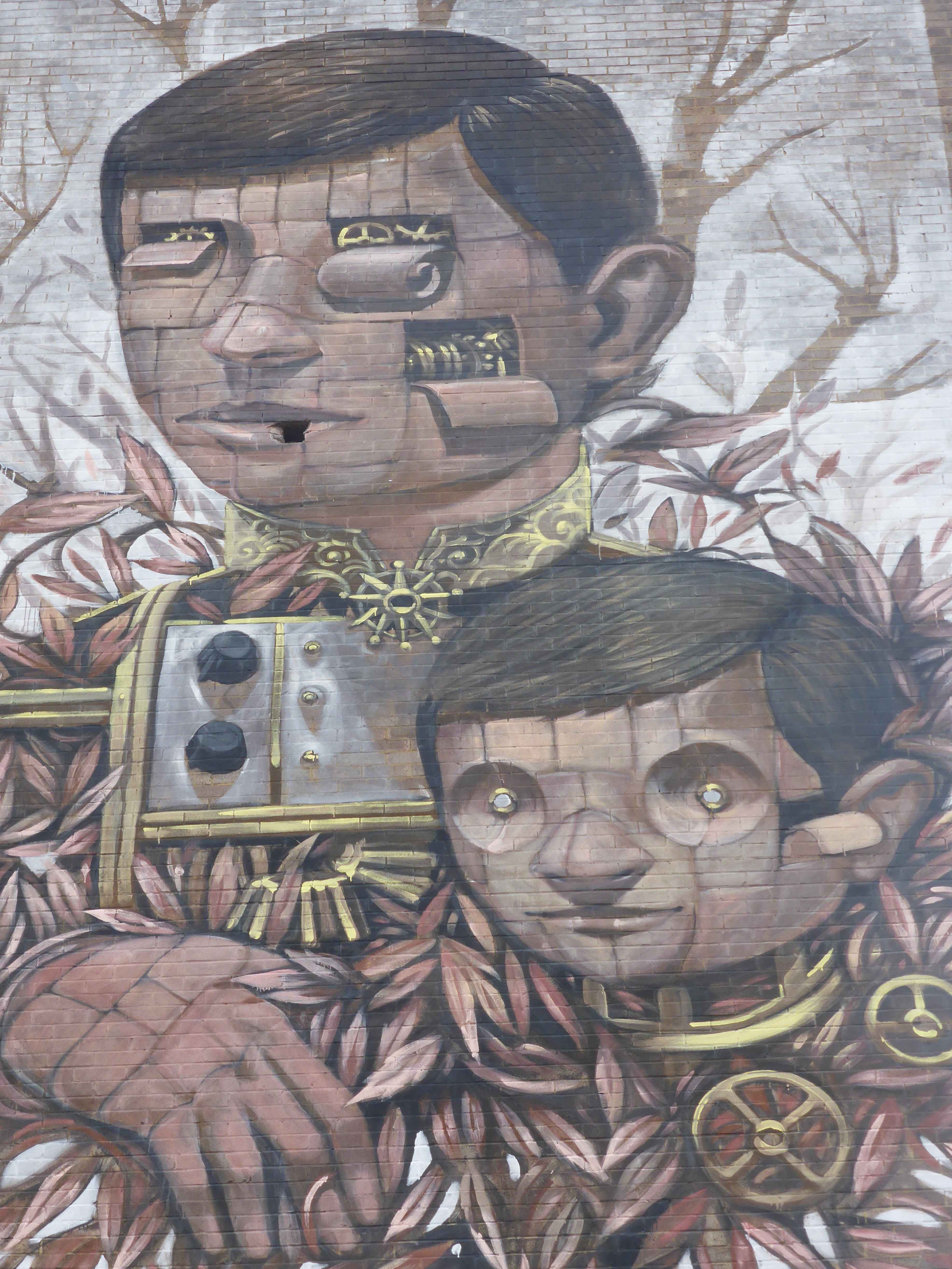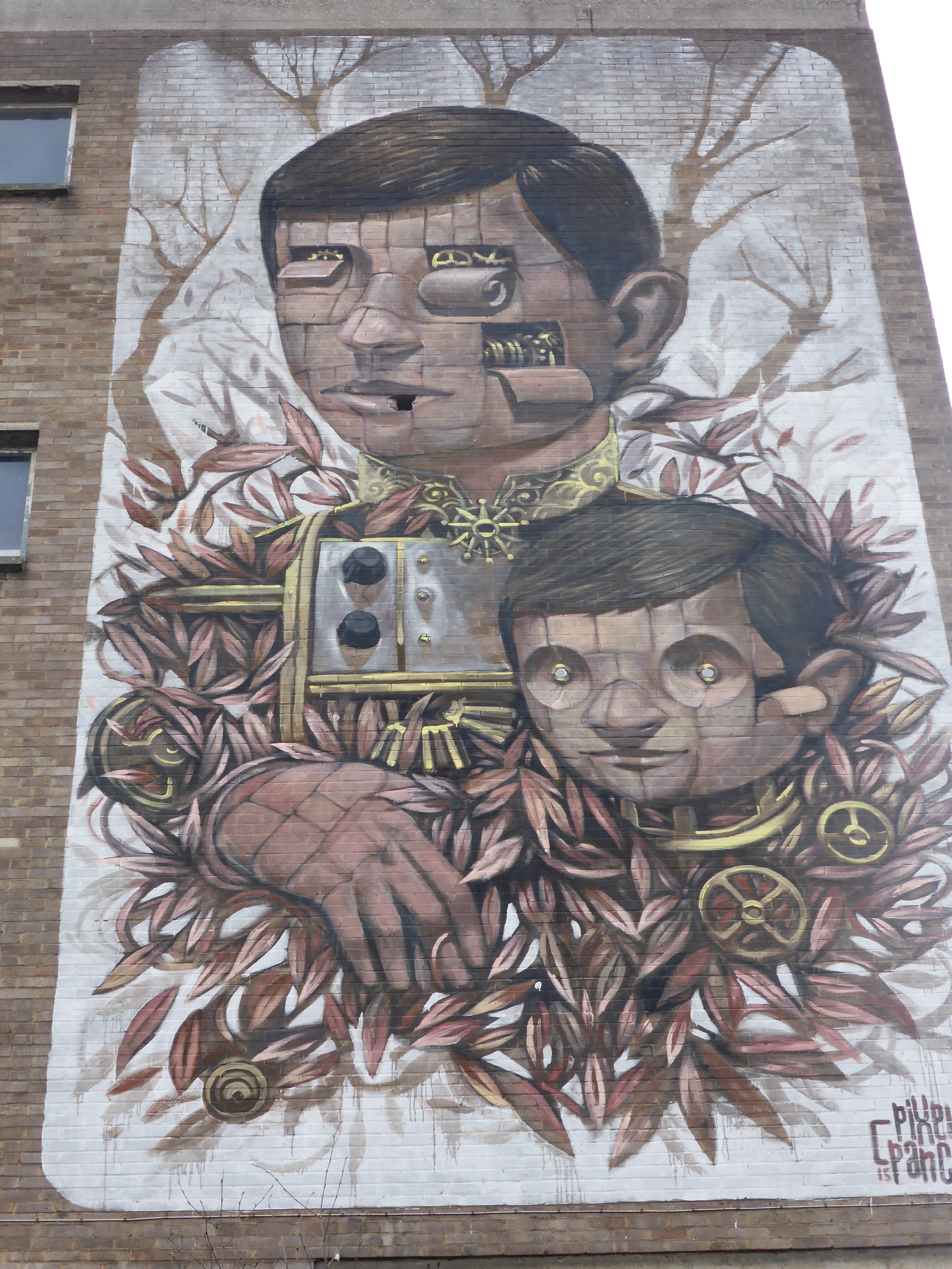 What we liked most about this piece on Hanbury Street was that you can clearly see both artists influence and work in the piece, and that they haven’t just painted one character each, the two individual characters bare the input of each respective artist. This piece is entitled ‘Reflections’ and was designed to depict a reflection upon the struggles we endure in order to survive, the two roosters are being forced to fight, in order to live on.