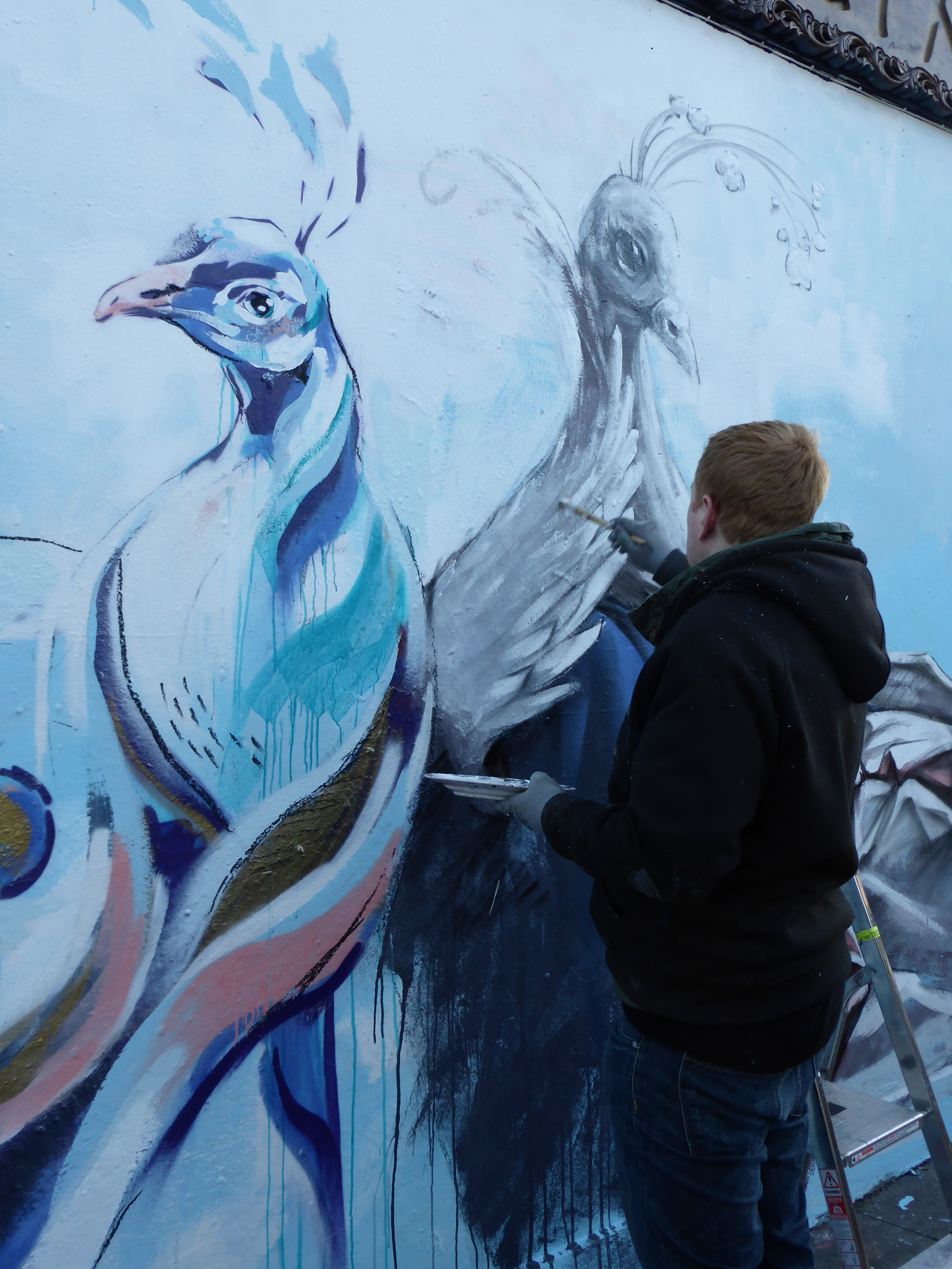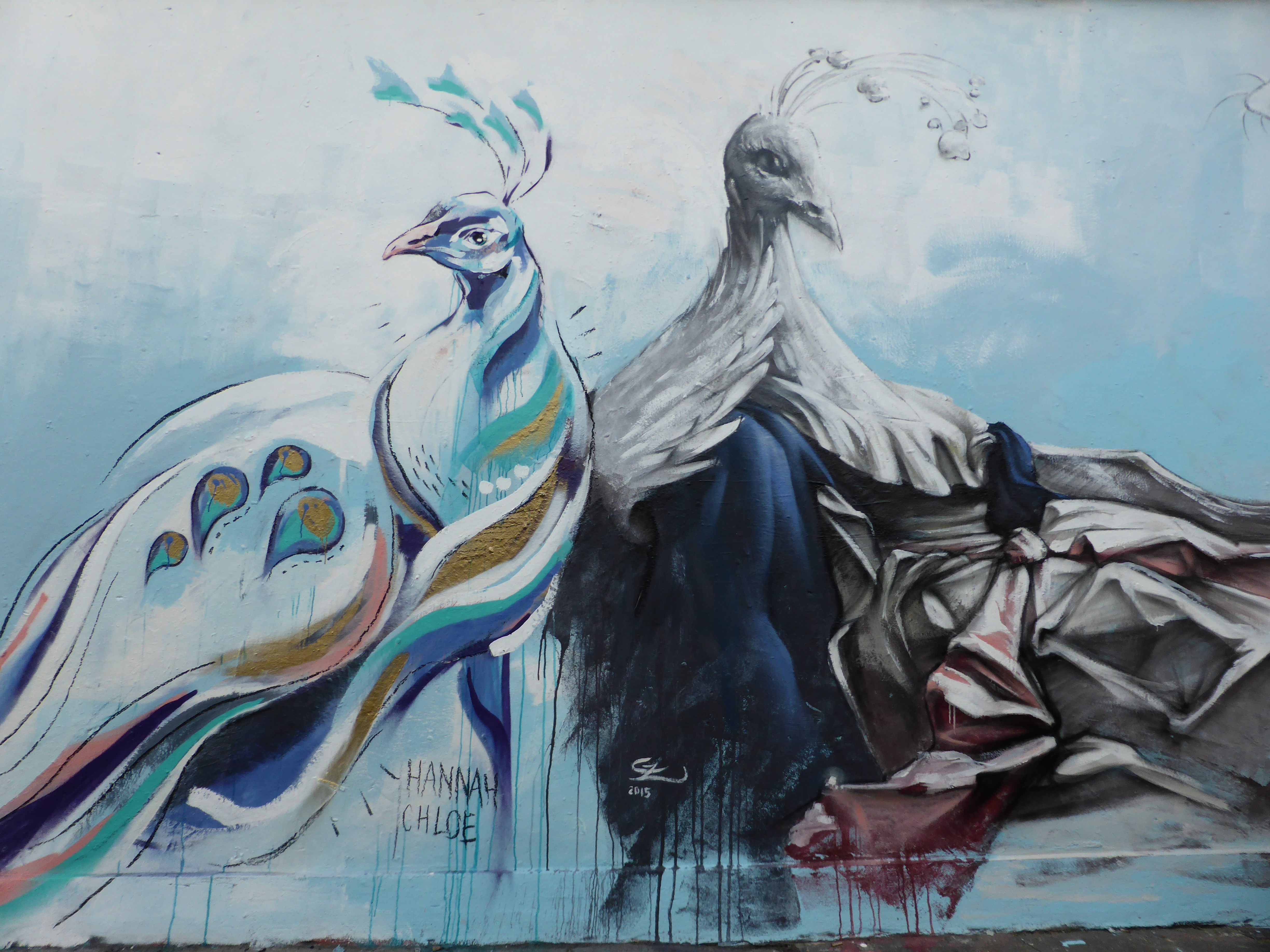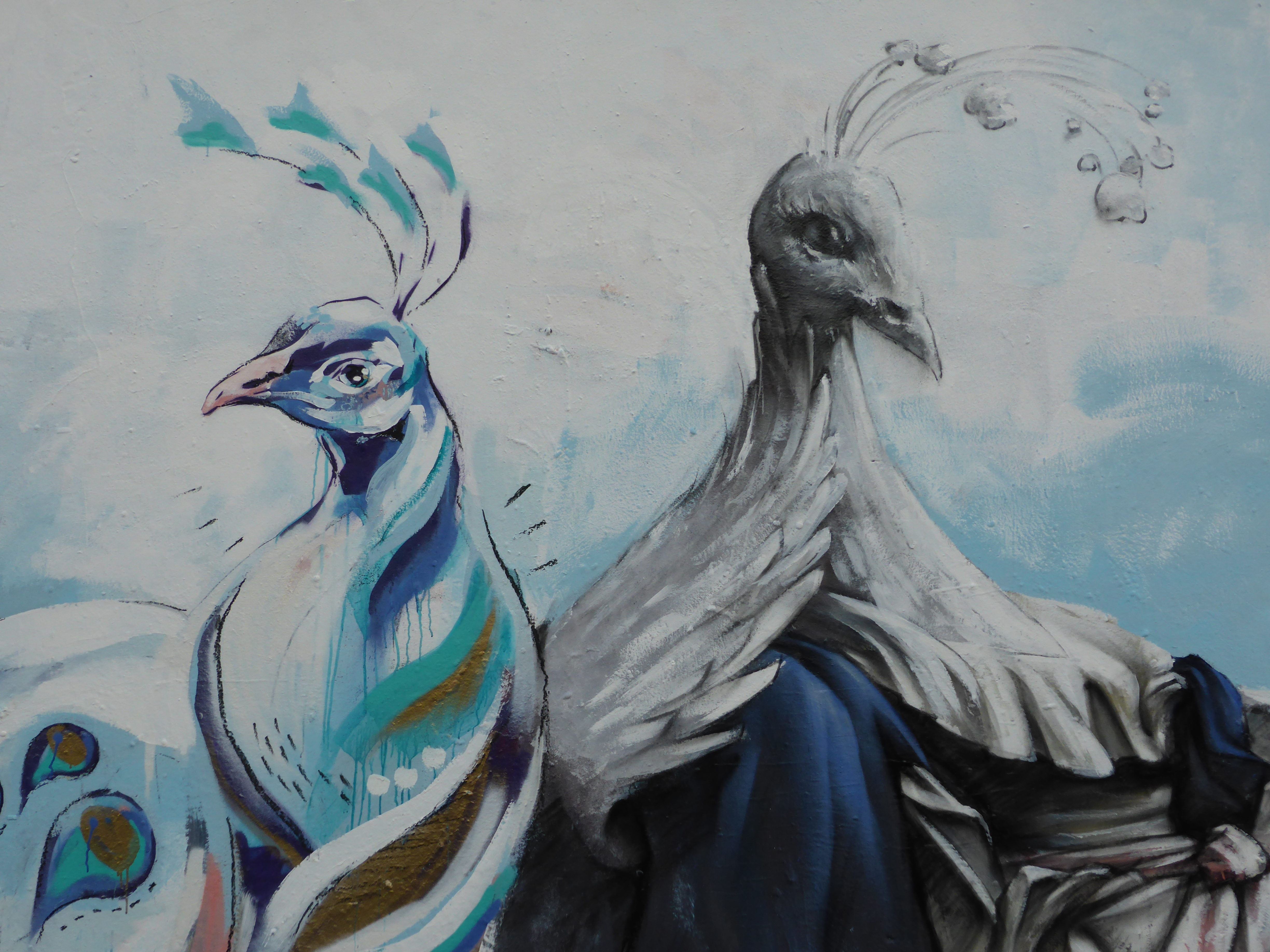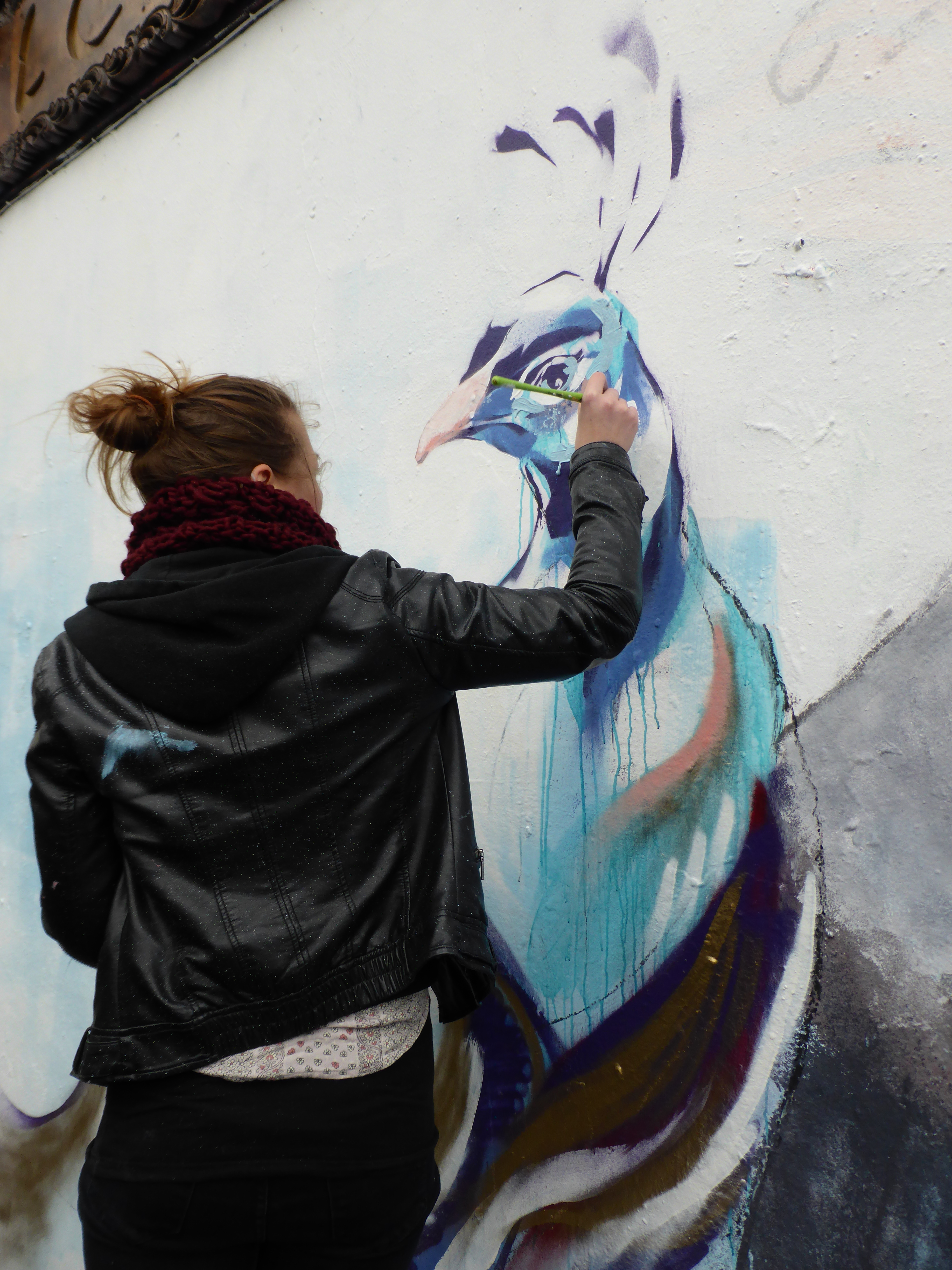 Yesterday we were fortunate enough to stumble across UK artist Hannah Adamaszek & German artist Guido Zimmermann painting on the iconic ‘Welcome to Kinkao’ wall on Pedley Street, just off of Brick Lane. The duo laid out a pair of stunning peacocks, both very much in their own style, yet the birds compliment each other exceptionally well. . The piece took some five hours to make on the cold day, yet the pair where in fine spirits painting away delicately and methodically, both working by brush, and were more than happy to oblige the many passing admirers, finishing day as the sun set on their superb collaboration. The work is a stunning addition to a wall that tends to see nothing but the highest calibre of artwork
