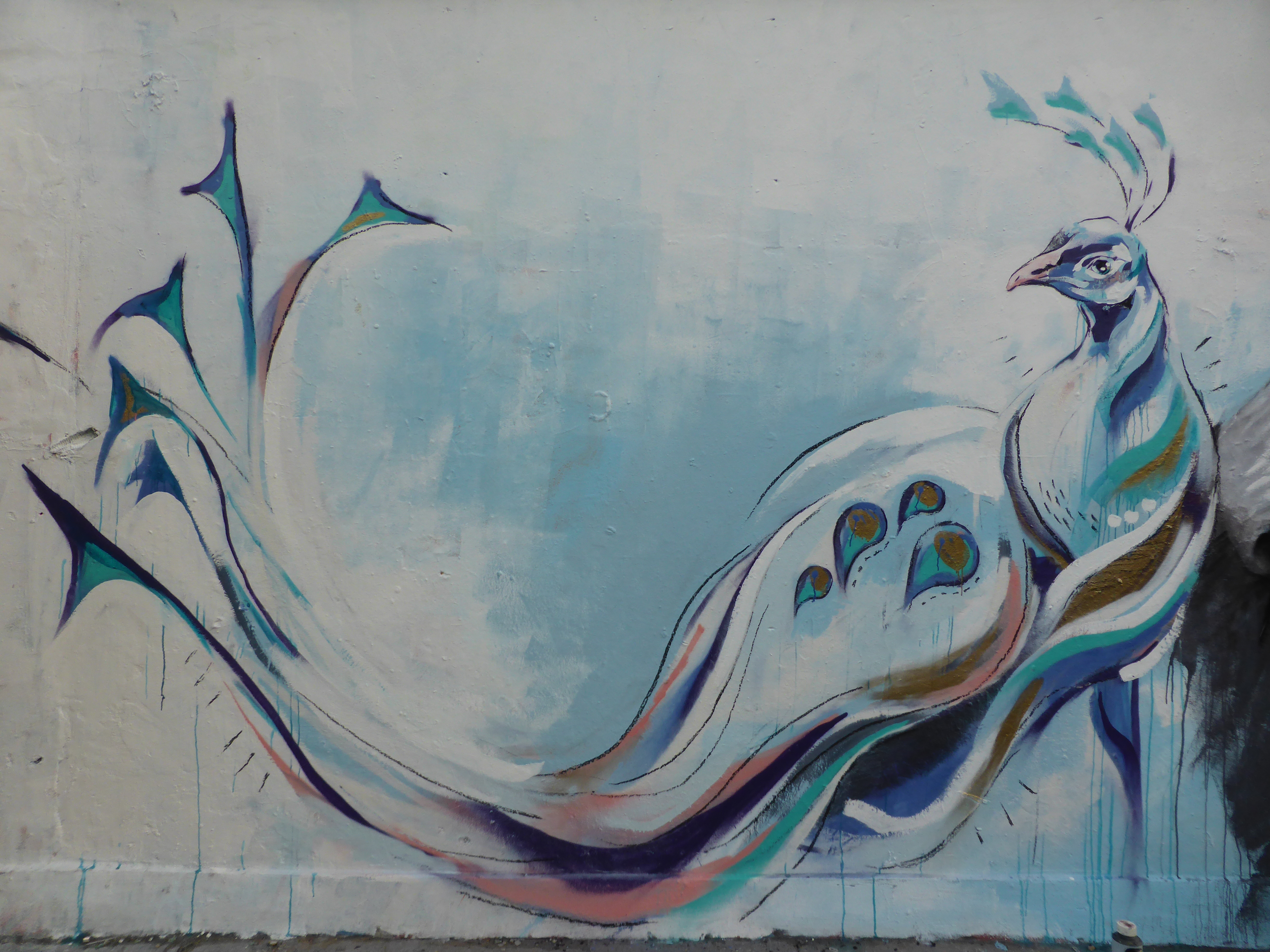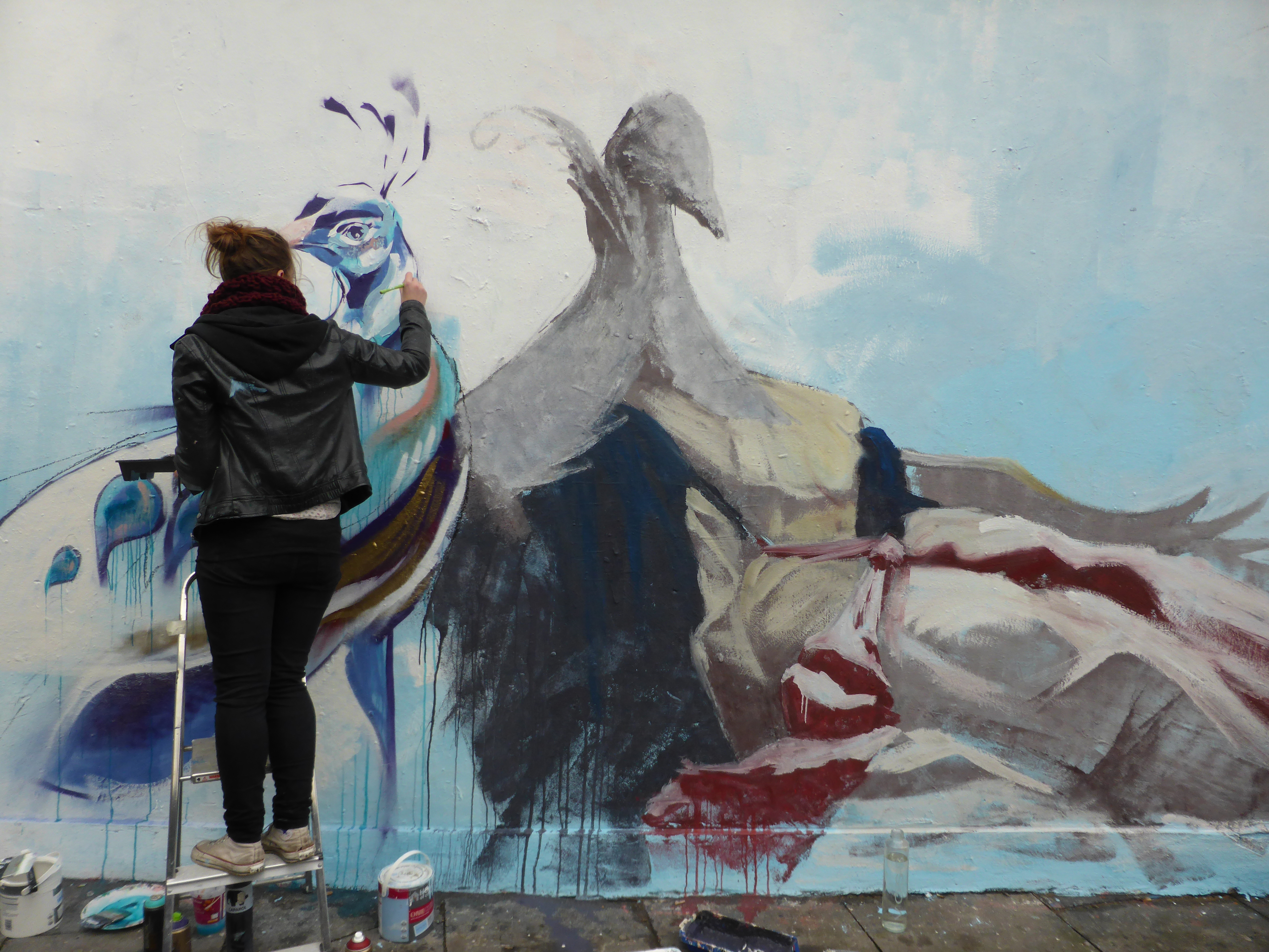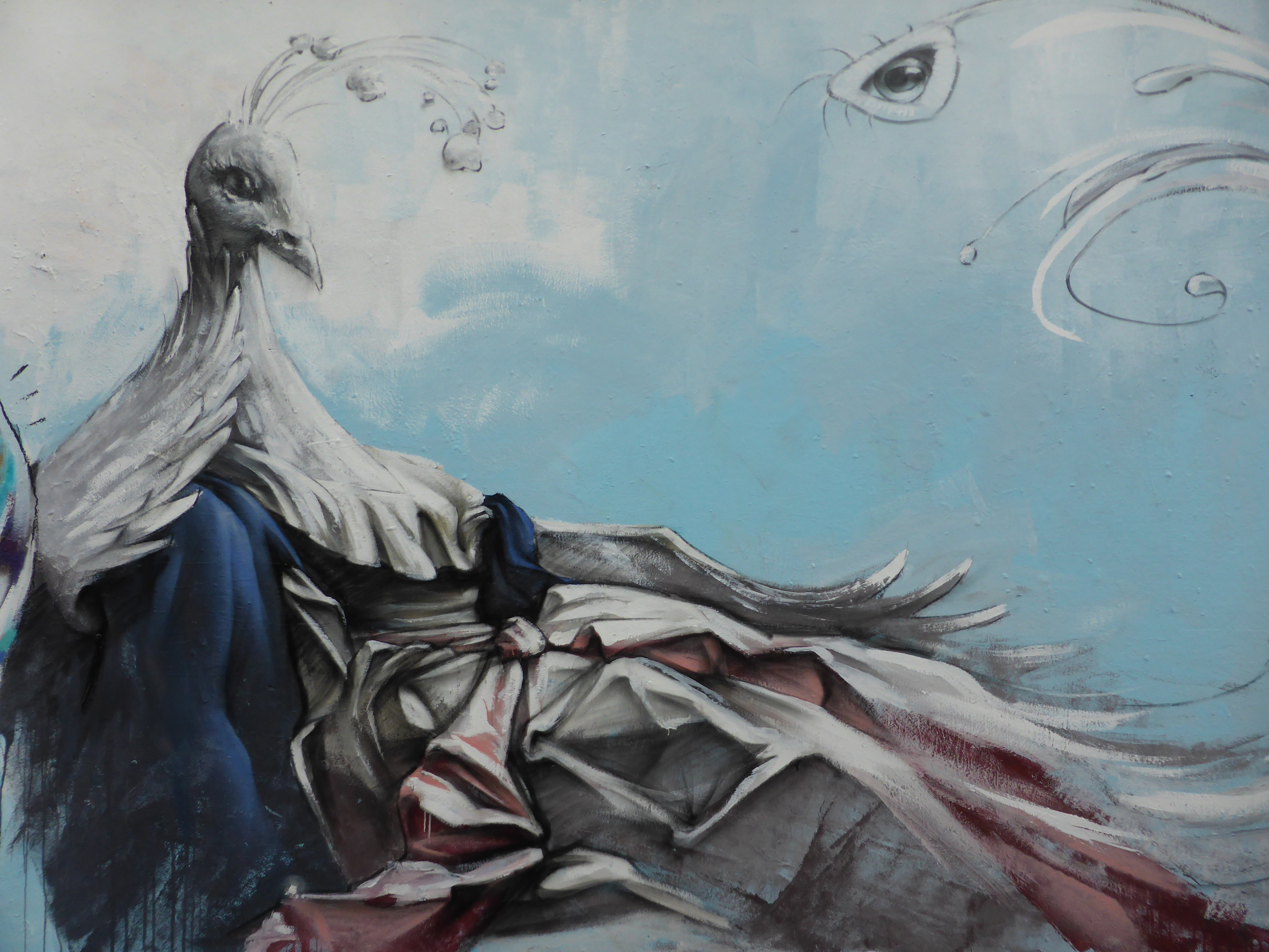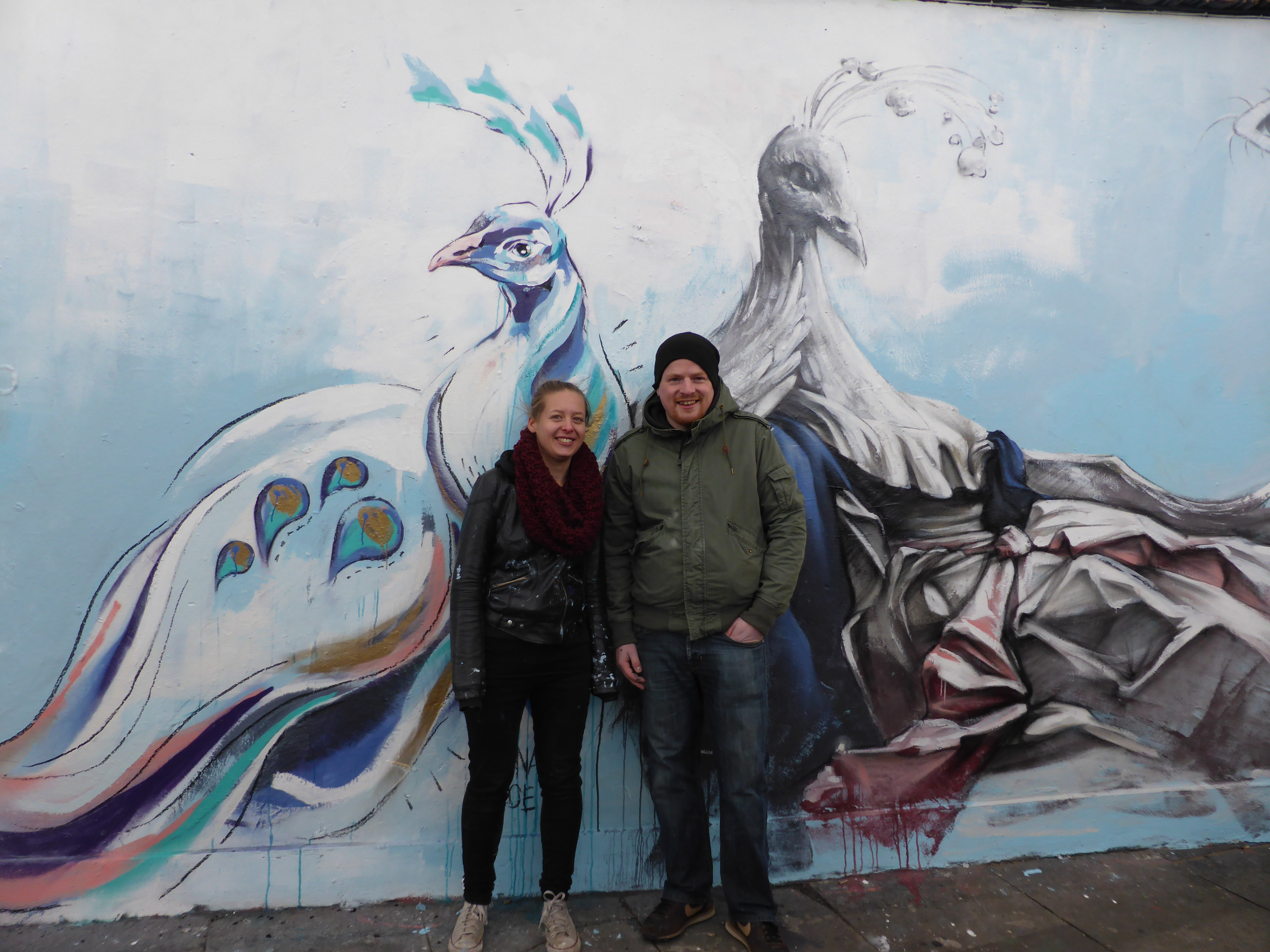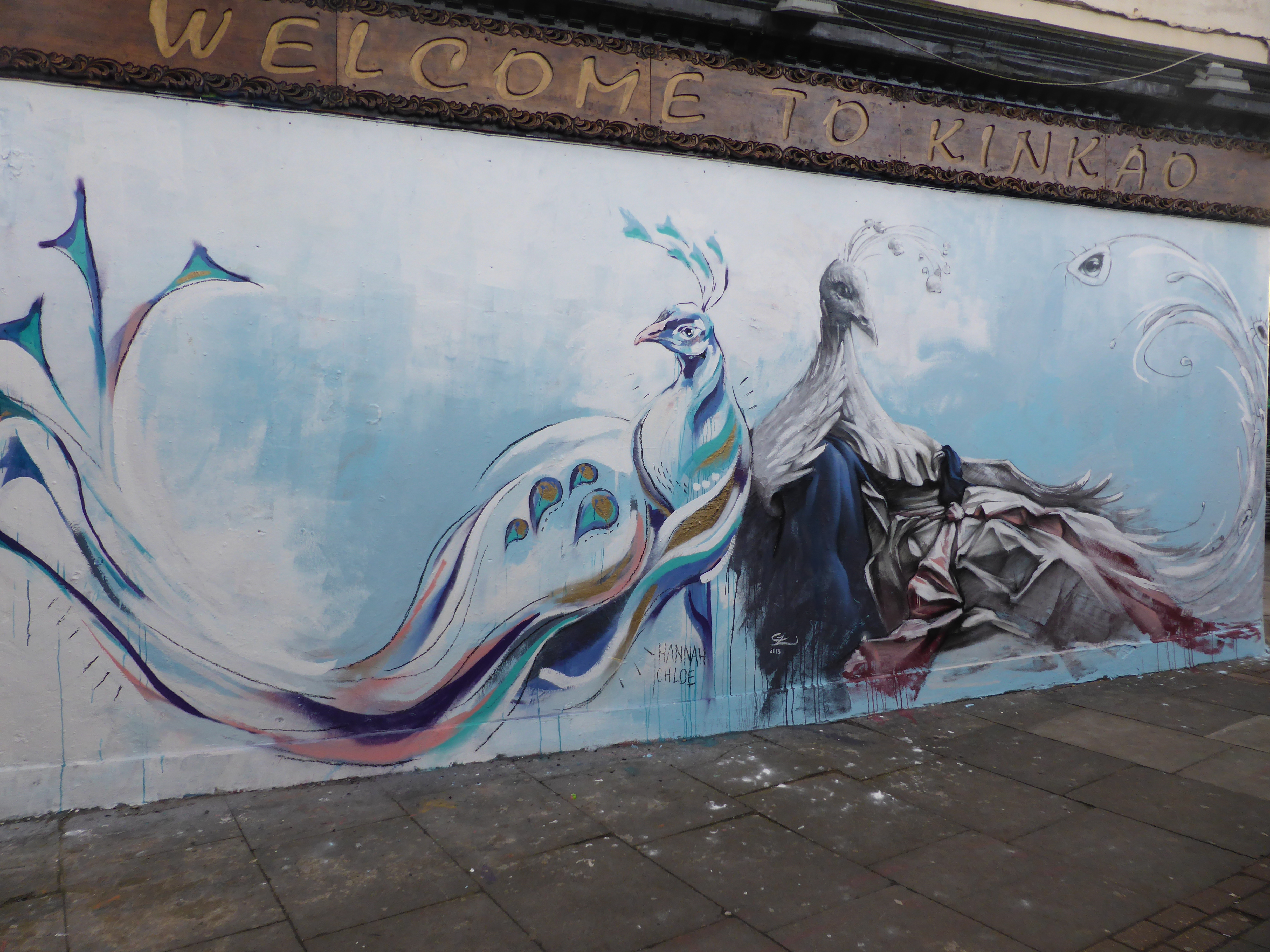 Yesterday we were fortunate enough to stumble across UK artist Hannah Adamaszek & German artist Guido Zimmermann painting on the iconic ‘Welcome to Kinkao’ wall on Pedley Street, just off of Brick Lane. The duo laid out a pair of stunning peacocks, both very much in their own style, yet the birds compliment each other exceptionally well. . The piece took some five hours to make on the cold day, yet the pair where in fine spirits painting away delicately and methodically, both working by brush, and were more than happy to oblige the many passing admirers, finishing day as the sun set on their superb collaboration. The work is a stunning addition to a wall that tends to see nothing but the highest calibre of artwork