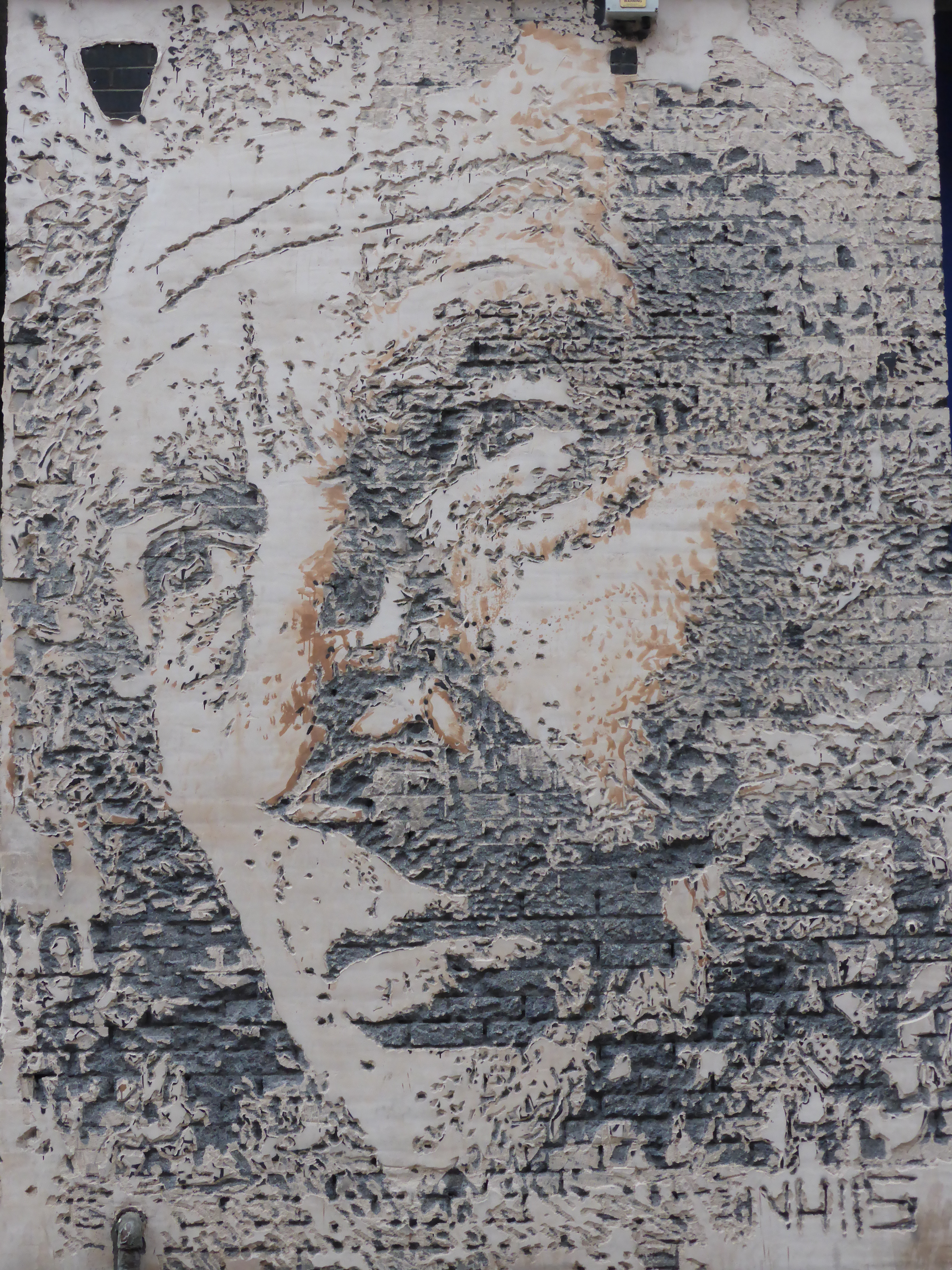 Over the last few days the latest exhibition ‘Dissonance’ by Portuguese street artist Alexandre Farto aka Vhils opened at The Lazarides Gallery in the West End, we will be reporting on that soon, having attended the opening night, but as a precursor we thought we would share the locations and some images of his current London works that can be seen. Vhils whose style in the case of the two works of his currently present works in London, achieves his crafting of imagery through a process of using a pneumatic drill to excavate sections of wall to craft his images. Vhils work sets to tear away at the socio-historical fabric and foundation of his chosen environment, and in his wake he creates images of predominantly staggering portraits, which haven’t just left an impression on the walls or surfaces of his work, but certainly leave an impression on the viewer for having witnessed also.