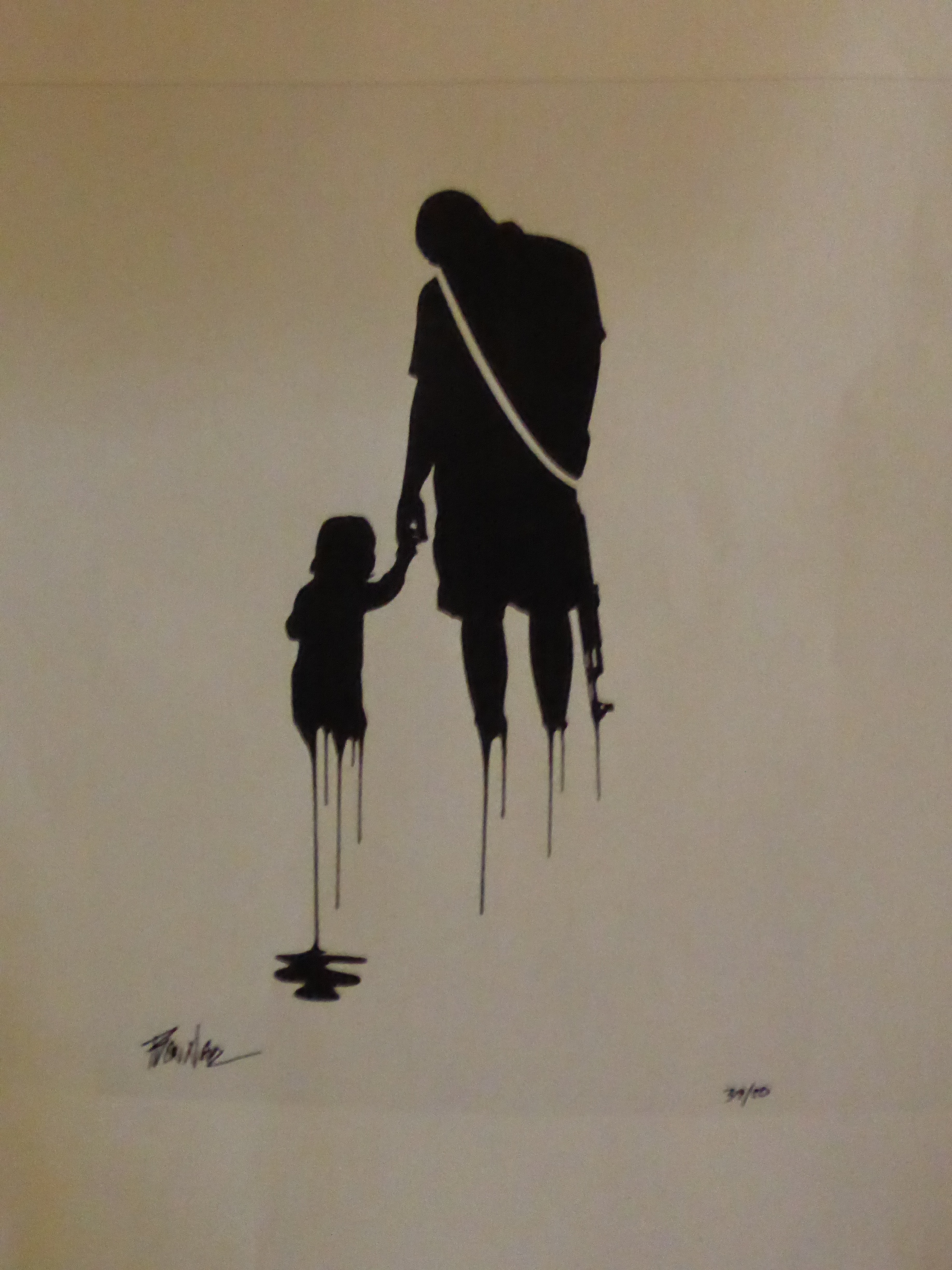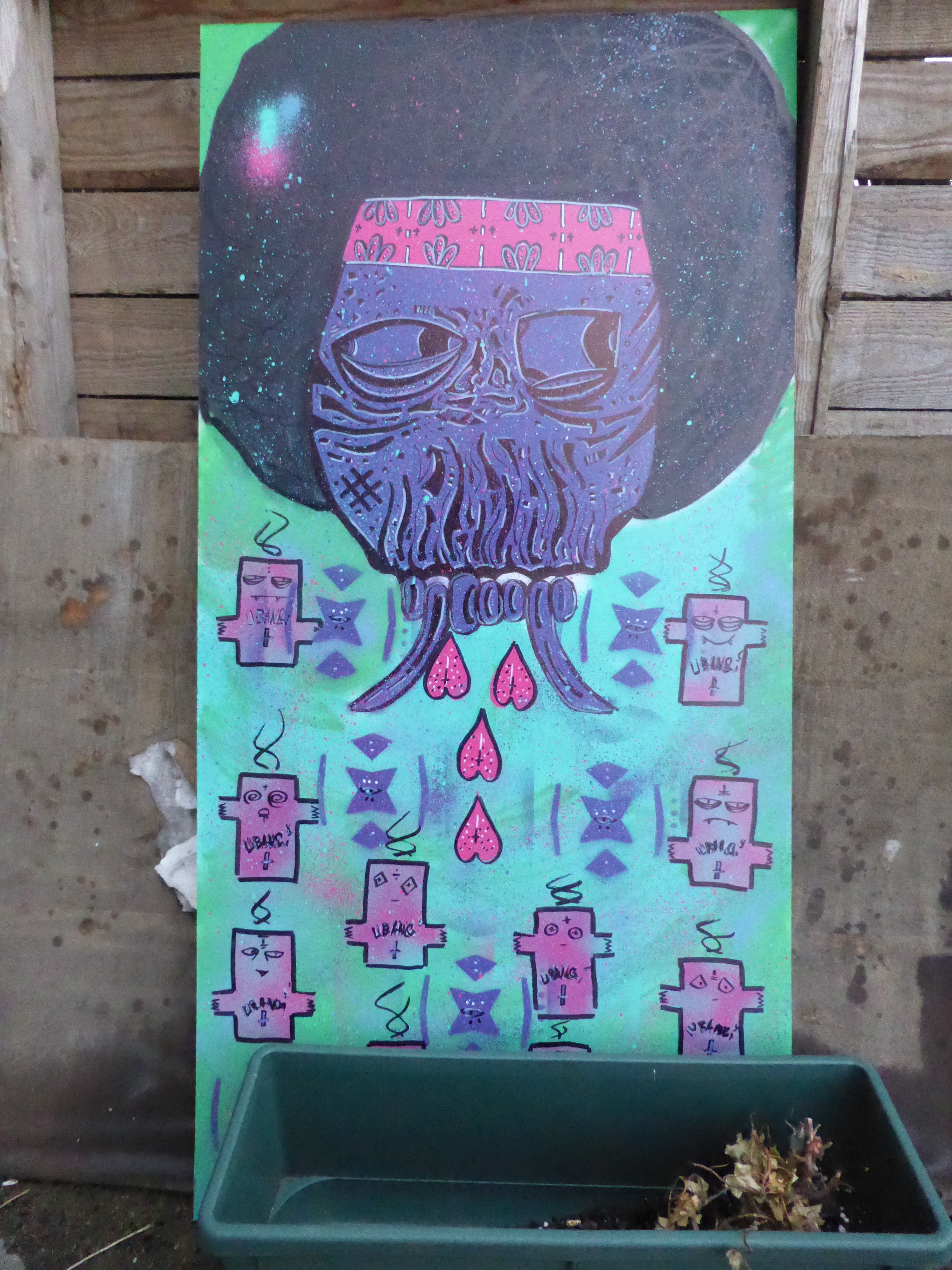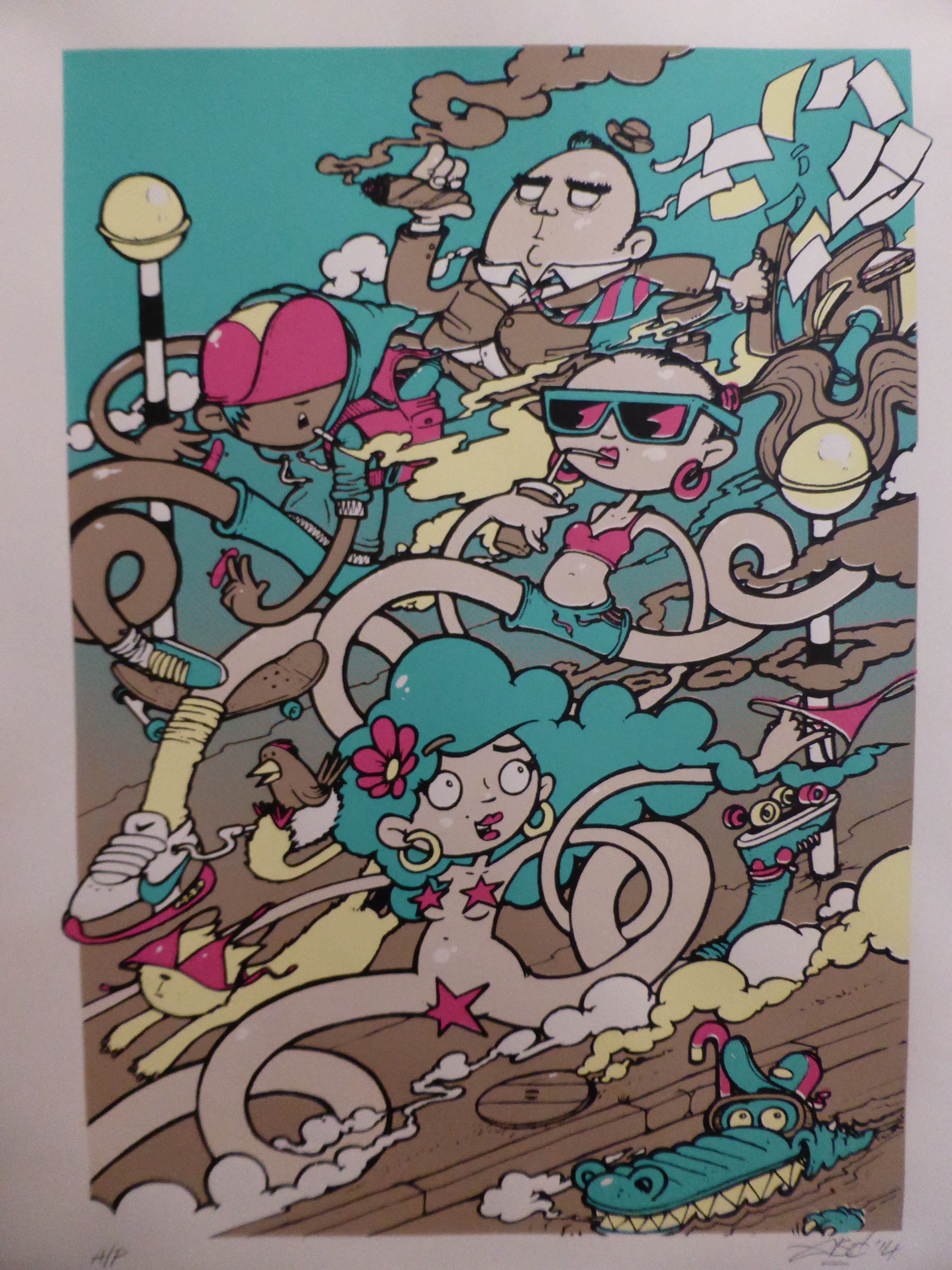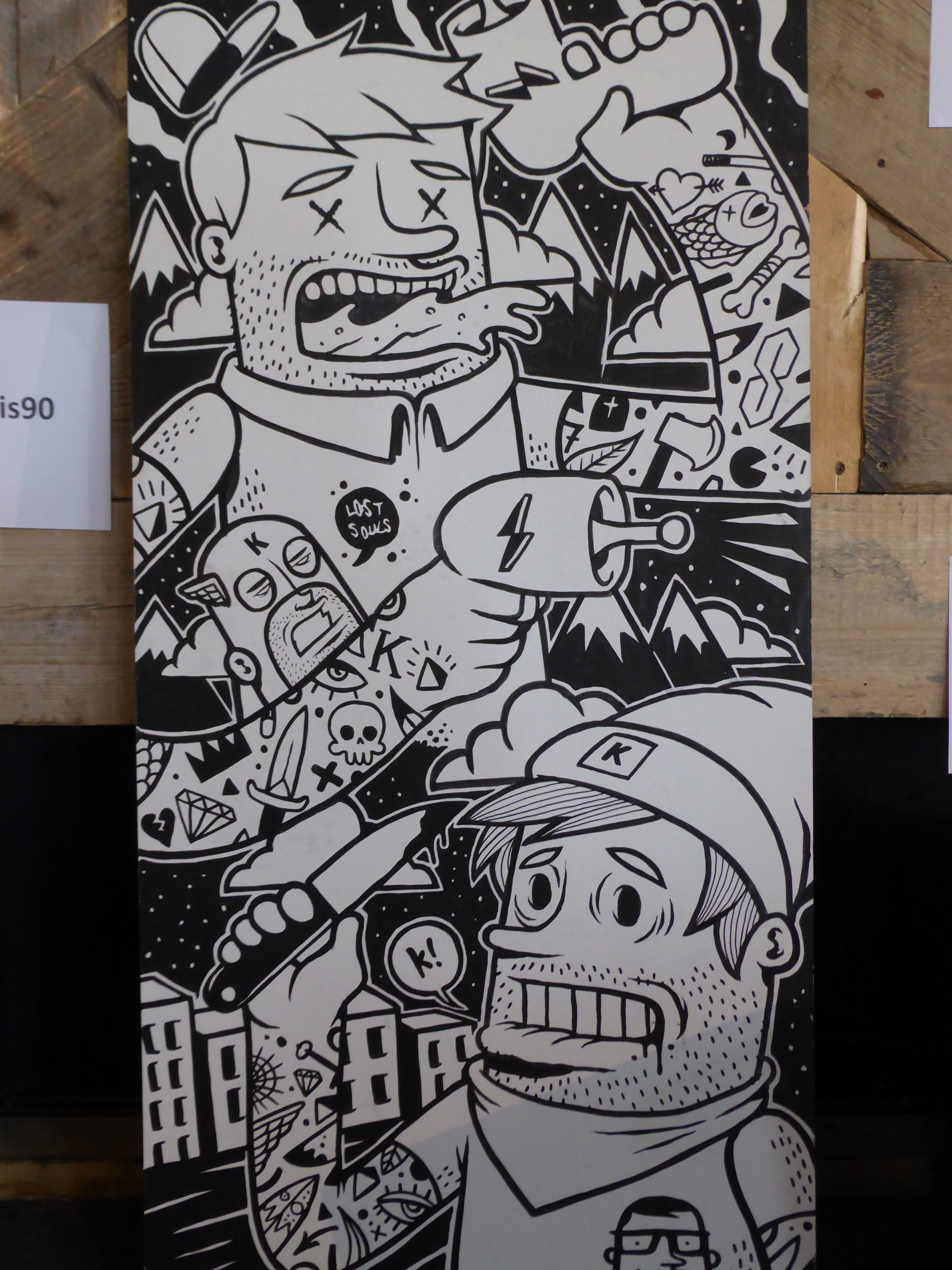Yesterday in Hackney Wick at the Number 90 bar in Hackney Wick a day of live Street Art, music and a silent auction comprising works donated by generous London based street artists, all to raise money for the charity Parkinson’s UK took place. A great event was laid on with a superb collection of works donated by street artists for the cause, available to bid on via an online silent auction. In addition to this there was also a series of boards being painted live throughout the afternoon and evening. Event organizer Tom Paul Maya will also be running the marathon for his uncle who past away last year to Parkinson’s. In all it was an incredible event, comprising of a beautiful and friendly atmosphere in a lovely location along the canal. The were plenty of people in attendance throughout the event and as the minutes drew in to the end of the auction, one could sense the excitement and tension as an eager crowd attempted to win the work of their choice. Whether people were lucky or not to get the work they wanted, we think its fair to say that a great day was had by all their. A great day for a great cause. Here are but a few of the works on offer in the silent auction.