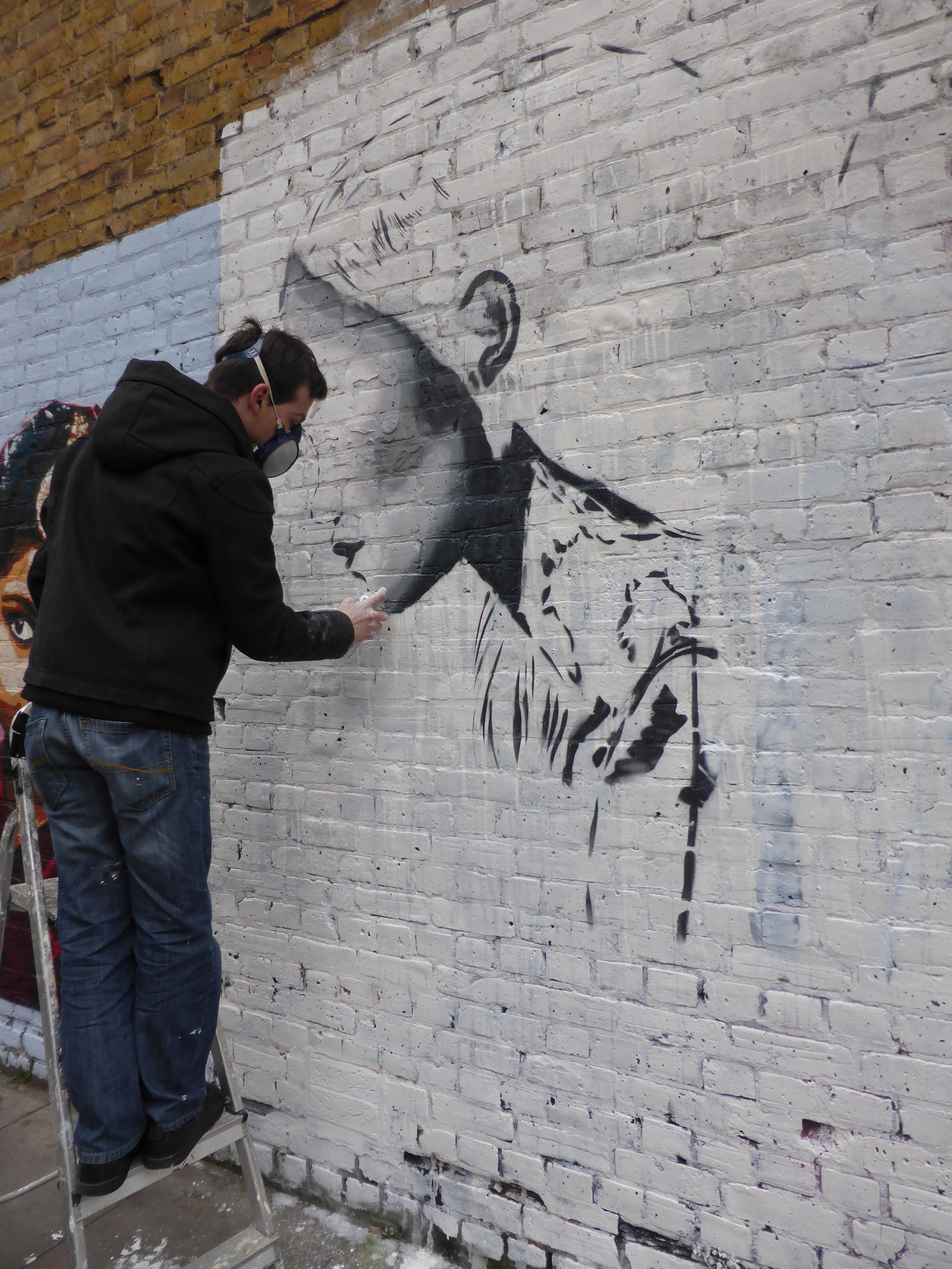 On Saturday we were lucky enough to stumble across four artists working around Brick Lane and Bethnal Green and met upon a fifth artist having completed her work on Hackney Wick. Needless to say we had a great time on Saturday, it was if we couldn’t move around the East End without seeing someone work their magic, and offers just a glimpse in to how much street art goes up around London’s mainstay area of the East End.