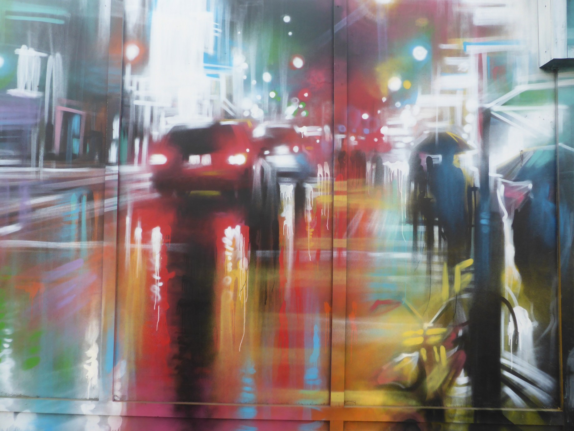 Over the last few days Dan Kitchener was out In London to lay out two of his excellent ‘Liquid Lights’ pieces firstly in Islington, organized by The Real Art Of Street Art, and secondly in Shoreditch, the hub of London Street Art. His compositions create a beautiful focus on light, shadow and perspective to make the mundane and in some cases miserable scenes he regularly focuses on look beautiful, and yet again his work doesn’t disappoint. These mark the fourth & fifth works put up in London by Dan Kitchener in 2015, and we have been fortunate enough to witness the previous three of the year so far, all laid out in Croydon’s Arts Quarter.