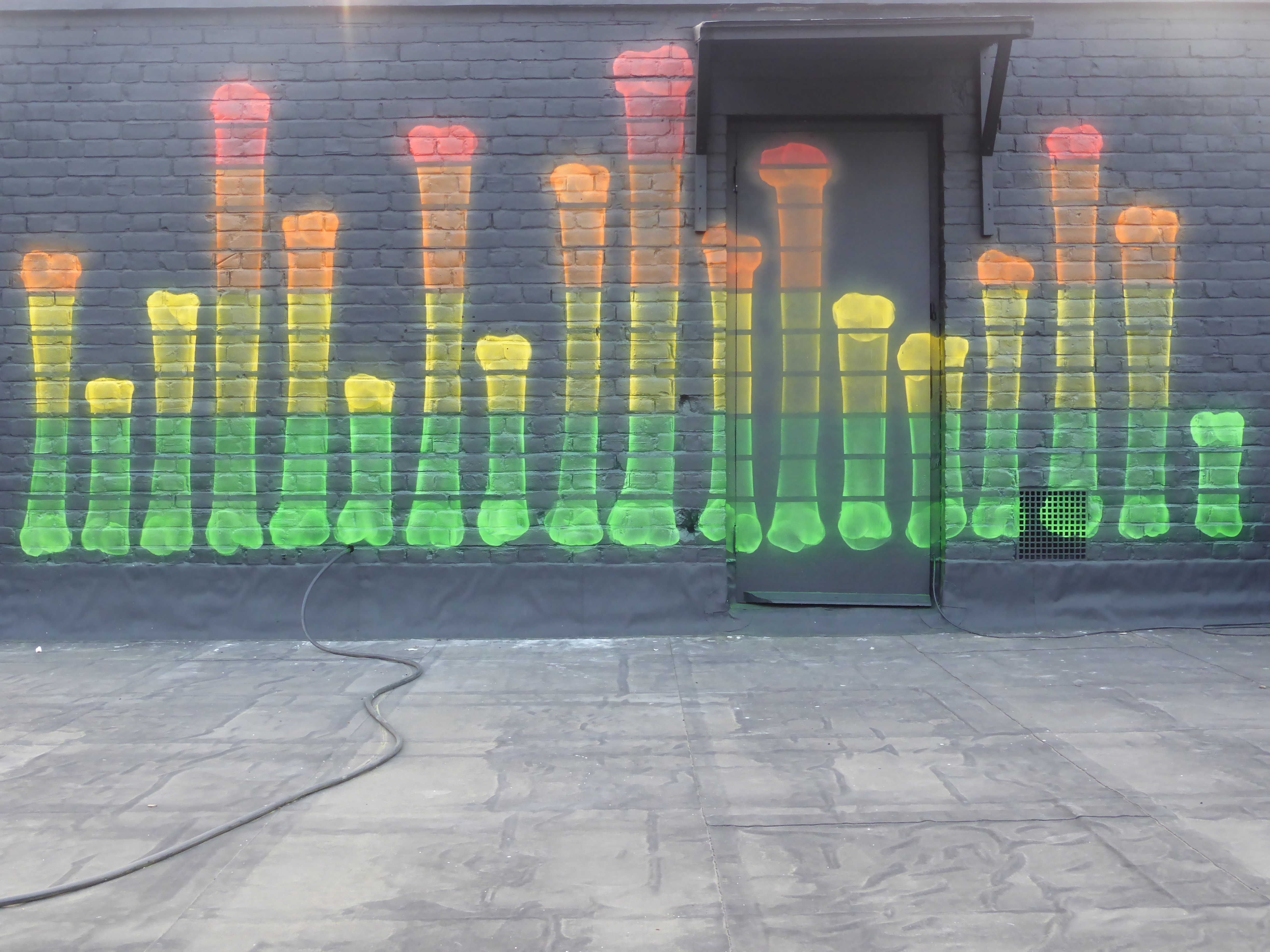 The latest addition to the Jealous Gallery roof’s feature wall as a part of the ongoing Jealous Rooftop Mural Project is a work from Shok-1, who paints what he dubs ‘Aerosol X-Ray’ art. Shok-1 uses the many anatomical elements of the human body to transform and create his myriad hybrids of them that distinguish his glowing X-ray compositions, The translucent quality is due to his meticulous technique with cans and caps, and a closely held method at that, in fact when we passed by while Shok-1 was constructing this piece, he didn’t wish to be seen painting through fear of losing his technique. I was fortunate enough to be let up on the roof again by the kind staff of the Jealous Gallery to document and share this piece which is entitled ‘What Your Soul Sounds Like’, depicting a graphic equalizer comprising his trademark X-Ray elements.