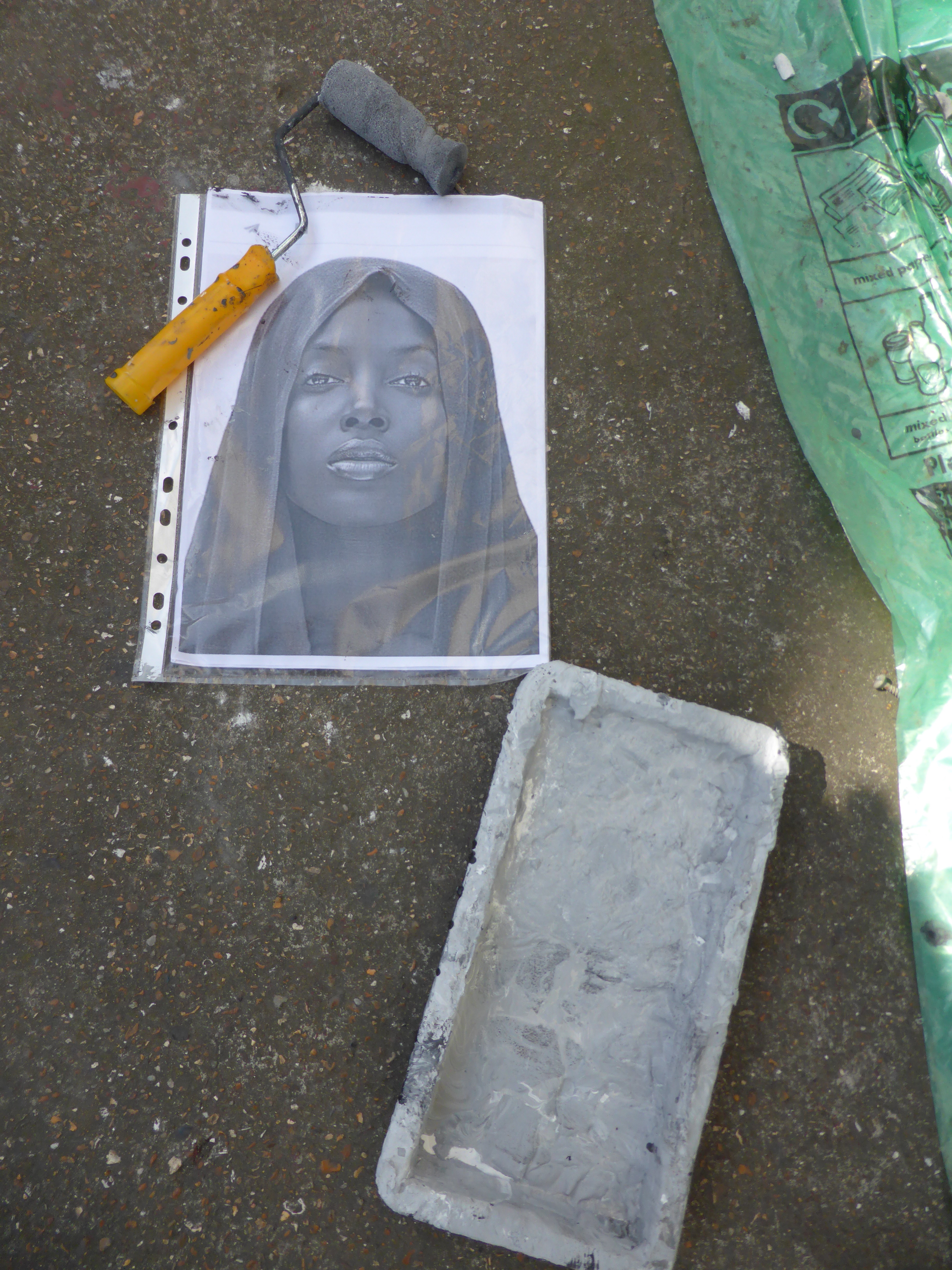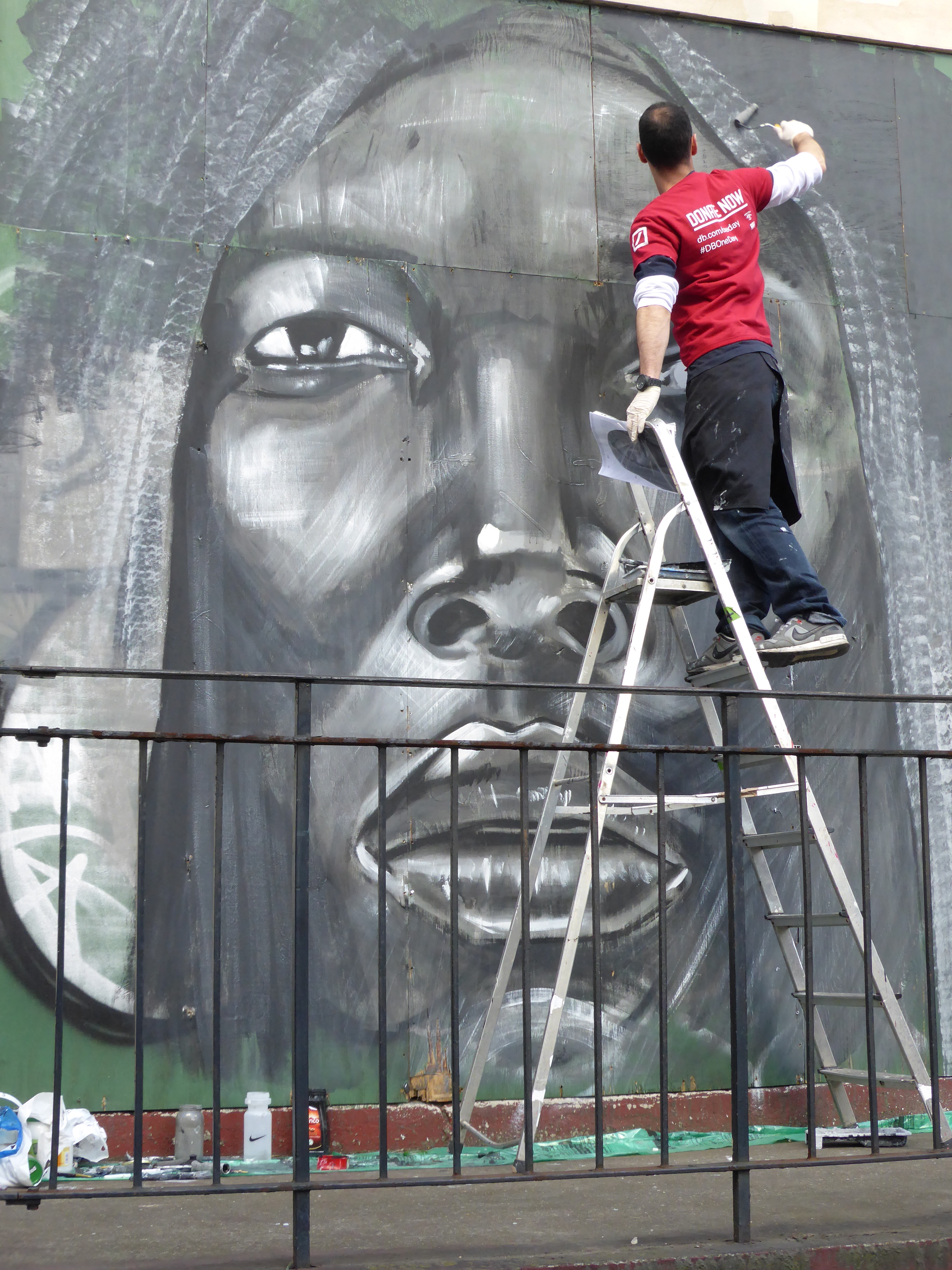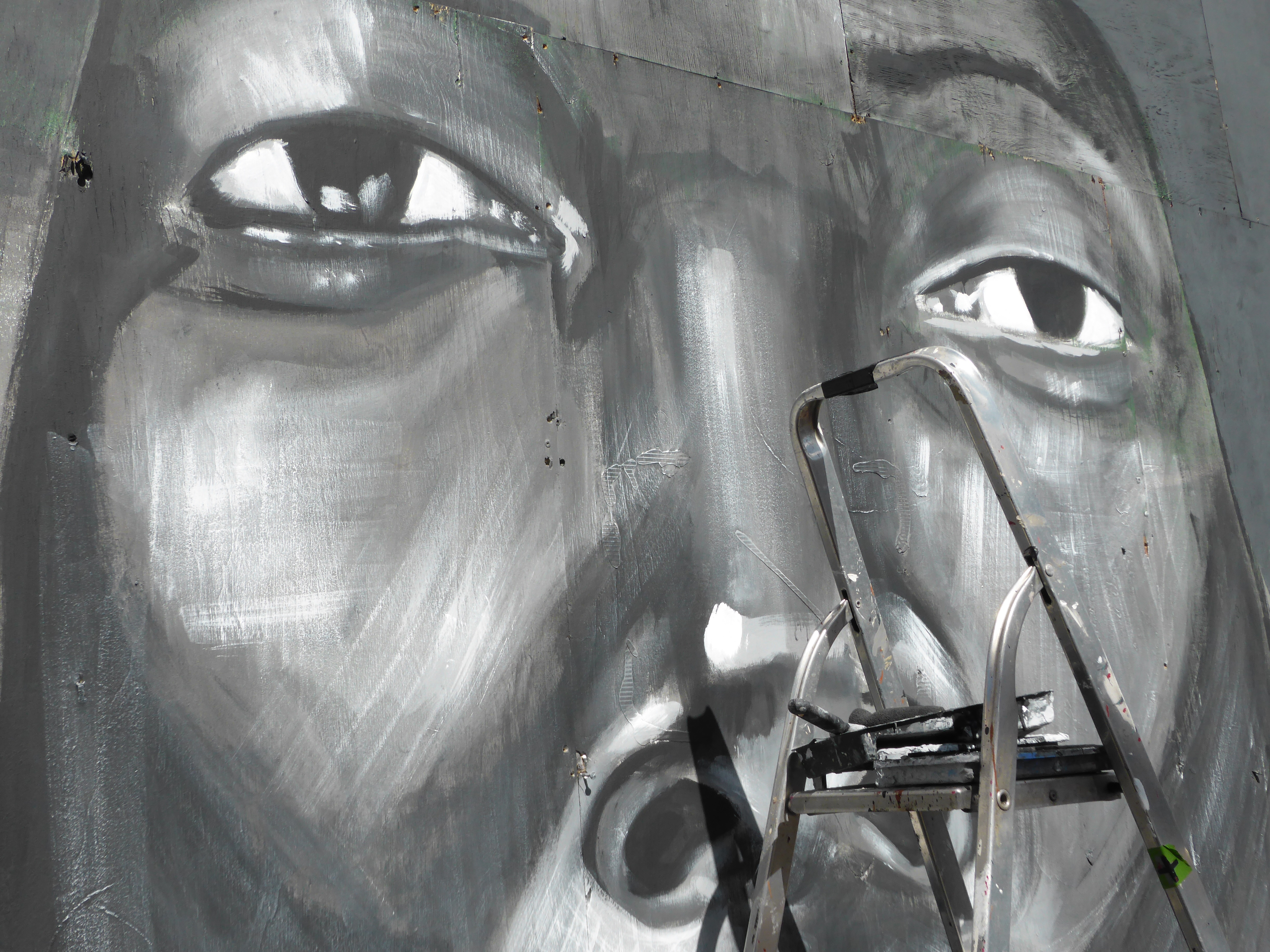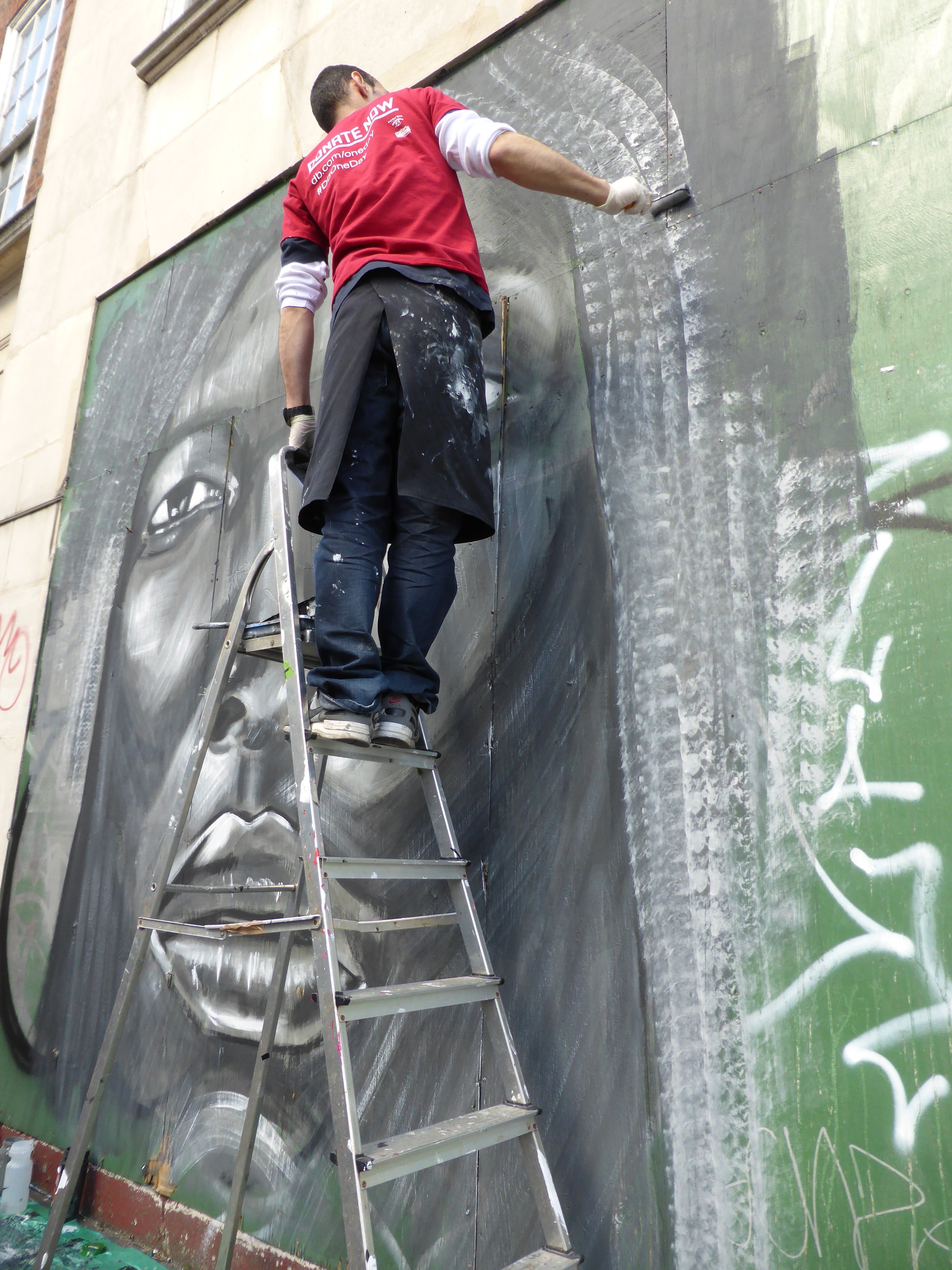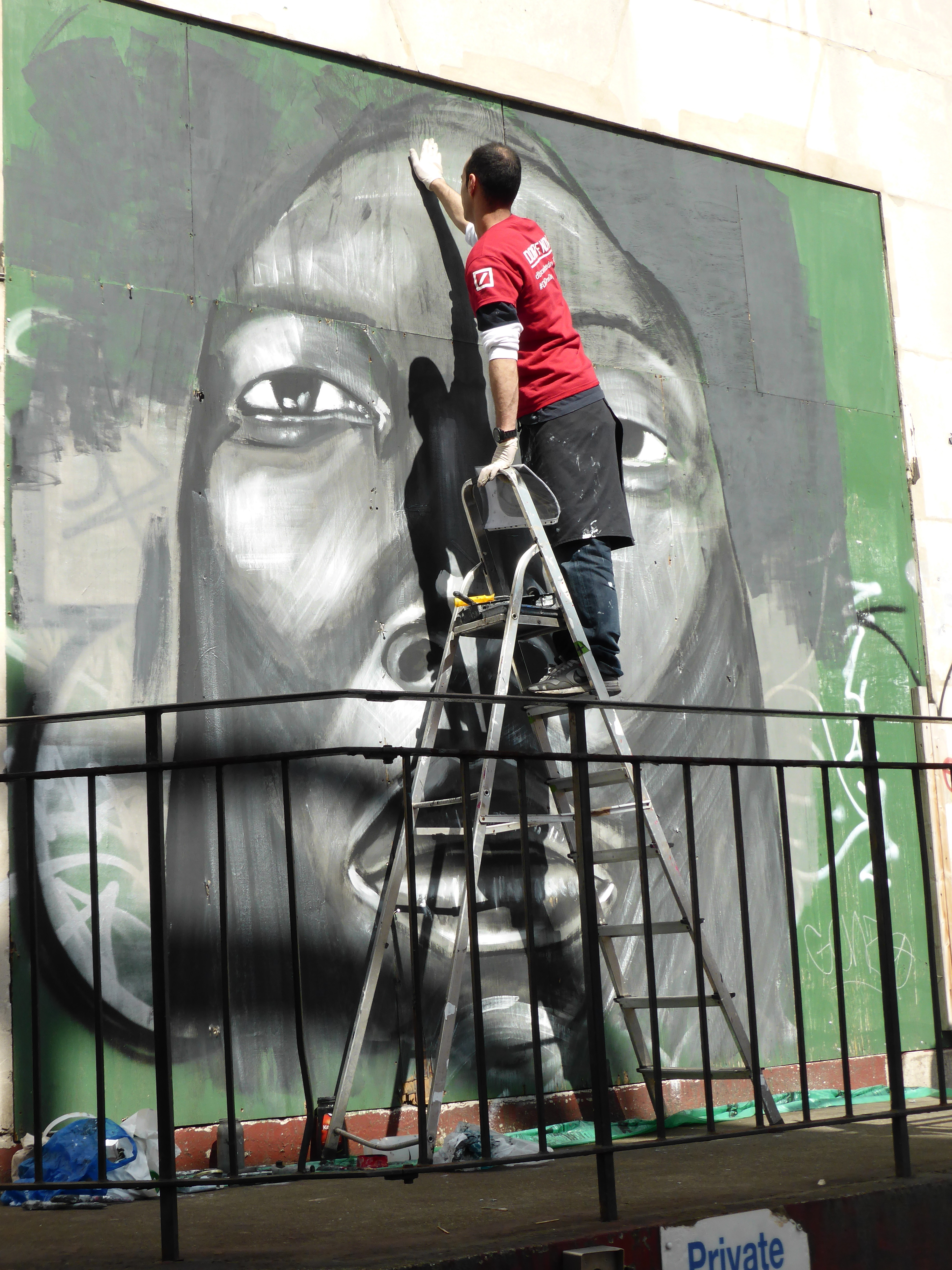 Yesterday afternoon we were fortunate enough to meet upon Furia 139, for the second time this year, painting another one of his beautiful grey-scale portraits. Working with his roller and paint brushes Furia set to lay out a work in his ‘gritty’ style, not favouring a too polished style. Enjoying and making the most of the beautiful sunshine in London yesterday afternoon, Furia casually spent the afternoon setting out this stunning piece, working from an image Furia had been saving for some time. This new addition to Commercial Street is just along the road from the work he created last weekend (covered here). This superb work was set up through the great support of the Lollipop Gallery. A lovely day and a great piece of art, we really love the soulful expression in the face. Thanks for your time Furia, we look forward to seeing what else you paint in the future.