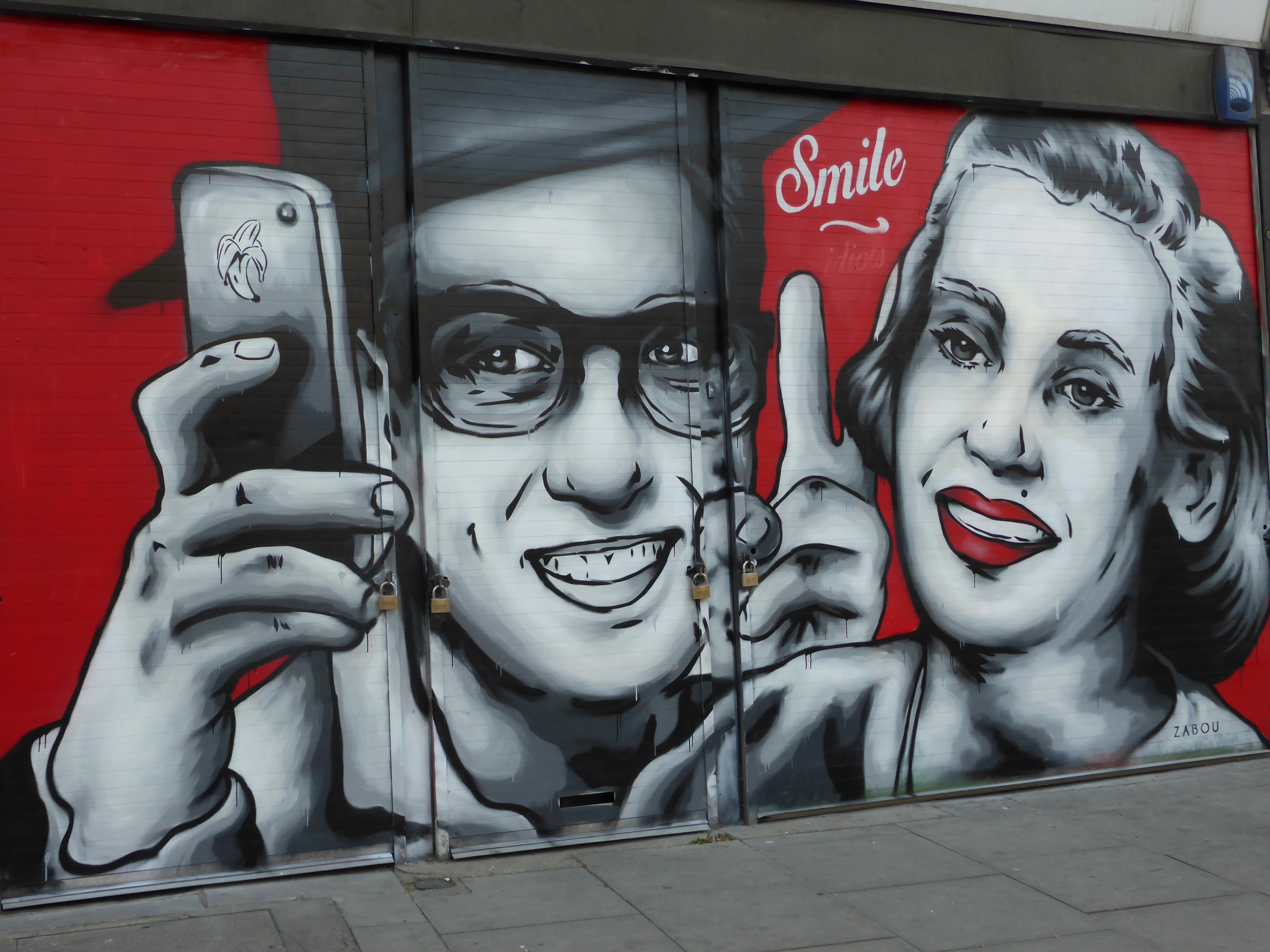 Zabou was out yet again painting two days ago in the East End, taking on a set of double shutters for her newest work. The piece is entitled ‘Smile!…Idiots’, and is very much in keeping with the style of humour Zabou often places into her works. The piece mocks the rise of ‘selfie’ culture and is inspired by the ever increasing tendency by many to just display their own vanity by posting picture after picture of nothing but selfies. We love the little addition of the banana on the phone. This piece certainly brightens up the little shop front at the top of Hackney Road and is also a nice follow up to a similar themed piece entitled ‘Dis-Connected’ painted in Camden at the end of 2014 and still standing.