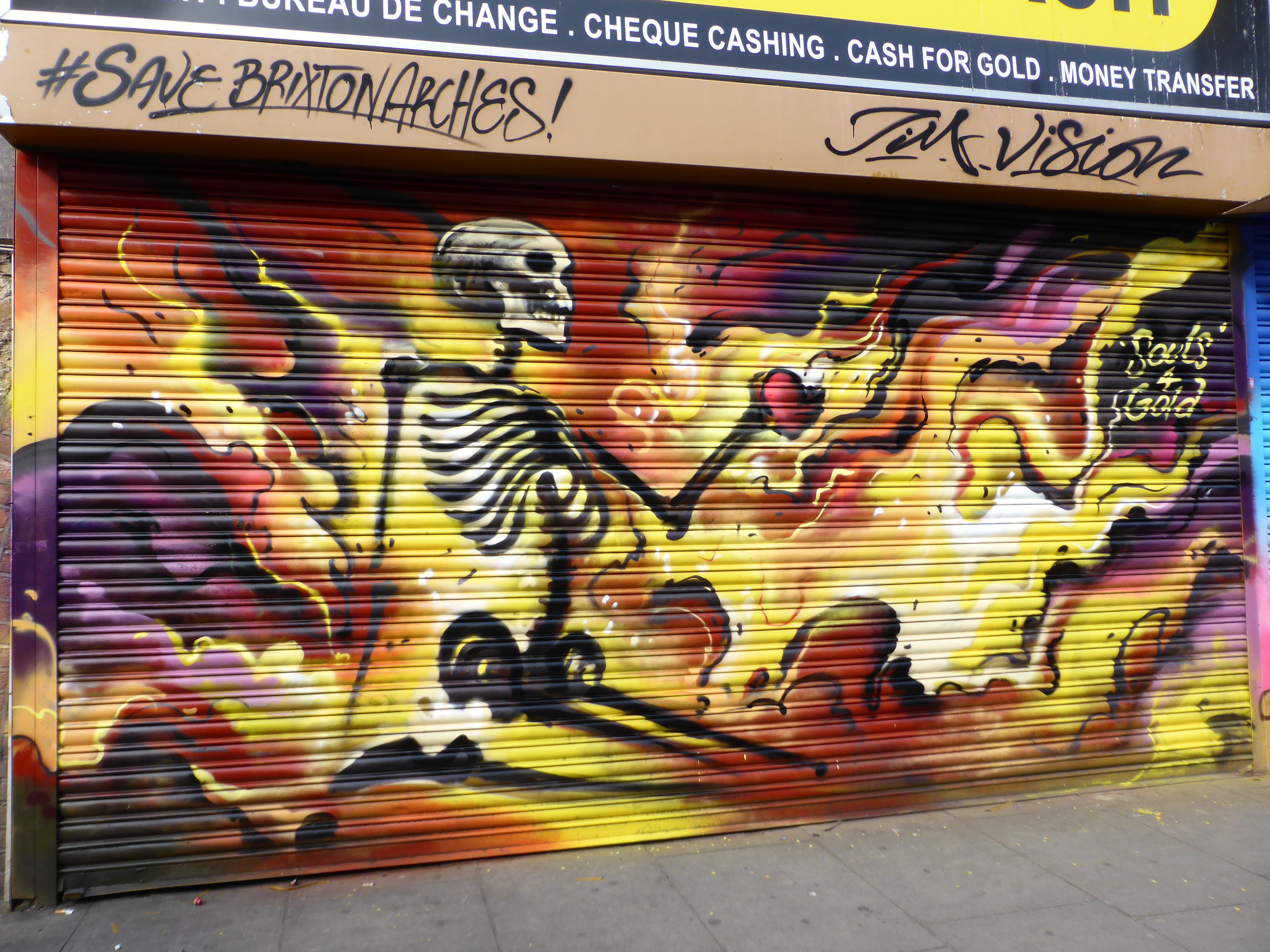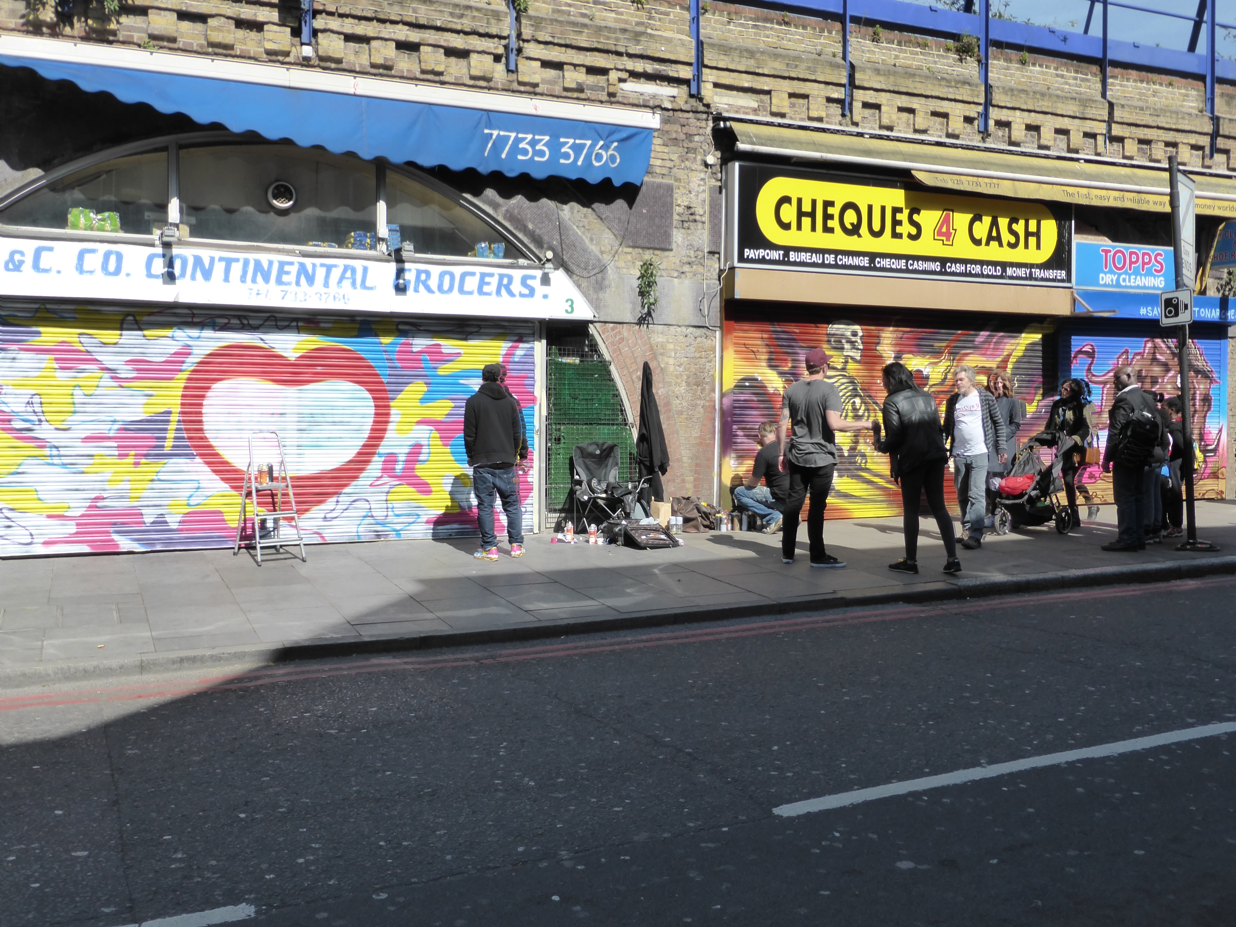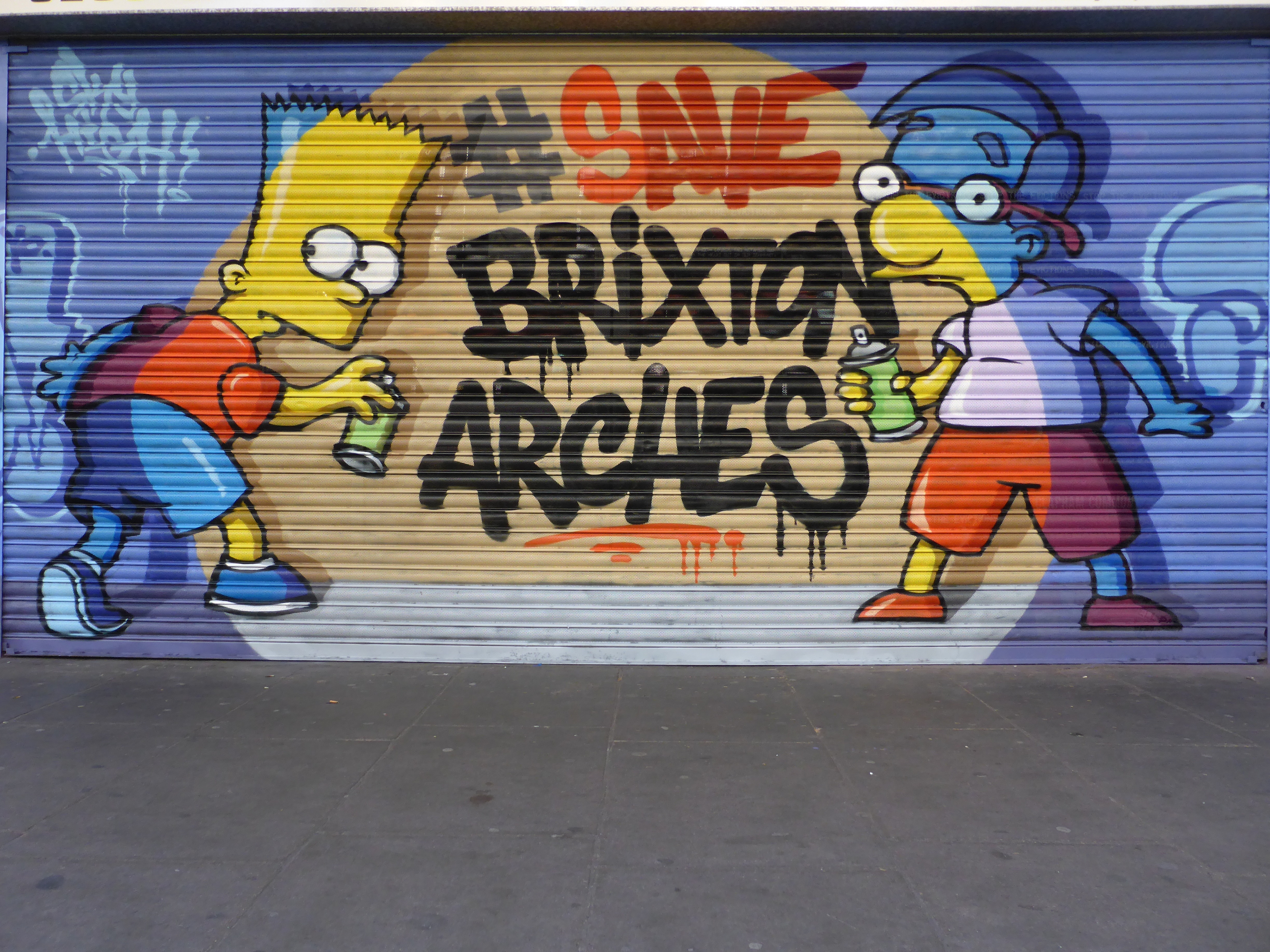 Last Sunday in the glorious Spring sunshine the latest installments of Street Art for the #SaveBrixtonArches campaign were put up during a paint jam with 7 artists out painting a further six of the 40 or so shutters to be completed. Bringing the current total of shutters painted to ten and its only fair to say that in terms of Street Art, Atlantic Road and Brixton Station Road, spanning the Brixton Arches are rapidly becoming an incredible outdoor gallery dedicated to one worthy cause. The crux of the situation is that Network Rail intend to evict the current tenants of the shops along the railway arches spanning Station Road and Atlantic Road, in the name of redevelopments and make the new rates of rent so high, that it will be impossible for this community of non-chain store outlets to survive and continue from these spots in the future.