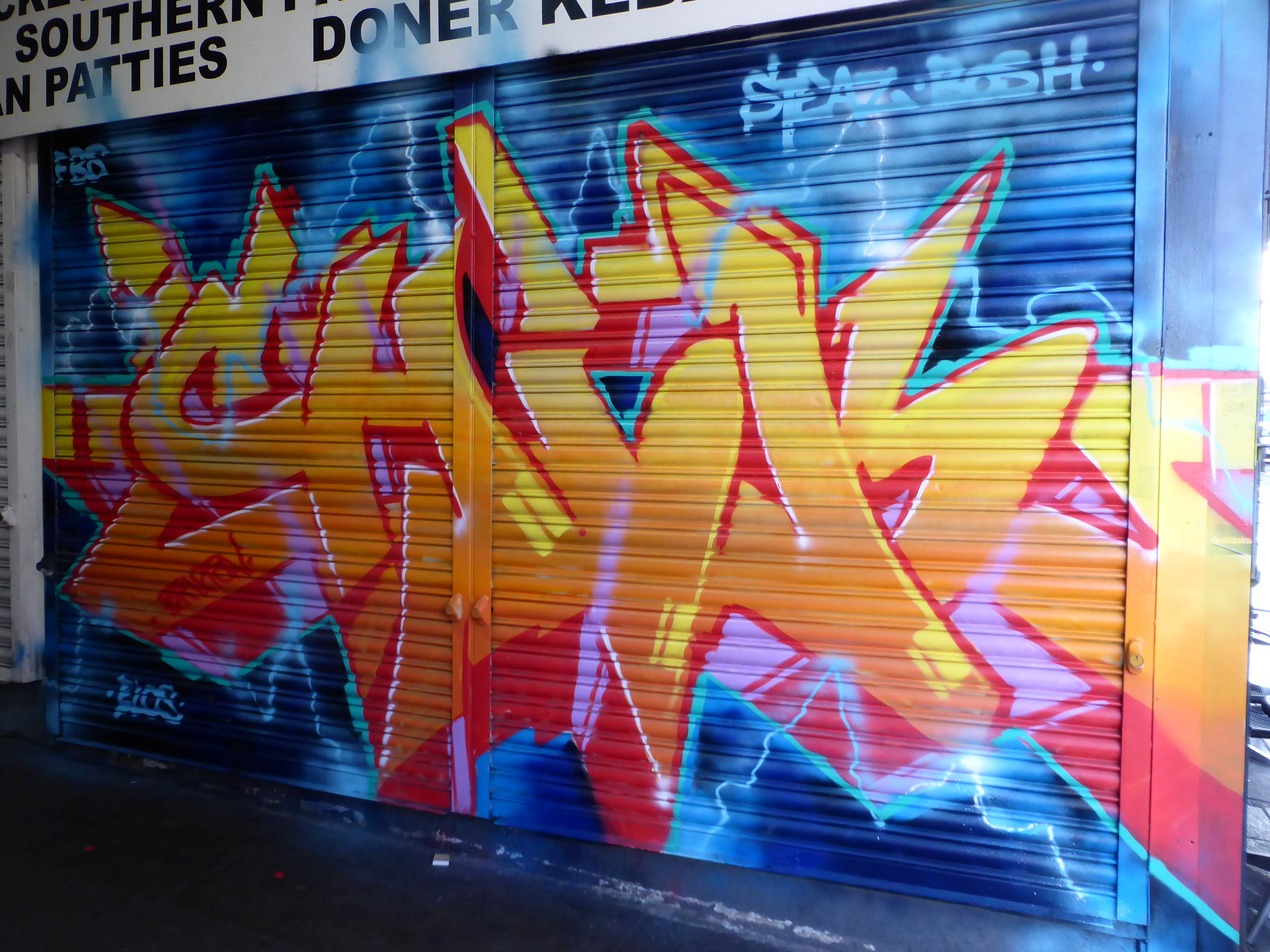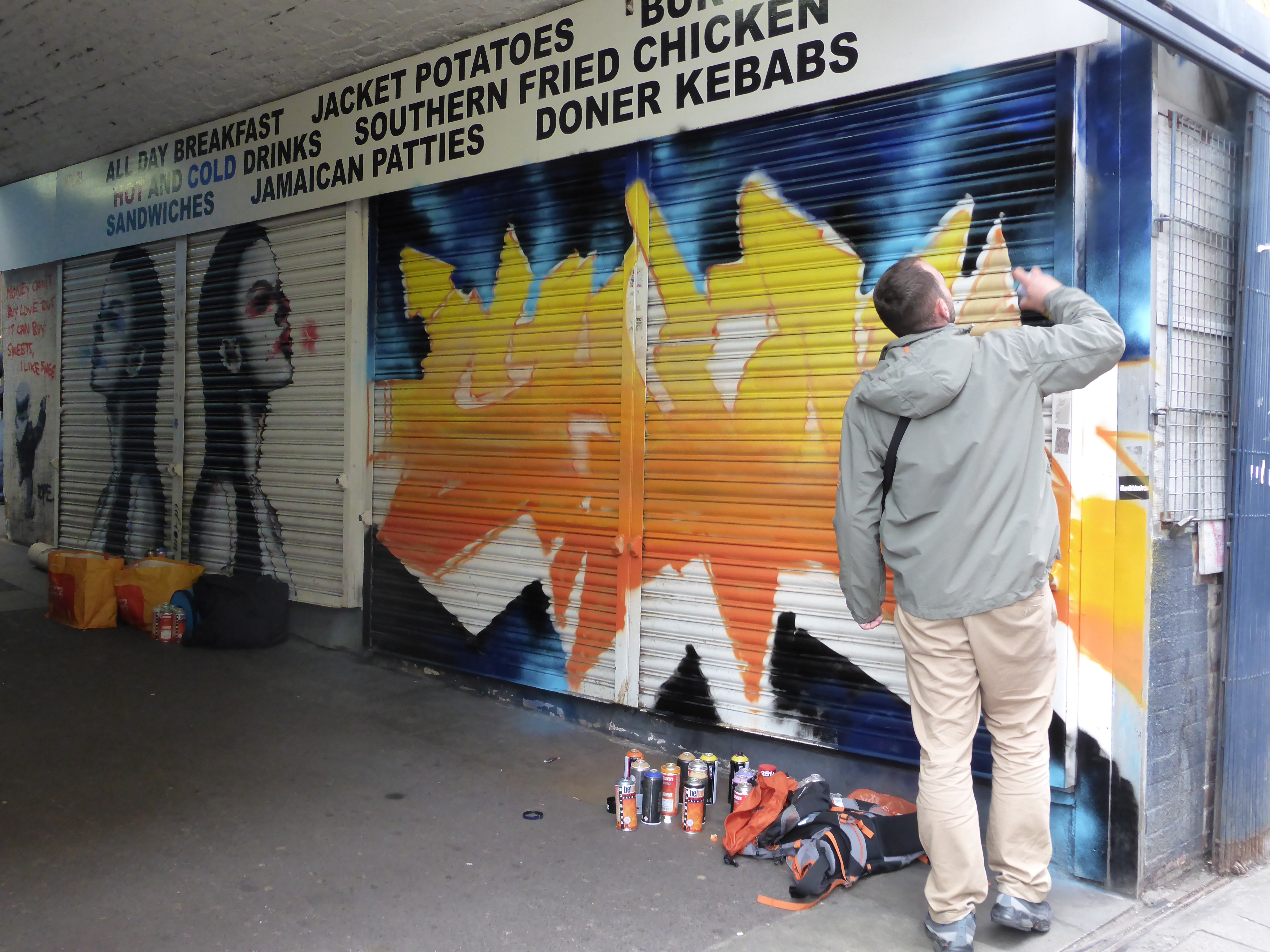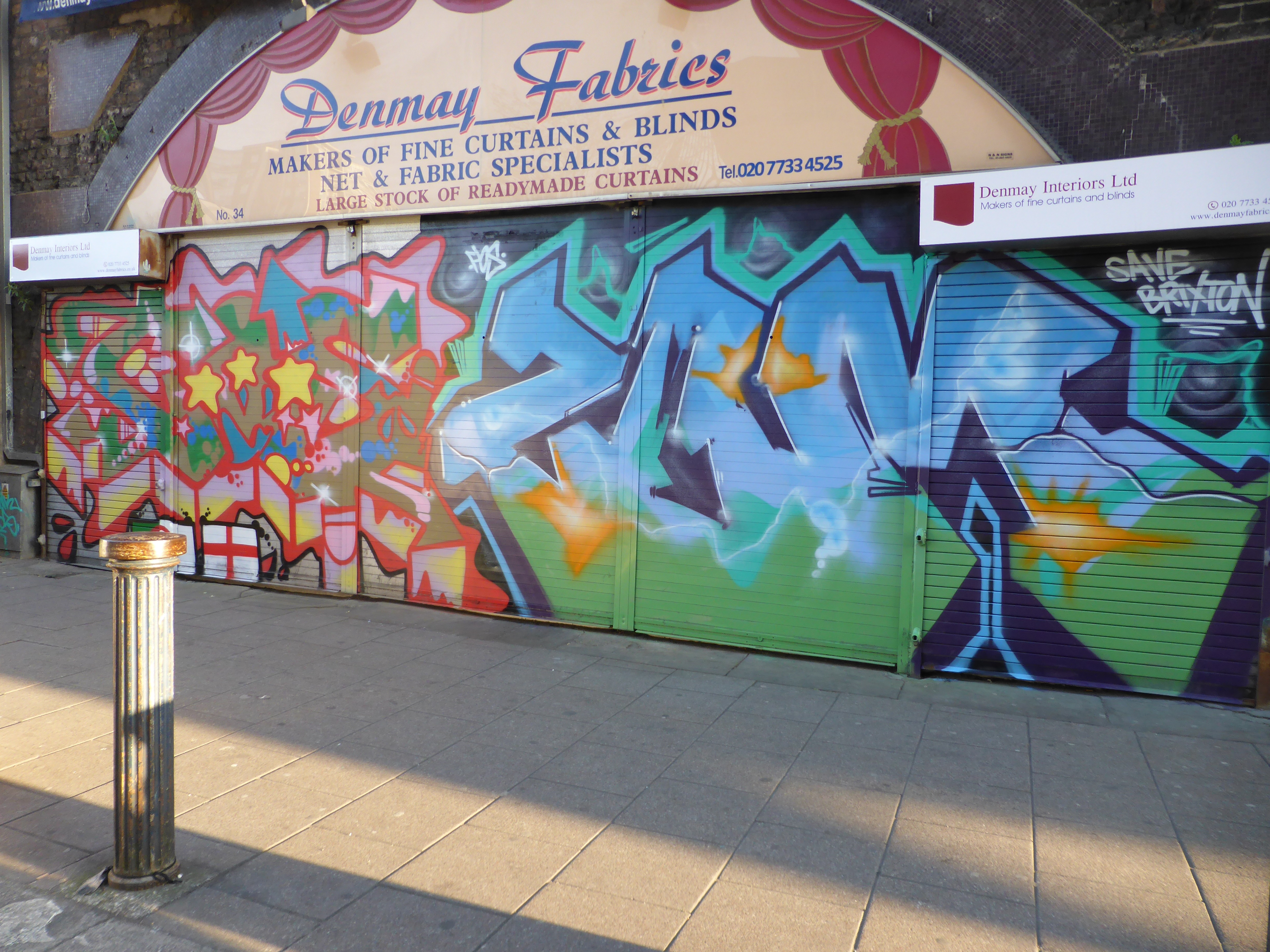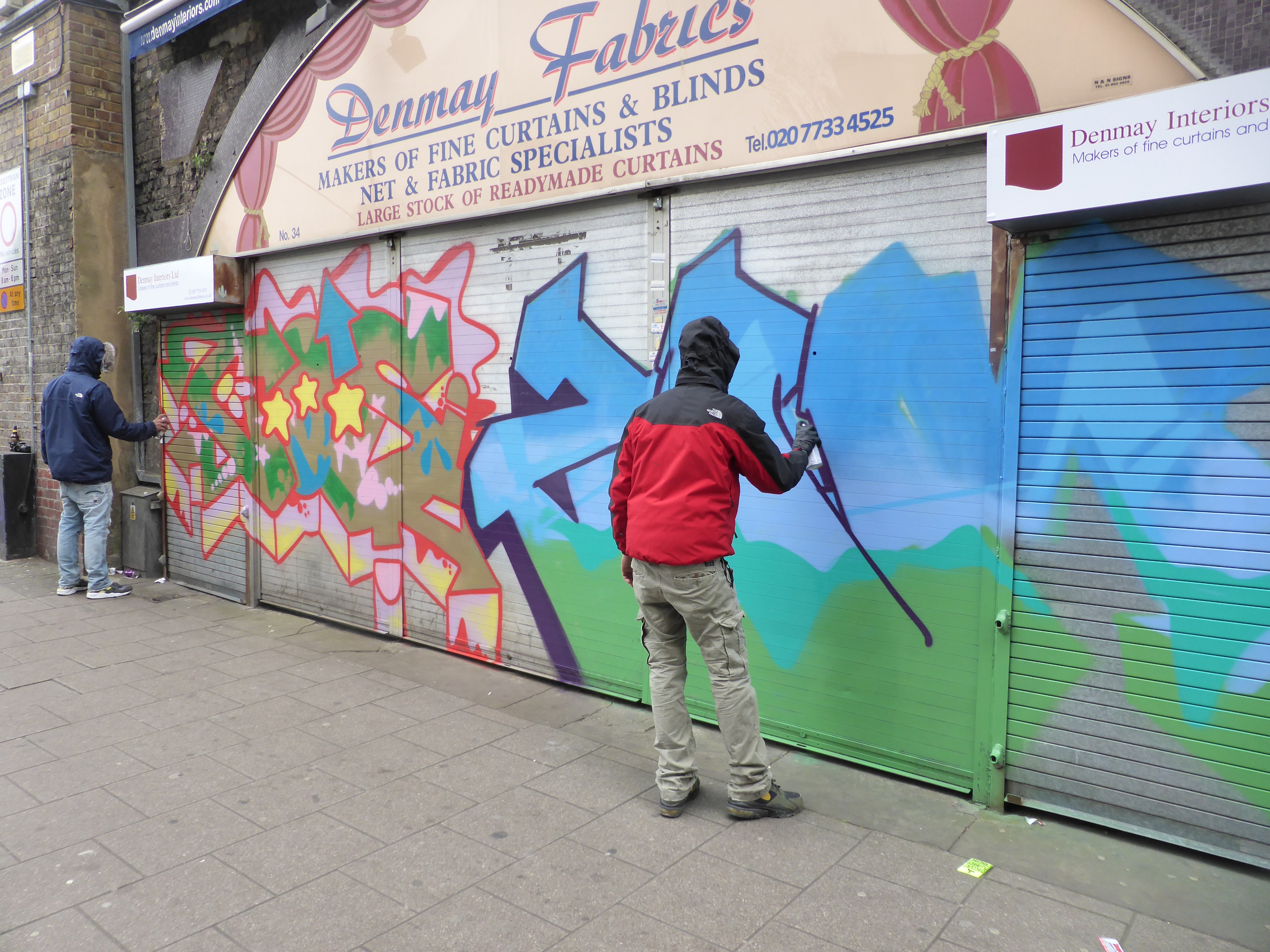 So it was with this in mind that the project after initiation from the local tenants was set up by the fine organisation of artist and contributor PINS, who has set forth to organise a group of notable and talented artists to take a shutter each, and allow them creative licence to work their magic, starting with for the moment, London based artists. Feeling that this was a local problem PINS has set to kick off the project thus far with some of the best on London’s scene, incorporating many differing styles in the process. On this occasion the focus was more on Graffiti with some local writes coming along to paint.