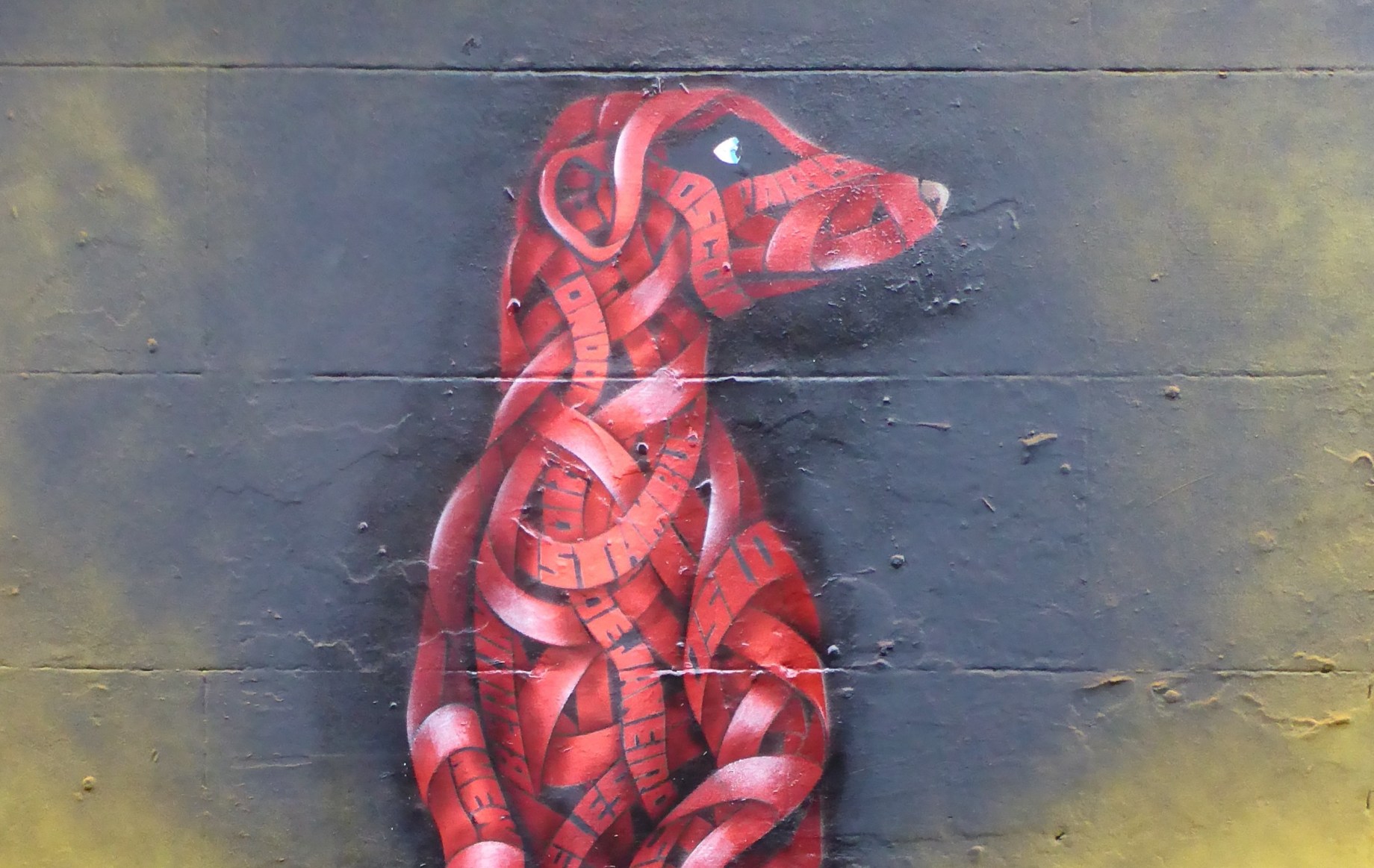 Yesterday in Brick Lane Chilean, but London based, Street Artist Otto Schade aka Osch laid out his newest work in his trademark ‘ribbon’ style,.entitled ‘Love Is,,,’, depicting a Meerkat and construncted from many of the names of cities with which Otto Schade loves. Otto’s painting styles range from the abstract and surreal. Working predominantly with oil paint, and incorporating practices such as collage, illustration and stencil. The themes behind his compositions read in a personal, metaphorical sense with a sharp, ironic touch. Otto has long been a major star on the London street art scene and we for one consider him to be one of the best artists around. We love his ribbon effect style creations which offer a glimpse at his former career as an architect. Superb choice of the Meerkat with its strong social characteristics to depict his theme and the similar style of background as he used in his previous work also in Brick Lane (covered here). .All round a delightful addition to the great art in Brick Lane. This by our count takes us too eight works Osch has placed up in London in 2015, we can’t wait to see what follows and will be reporting on it when it happens.