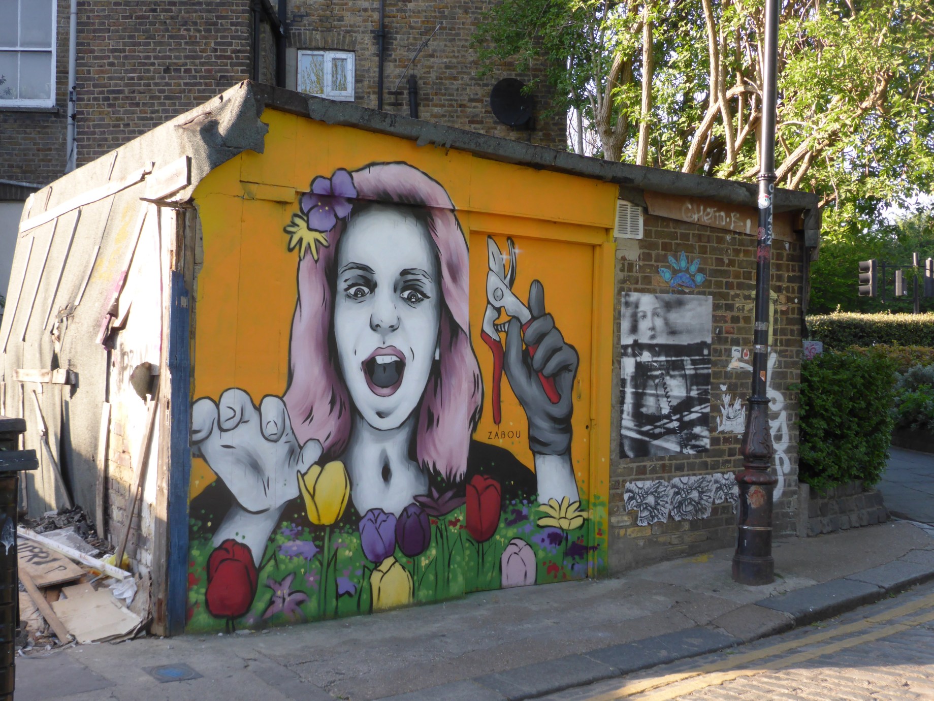 This last Sunday prolific Stencil based Street Artist Zabou was at work yet again on the streets of London, this time in honour of the Columbia Road flower market, an institute in the East End of London and is fittingly entitled ‘Flower Frenzy’. As Zabou continues her self-appointed mission to brighten up the East End of London, we get to enjoy the efforts of her works and bring you her latest addition to the area.