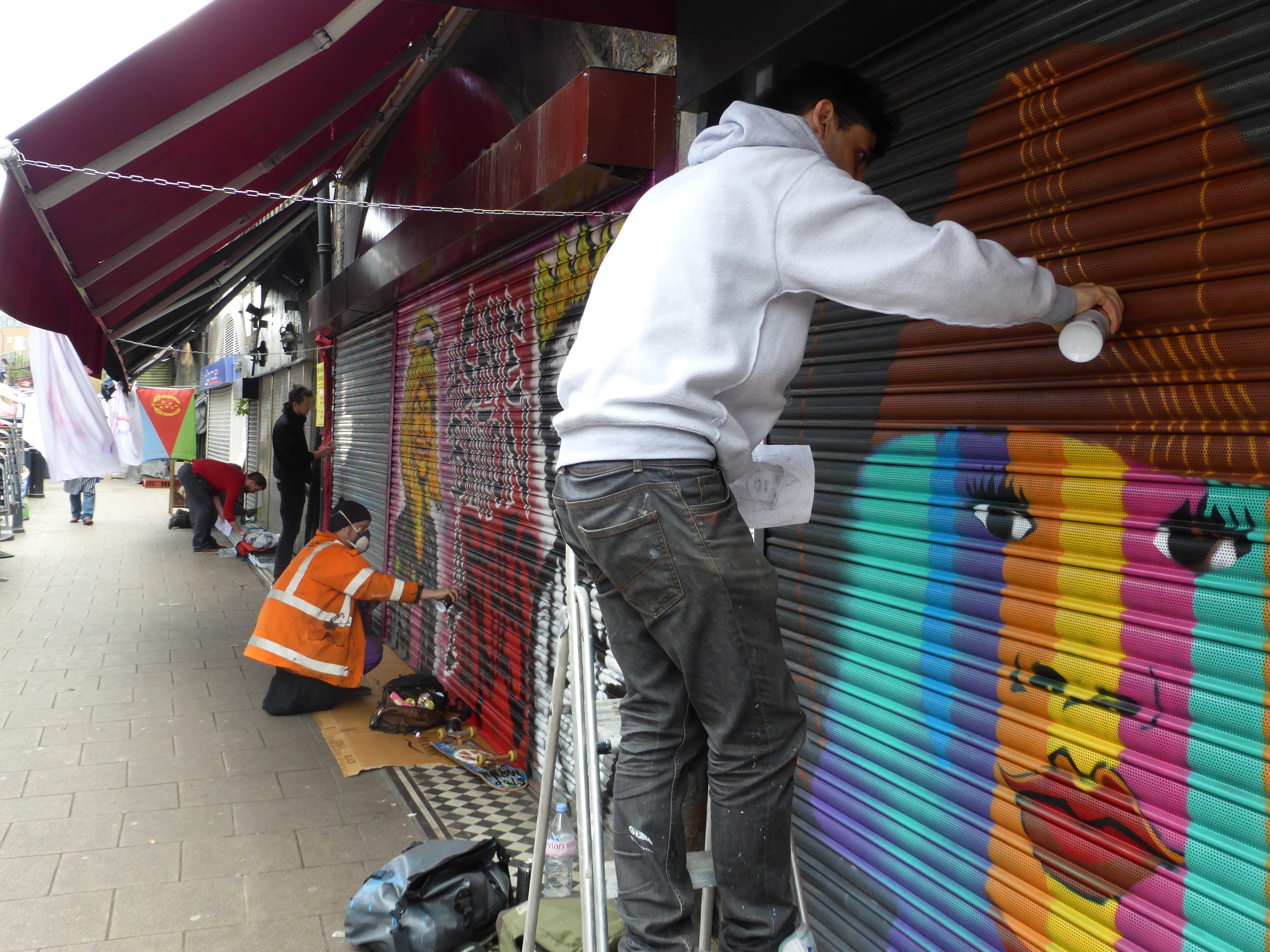 Artists and residents joining together to get some cardboard up to prevent the glass behind the shutter being damaged by the paint.
