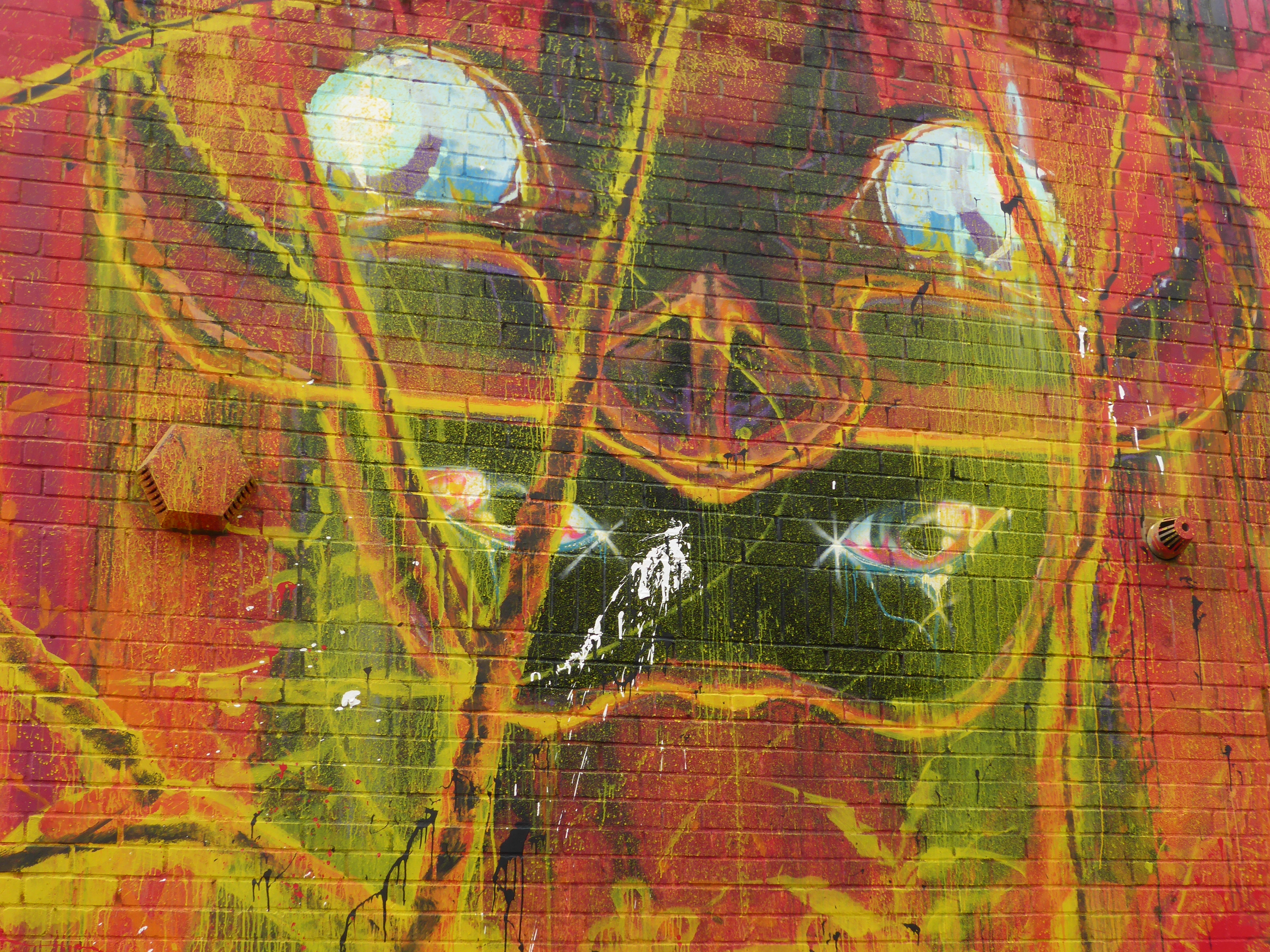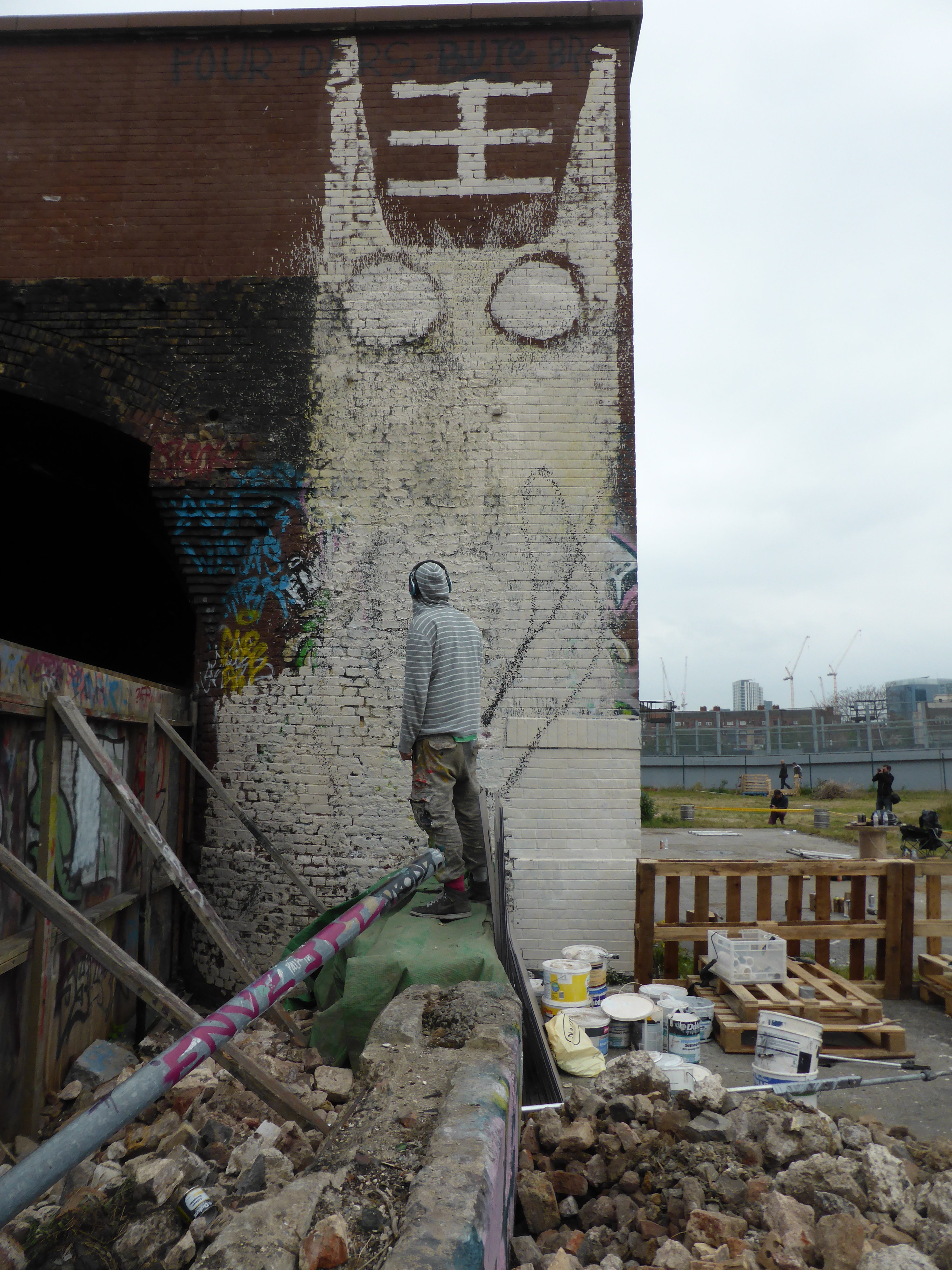 Over the last week or so Street Artist Himbad has vertainly been a busy bee, with two new works in Bethnal Green laid out with the support of The Hidden Streets Of London, and a third piece he was working on today for the ‘Green House Effect’ paint jam in Spitalfields, and which we have yet to capture the finished piece. Creating his characters inspired by the ideas of the Underworld in Ancient Egyptian culture, Himbad’s works are very much his own and a delight to stumble upon, always appearing somewhat slightly mischievous wherever they may be residing.