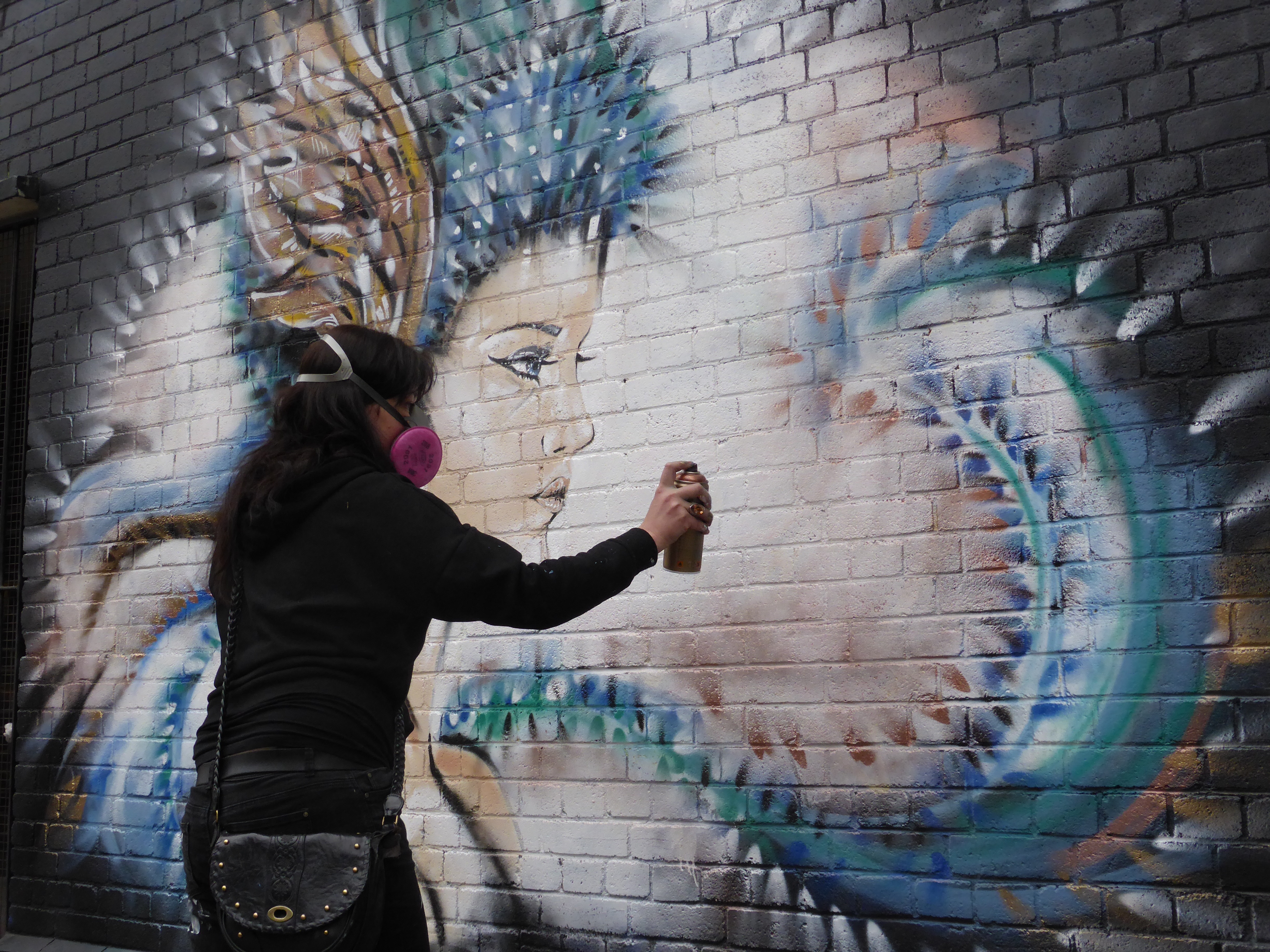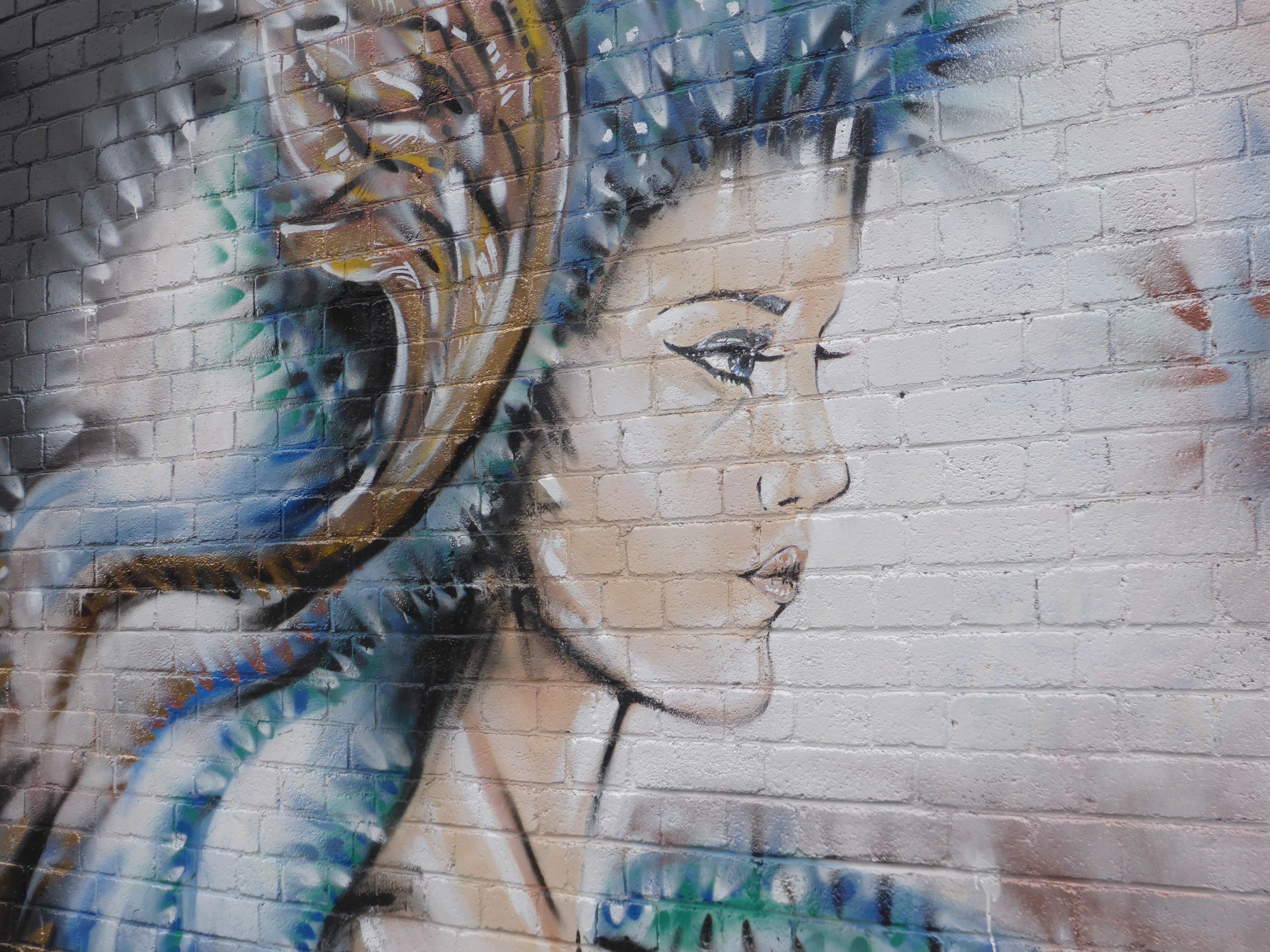 Yesterday in Bethnal Green Street Artist Giusi Tomasello was out working her magic on a wall provided with the support of the Hidden Streets Of London. Working with a combination of spray cans, Posca pens and paint brushes to build up her portraits, when you view the piece you are automatically drawn to the striking face and head dress, but there really is so much more to look at, we absolutely love the soft focused air brush sort of style she uses to generate an ethereal quality which fits in with her use of characters from classical mythology.