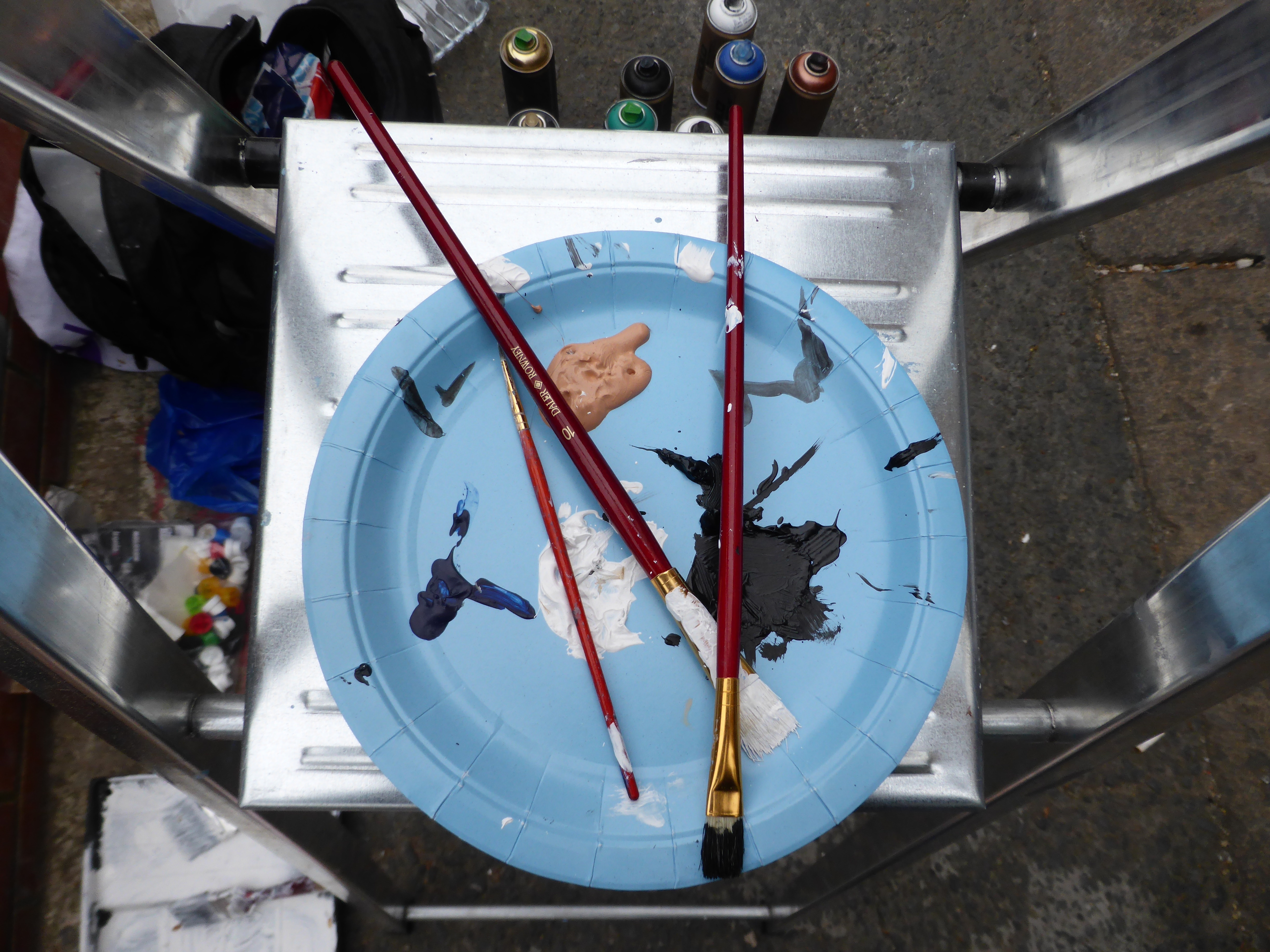 Tools of the trade and the image from which Giusi was working from, a painting she has recently completed and currently on display at her exhibition in Dulwich.