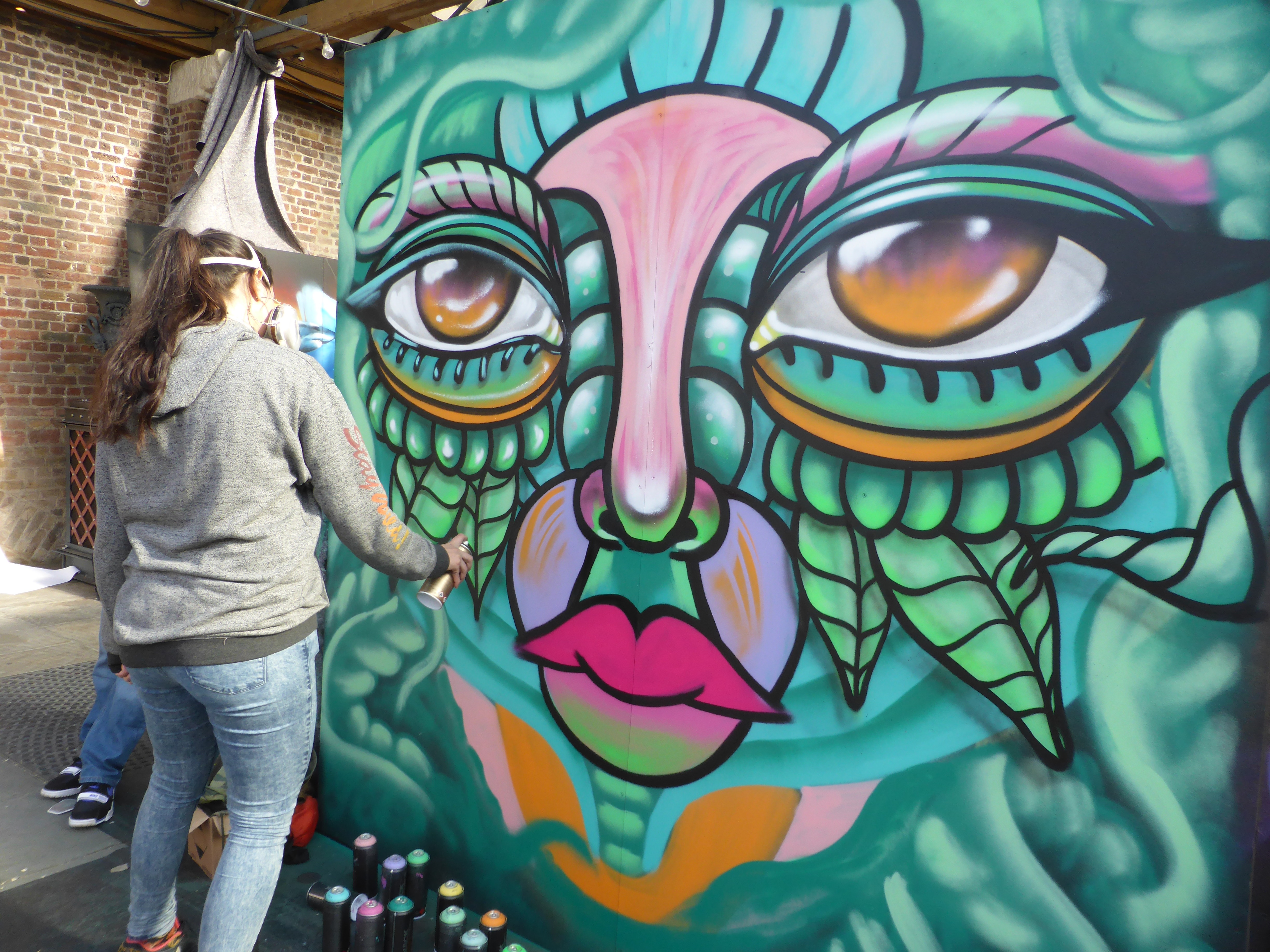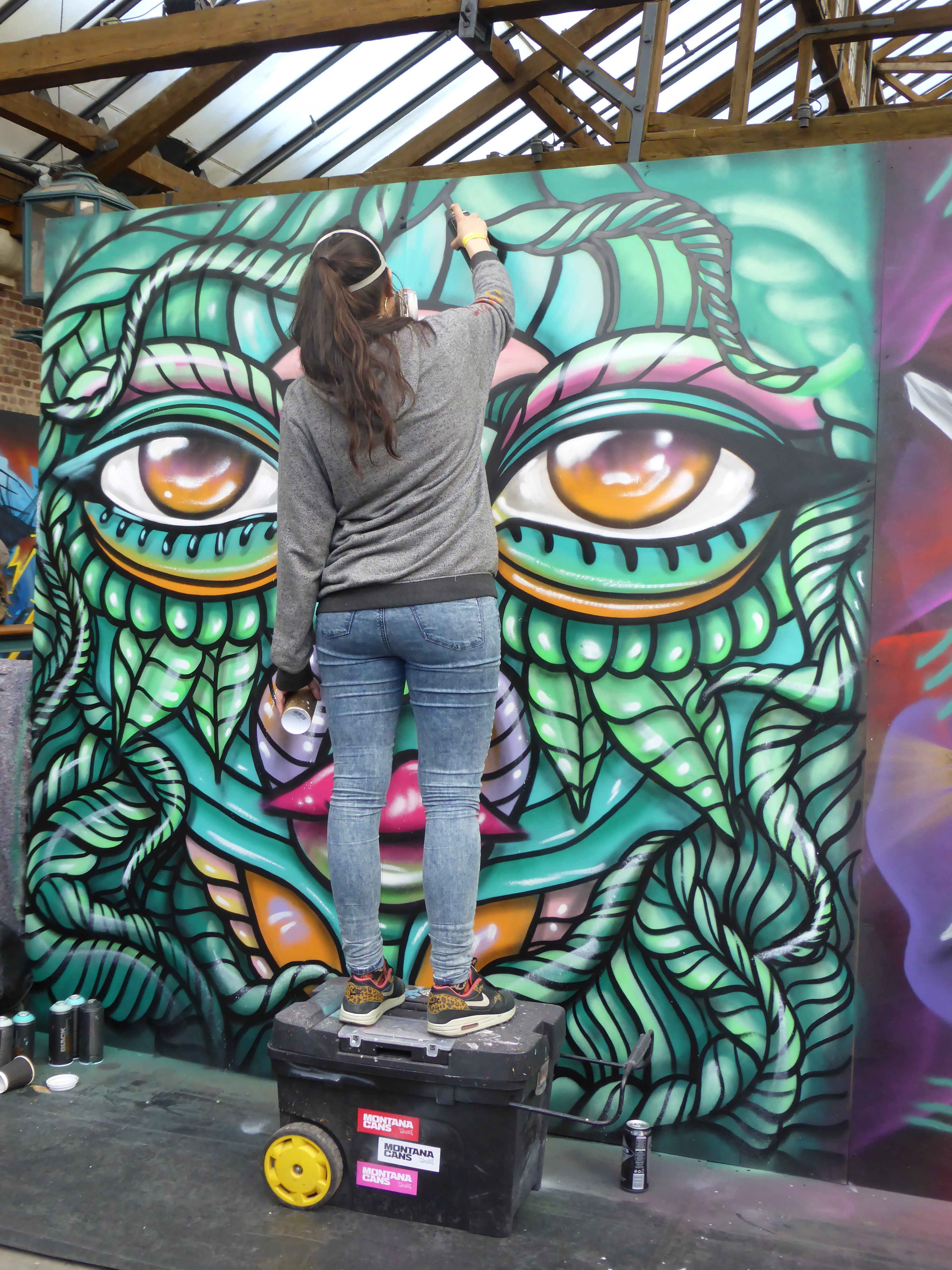 Next up in our in focus look at some of the works from StreetFest 2015 we have the work of Swedish artist Amara Por Dios, who we have already been fortunate enough to witness at work on a piece in its entirety on two occasions now at London Calling, so we were already anticipating a superb contribution from Amara Por Dios, and she didn’t disappoint at all. Laying out for us at London Calling one of StreetFest’s standout works with one of her striking tribal based works, influenced strongly by the cultures and arts of the early Americas.
