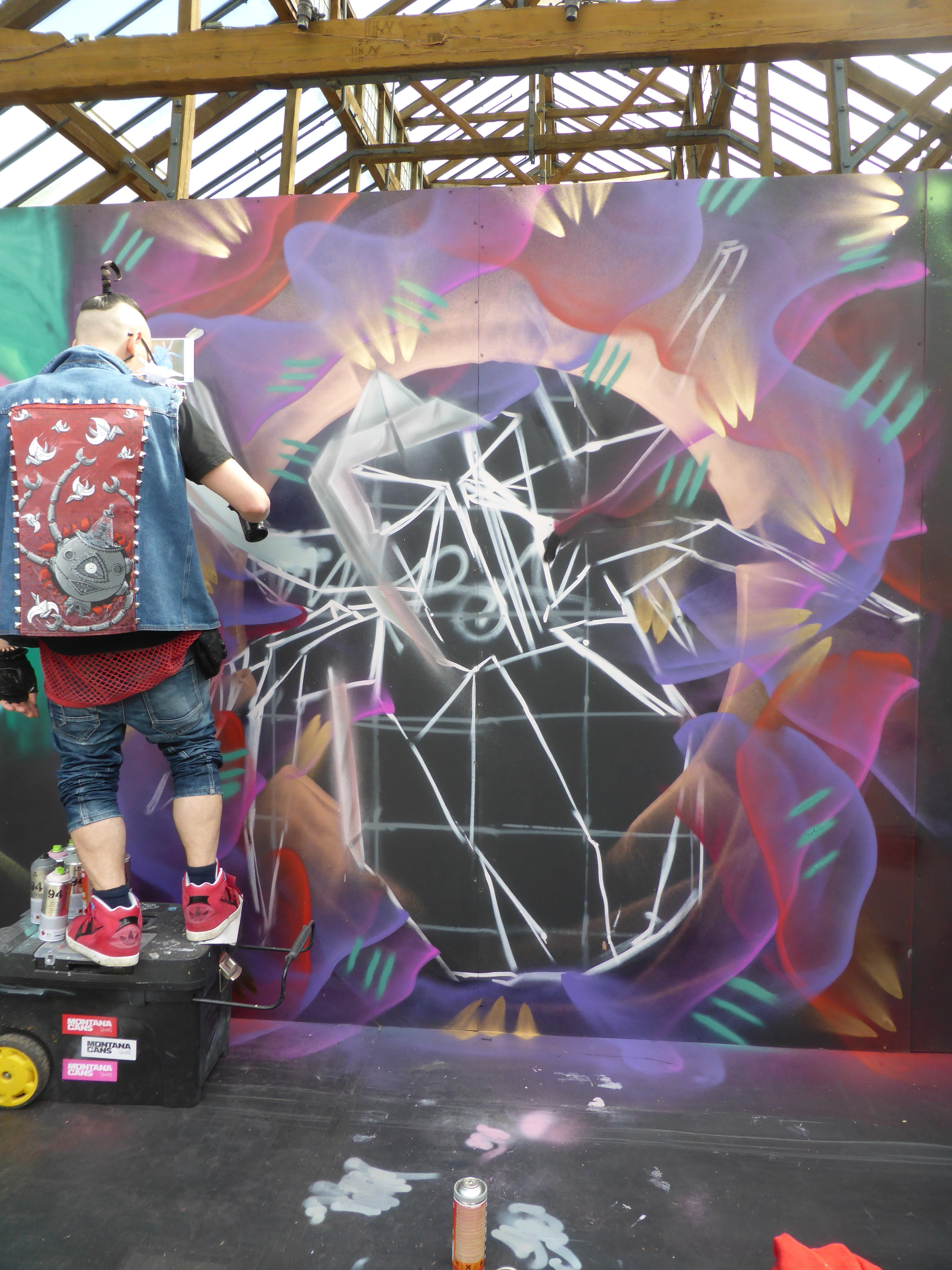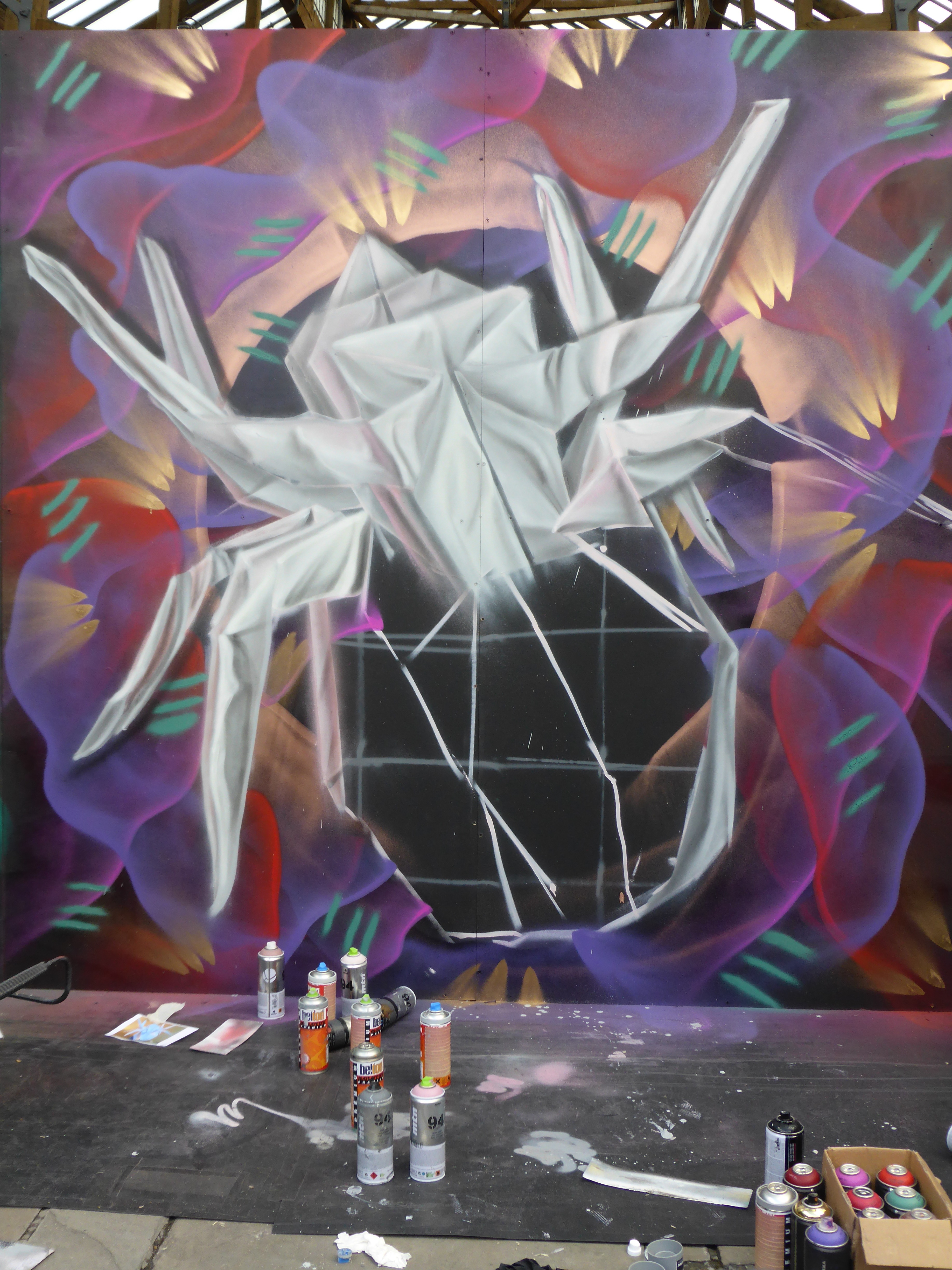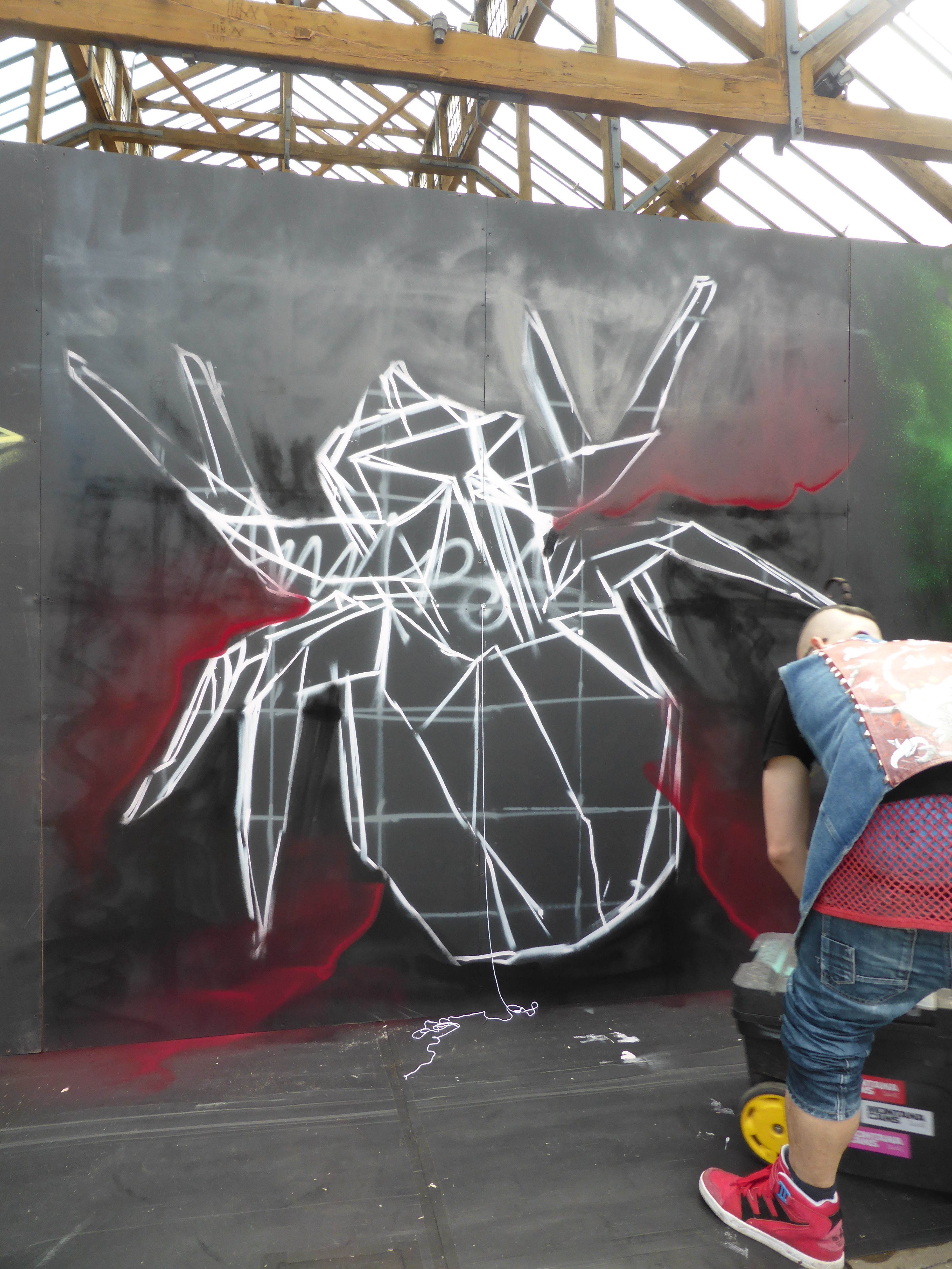 Next up in our in focus look at some of the works from StreetFest 2015 we have the work of Airborne Mark, who creates works based on geometric backgrounds and feature images of origami based works, hand crafted before hand by Airborne Mark himself, and on this occasion featuring a depiction of an origami spider. Meticulous in his work, Airborne mark certainly laid out one of the events highlights. The shadow and fold effect he creates to make his spider pop off the wall was a pleasure to witness be constructed, and all set to a beautiful and dreamy backdrop, that made for a superb piece.
