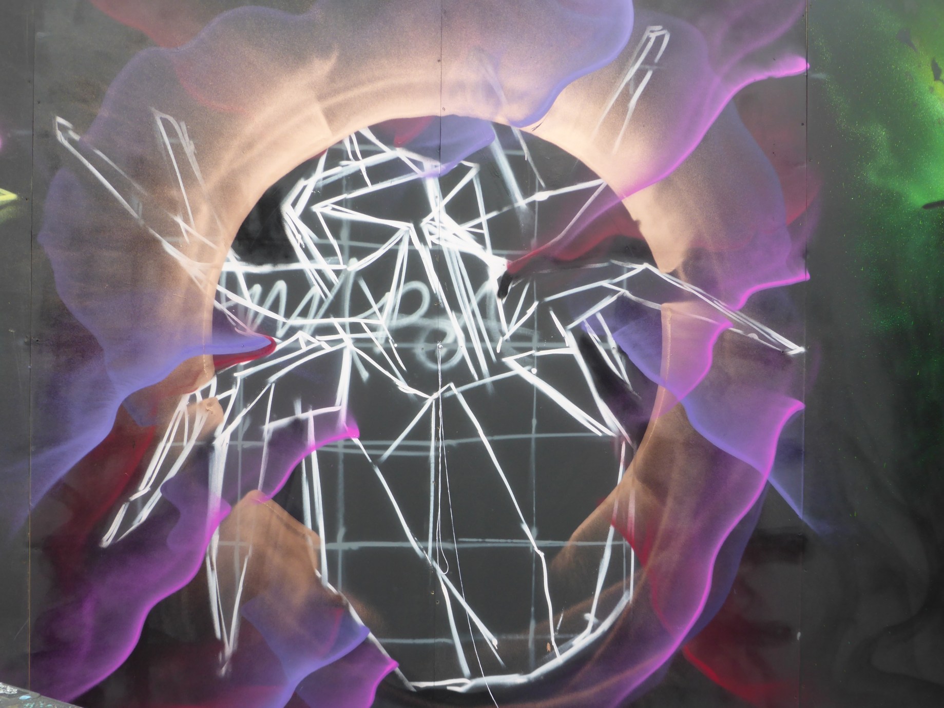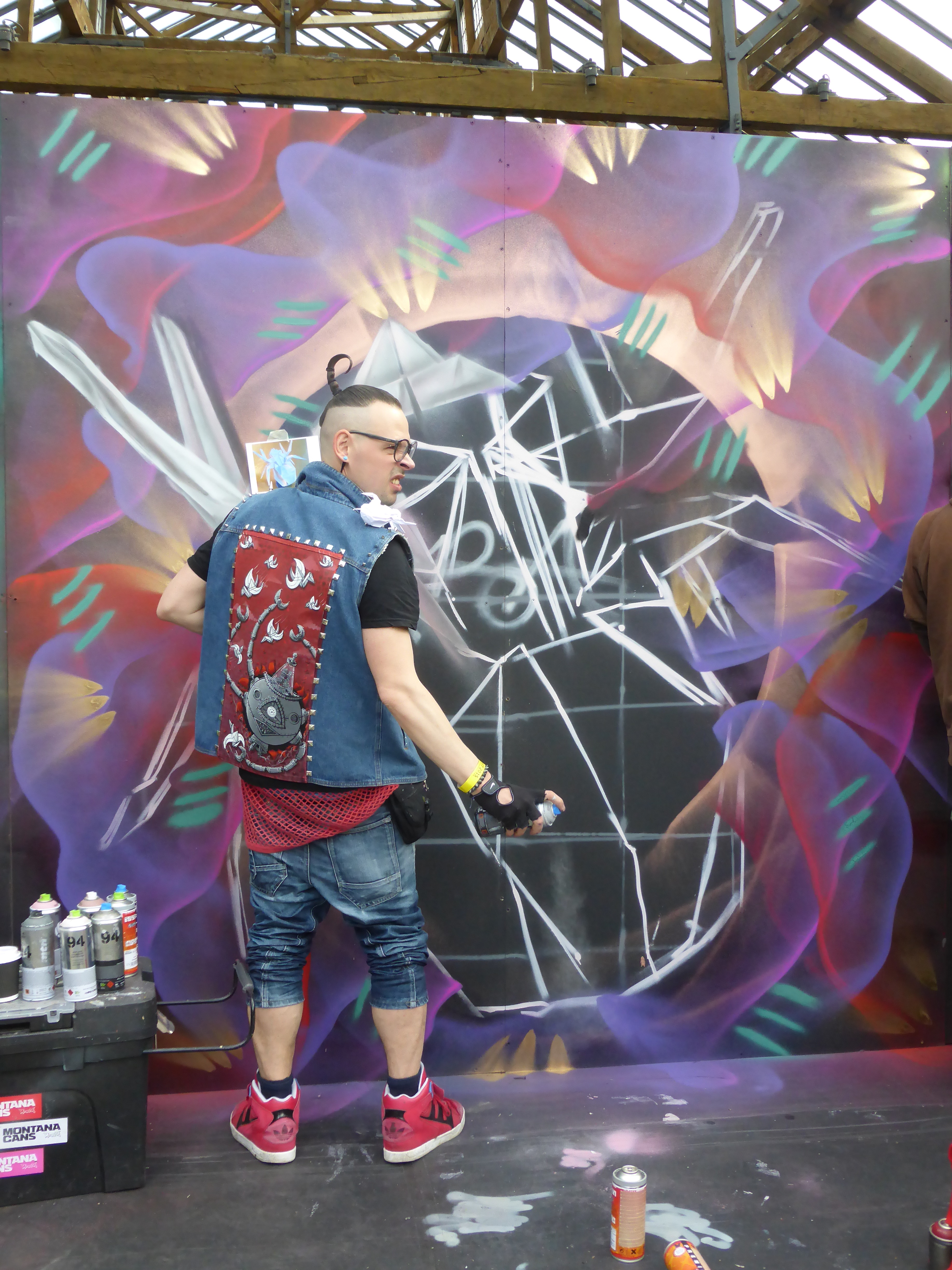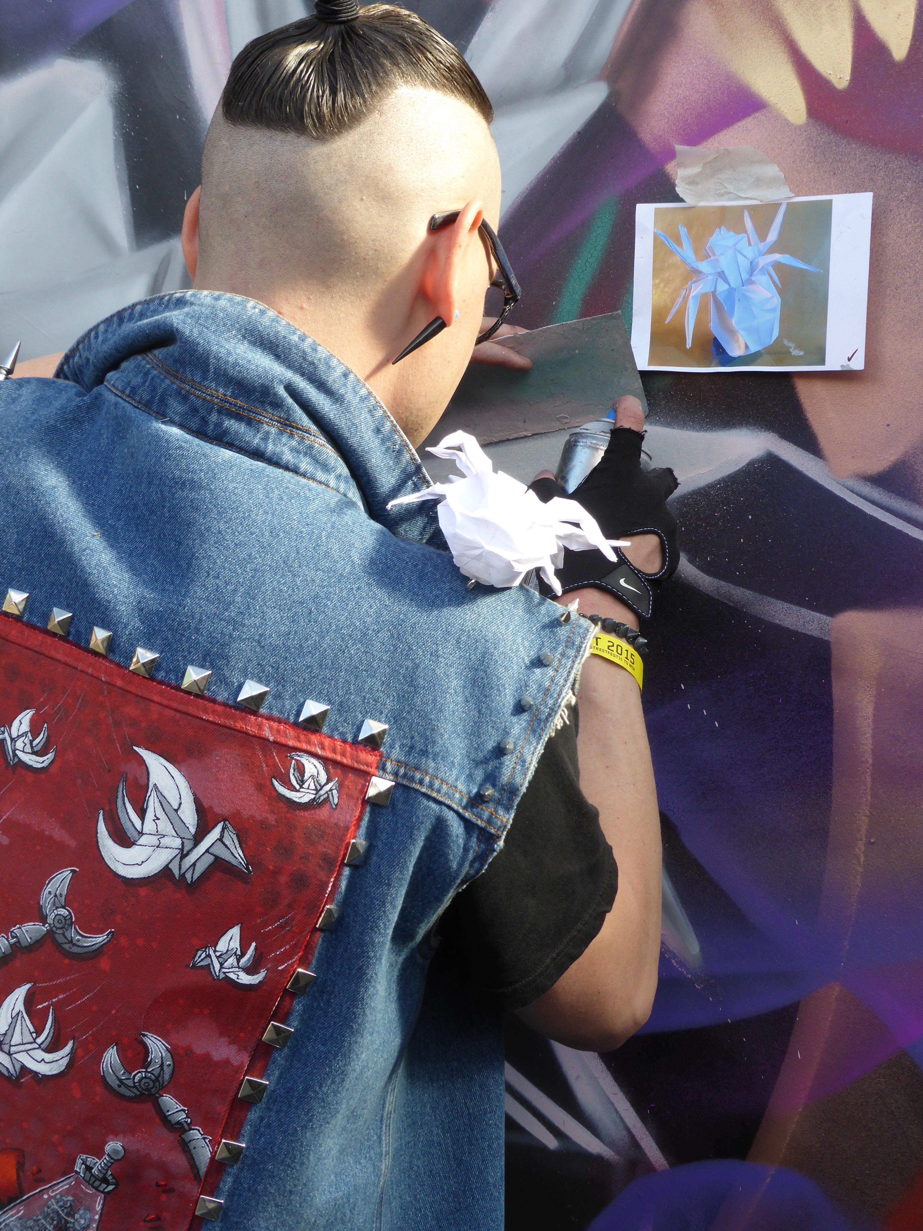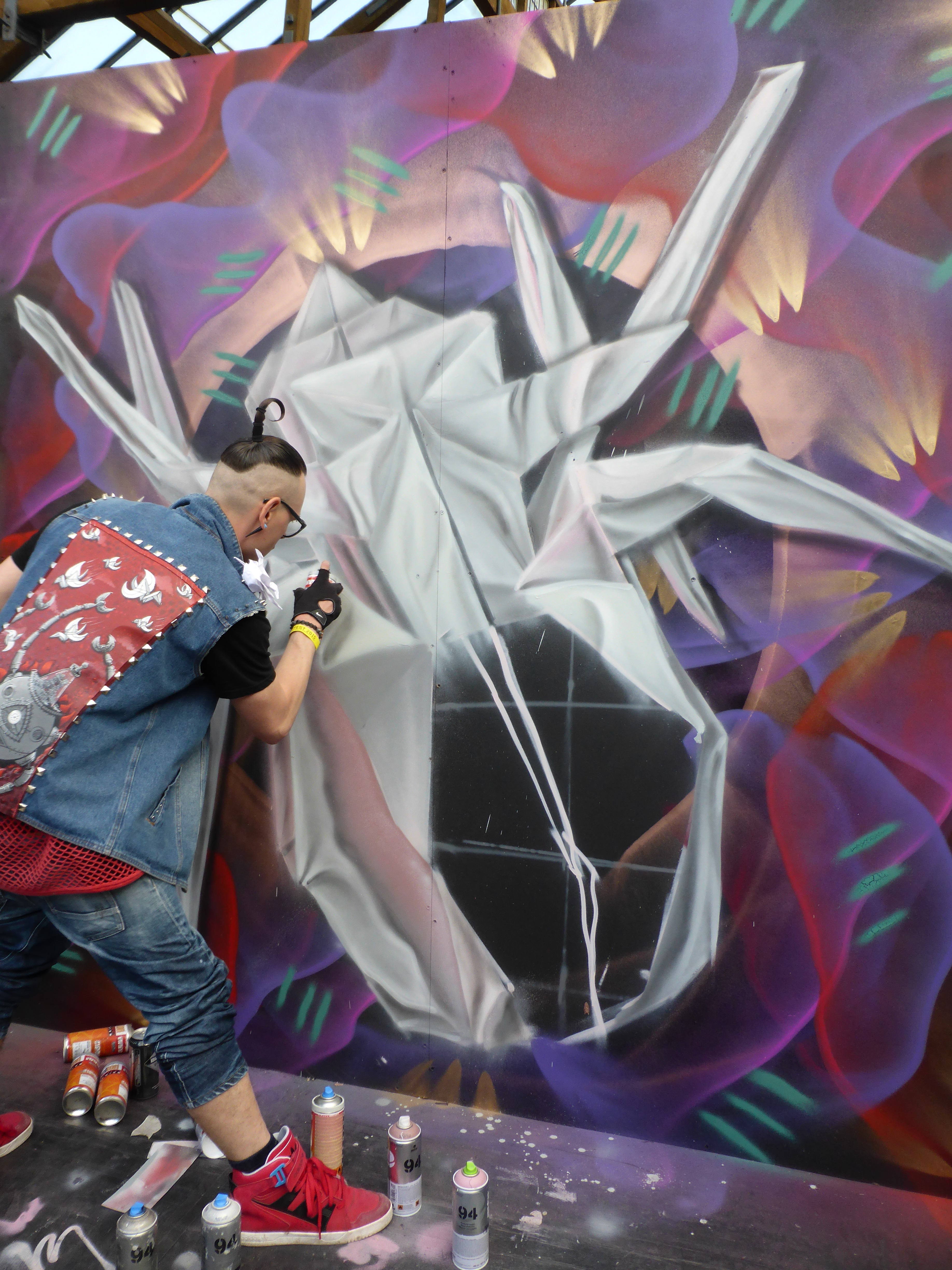 Next up in our in focus look at some of the works from StreetFest 2015 we have the work of Airborne Mark, who creates works based on geometric backgrounds and feature images of origami based works, hand crafted before hand by Airborne Mark himself, and on this occasion featuring a depiction of an origami spider. Meticulous in his work, Airborne mark certainly laid out one of the events highlights. The shadow and fold effect he creates to make his spider pop off the wall was a pleasure to witness be constructed, and all set to a beautiful and dreamy backdrop, that made for a superb piece.