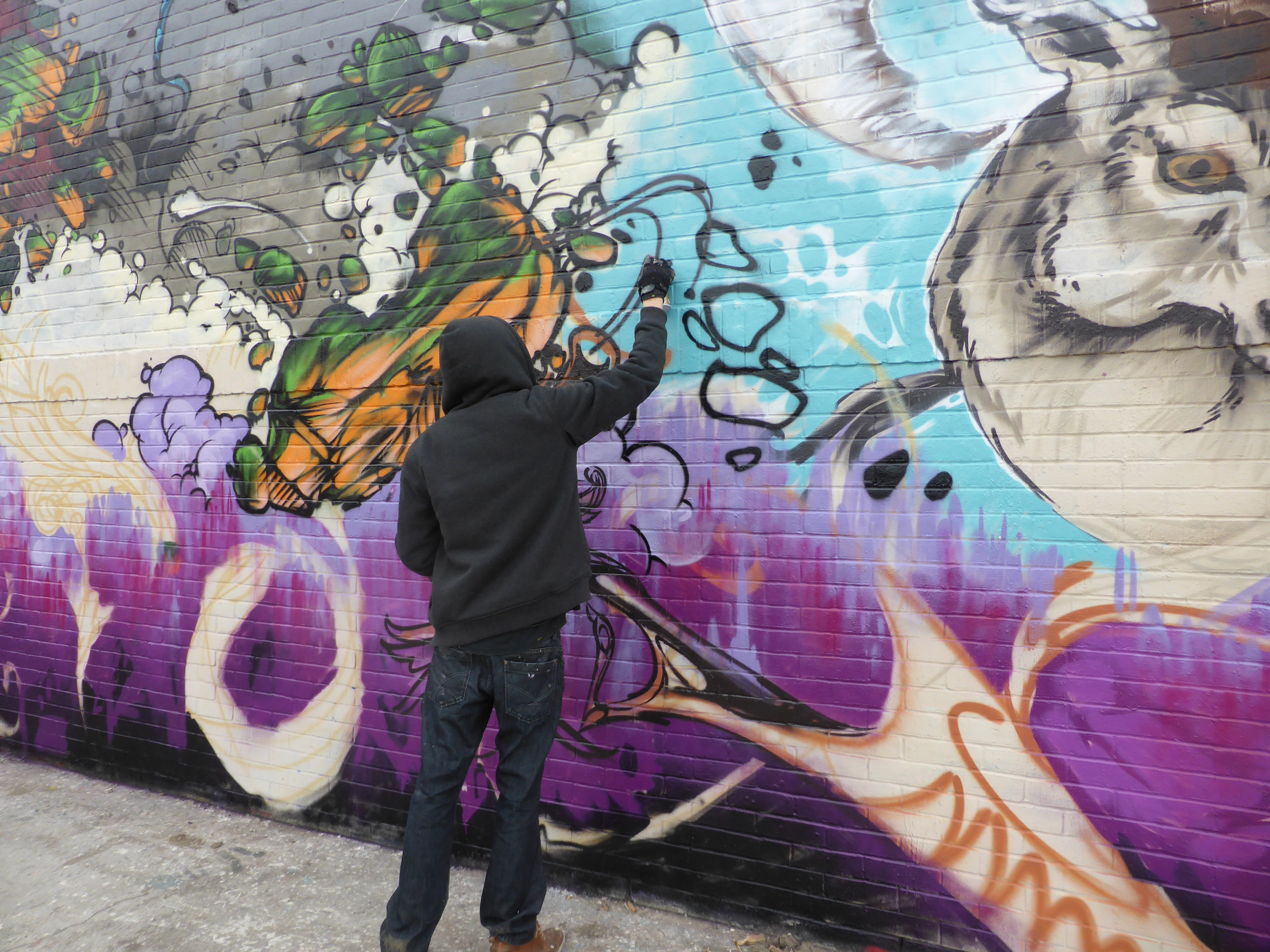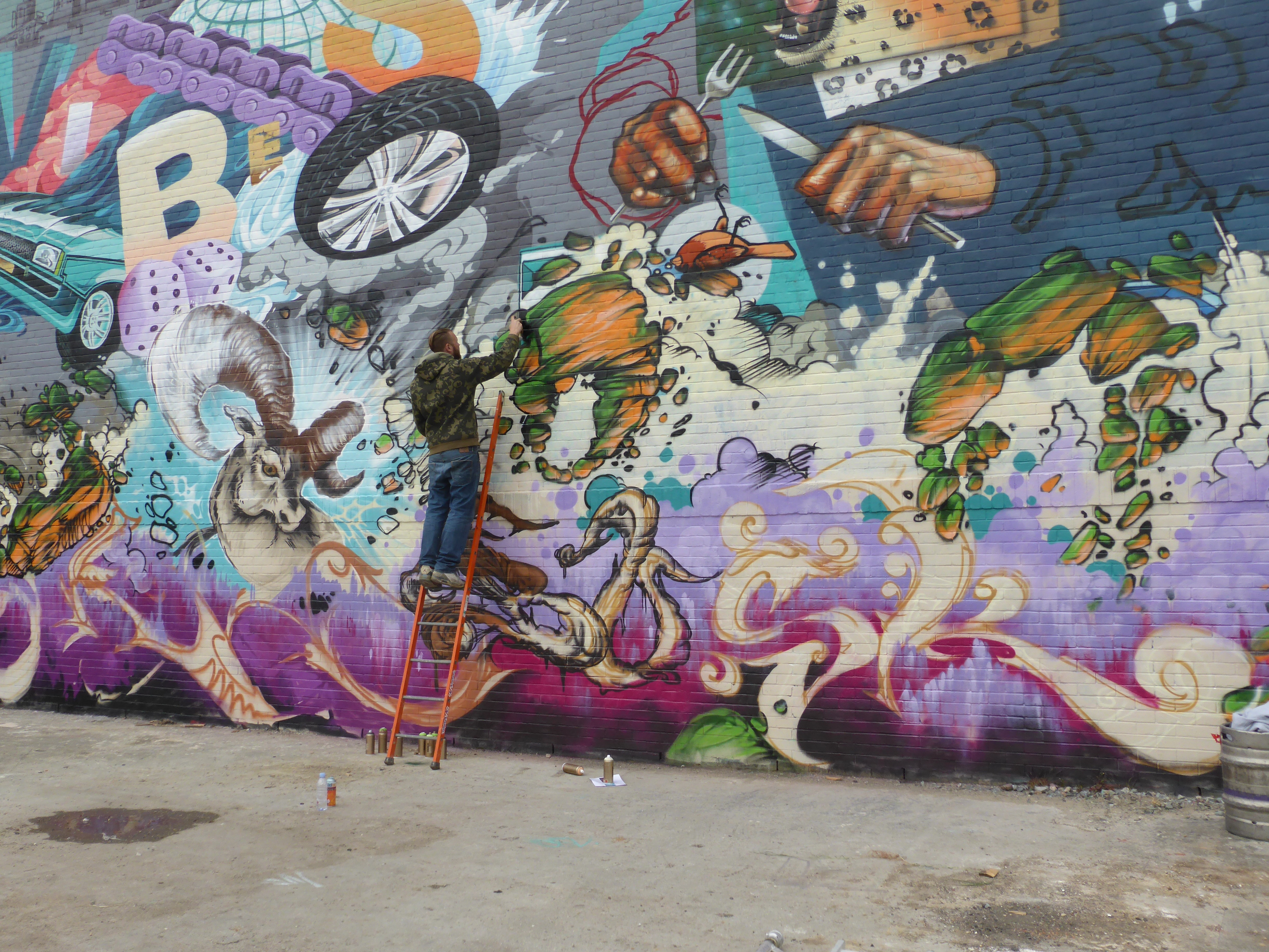 If anyone can let us the name of the art students who did this piece are, please let us know, so we can credit accordingly. They showed up on Saturday and had so much fun, asked if they could paint on Sunday, and were granted the wall to do this.