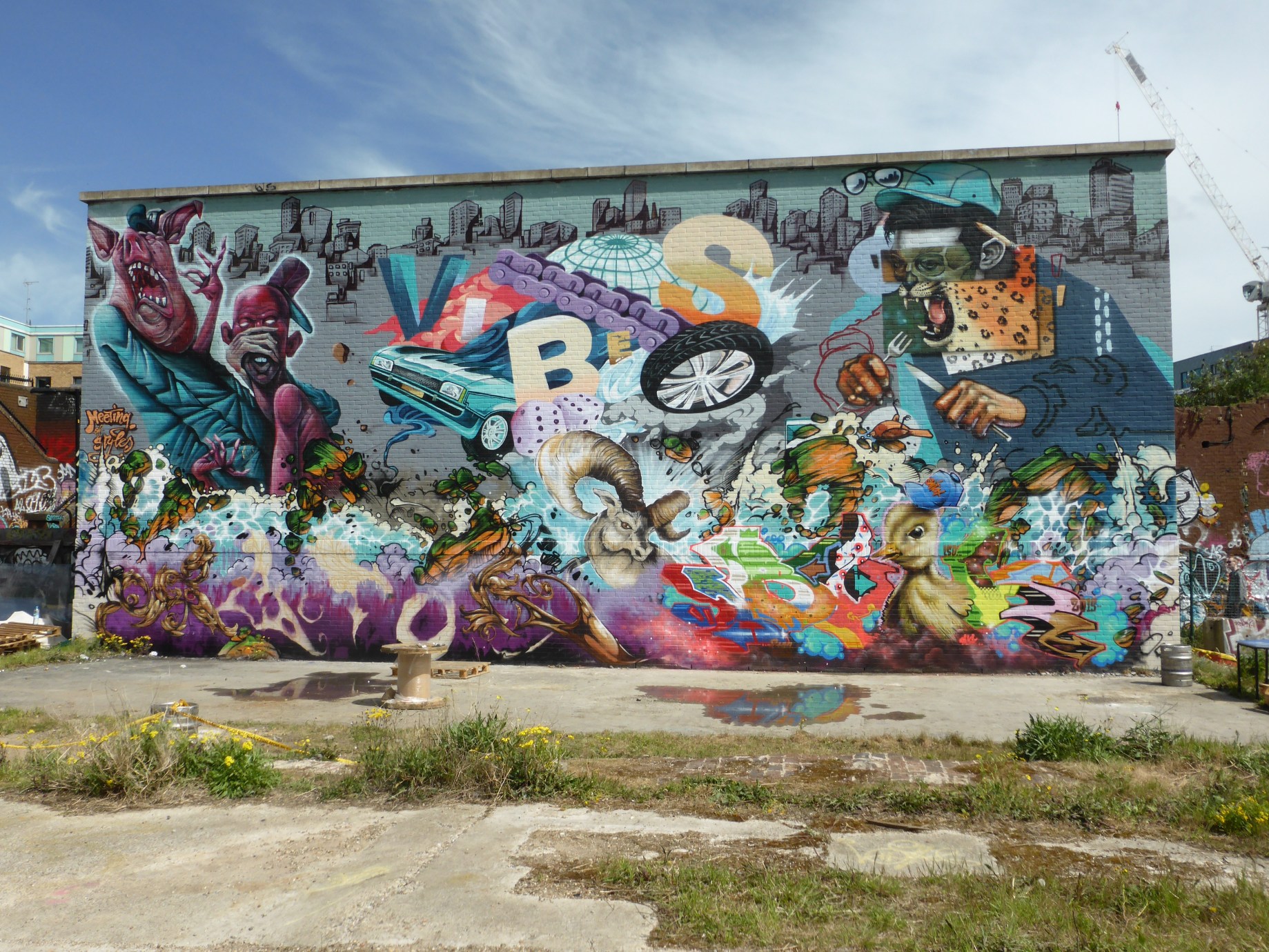 Huge wall with works from Oddysey, Vibes & Gent 48, with new additions along the bottom, covering some defacing, from Jim Vision & Zadok.