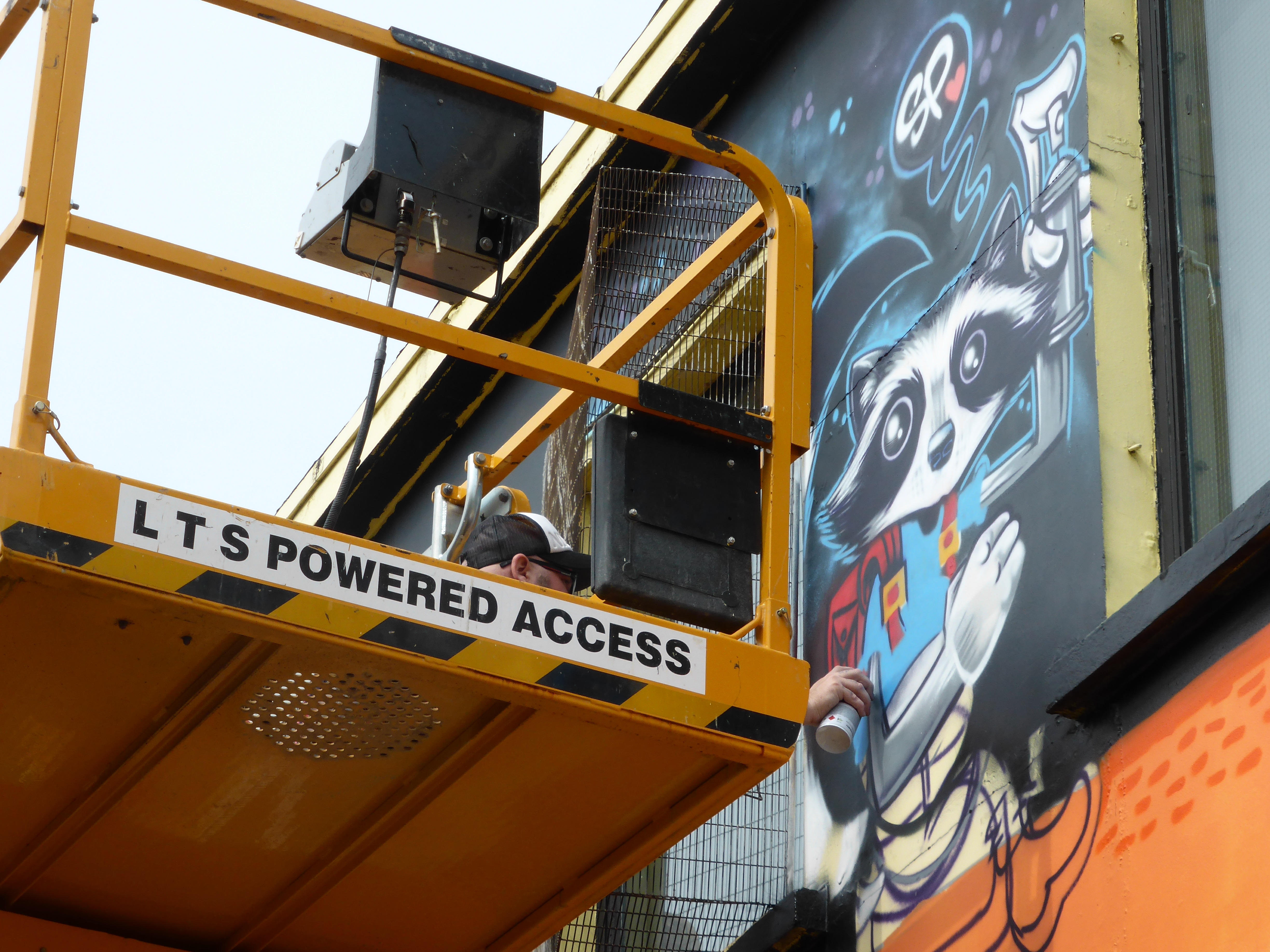 Here we are playing catch up with a piece put up last weekend the day before and morning of StreetFest by Lost Souls Crew members, Squirl, SPZero76, Captain Kris along with Tony Boy & The Real Dill In Bethnal Green. On Saturday we were wandering around Bethnal Green to see the delightful Giusi Tomasello at work, as well as capture the new collaboration from Brazilian trio Bailon, Sliks & Cranio, at which point we discovered this mural was being put up along the length of the building above the work from the Brazilian trio. Getting together a day ahead of their appearance at StreetFest painting, Lost Souls members, The Real Dill & Tony Boy spent the best part of Saturday laying out this work, before heading back Sunday morning to add the finishing touches. The work depicts a myriad collection of characters all set along the cosmic theme and central character of Squirl’s ‘Astro Fox’. All involved were in fine spirits and enjoying their turns working away up on their scissor lift, gradually bringing this delightful work together and we were glad to get the chance to witness and capture these artists at work.