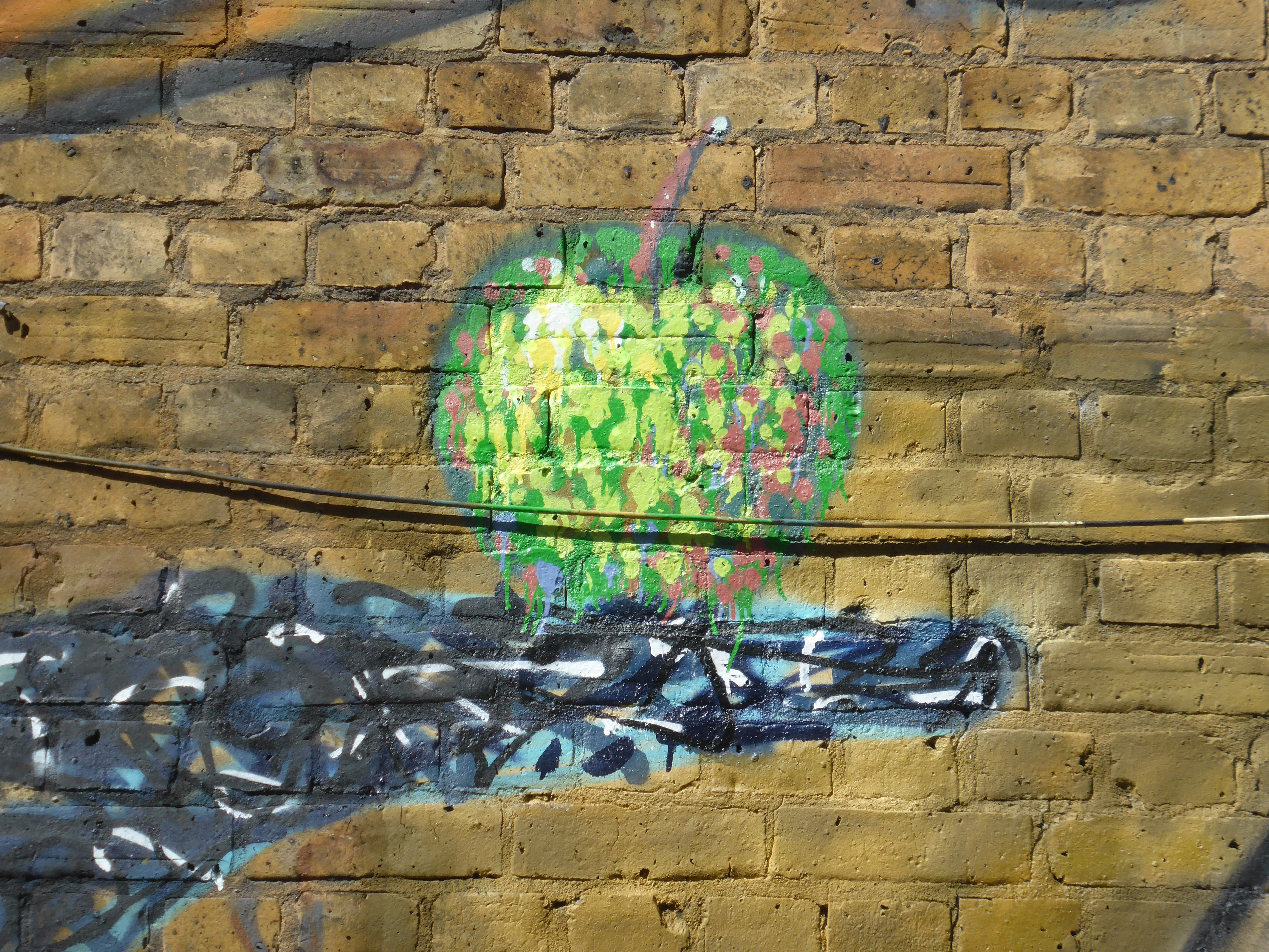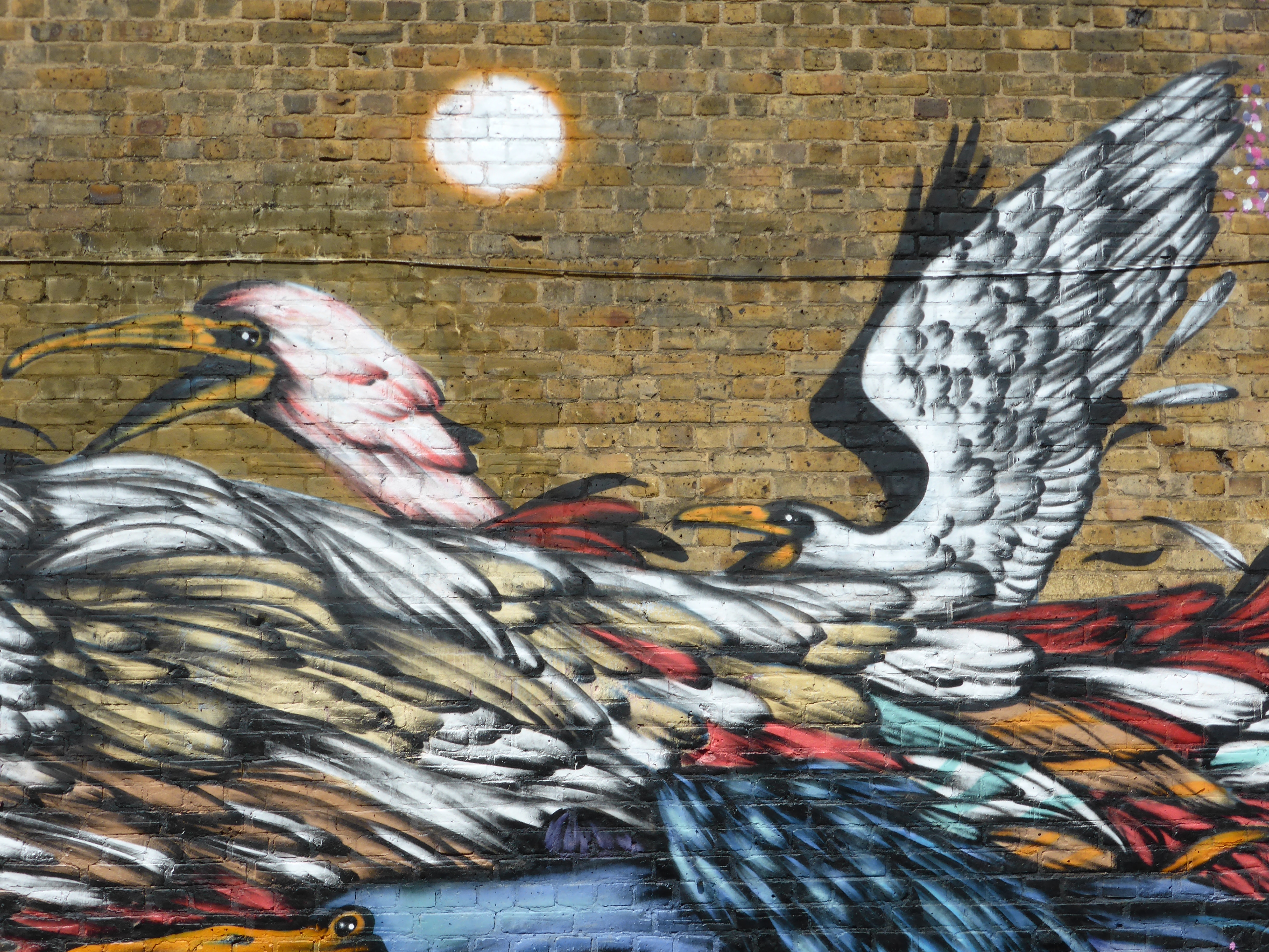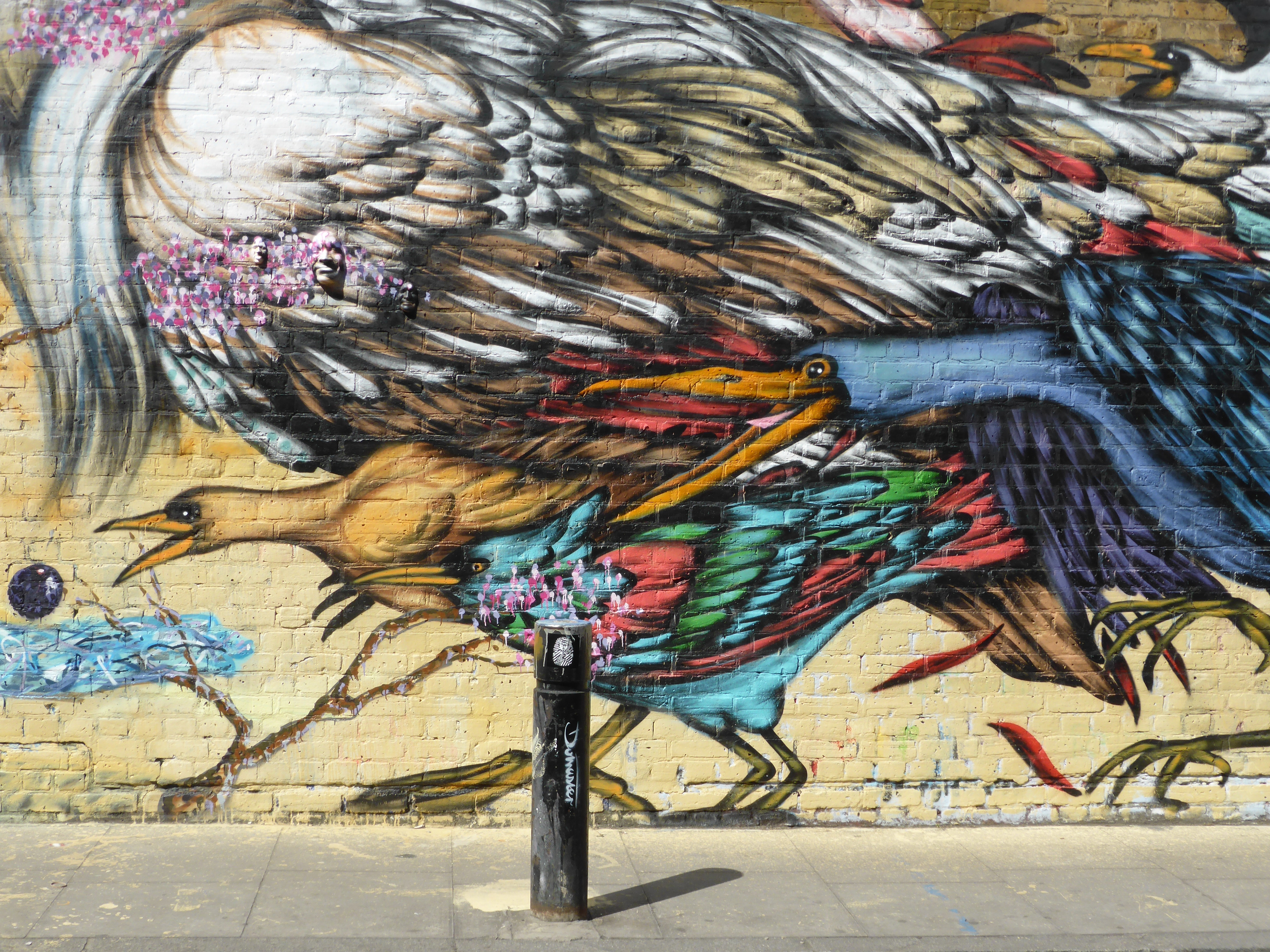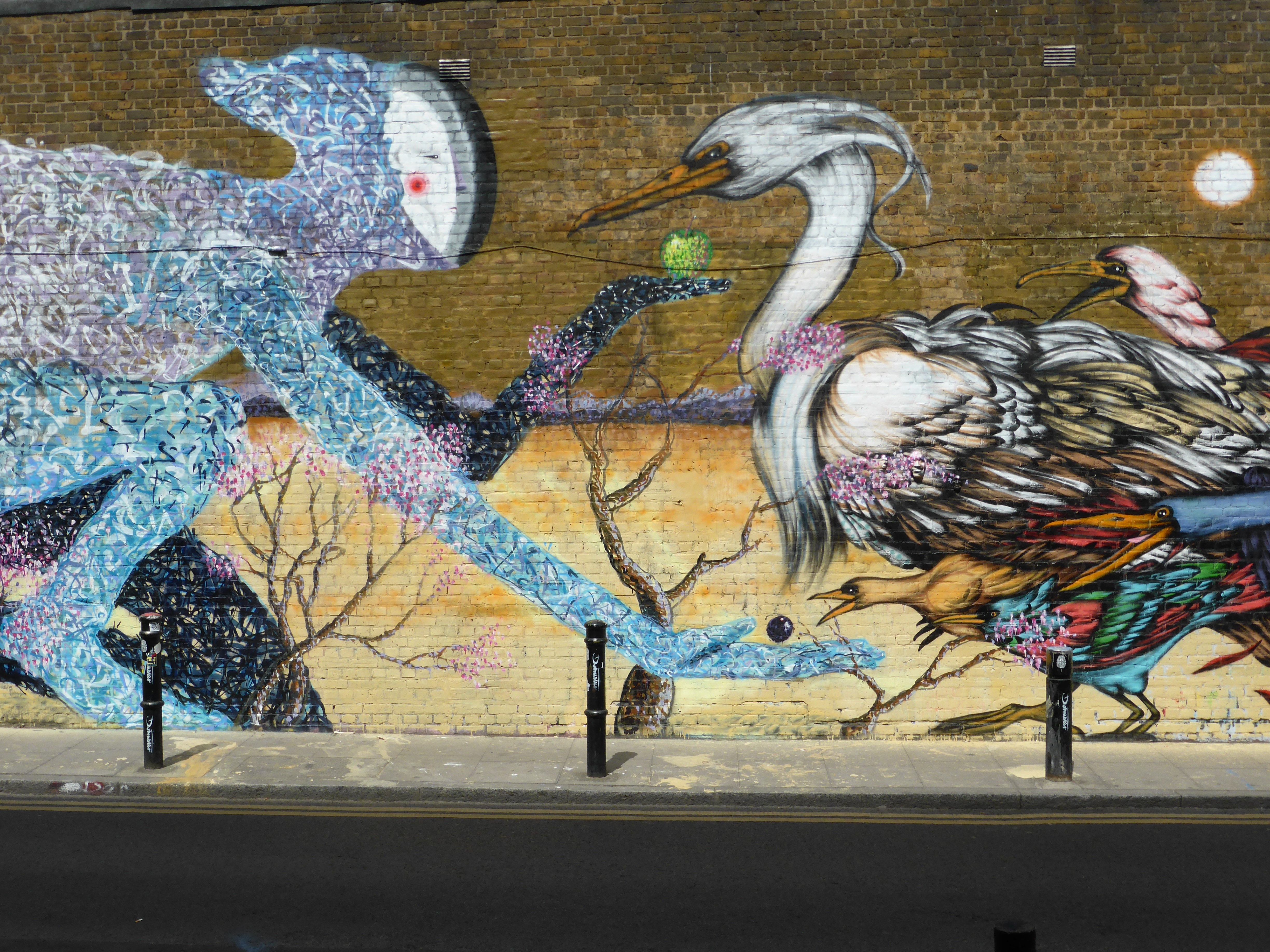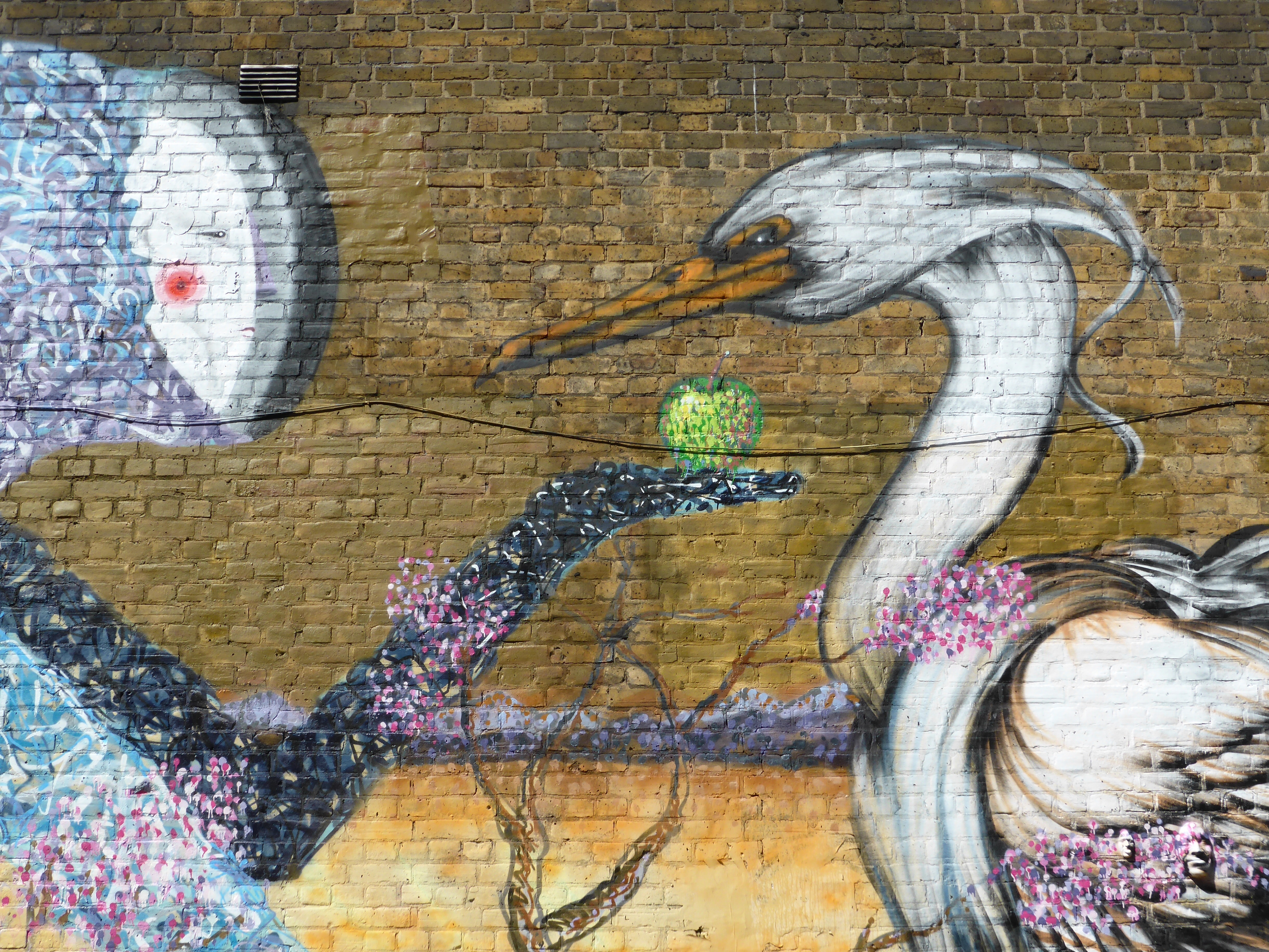 This work is amazing, offering a superb blending of styles from the three respective artists. With Sliks’s abstract styling used to make the creature on the far left offering the apple, Bailon’s more painterly approach to his distinct birds as subject and Jimmy C’s ‘Aerosol-Pointillism’ for the scenery.